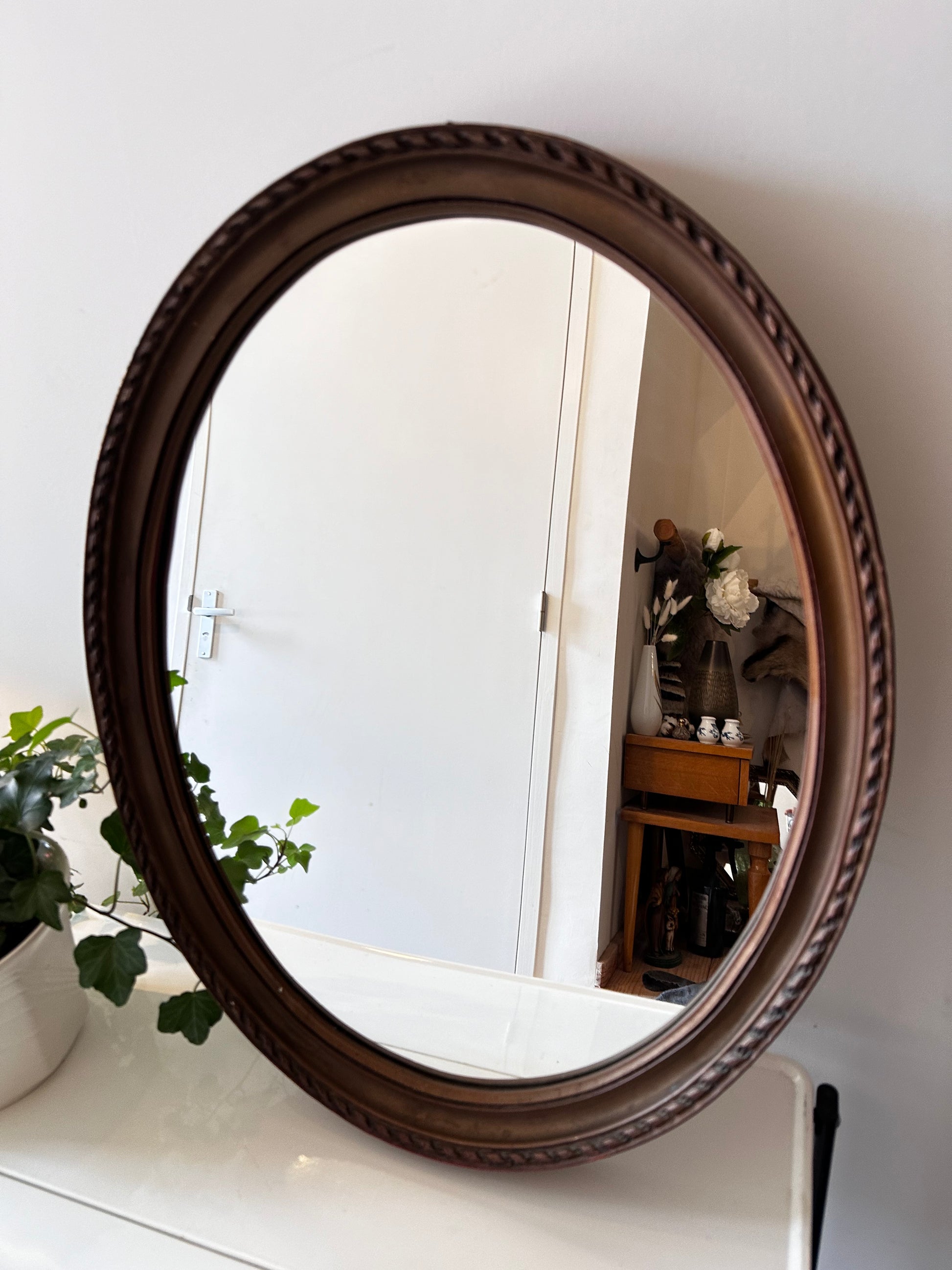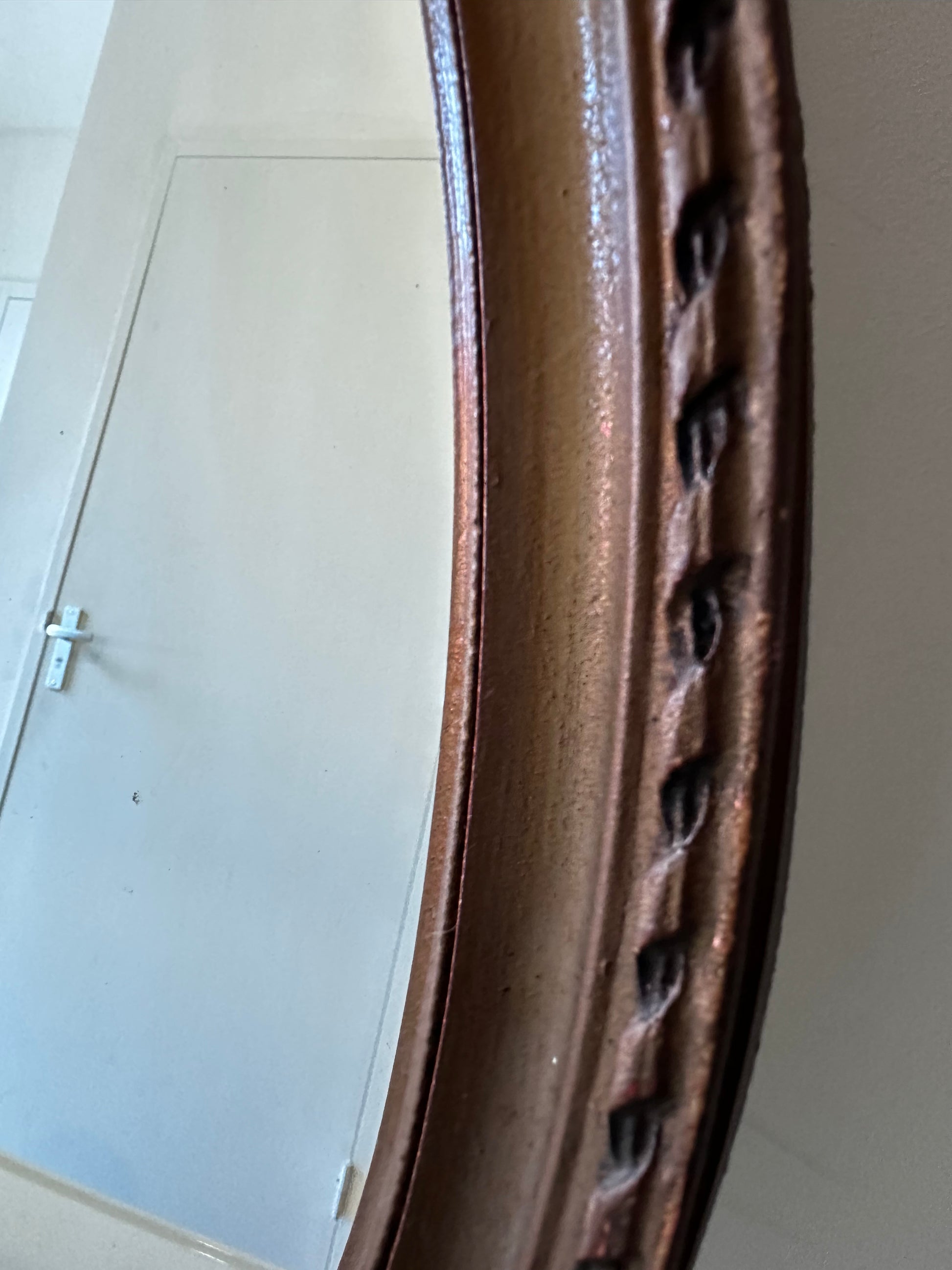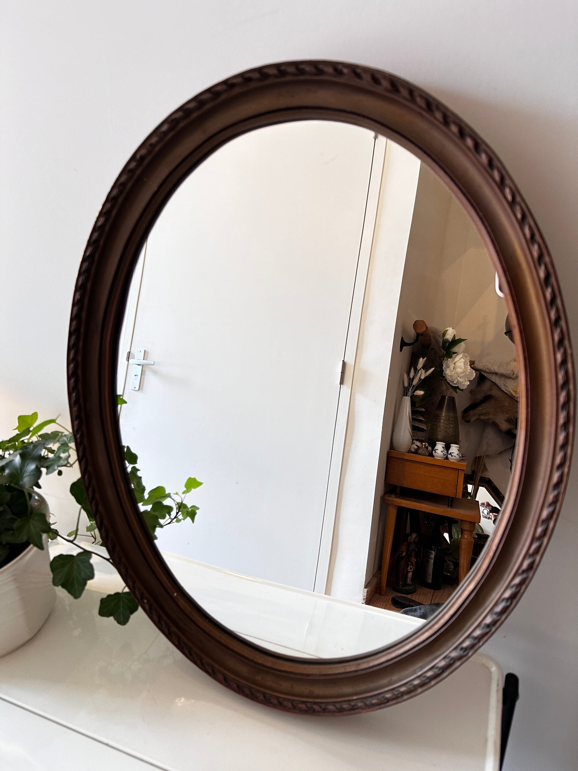 Een onwijs leuke vintage spiegel. Spiegel is in een mooie vintage staat. Heeft bovenin een kleine beschadiging, verder is de spiegel in een mooie vintage staat. Rand met een ornamenten design. Op te hangen aan een oogje achter