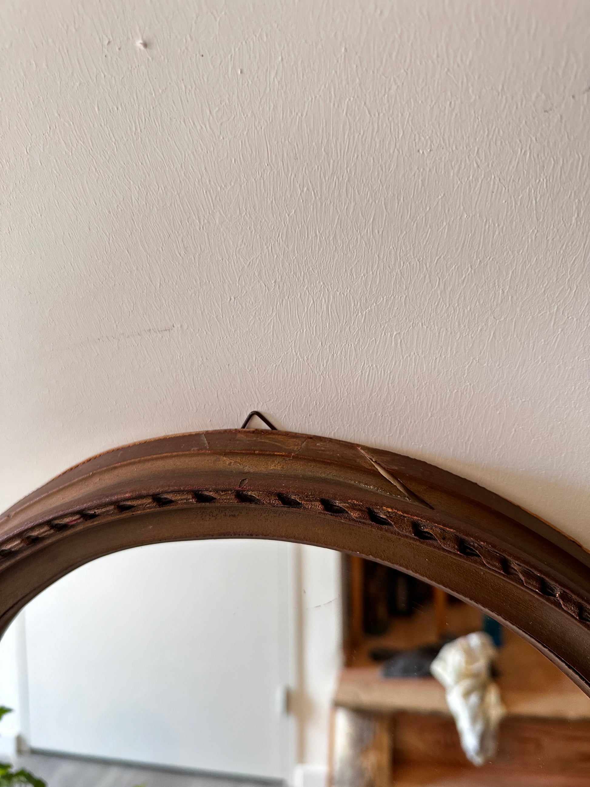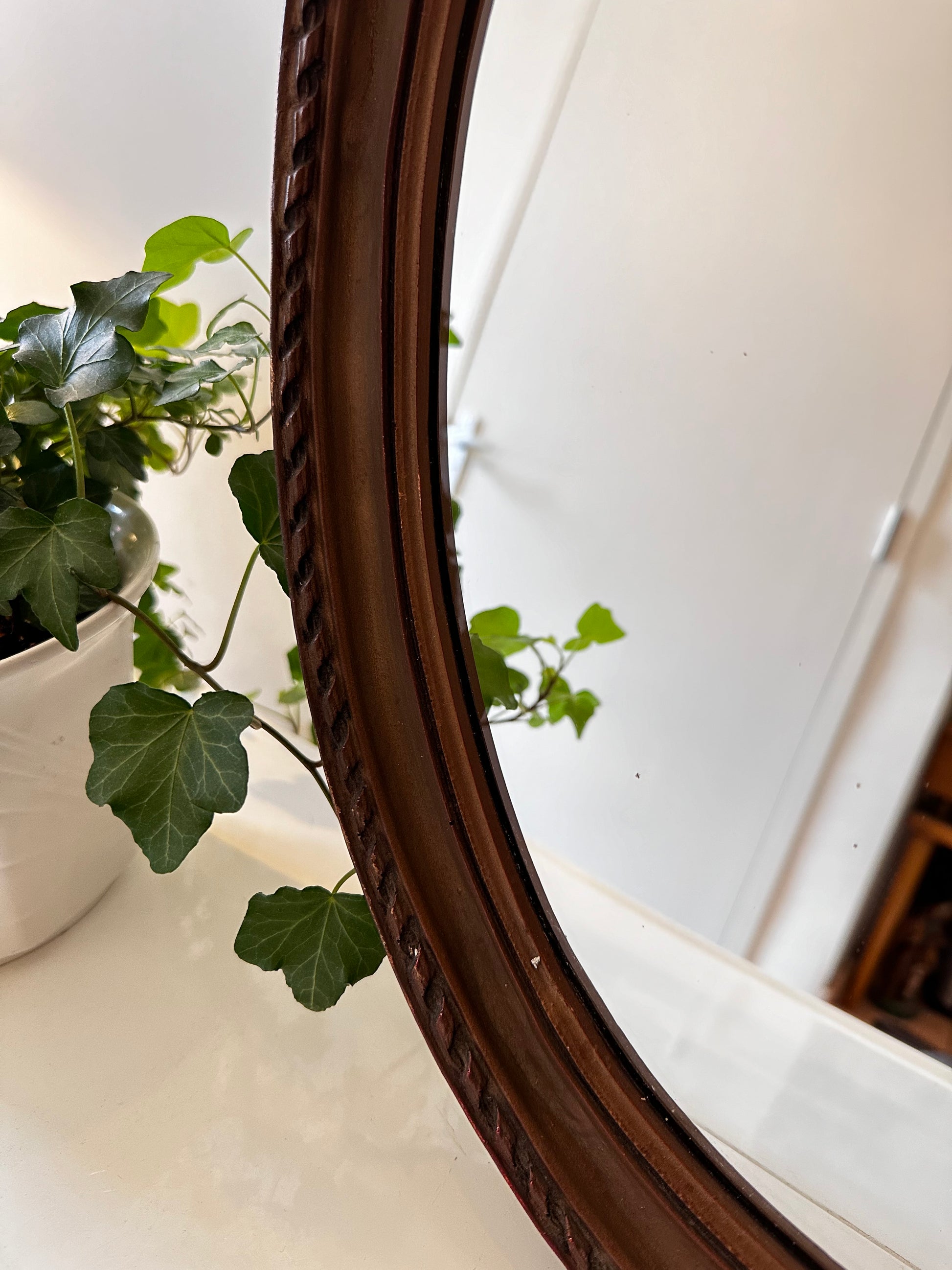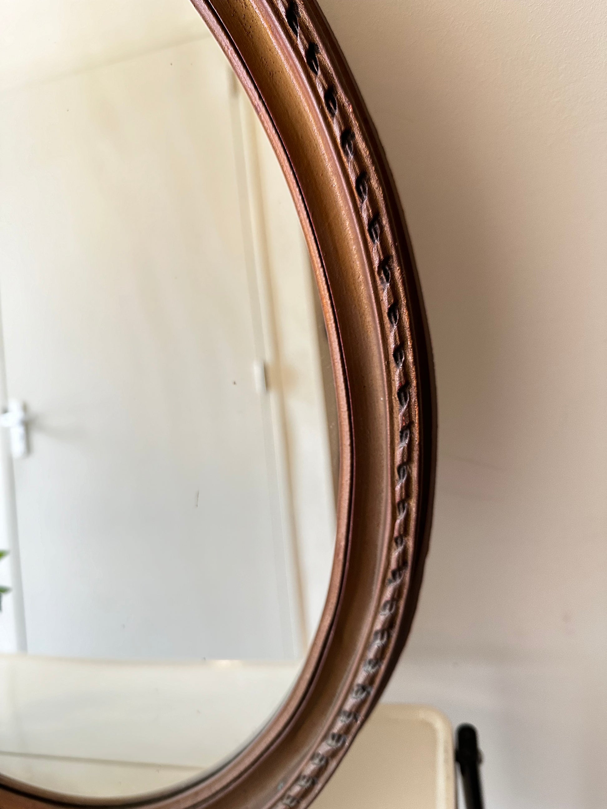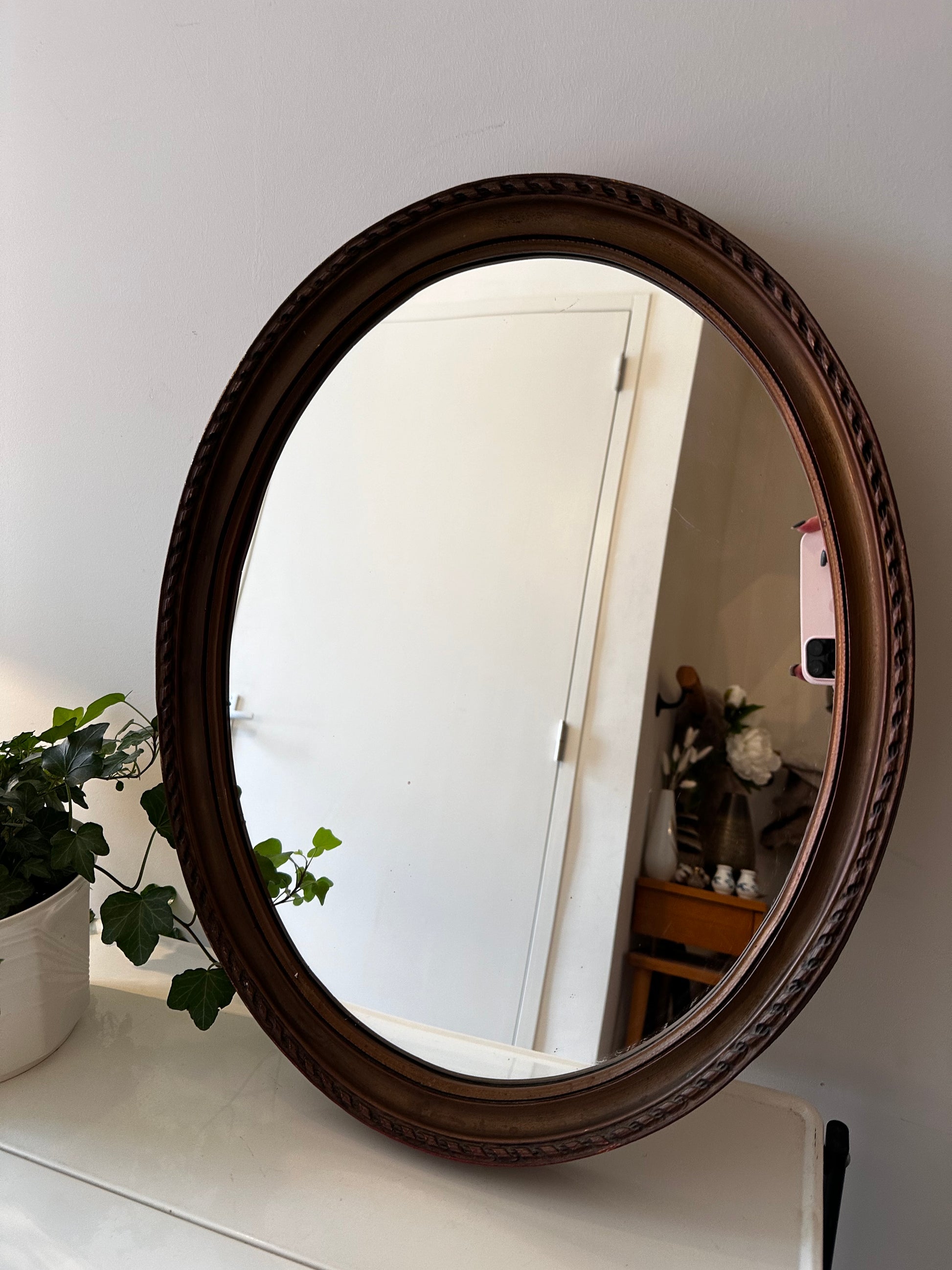 Een onwijs leuke vintage spiegel. Spiegel is in een mooie vintage staat. Heeft bovenin een kleine beschadiging, verder is de spiegel in een mooie vintage staat. Rand met een ornamenten design. Op te hangen aan een oogje achter
