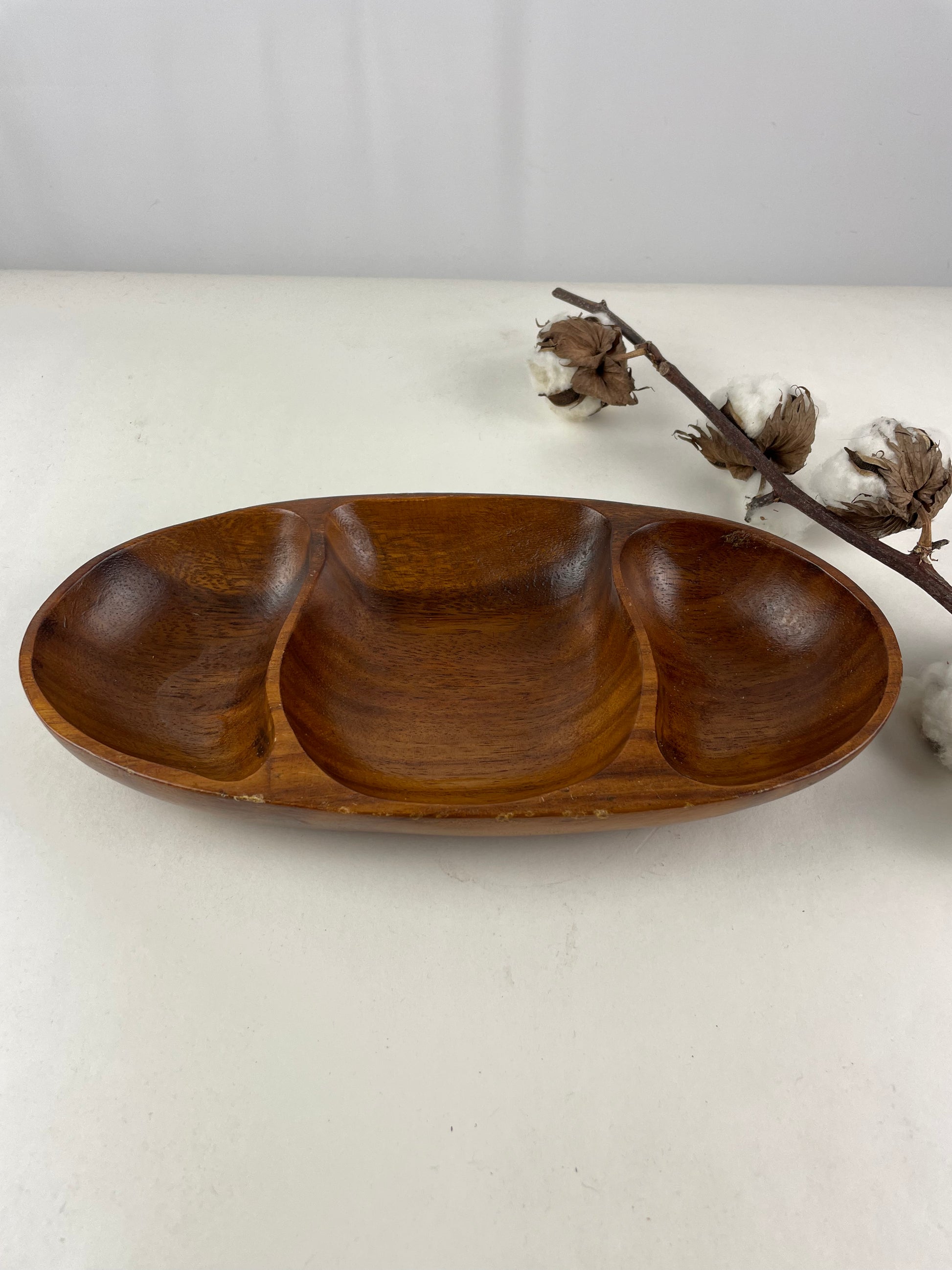 Uit de jaren ‘60 komt de mooie teakhouten hapjesschaal. De schaal heeft drie vakken nog een merk stickertje onder en is in een prachtige vintage staat.
