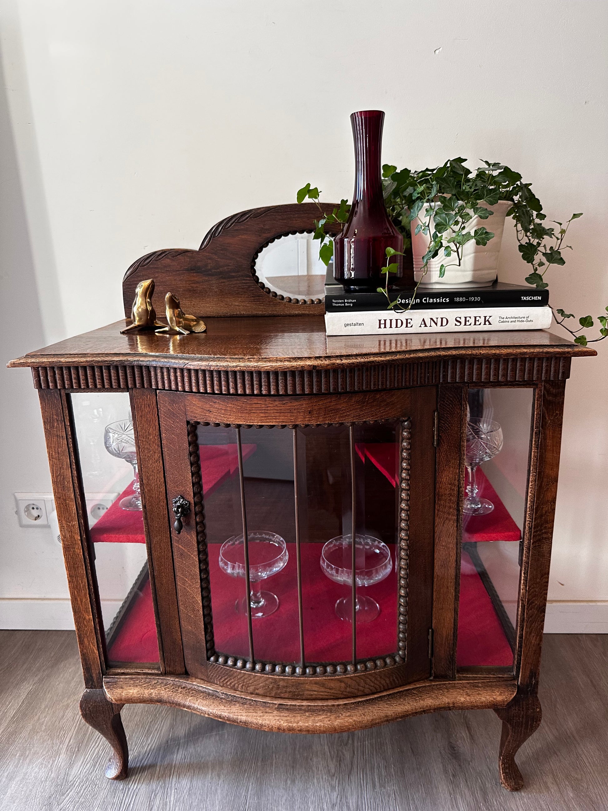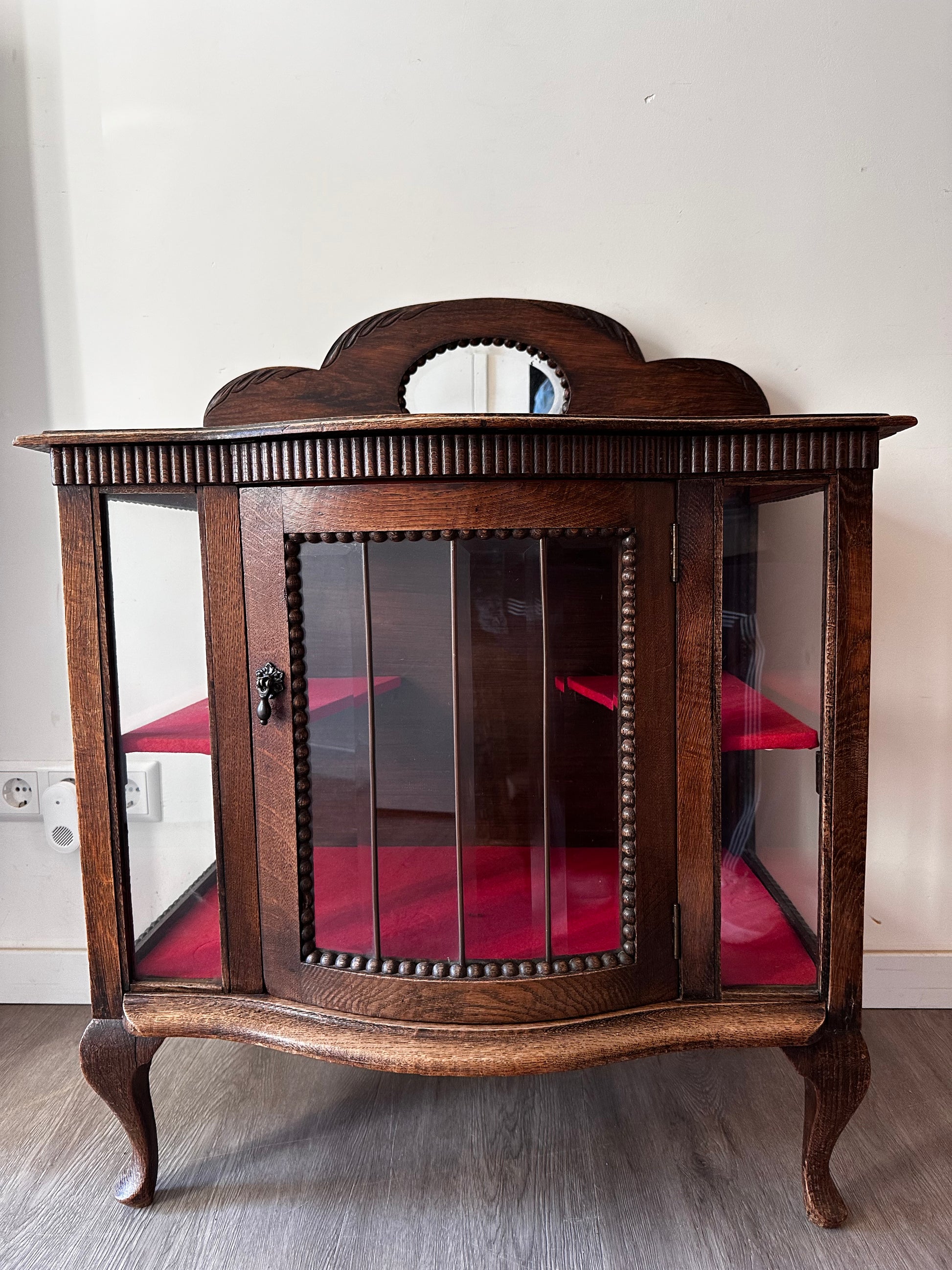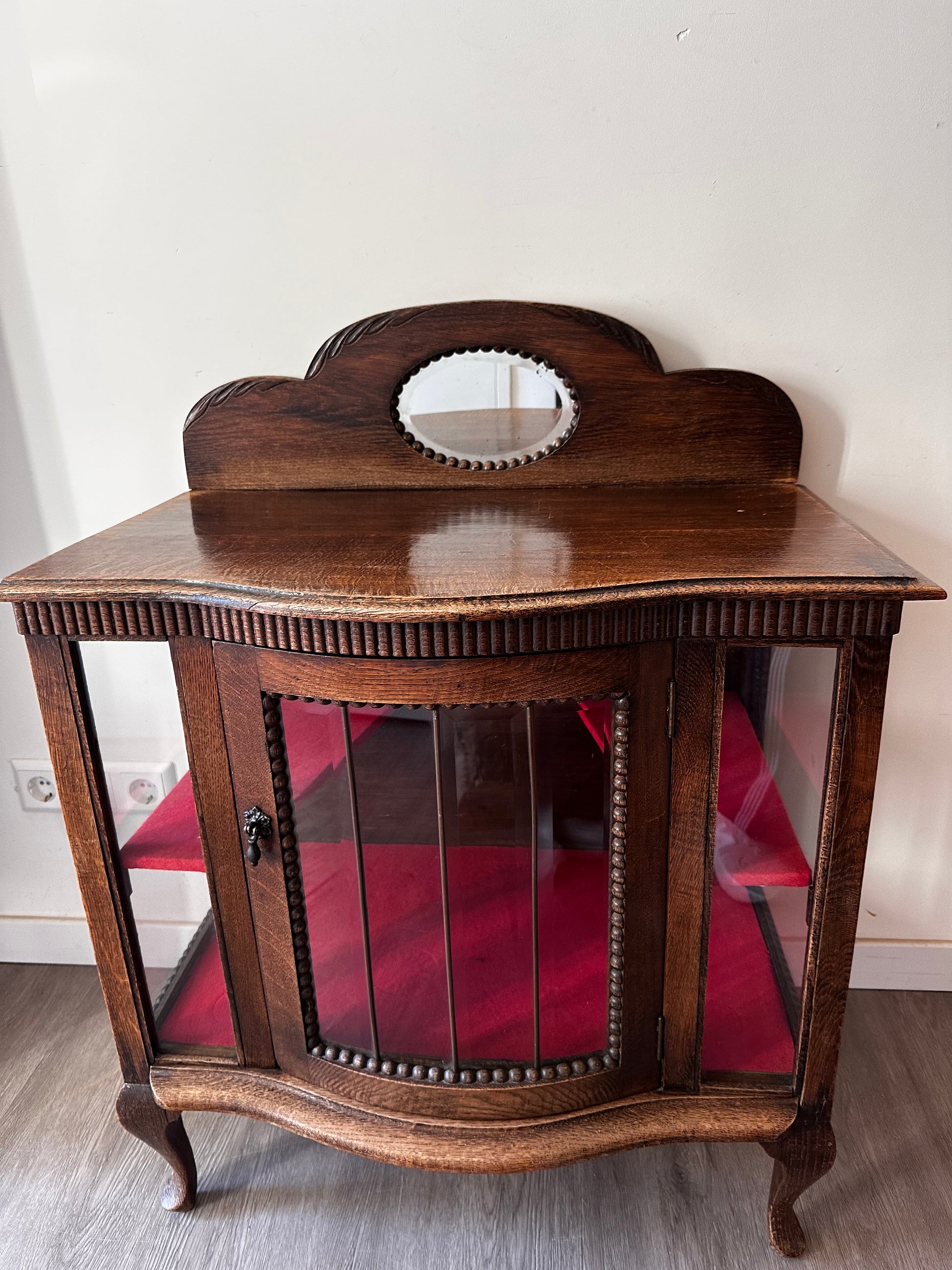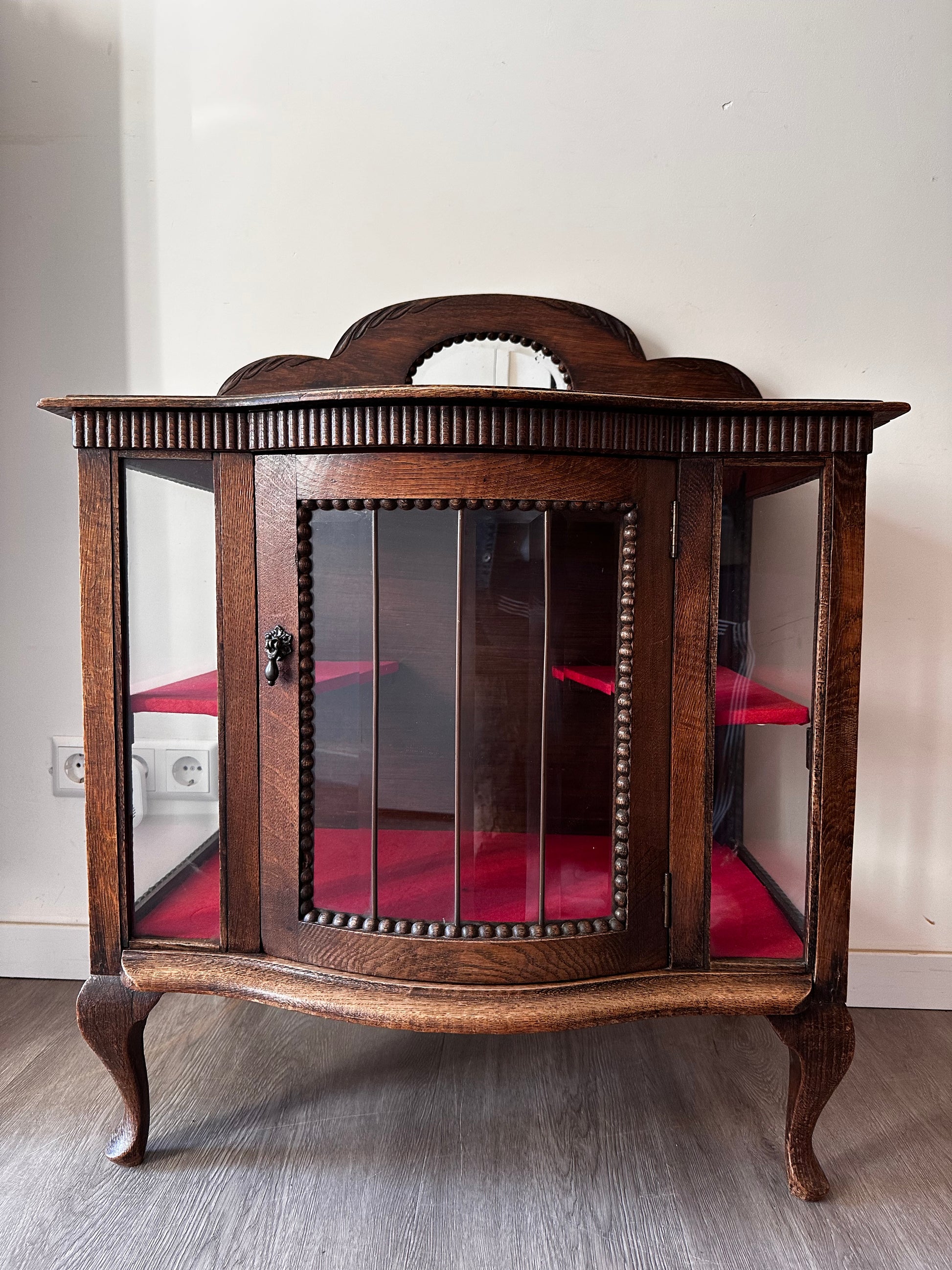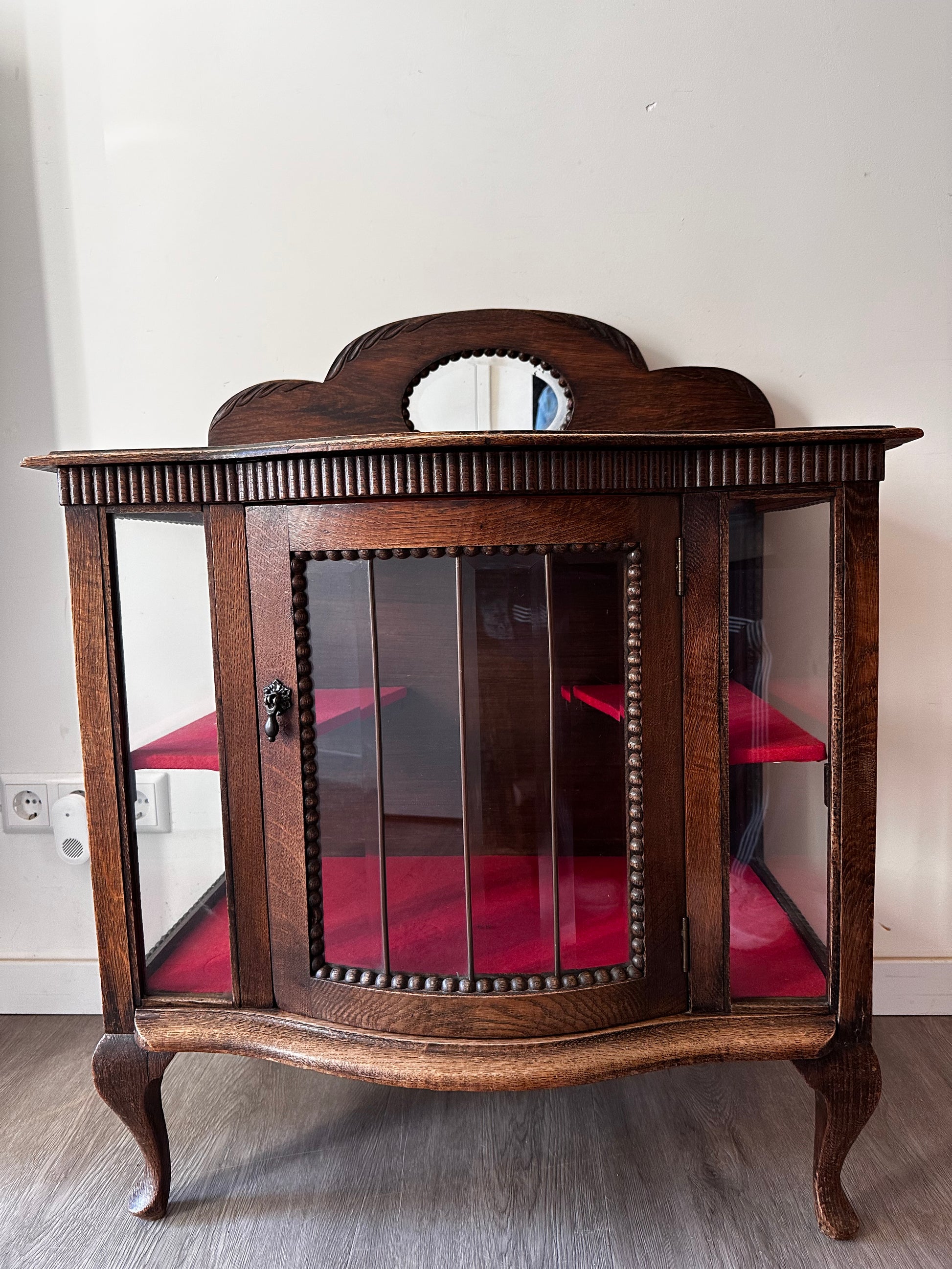 Echt een supertof theekastje met glas-in-lood details. Het kastje heeft een warme houttint, gebogen pootjes en een sierlijk spiegeltje bovenaan. Binnenin is het bekleed met rood vilt. Kastje heeft liefdevolle gebruiksporen, en aan de achterkant bij het opzetstuk zit een beschadiging