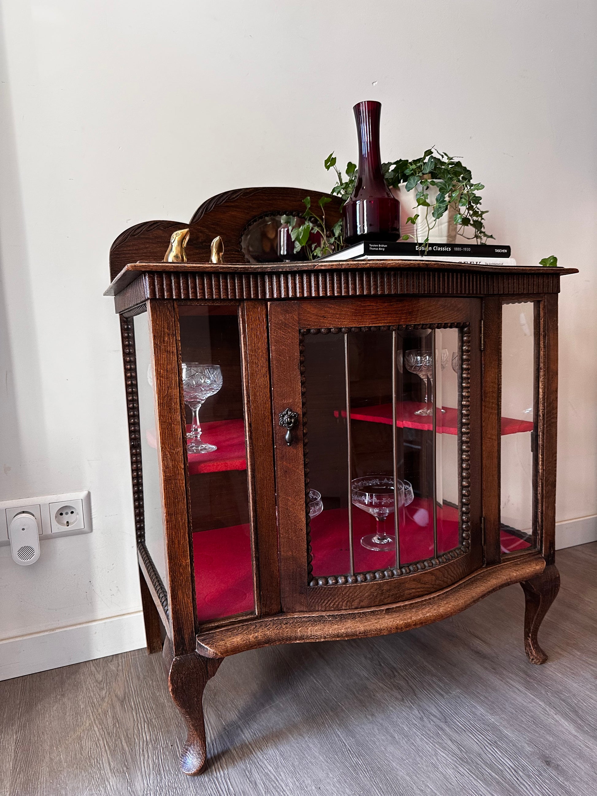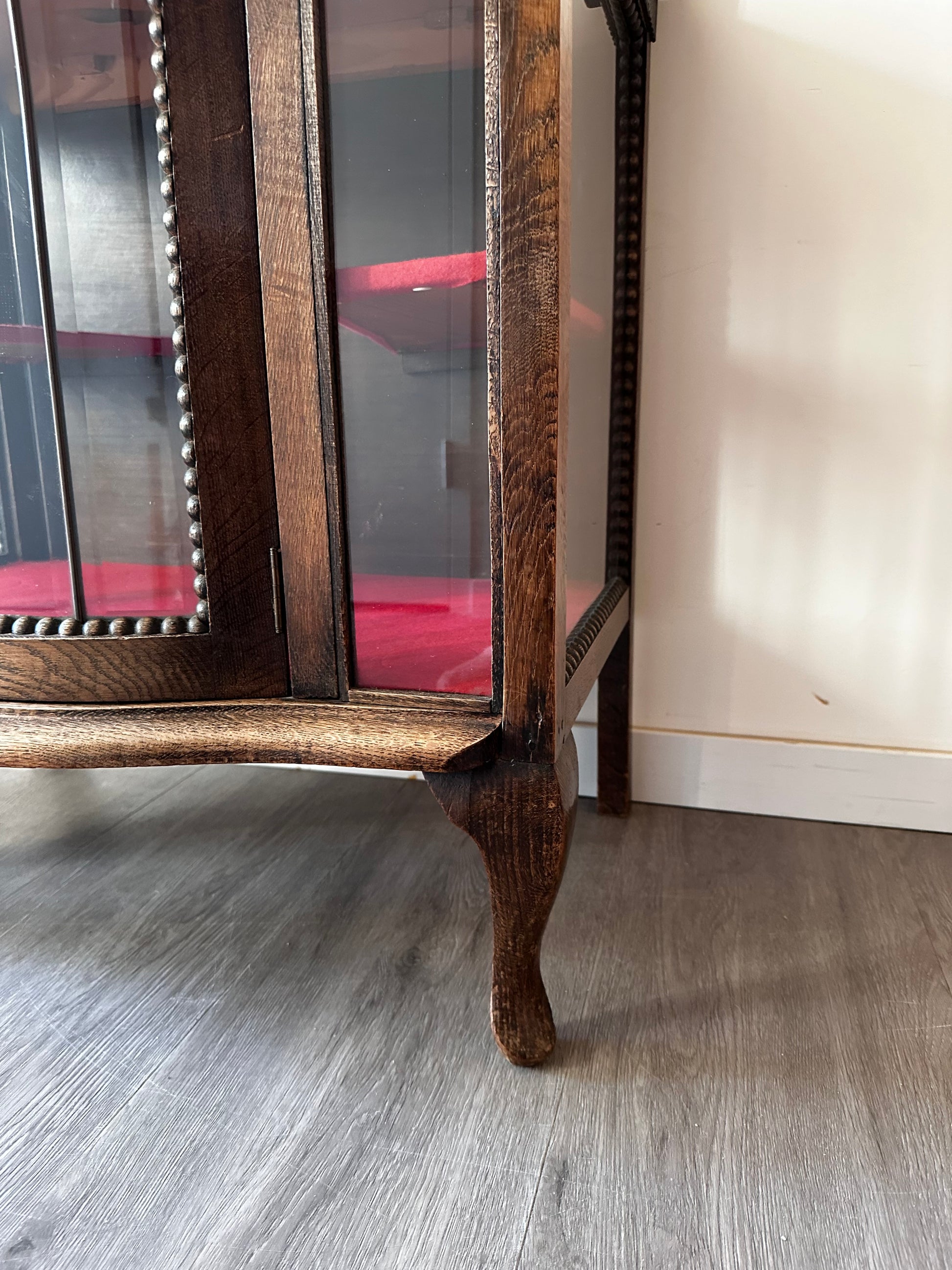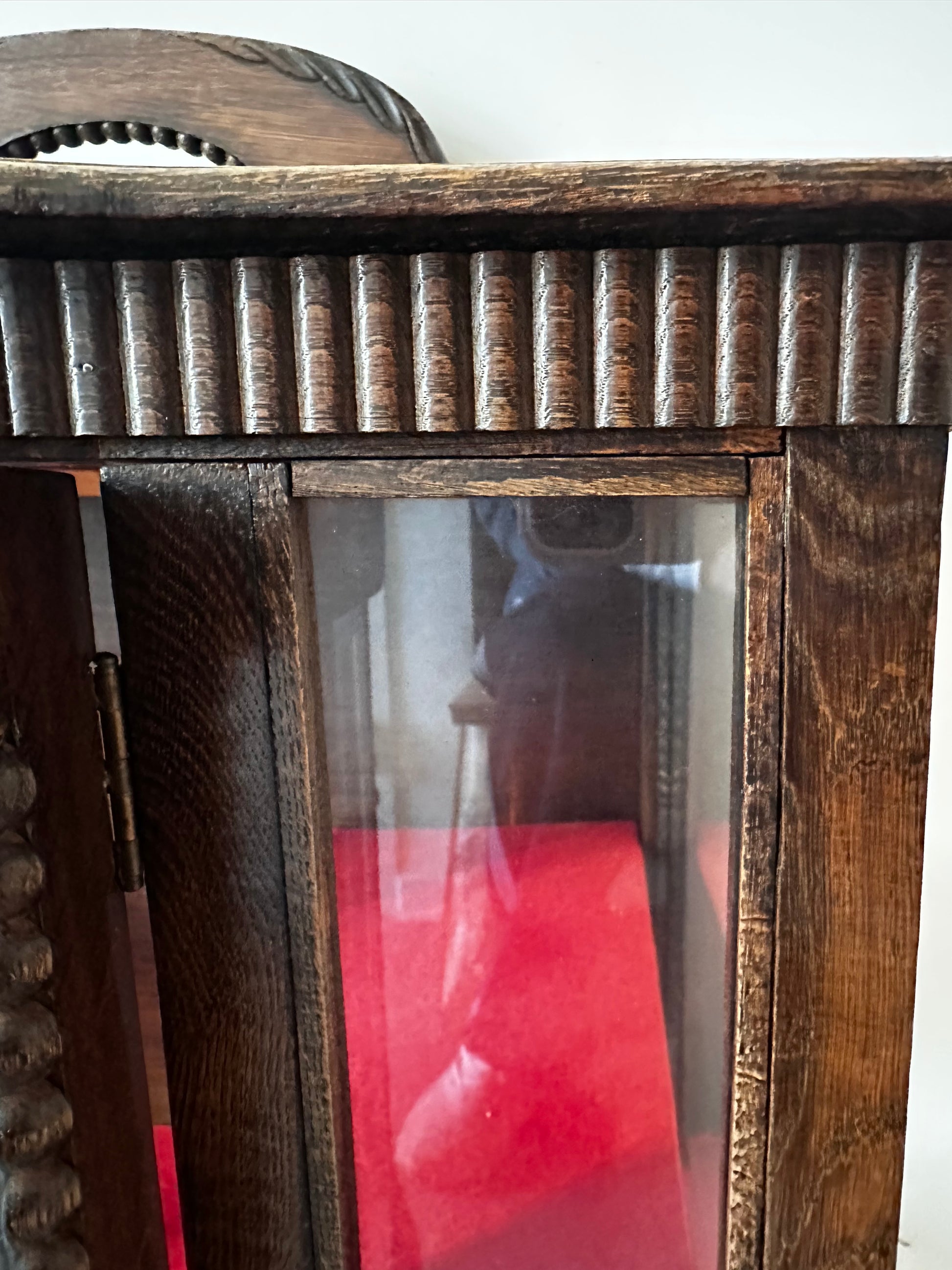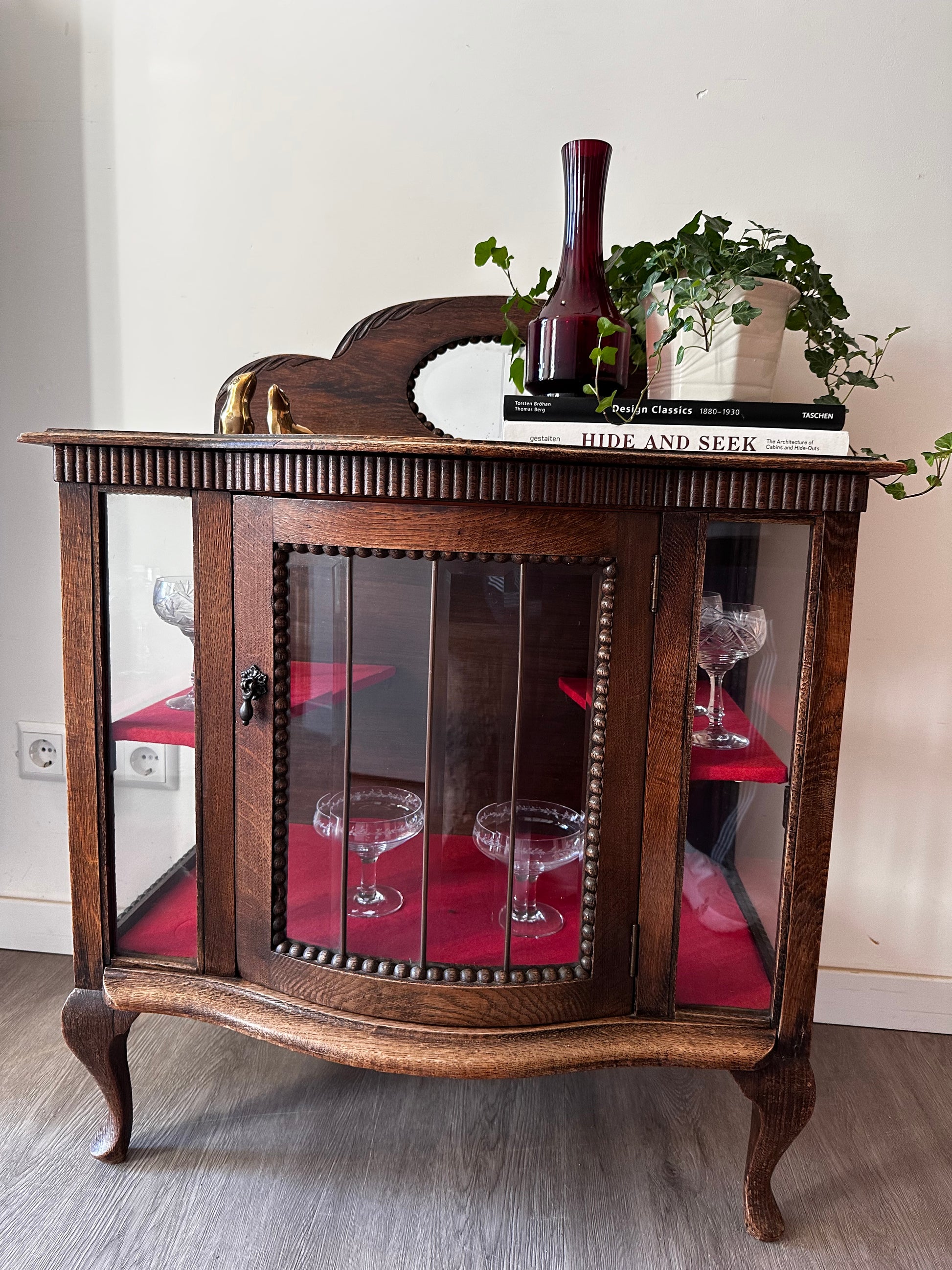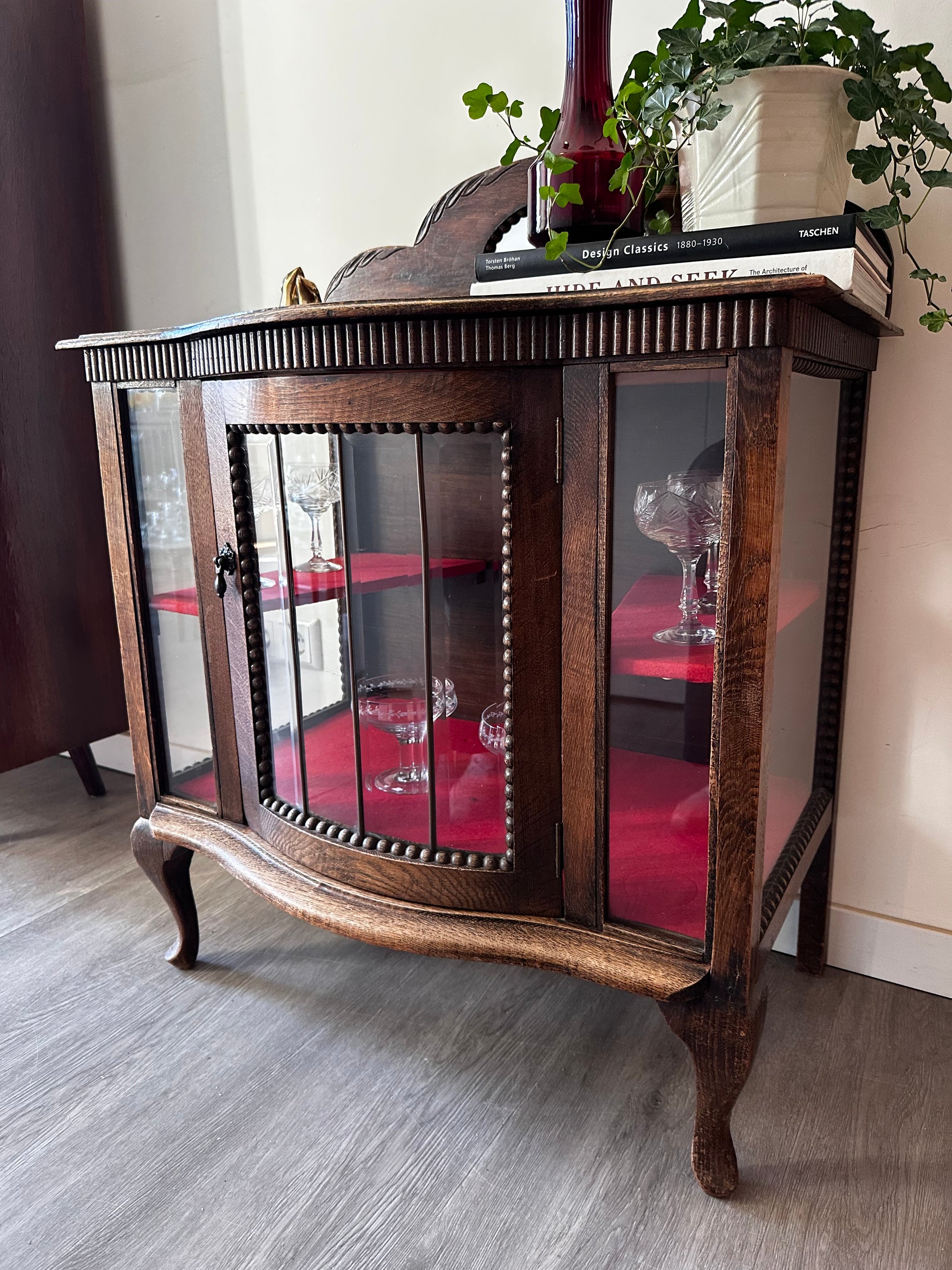 Echt een supertof theekastje met glas-in-lood details. Het kastje heeft een warme houttint, gebogen pootjes en een sierlijk spiegeltje bovenaan. Binnenin is het bekleed met rood vilt. Kastje heeft liefdevolle gebruiksporen, en aan de achterkant bij het opzetstuk zit een beschadiging