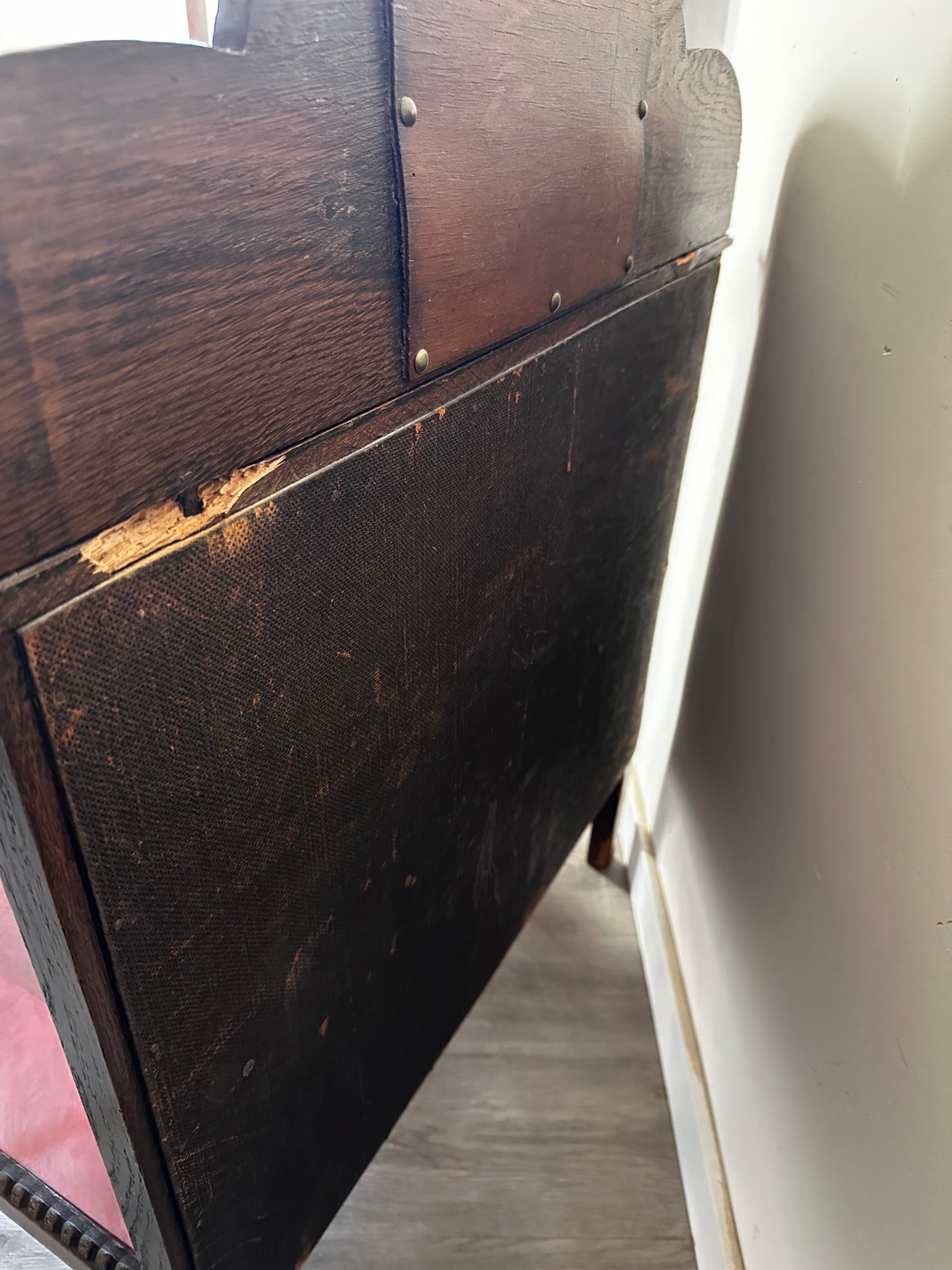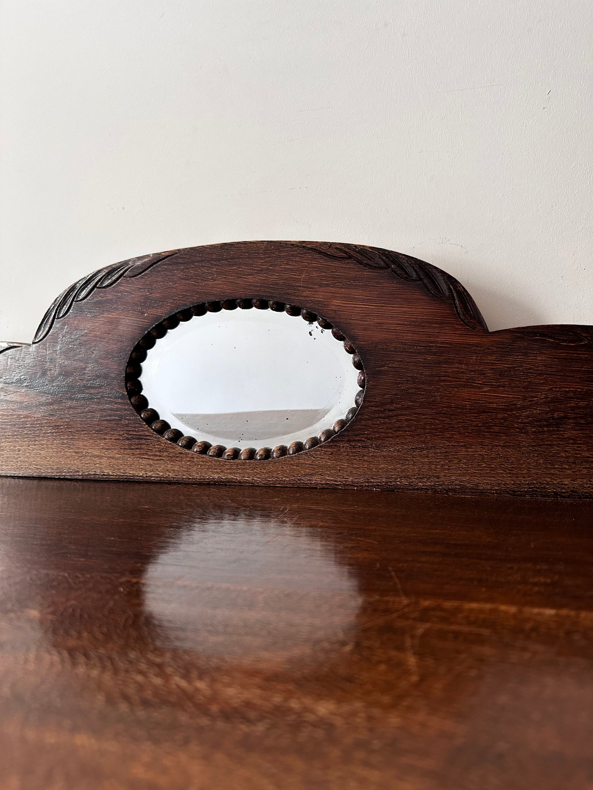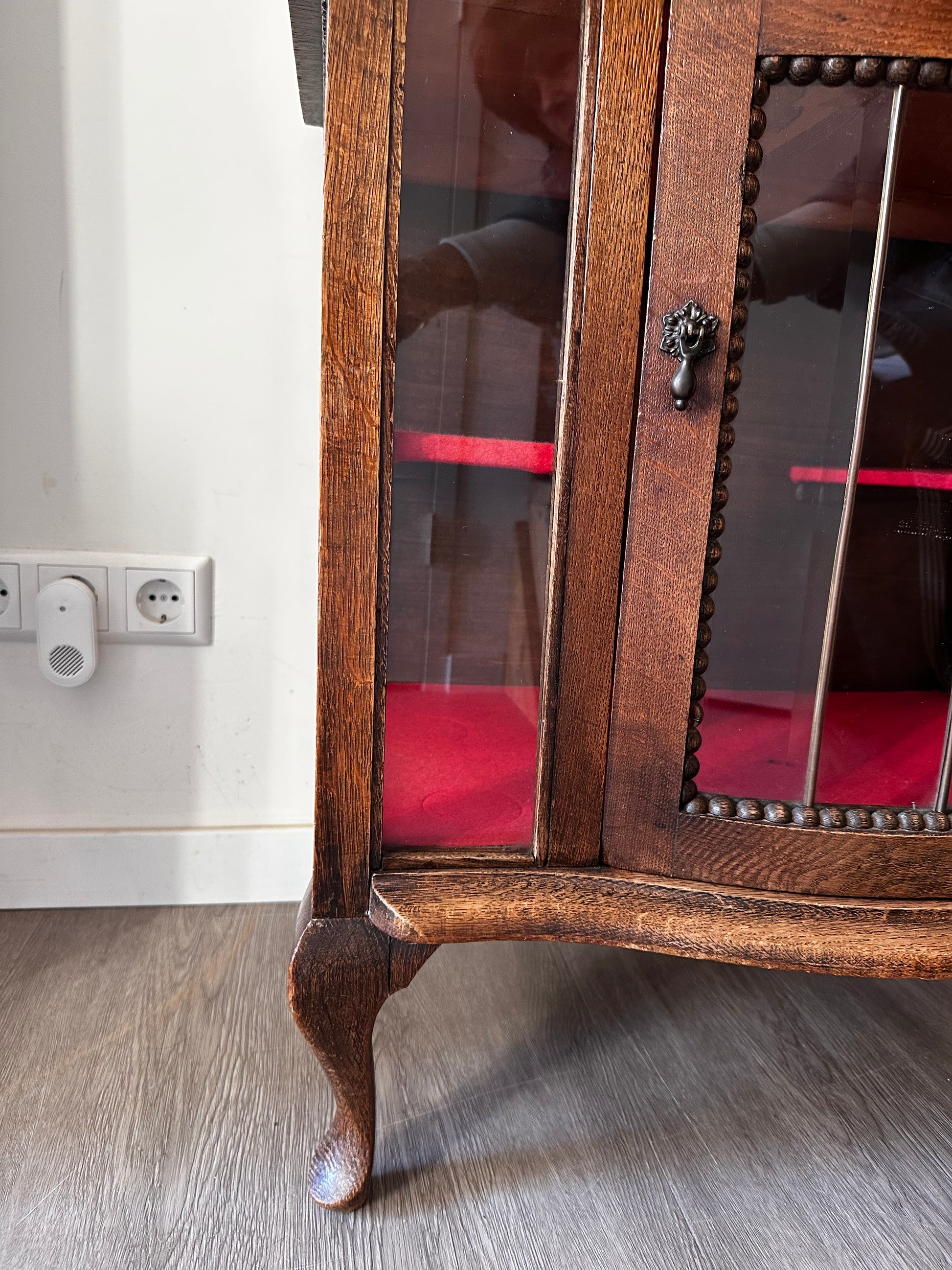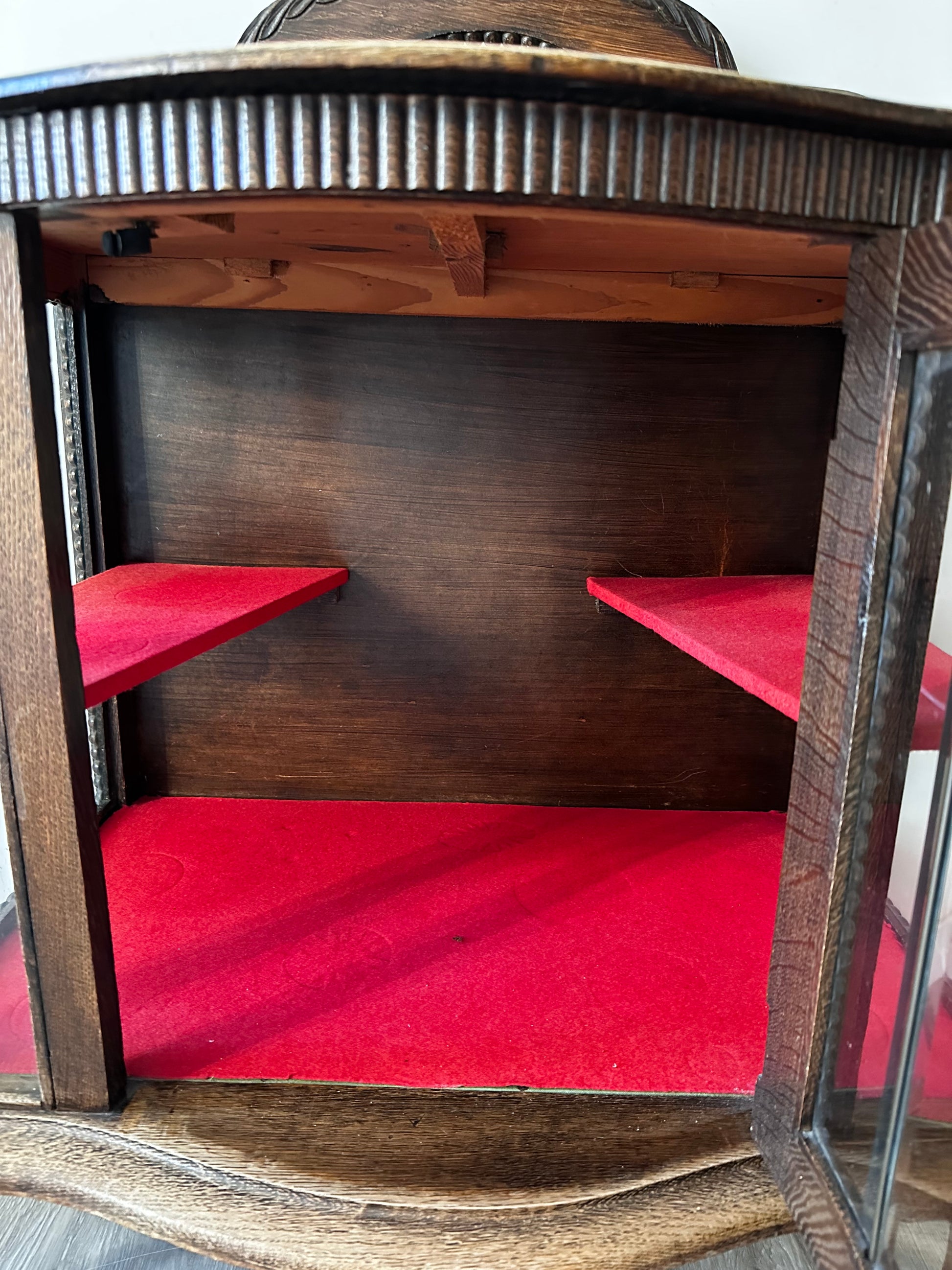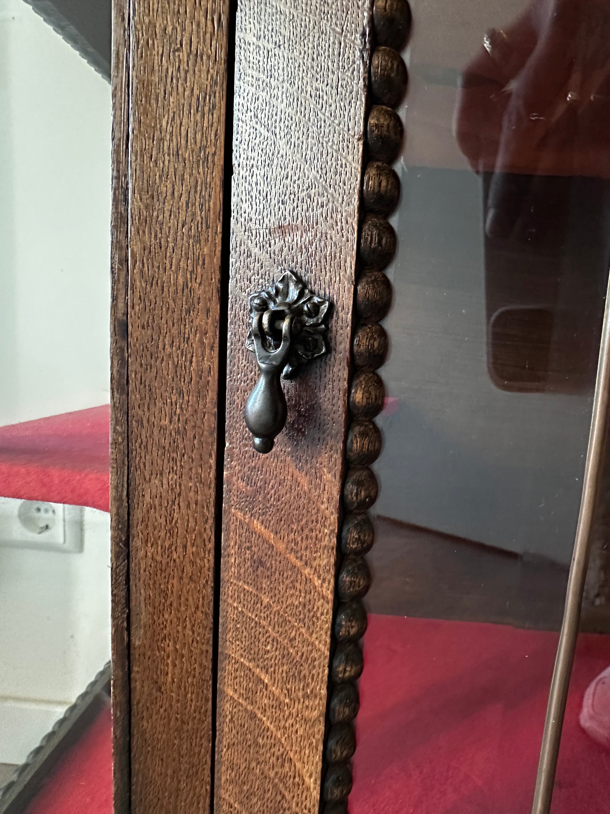 Echt een supertof theekastje met glas-in-lood details. Het kastje heeft een warme houttint, gebogen pootjes en een sierlijk spiegeltje bovenaan. Binnenin is het bekleed met rood vilt. Kastje heeft liefdevolle gebruiksporen, en aan de achterkant bij het opzetstuk zit een beschadiging