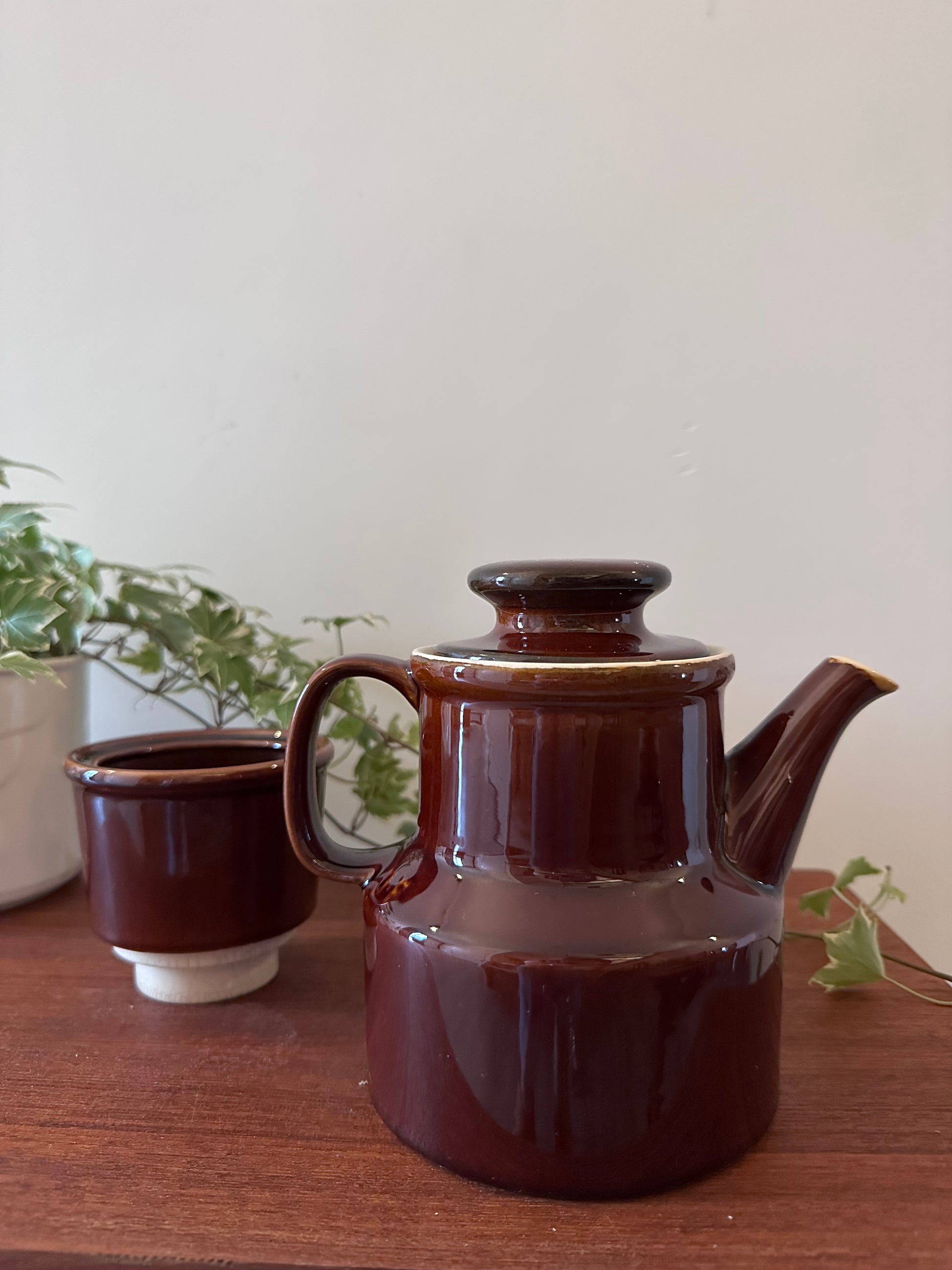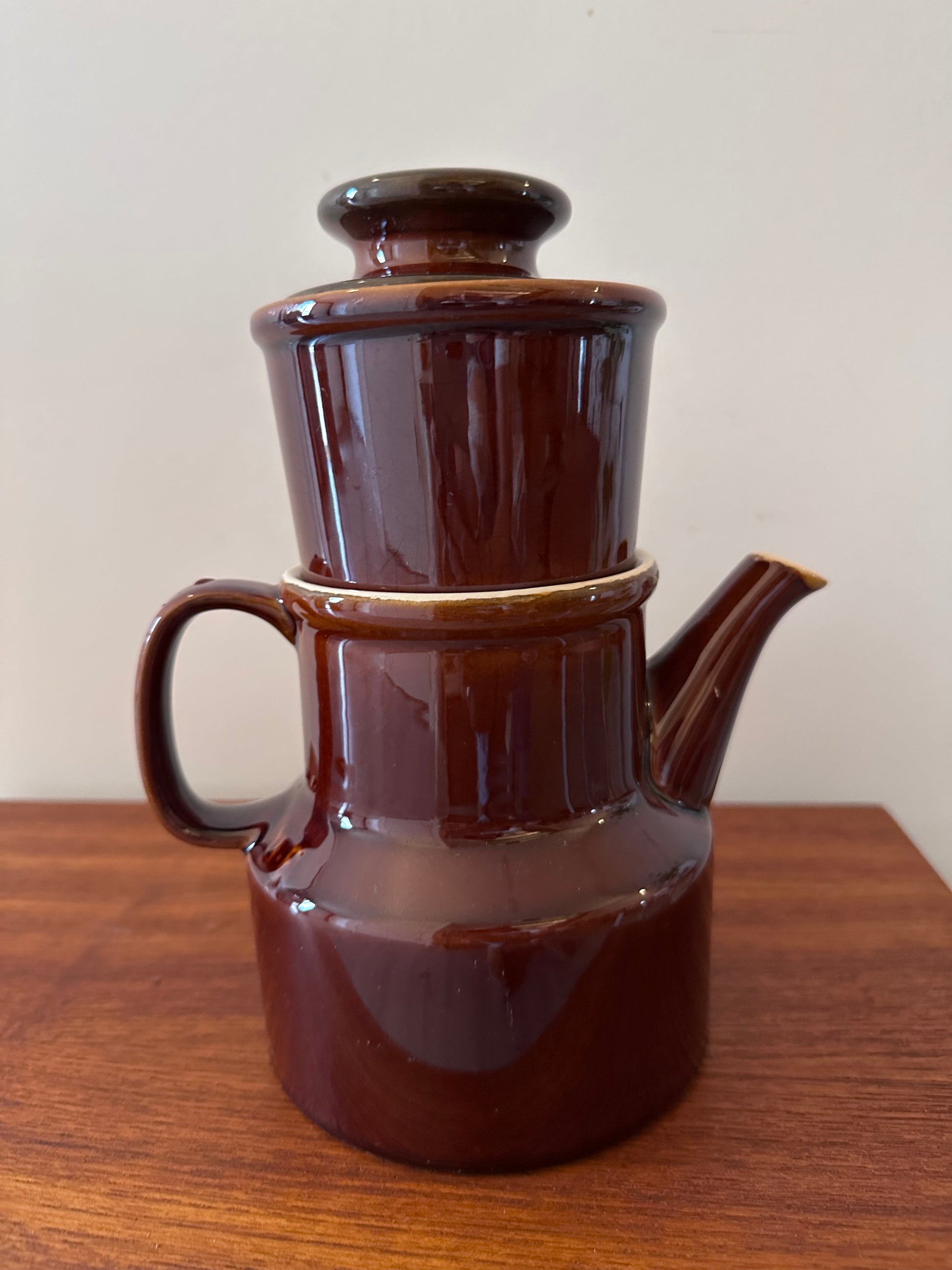 Deze zie je niet vaak een theepot met een thee zeef van keramiek. De deksel past zoveel op de zeef als op de theepot. Gemerkt onder. In een perfecte vintage staat. Het keramiek is mooi glanzend geglazuurd. Totale hoogte 22 cm