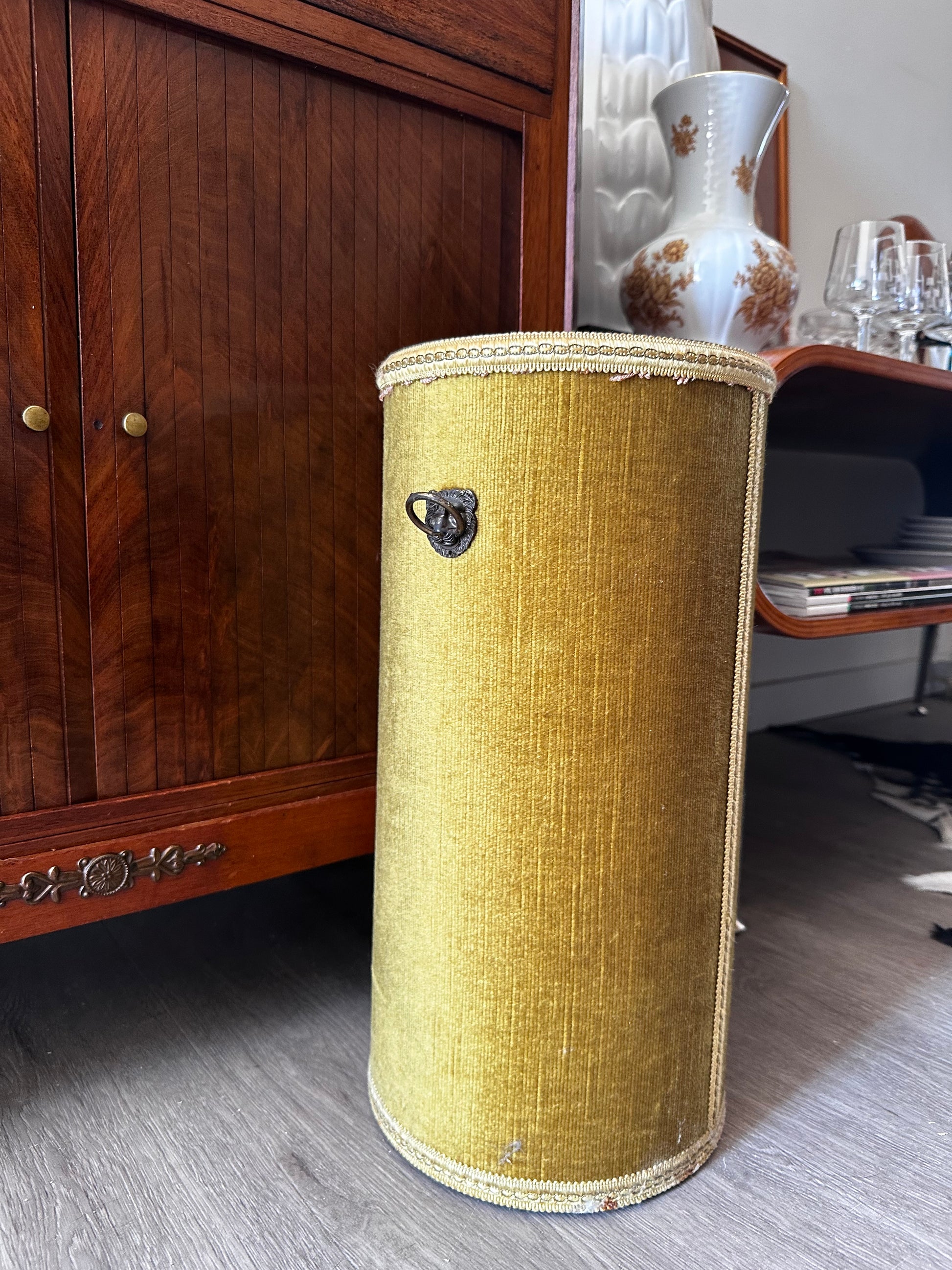 Aangezien het toch bijna iedere dag regent hier in Nederland is deze paraplu bak toch een echte mist have?! In een mooie vintage staat, bekleed met groen velvet en een kanten randje. Voorzien aan de zijkant van twee knoppen.