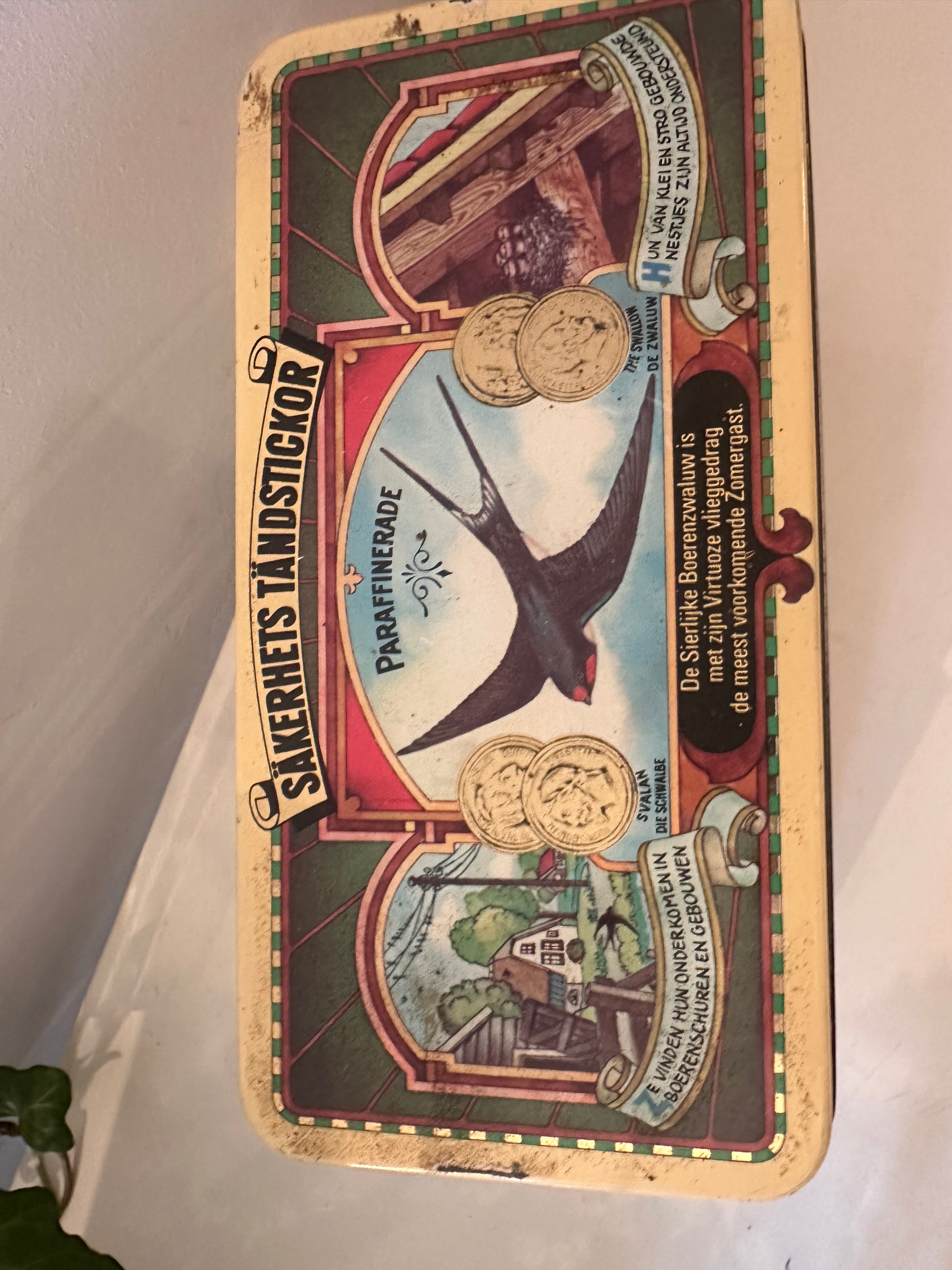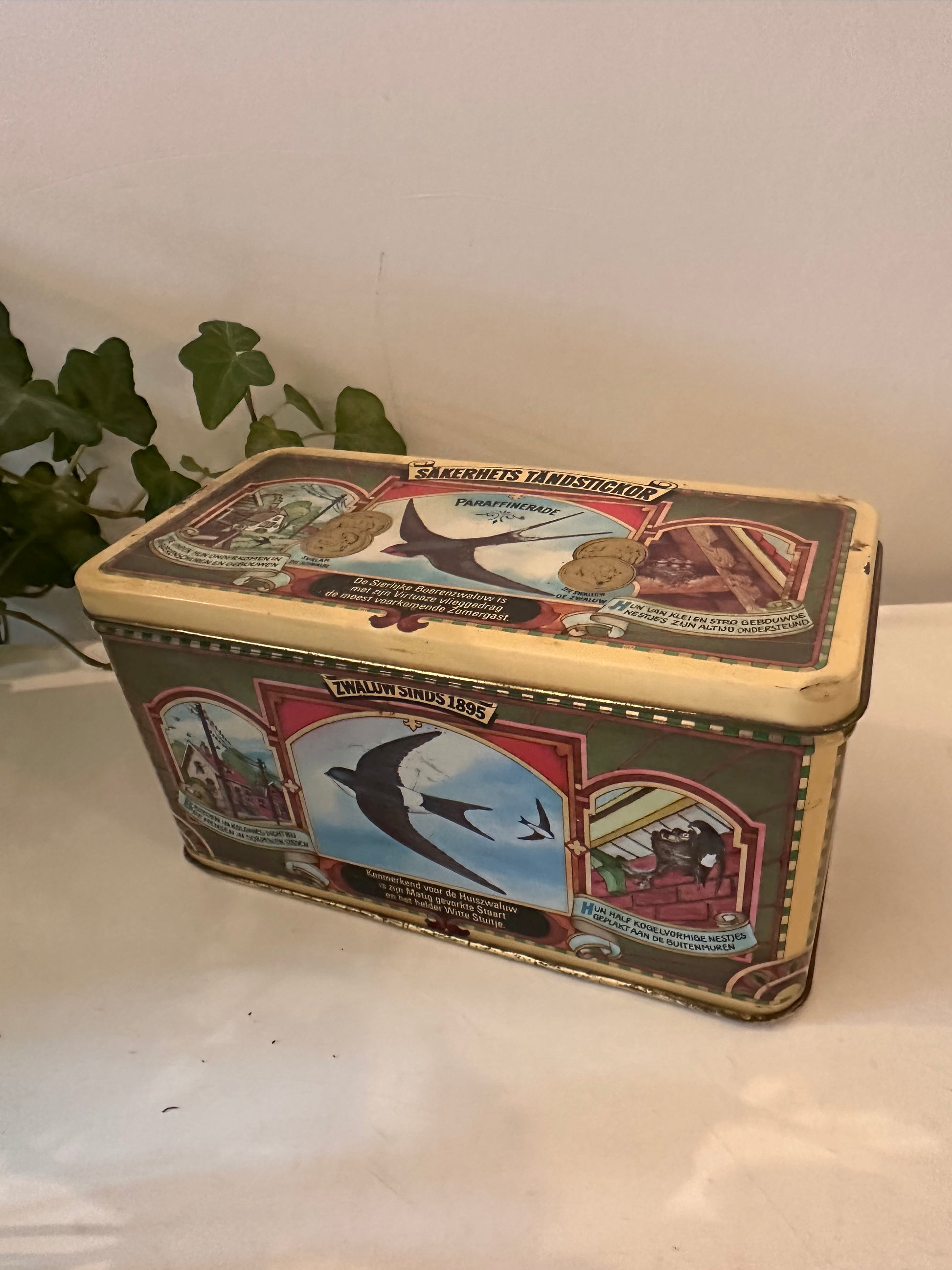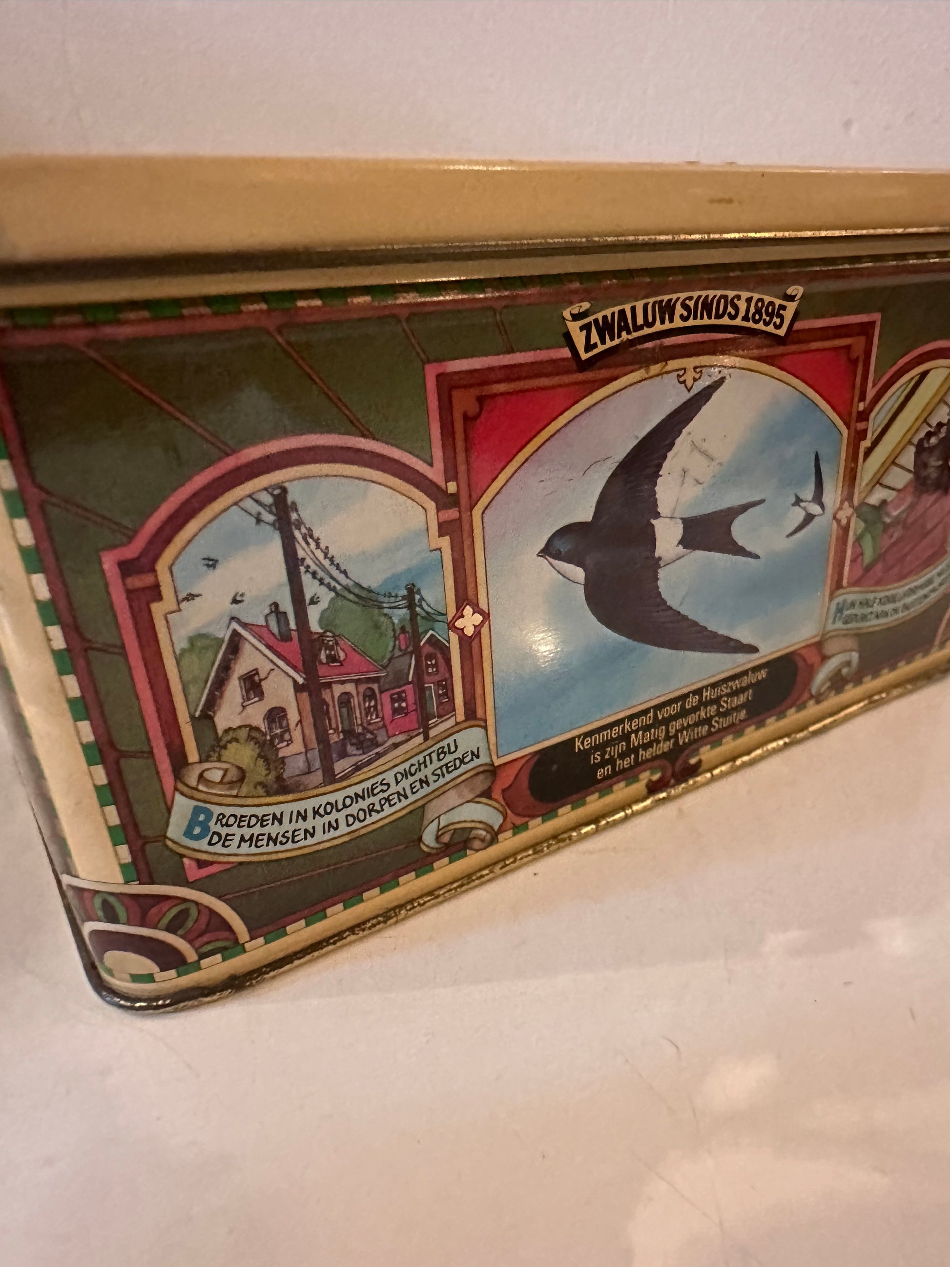 Kleurrijk en nostalgisch blikje met illustraties van verschillende soorten zwaluwen en hun nesten. Ooit gemaakt als lucifersblik van het bekende merk Zwaluw, inmiddels een tof verzamelobject of gewoon leuk om kleine spulletjes in te bewaren. Het blik heeft lichte gebruikssporen maar ziet er nog steeds super uit. Q317