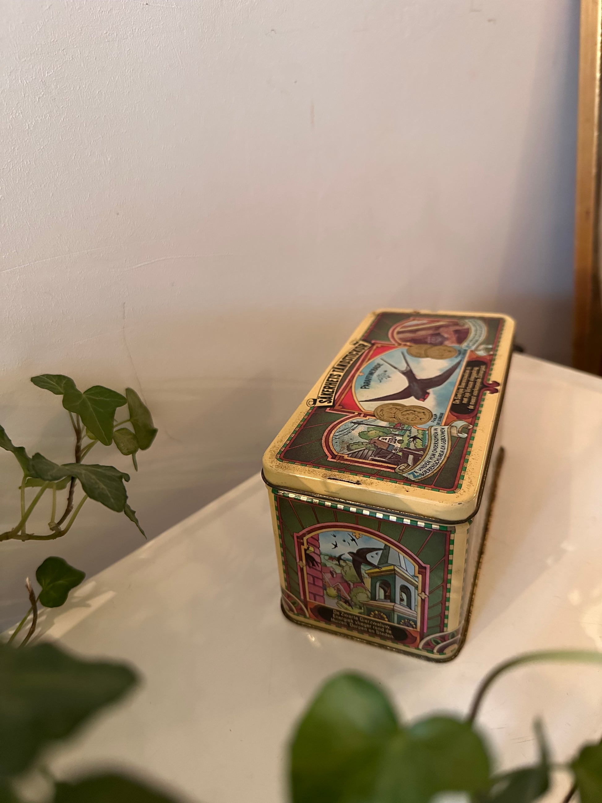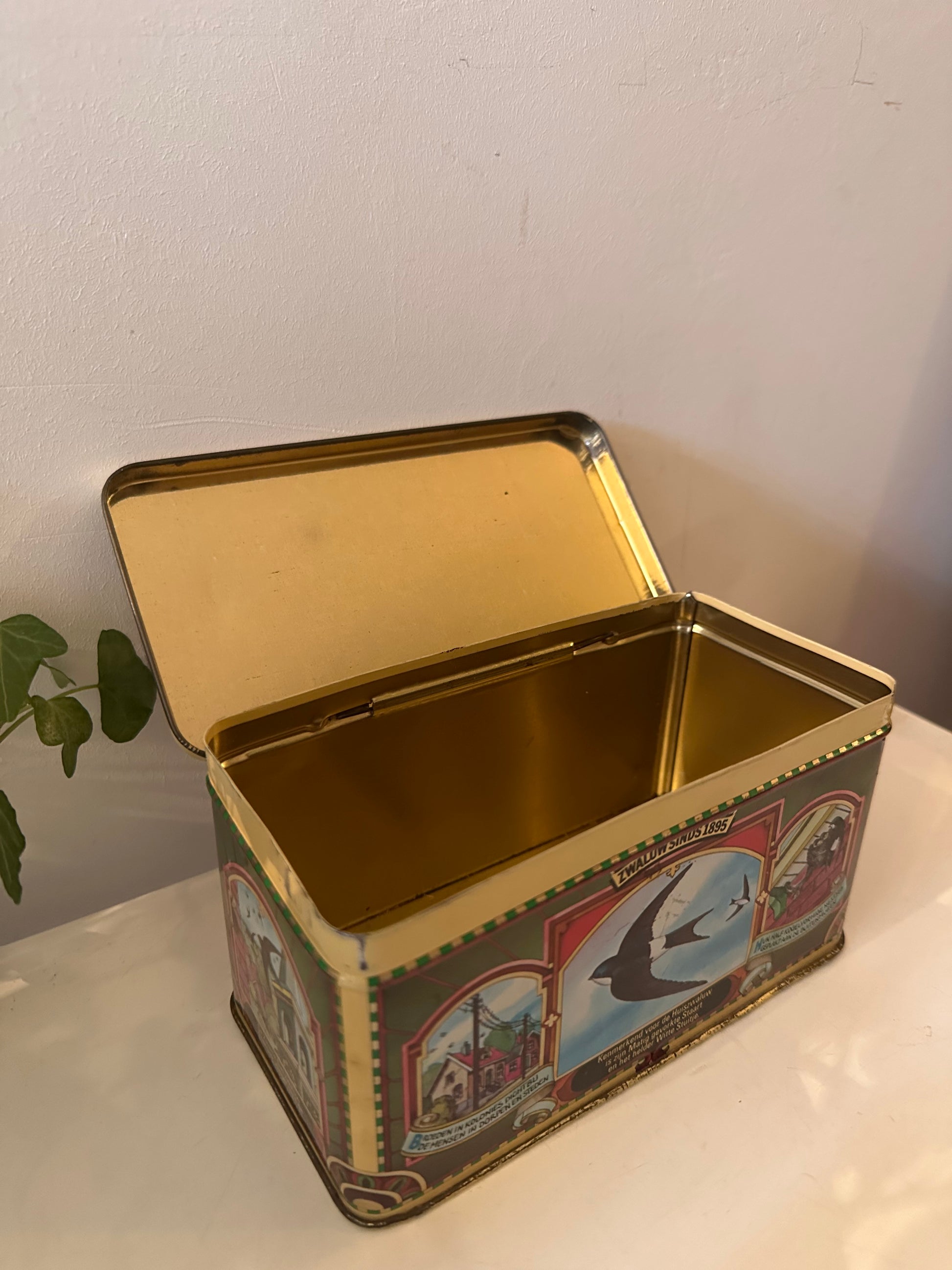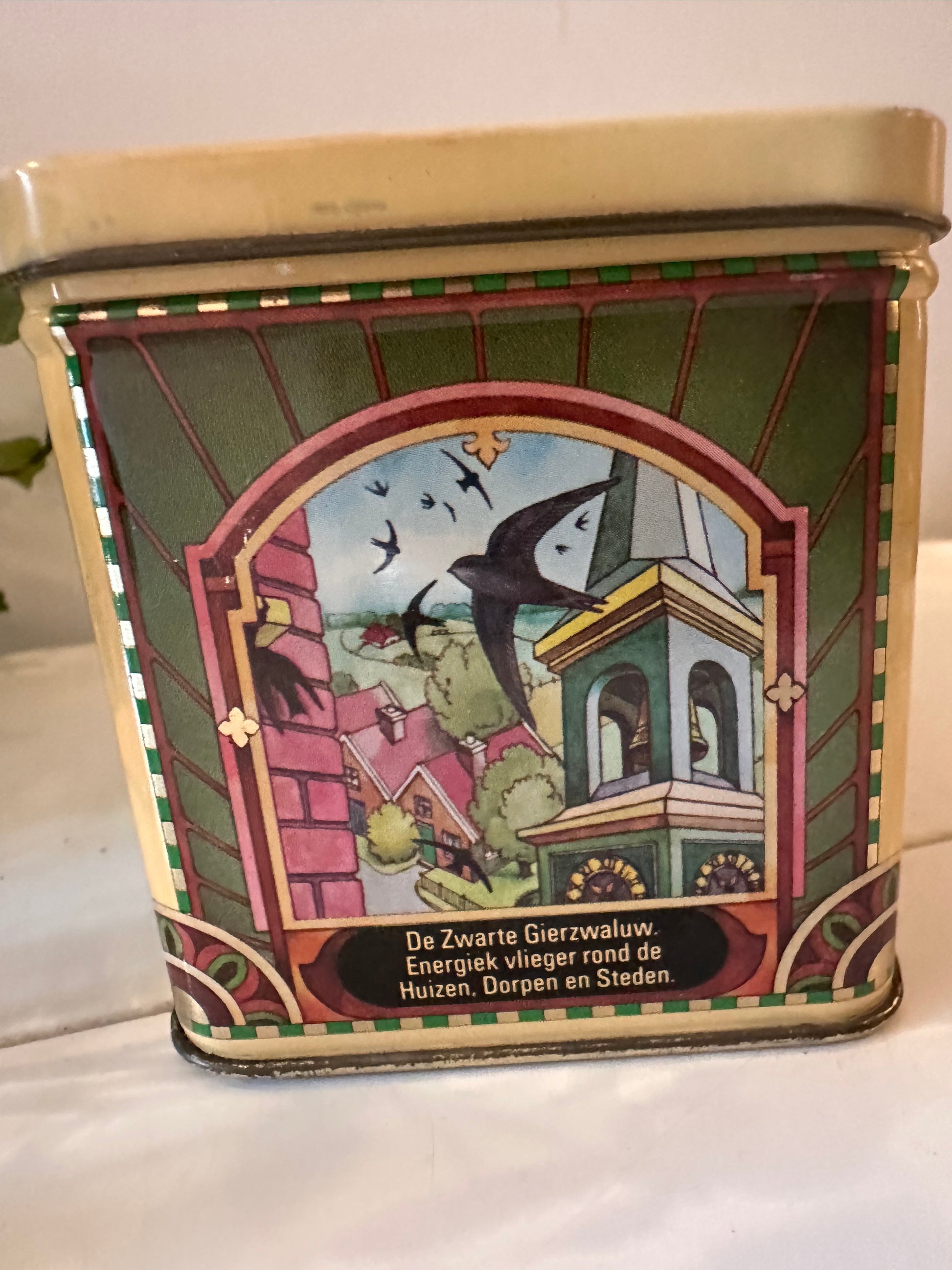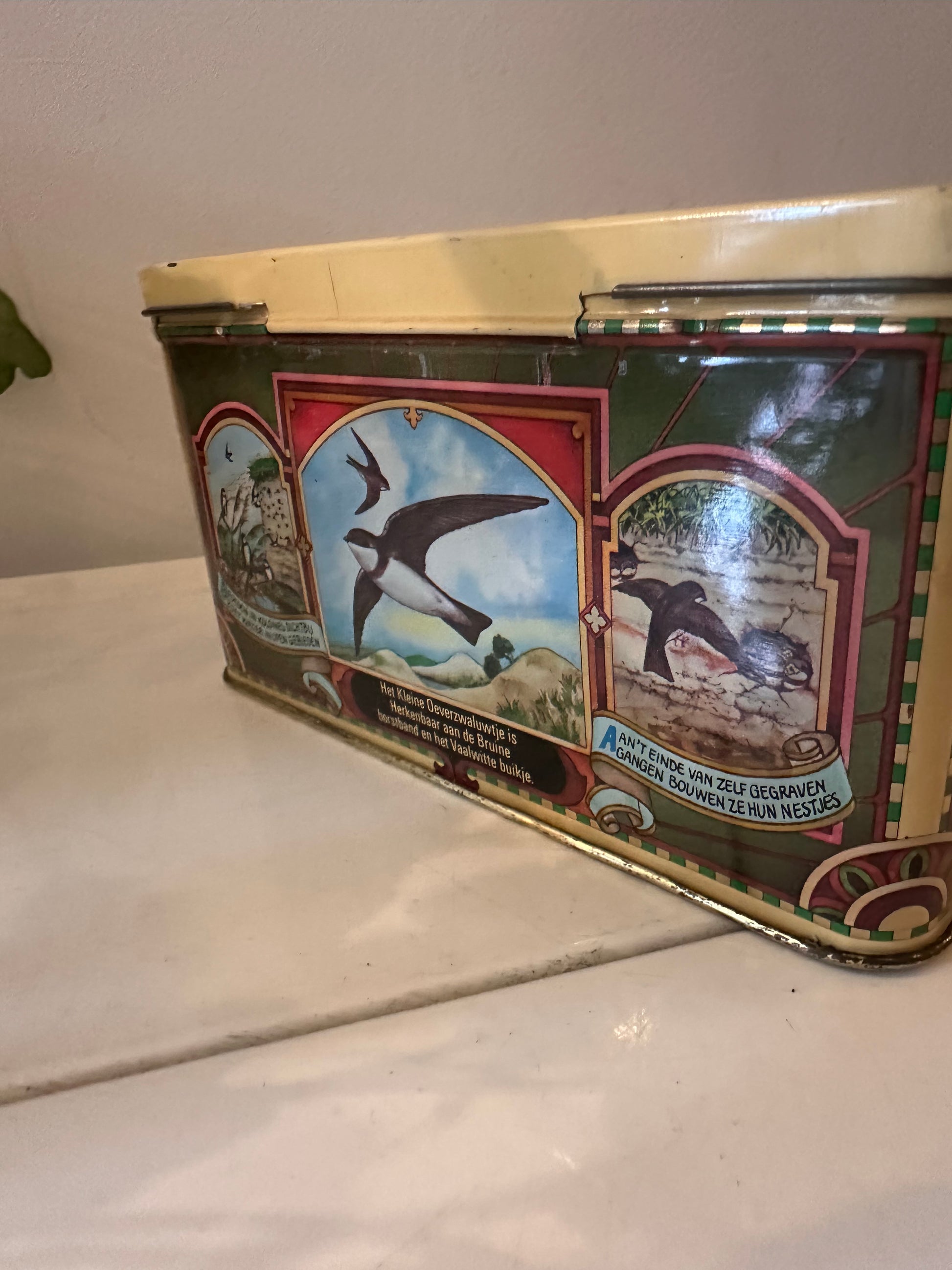 Kleurrijk en nostalgisch blikje met illustraties van verschillende soorten zwaluwen en hun nesten. Ooit gemaakt als lucifersblik van het bekende merk Zwaluw, inmiddels een tof verzamelobject of gewoon leuk om kleine spulletjes in te bewaren. Het blik heeft lichte gebruikssporen maar ziet er nog steeds super uit. Q317
