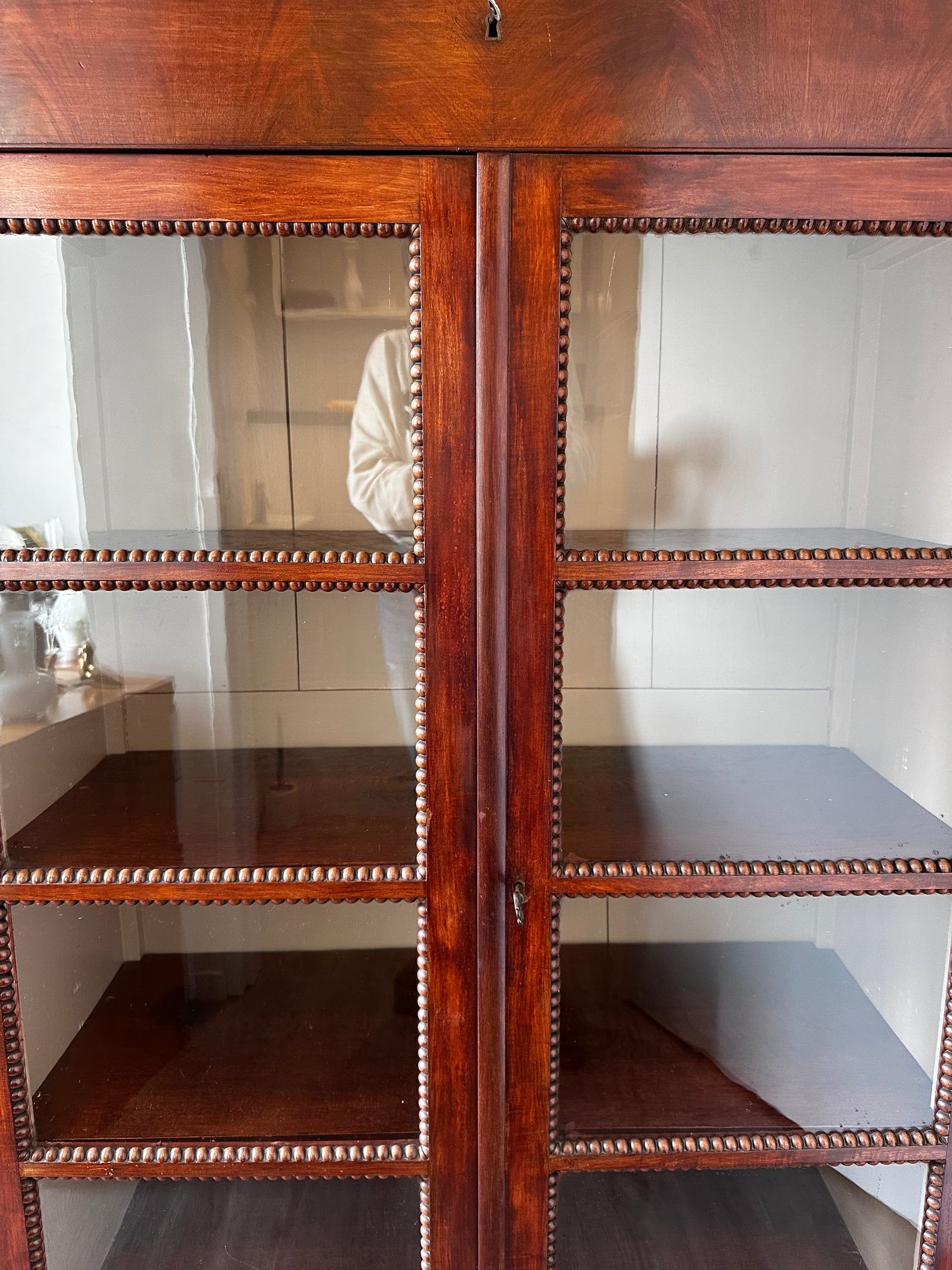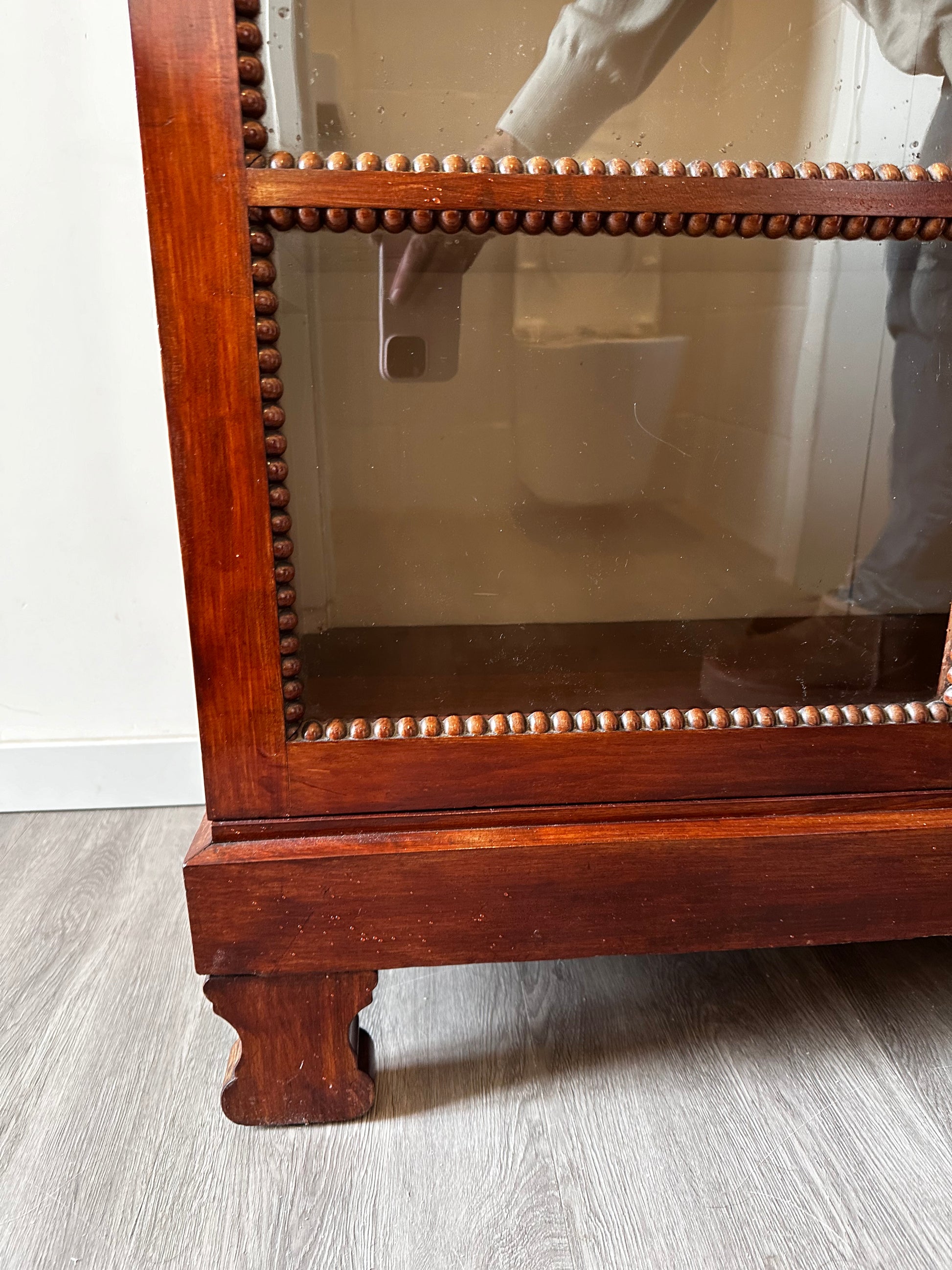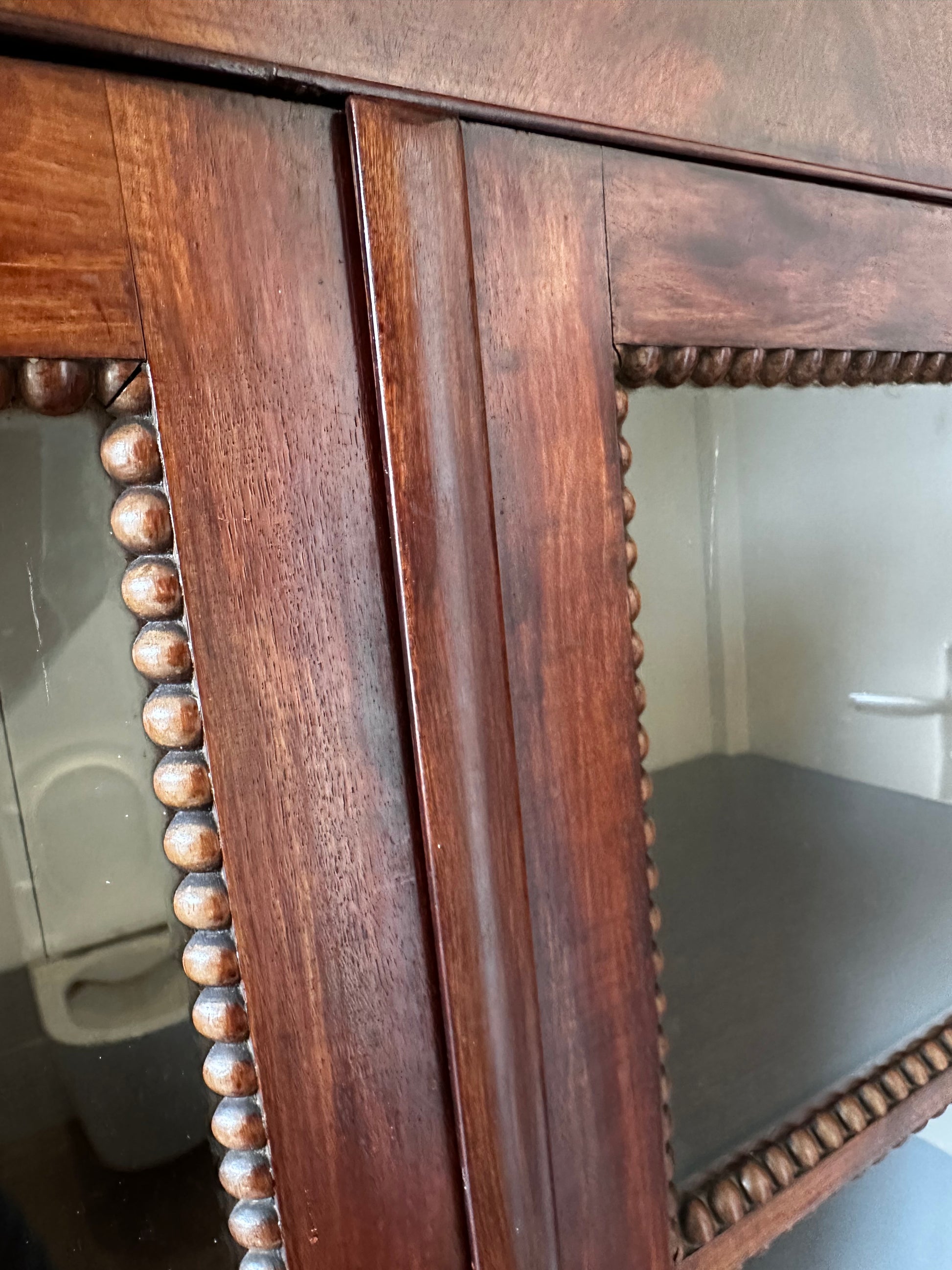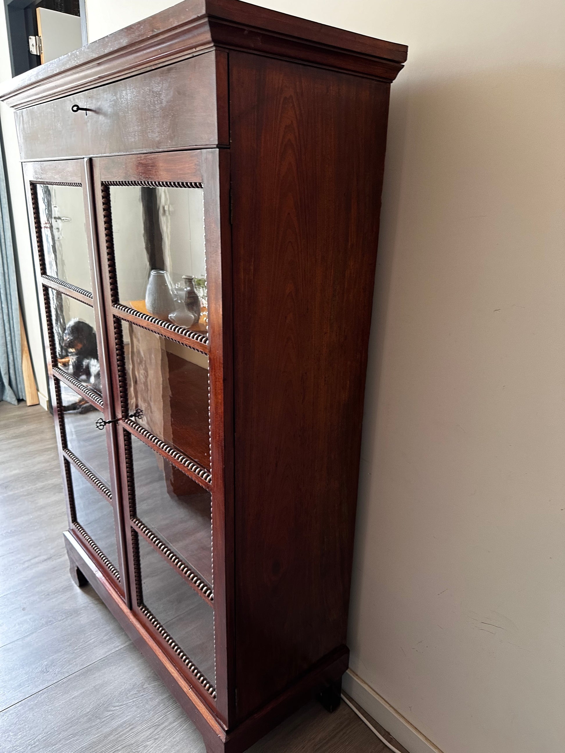 Een beauty van een kast. Deze vitrinekast is in een zeer mooie vintage staat. Heeft lichte gebruiksporen die passen bij de leeftijd en deze kast die prachte vintage staat geven. Voorzien van 8 raampjes, in de rand mooi afgewerkt met een hout bolletjes motief. Bovenin nog een lade. De kast is van mahoniehout.