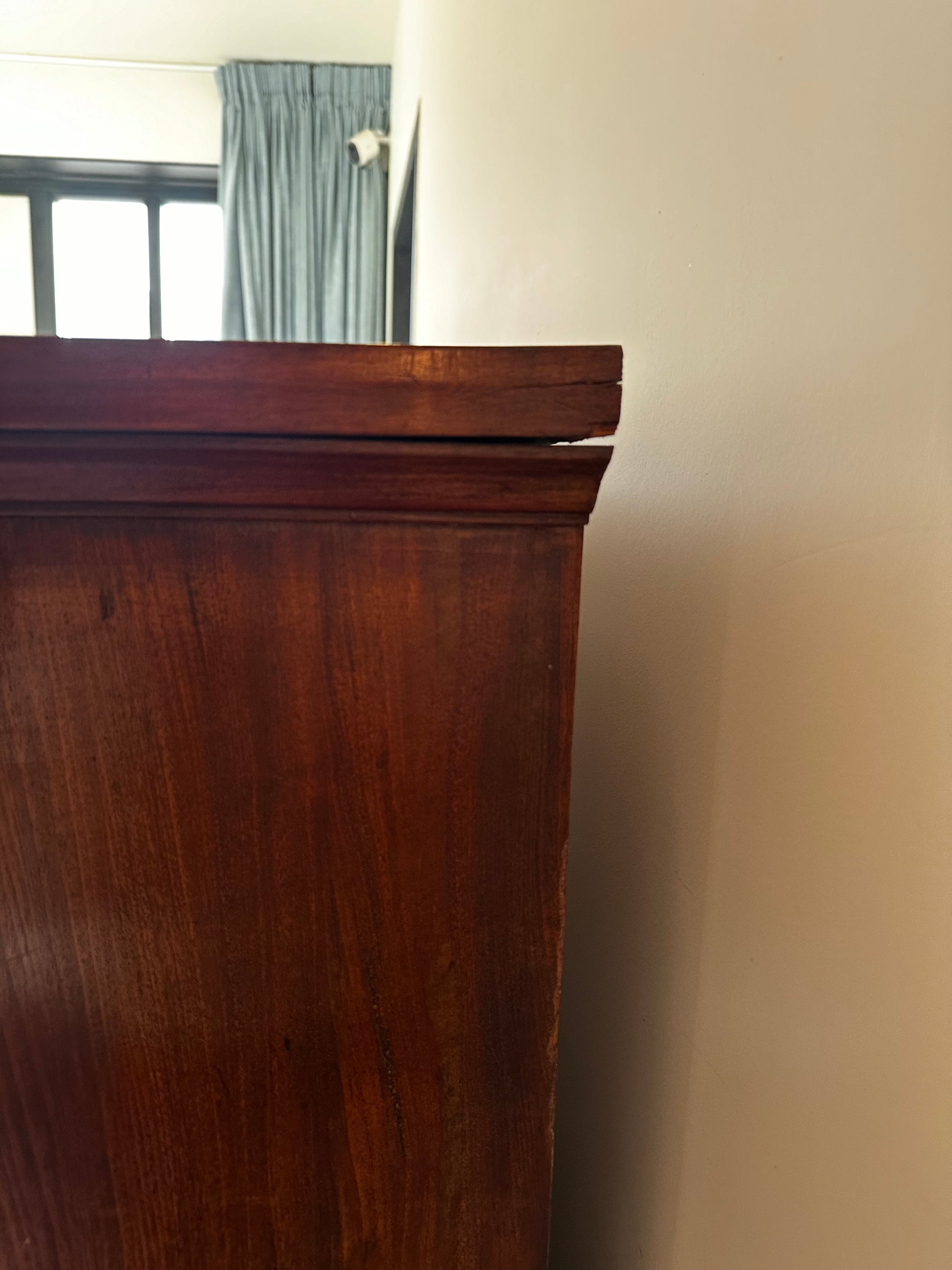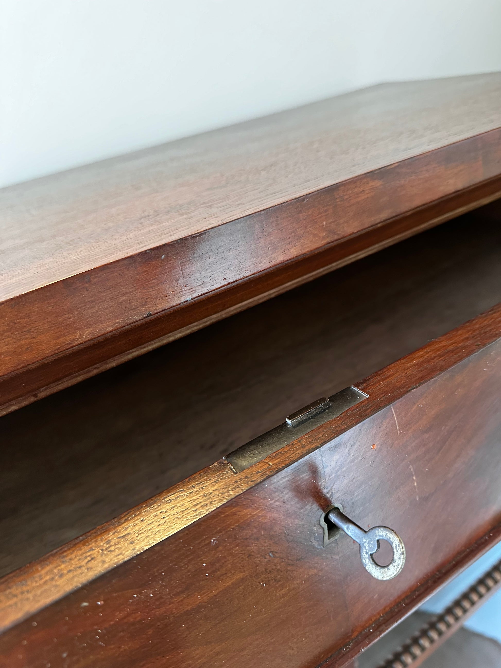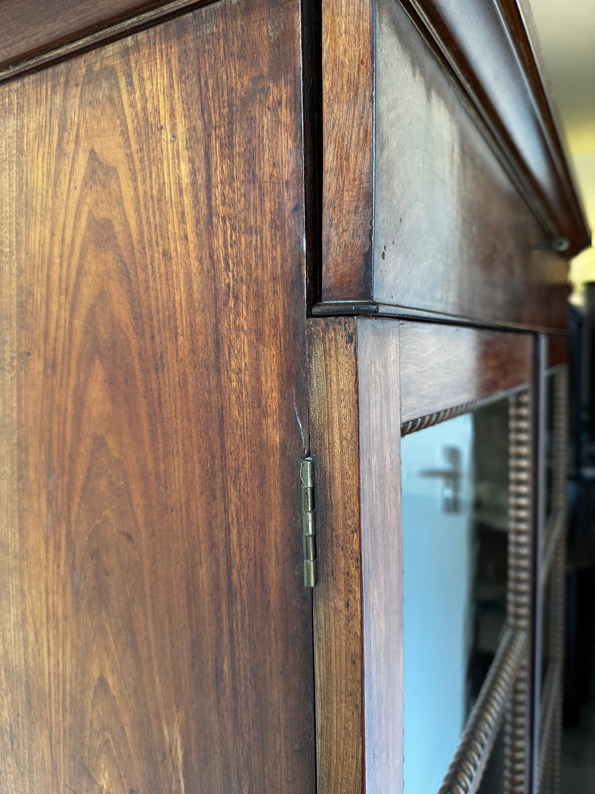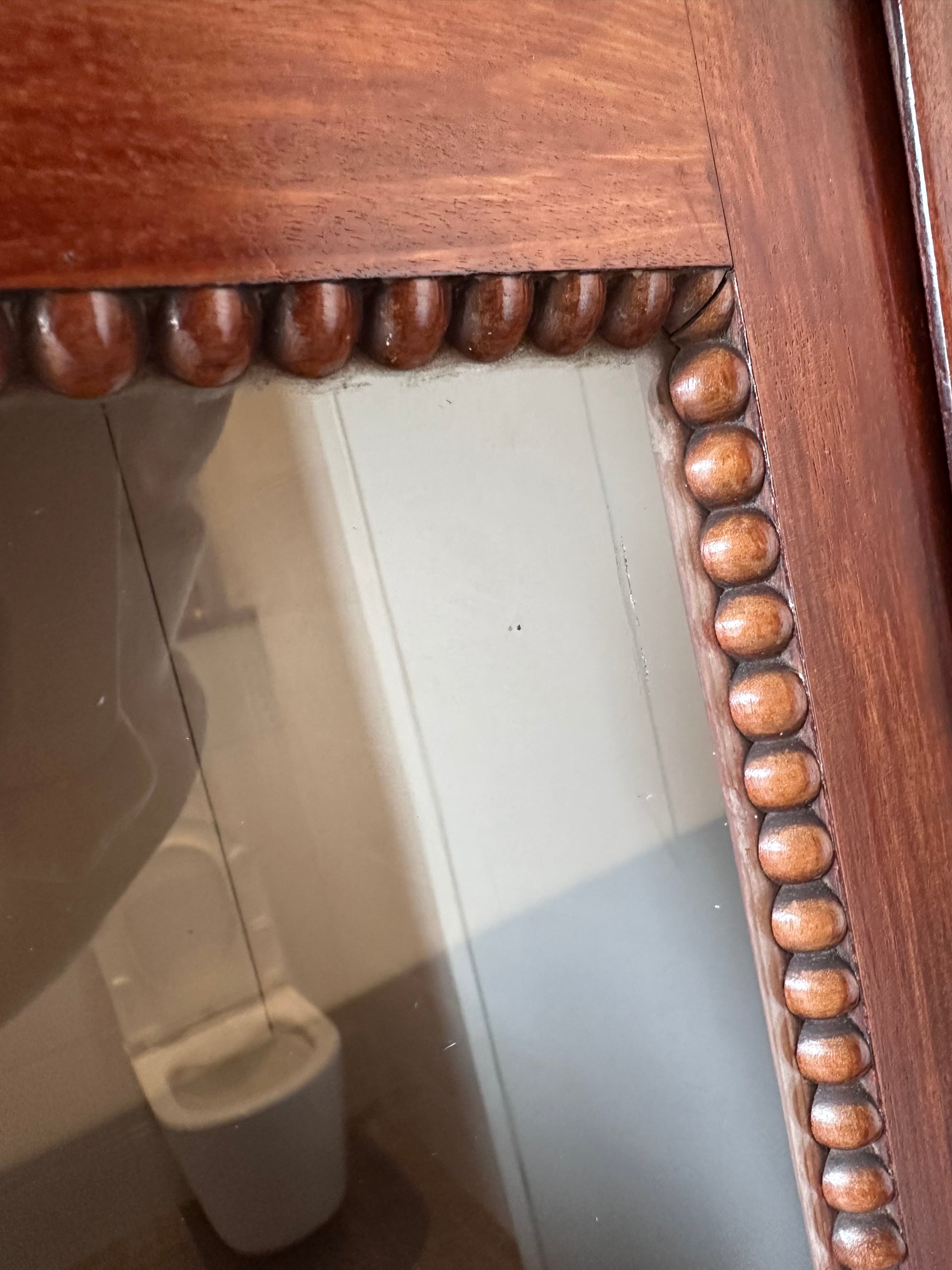 Een beauty van een kast. Deze vitrinekast is in een zeer mooie vintage staat. Heeft lichte gebruiksporen die passen bij de leeftijd en deze kast die prachte vintage staat geven. Voorzien van 8 raampjes, in de rand mooi afgewerkt met een hout bolletjes motief. Bovenin nog een lade. De kast is van mahoniehout.