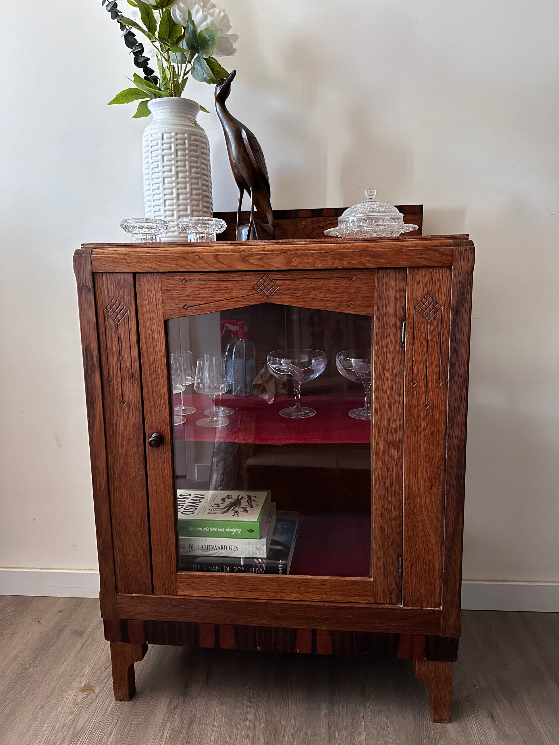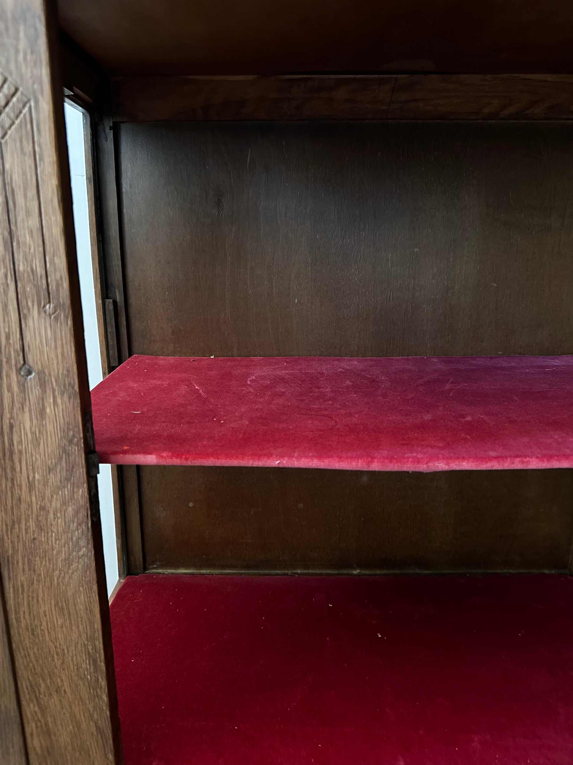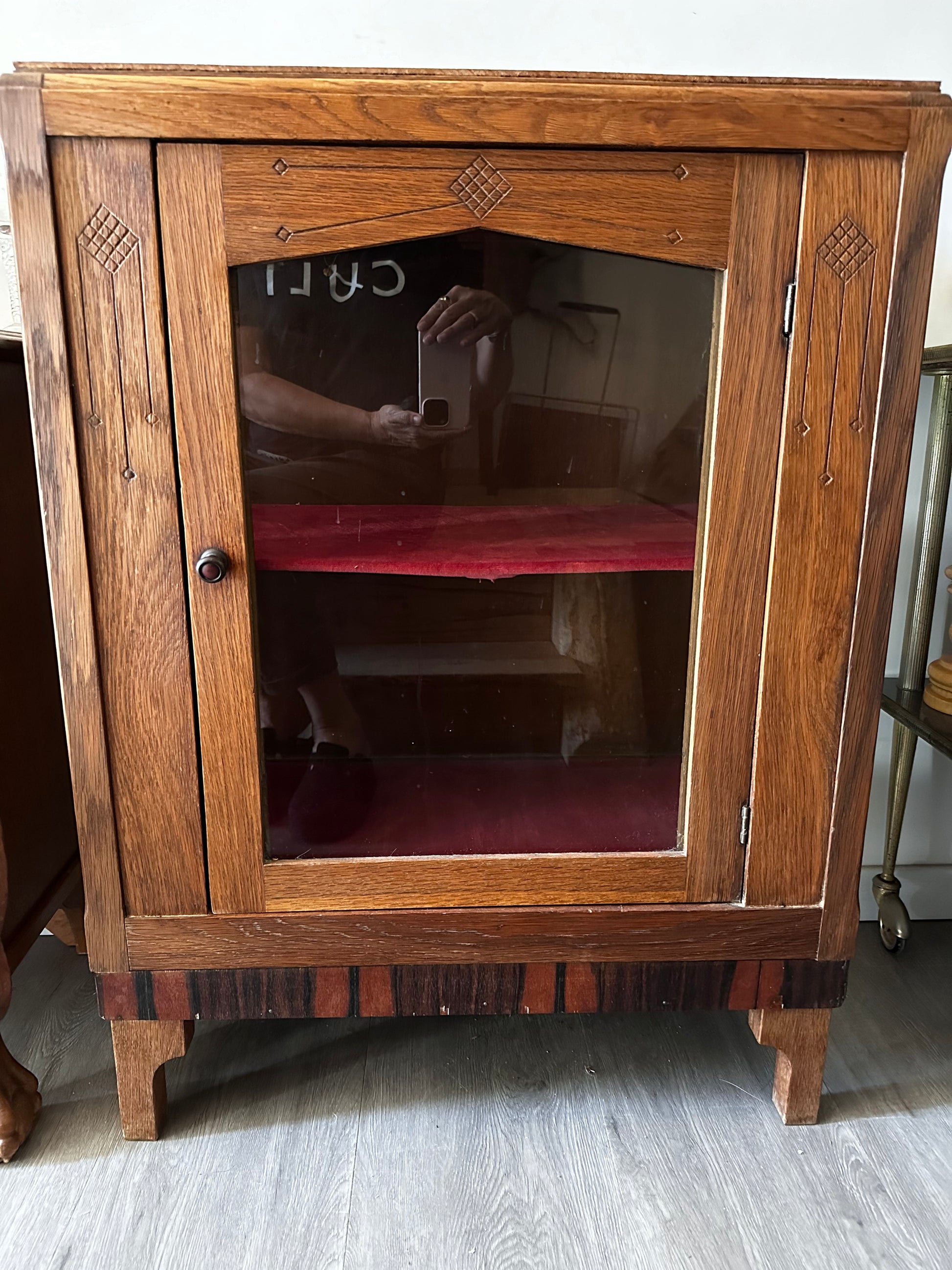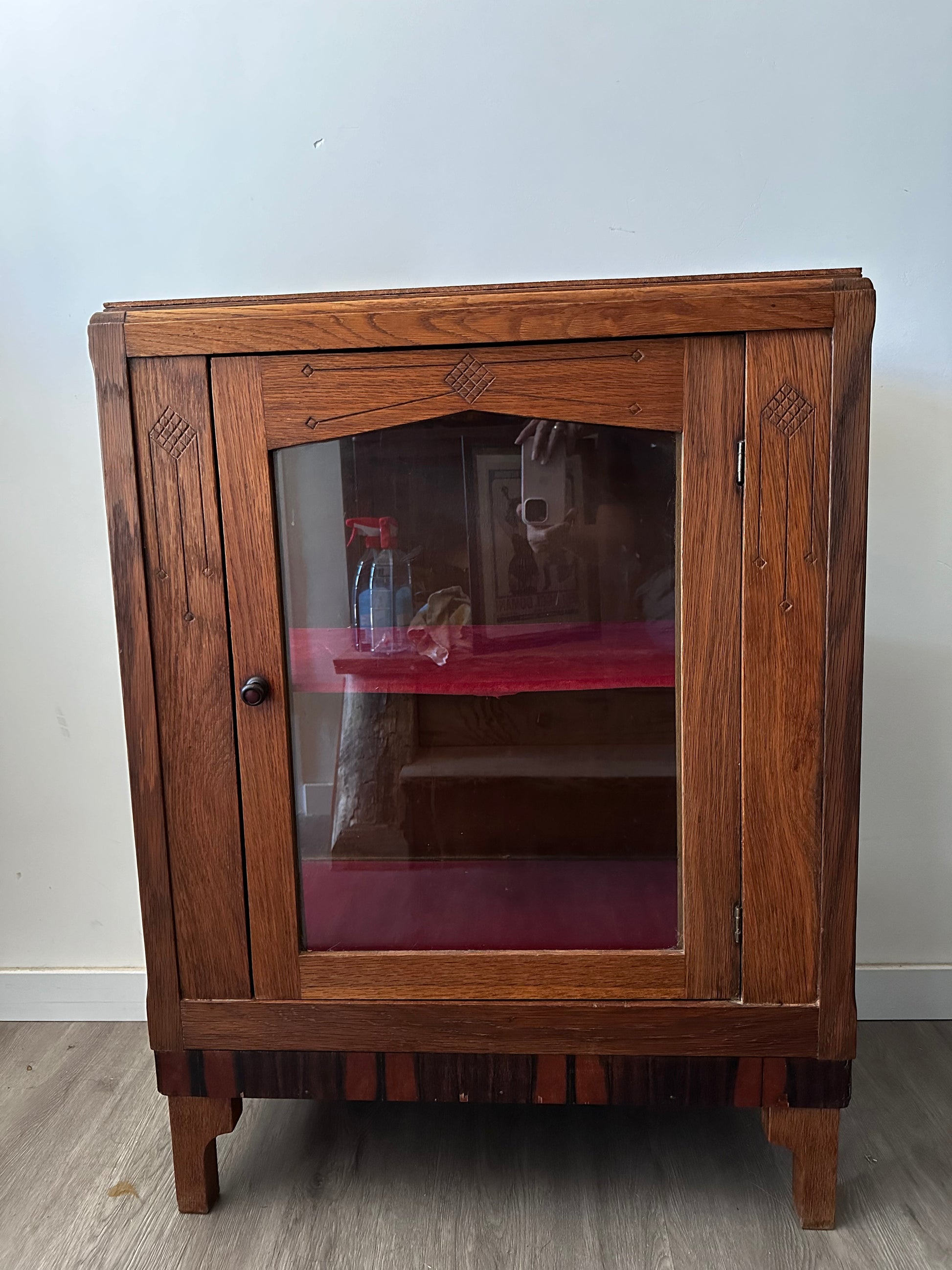 Dit geweldige vintage theekastje heeft een prachtige uitstraling met een houten frame en glazen deur en glazen zijpanelen. Kast is subtiel versierd met fraaie houtsnijwerken op de voorkant. De kast heeft twee planken die omkleed zijn met rode velvet stof. De kast is in een mooie vintage stijl met liefdevolle gebruikssporen die passen bij de leeftijd.