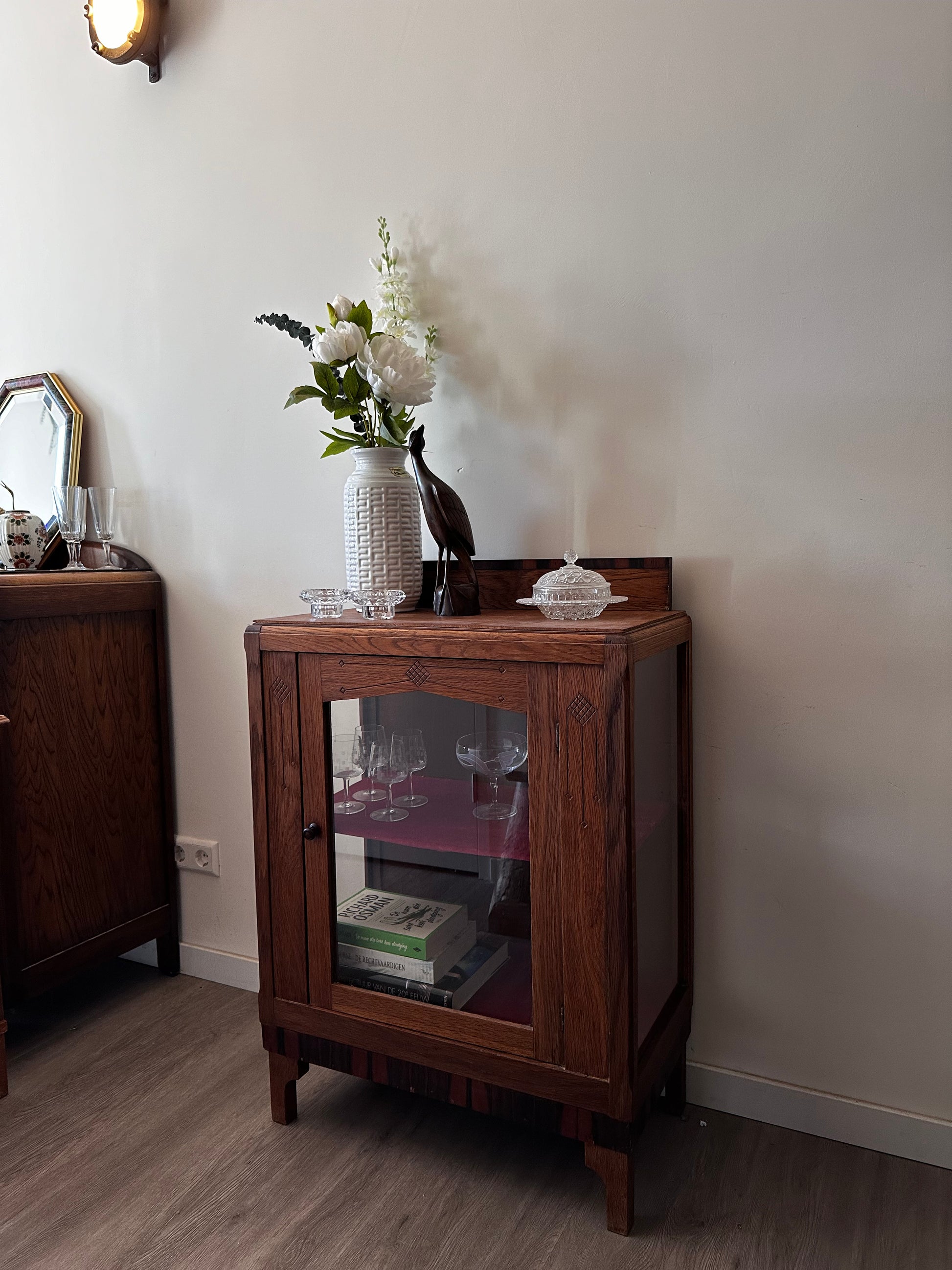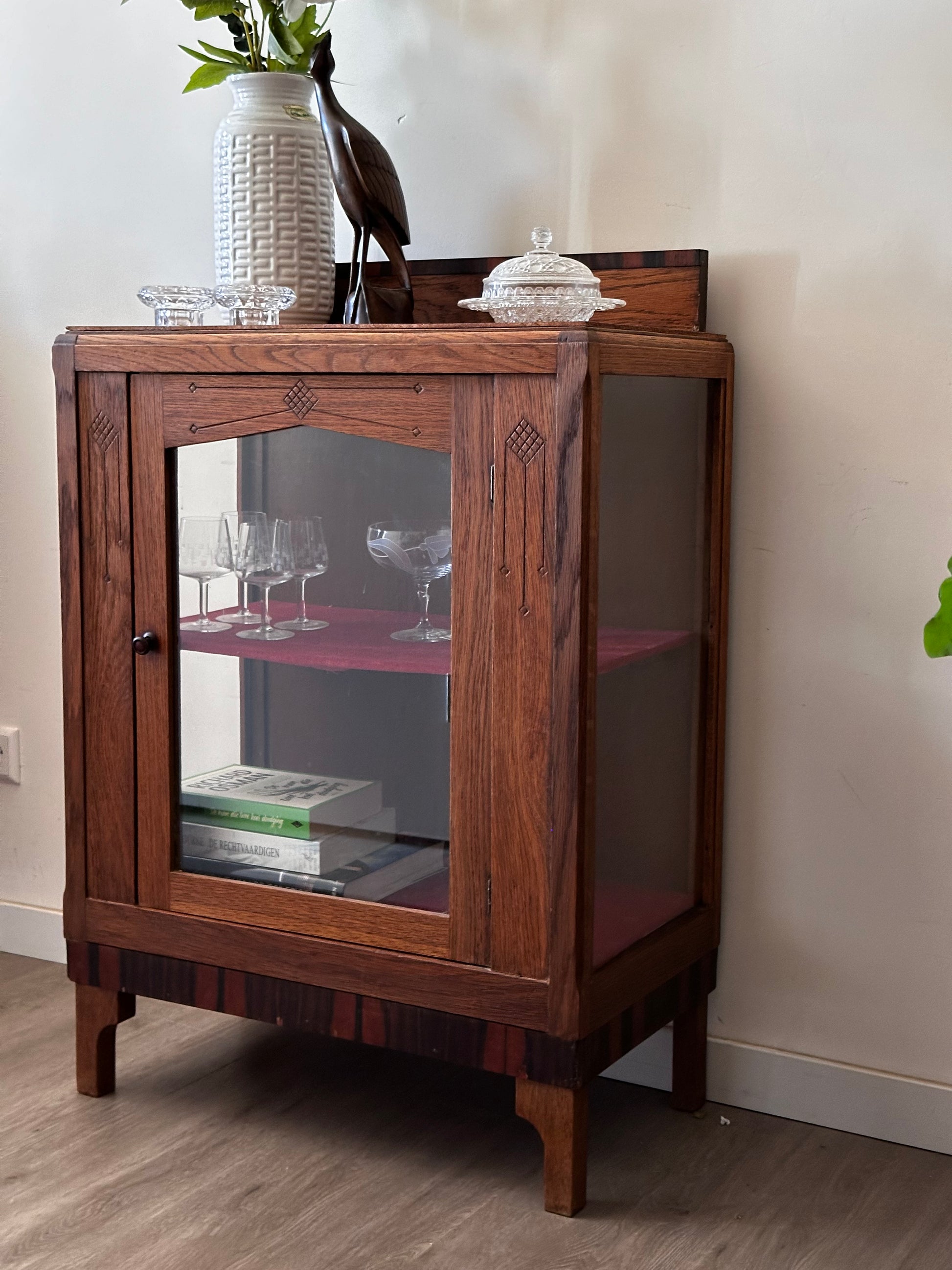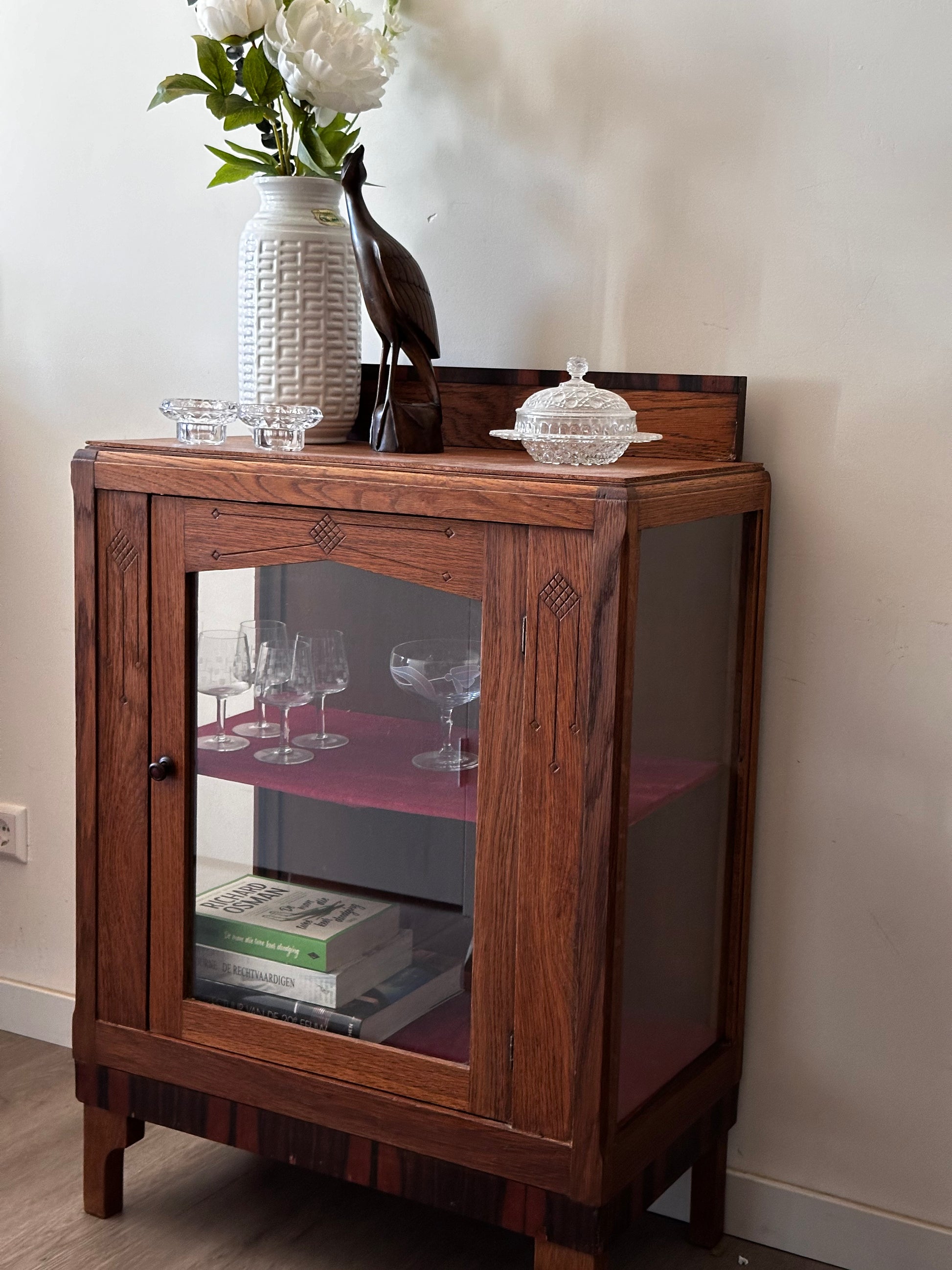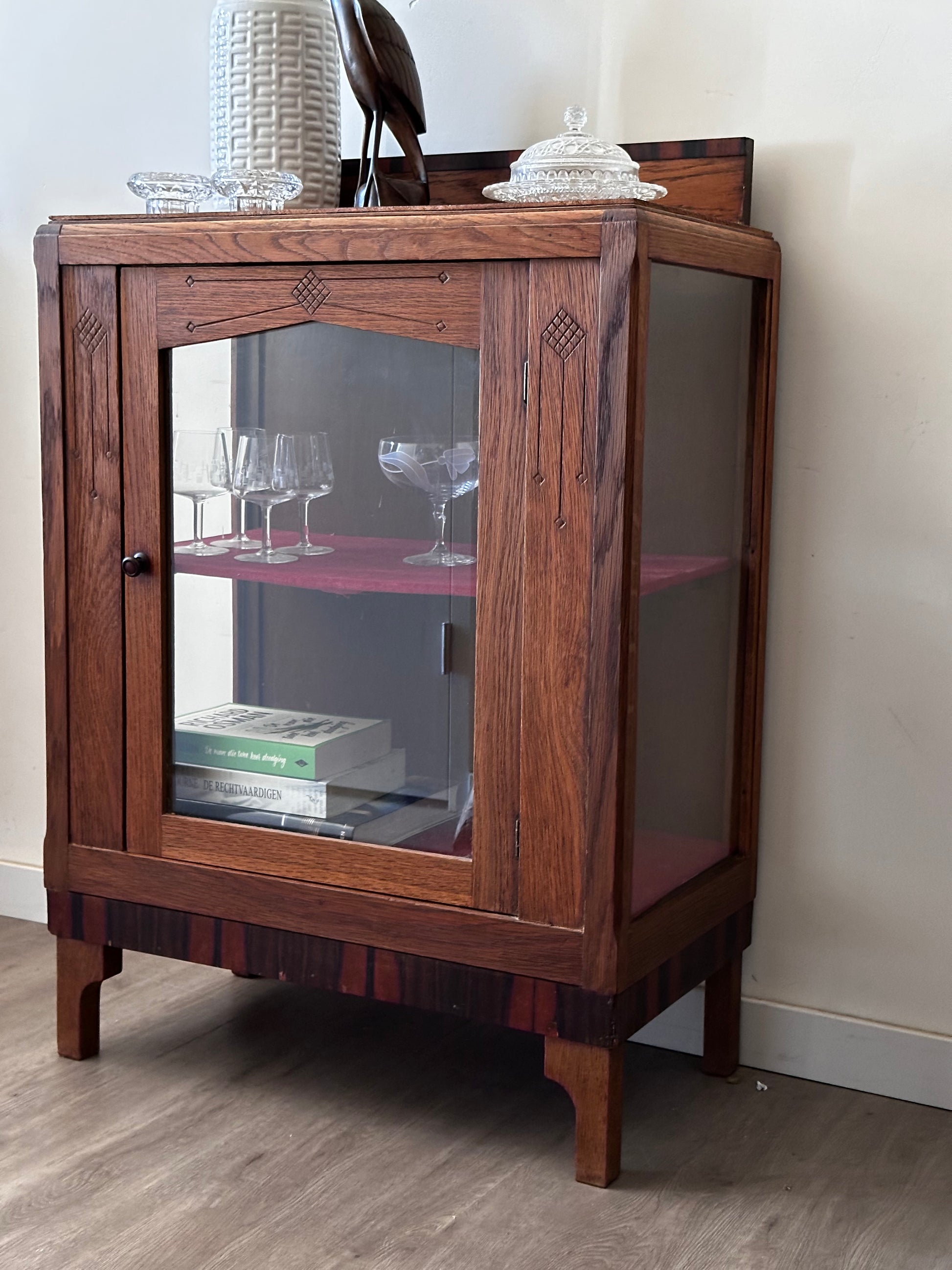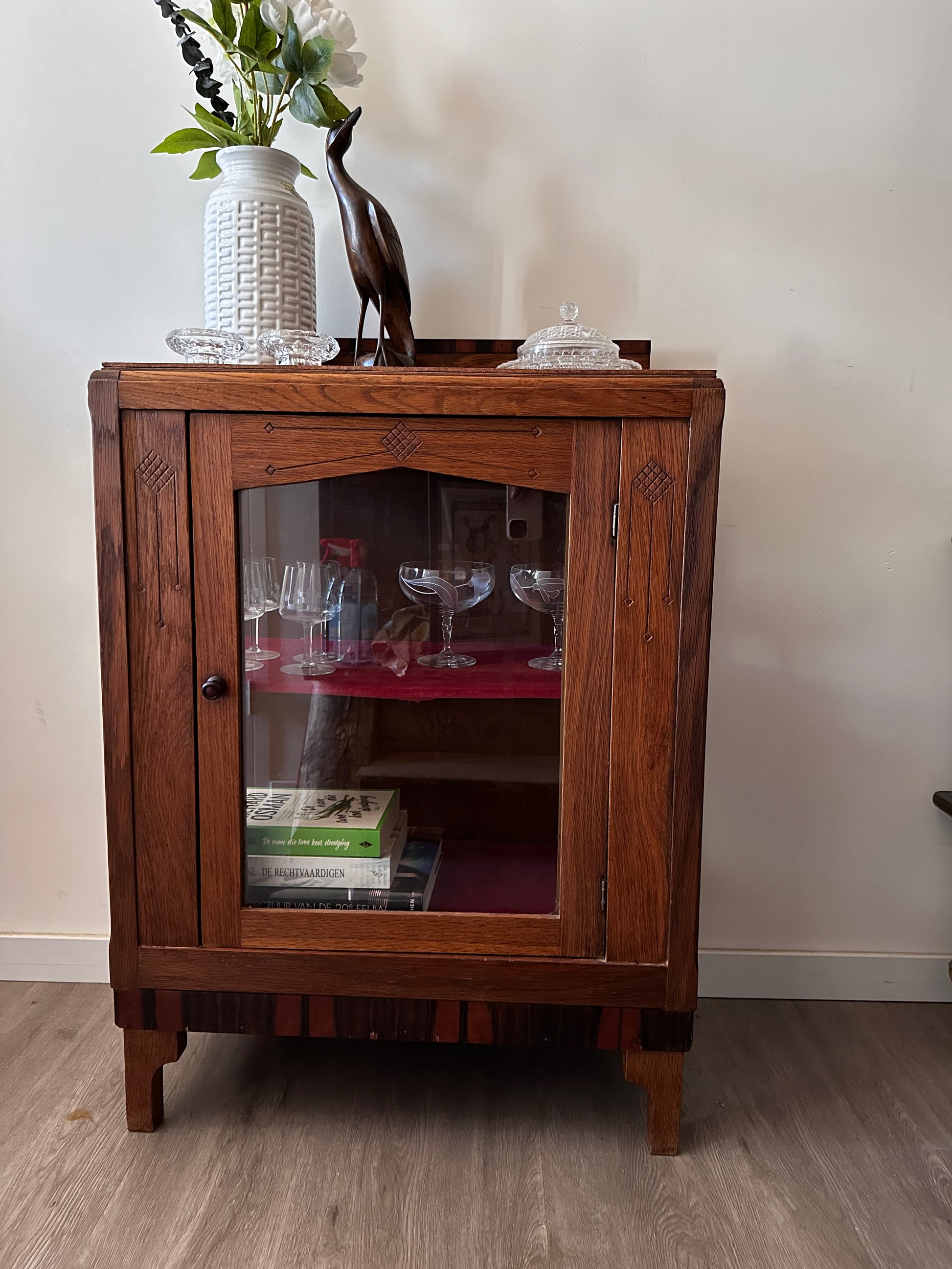 Dit geweldige vintage theekastje heeft een prachtige uitstraling met een houten frame en glazen deur en glazen zijpanelen. Kast is subtiel versierd met fraaie houtsnijwerken op de voorkant. De kast heeft twee planken die omkleed zijn met rode velvet stof. De kast is in een mooie vintage stijl met liefdevolle gebruikssporen die passen bij de leeftijd.