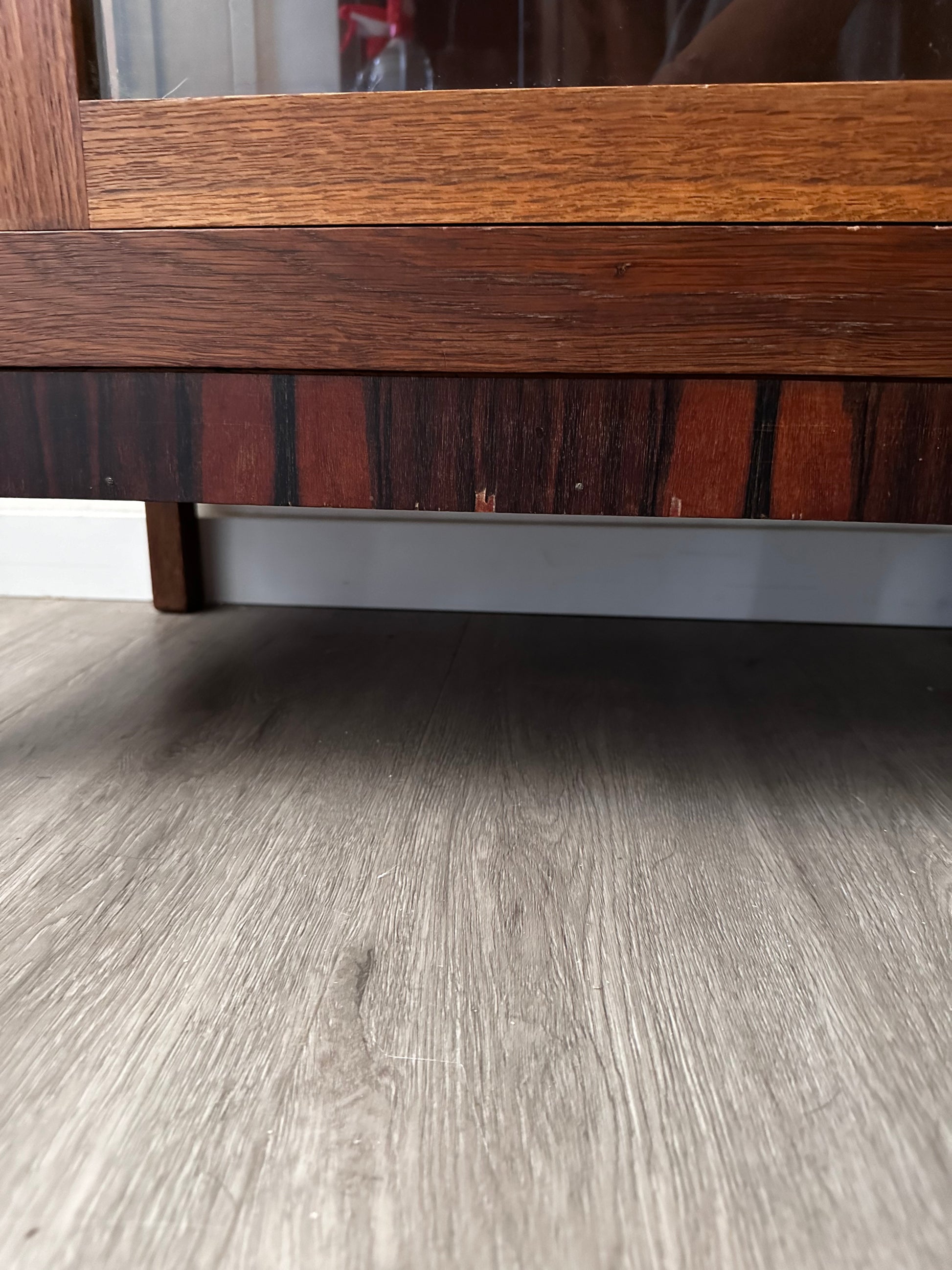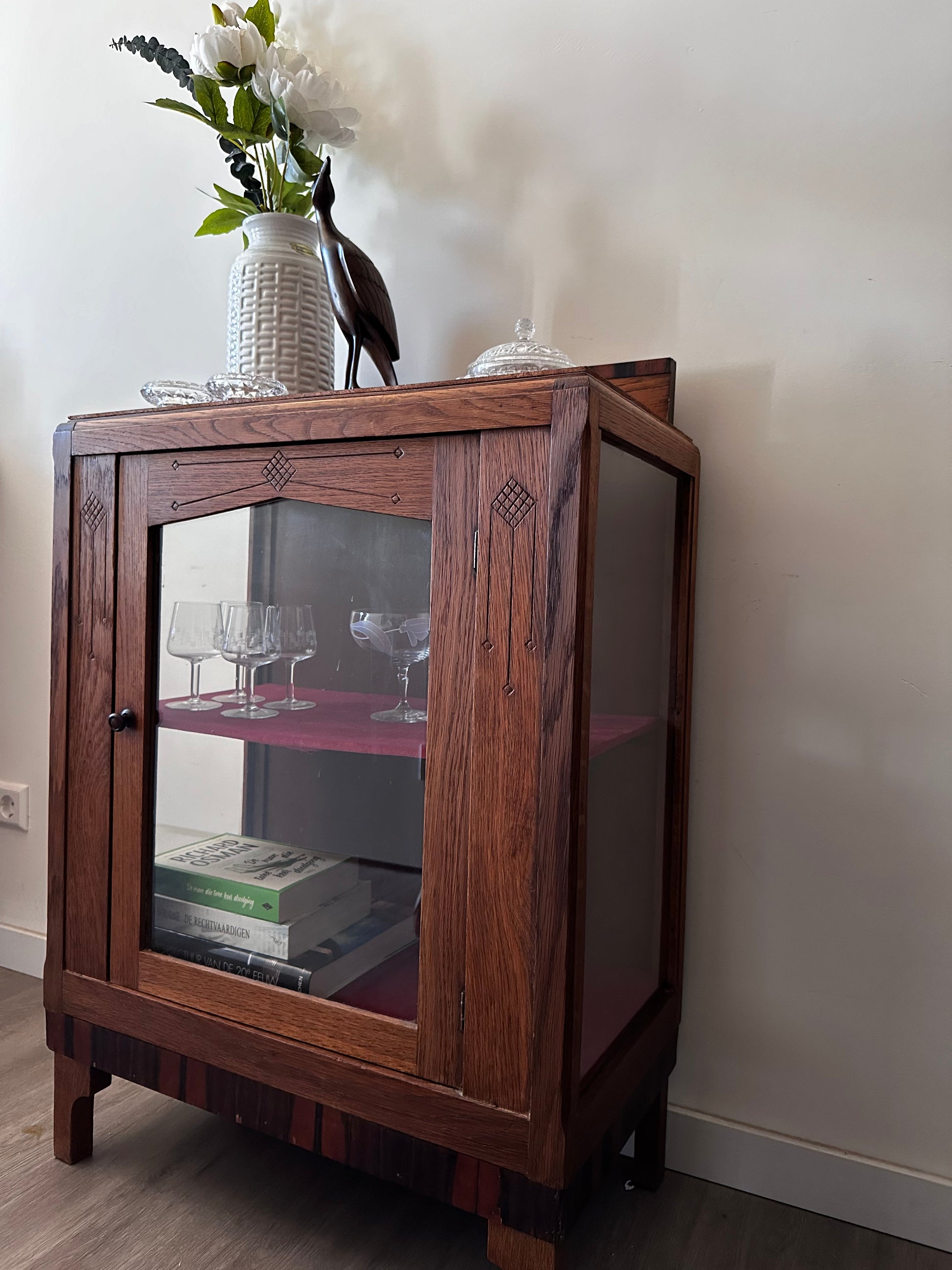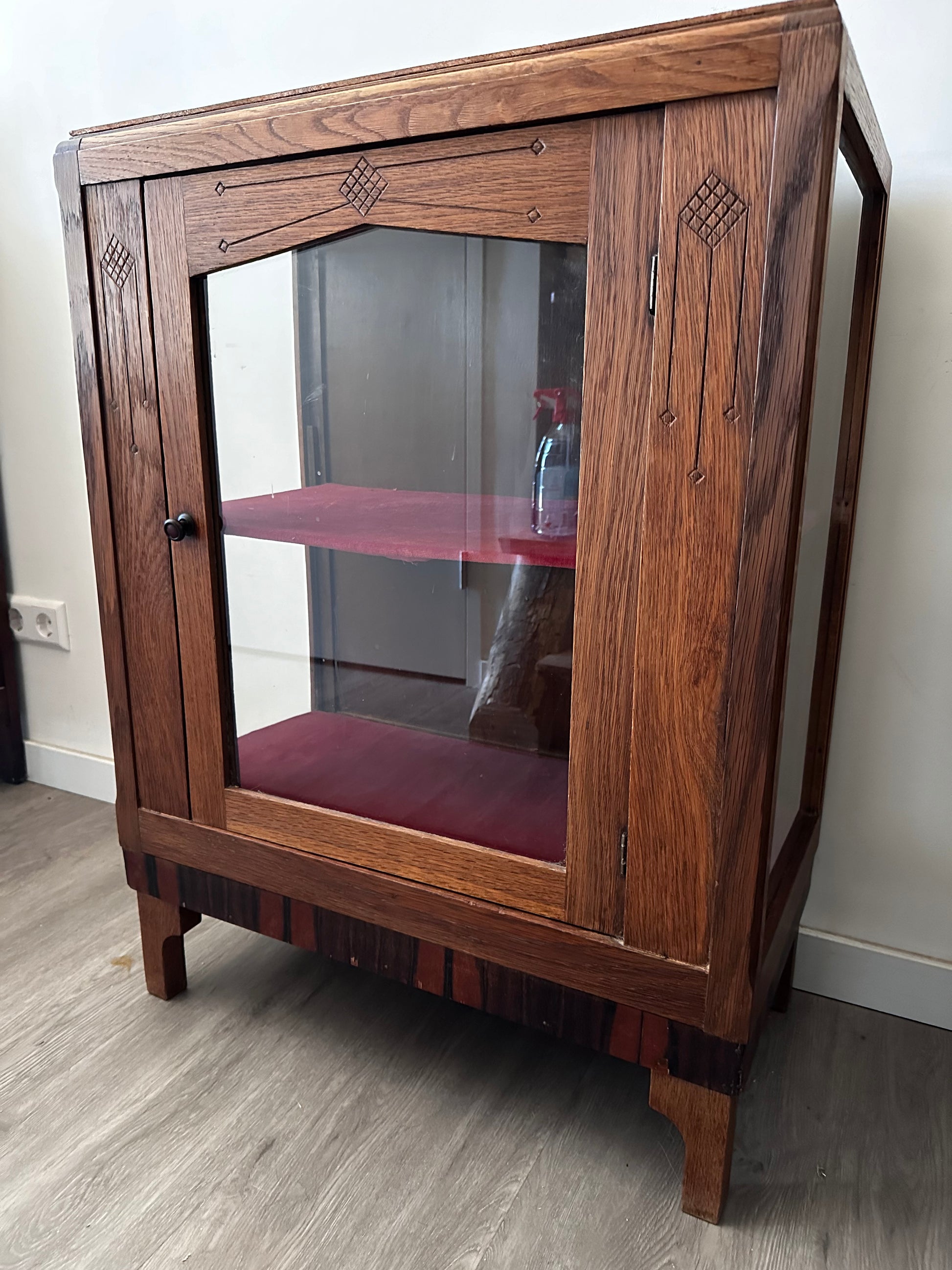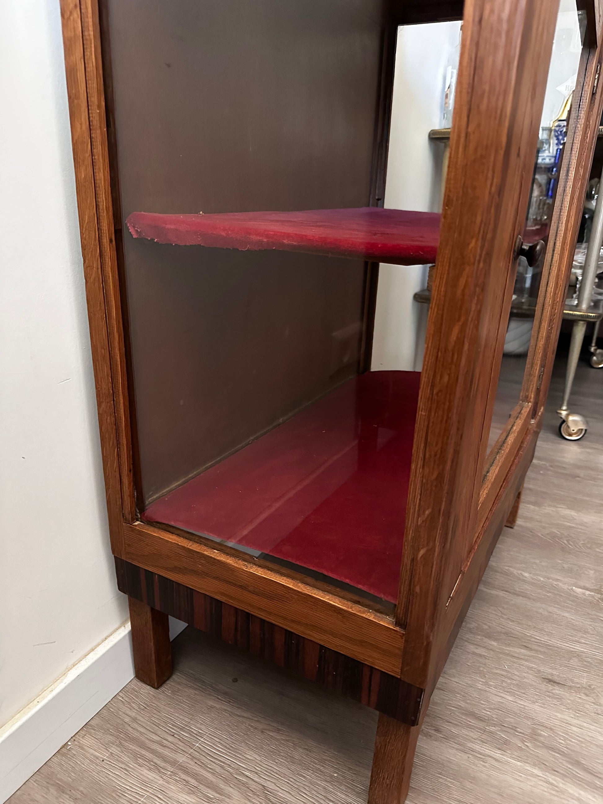 Dit geweldige vintage theekastje heeft een prachtige uitstraling met een houten frame en glazen deur en glazen zijpanelen. Kast is subtiel versierd met fraaie houtsnijwerken op de voorkant. De kast heeft twee planken die omkleed zijn met rode velvet stof. De kast is in een mooie vintage stijl met liefdevolle gebruikssporen die passen bij de leeftijd.