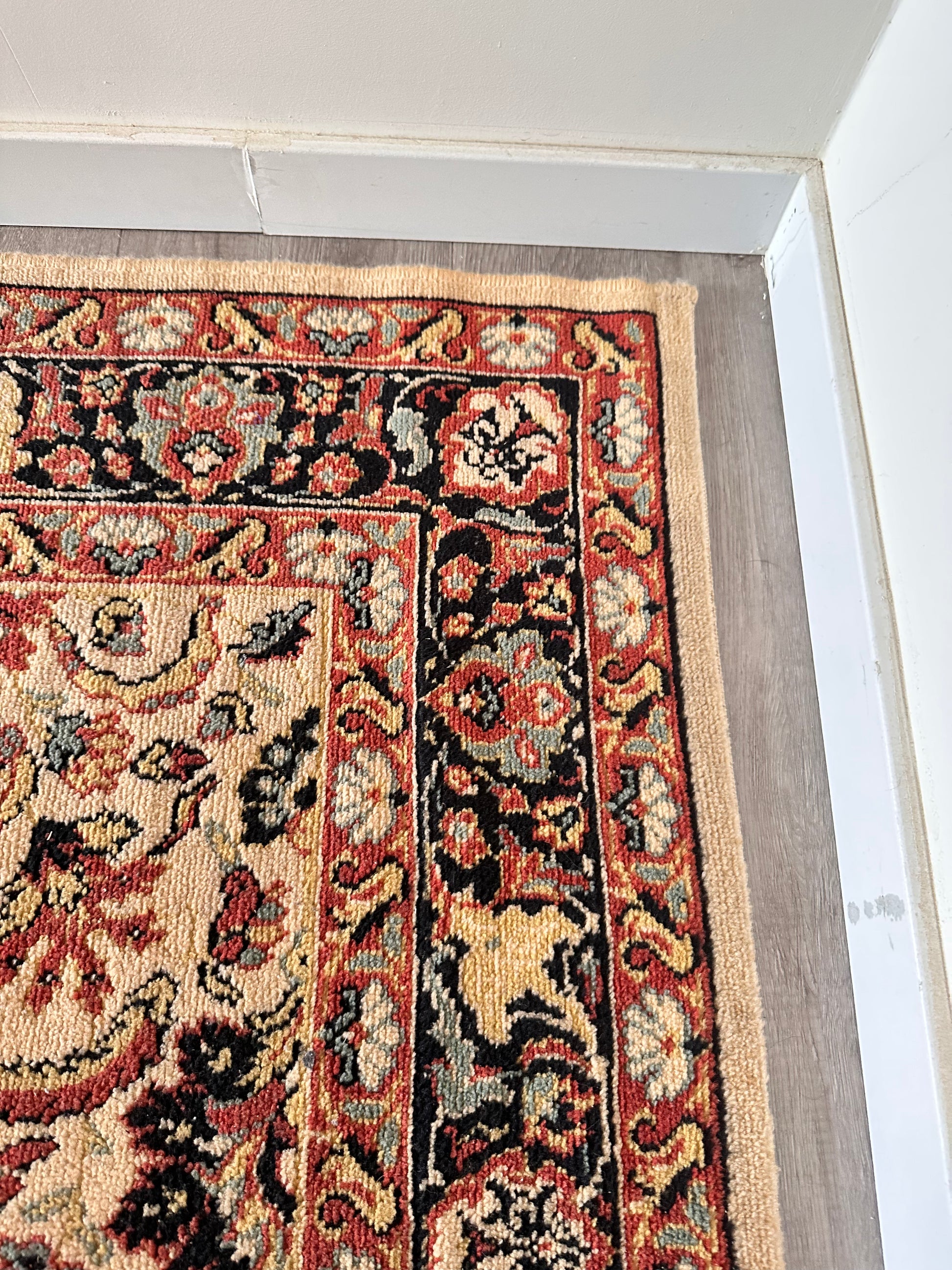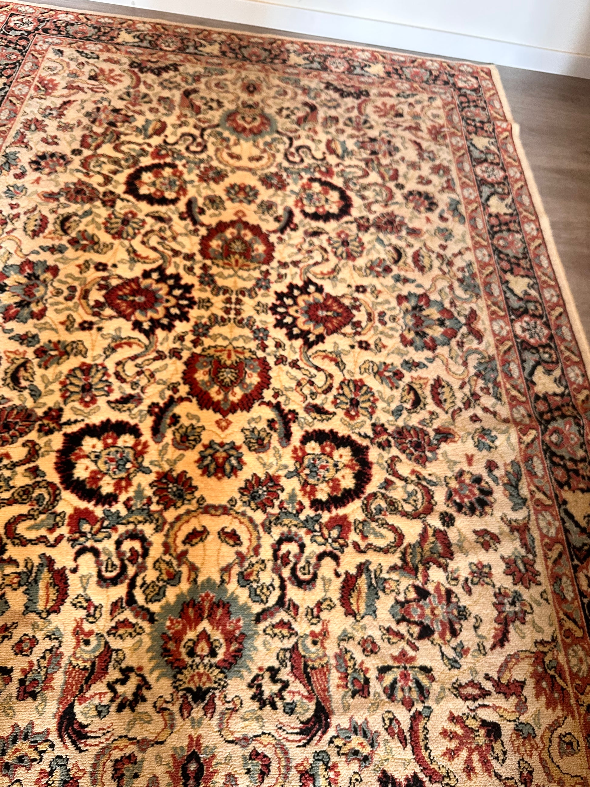 Een top vloerkleed. Deze is in een mooie vintage staat met prachtige kleuren. Soort lichtbruin beige met rood accenten. Royaal formaat