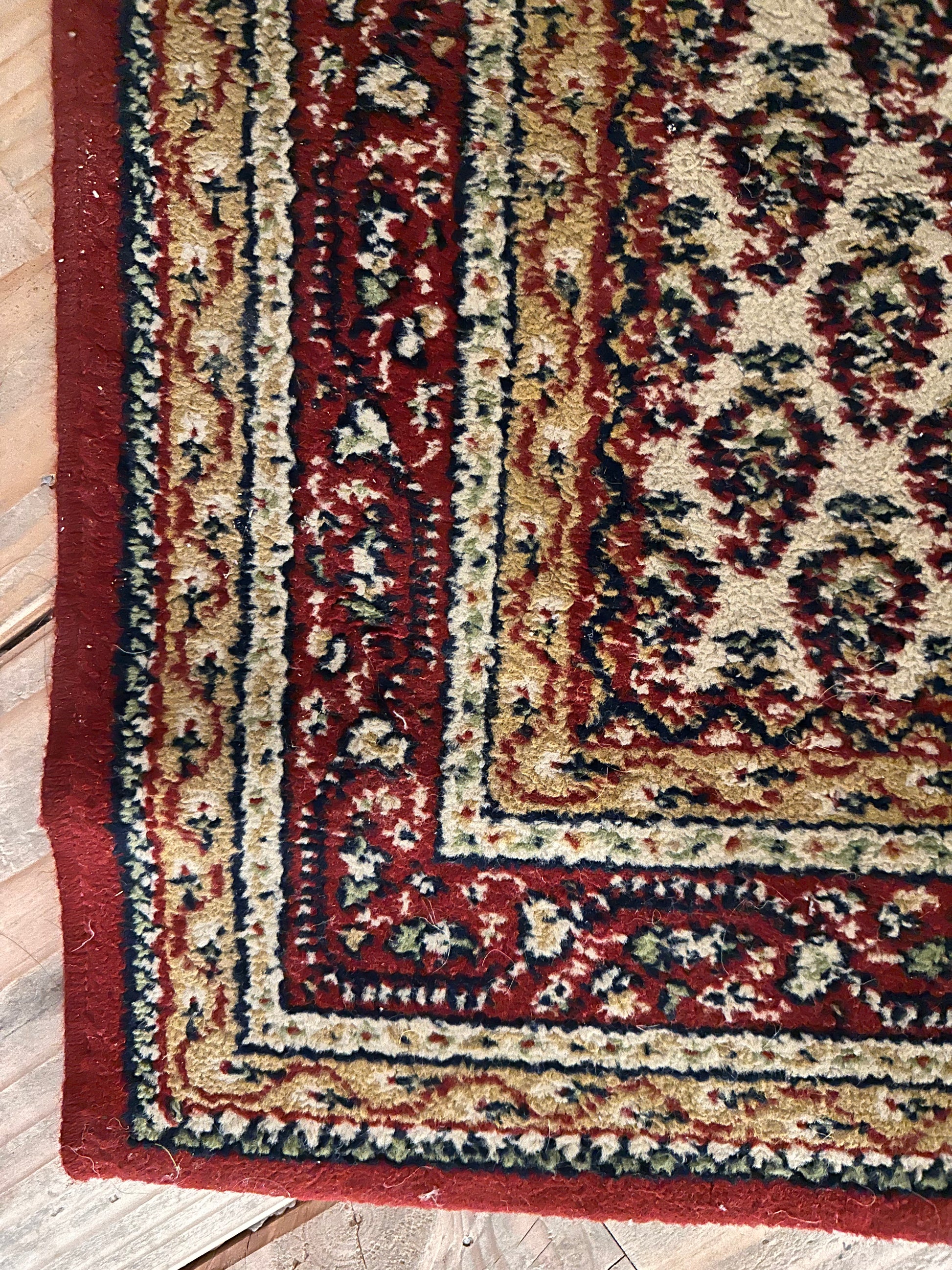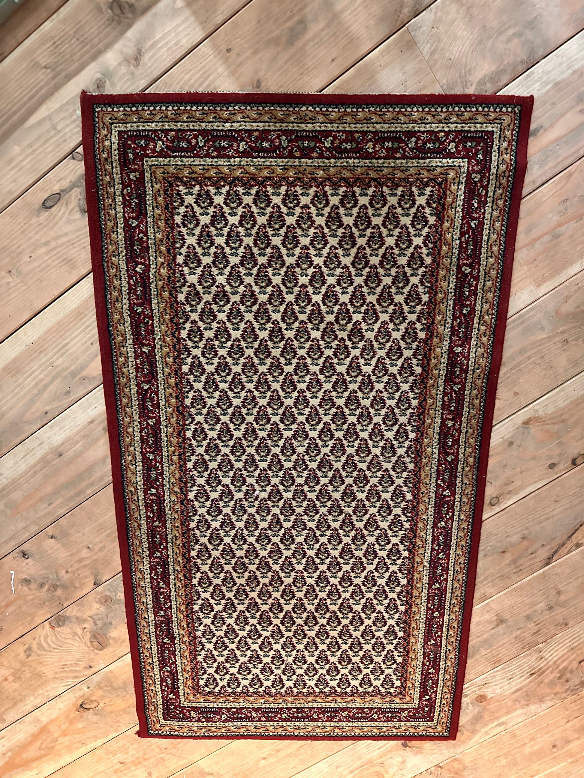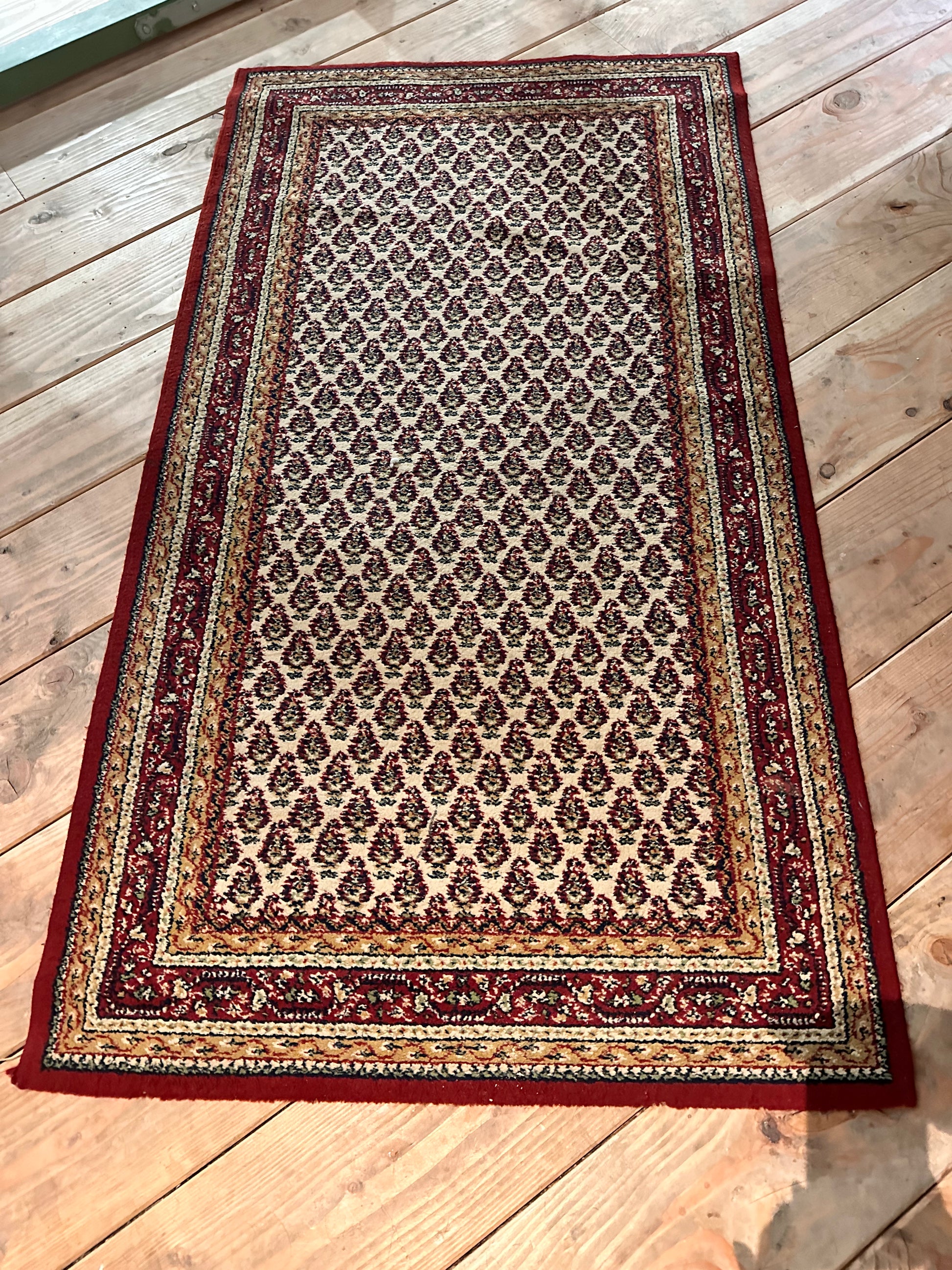Nog zo een leuk vloerkleed. Dit is een model dat 160 cm bij 80 cm is. Een meerkleurig motief, kenmerkend Perzisch patroon, met overwegend rood en beige. In een mooie vintage staat.