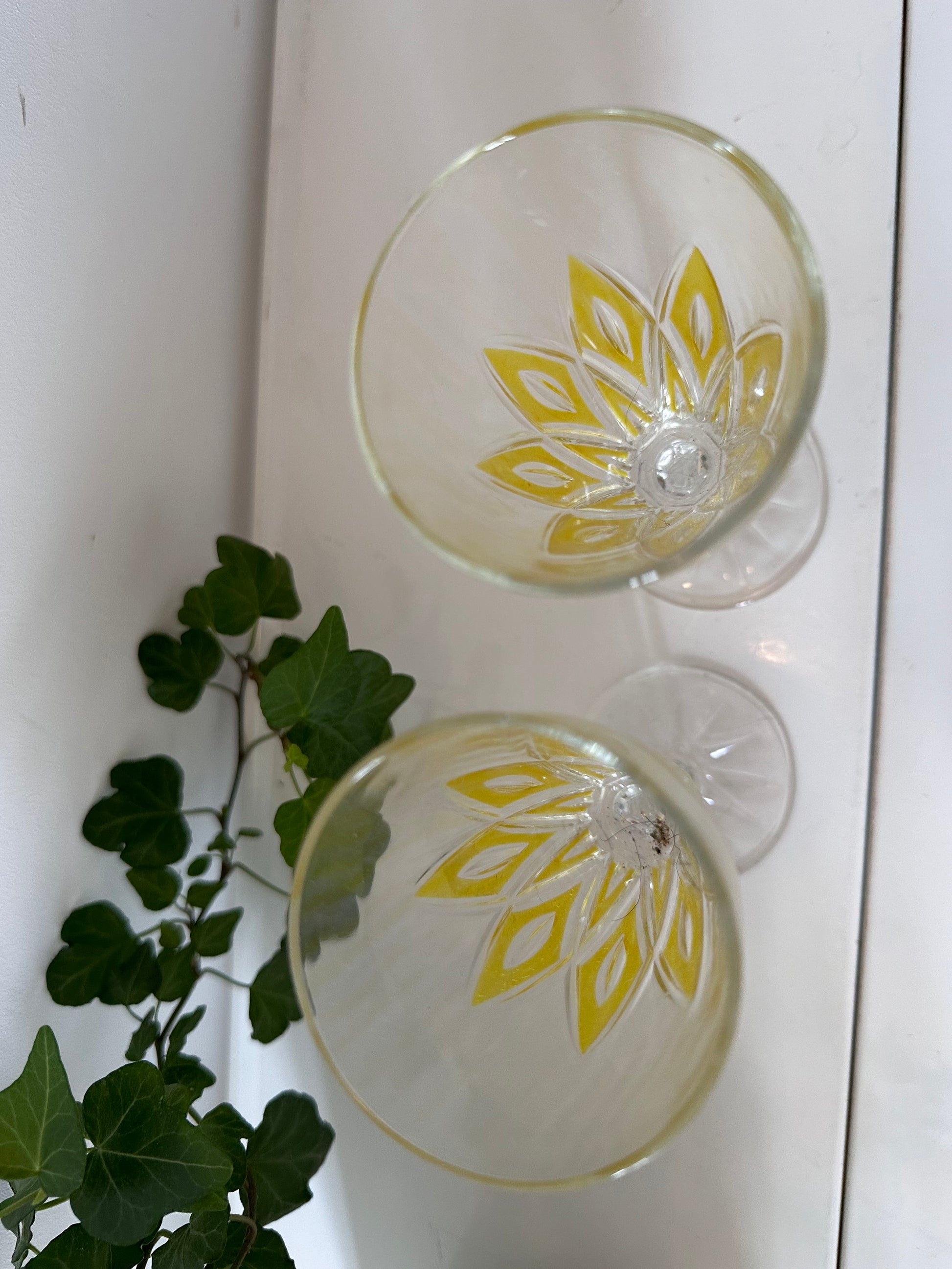 Twee prachtige kristallen champagne glazen van het merk VMC Reims France. Dit is het model harlequin. Beide glazen zijn in een super vintage staat. Hebben een transparante met gele kleur.