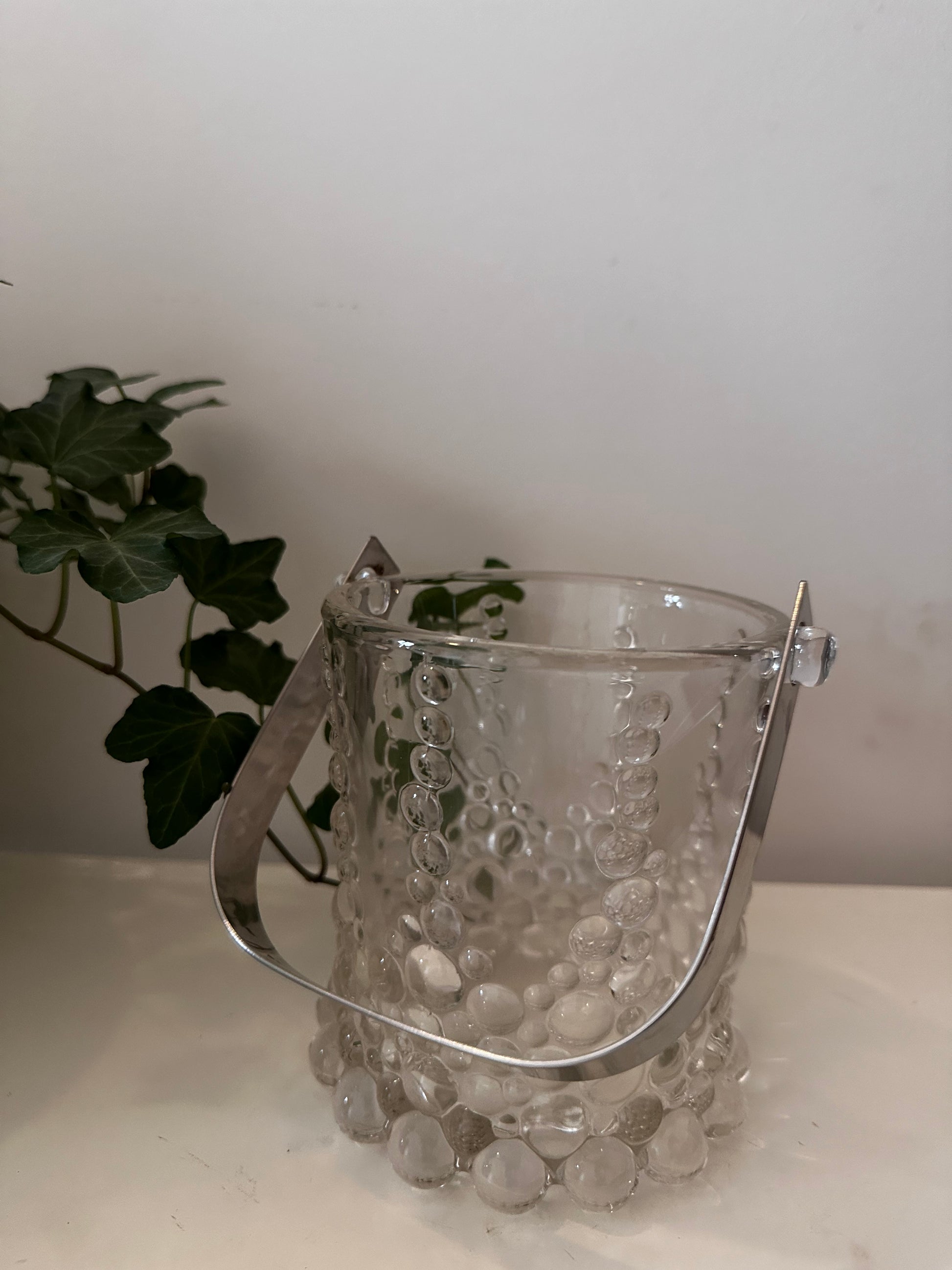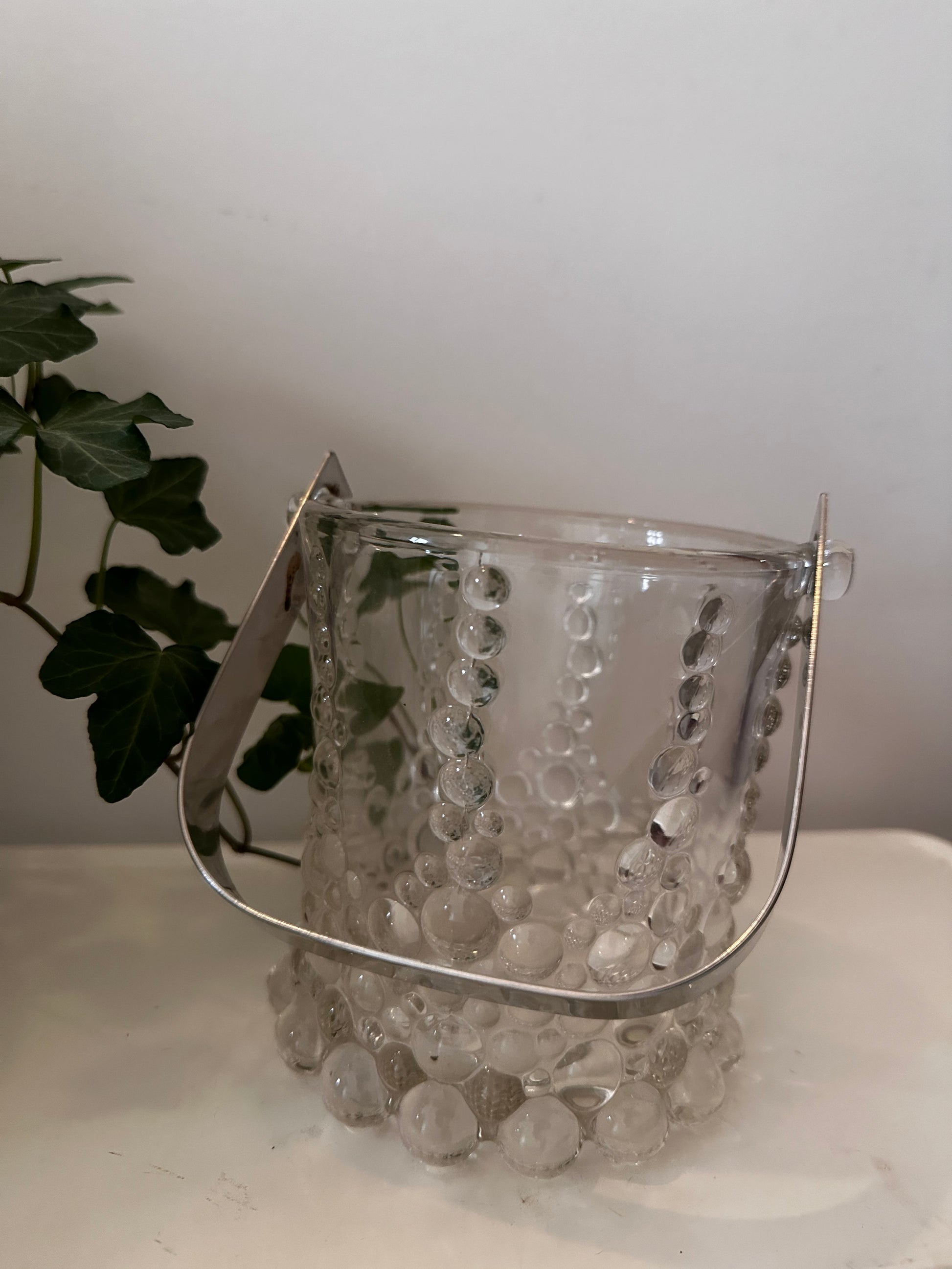 Een mooie Walther Glass kristallen IJsemmer. De IJsemmer is gemaakt door de Duitse glasfabriek Walther Glass. Dateert uit de jaren 70. De ijsemmer heeft een prachtig bobbel design en een zilverkleurig handvat. De ijsemmer maakt deel uit van de Bolero serie. In een mooie vintage staat