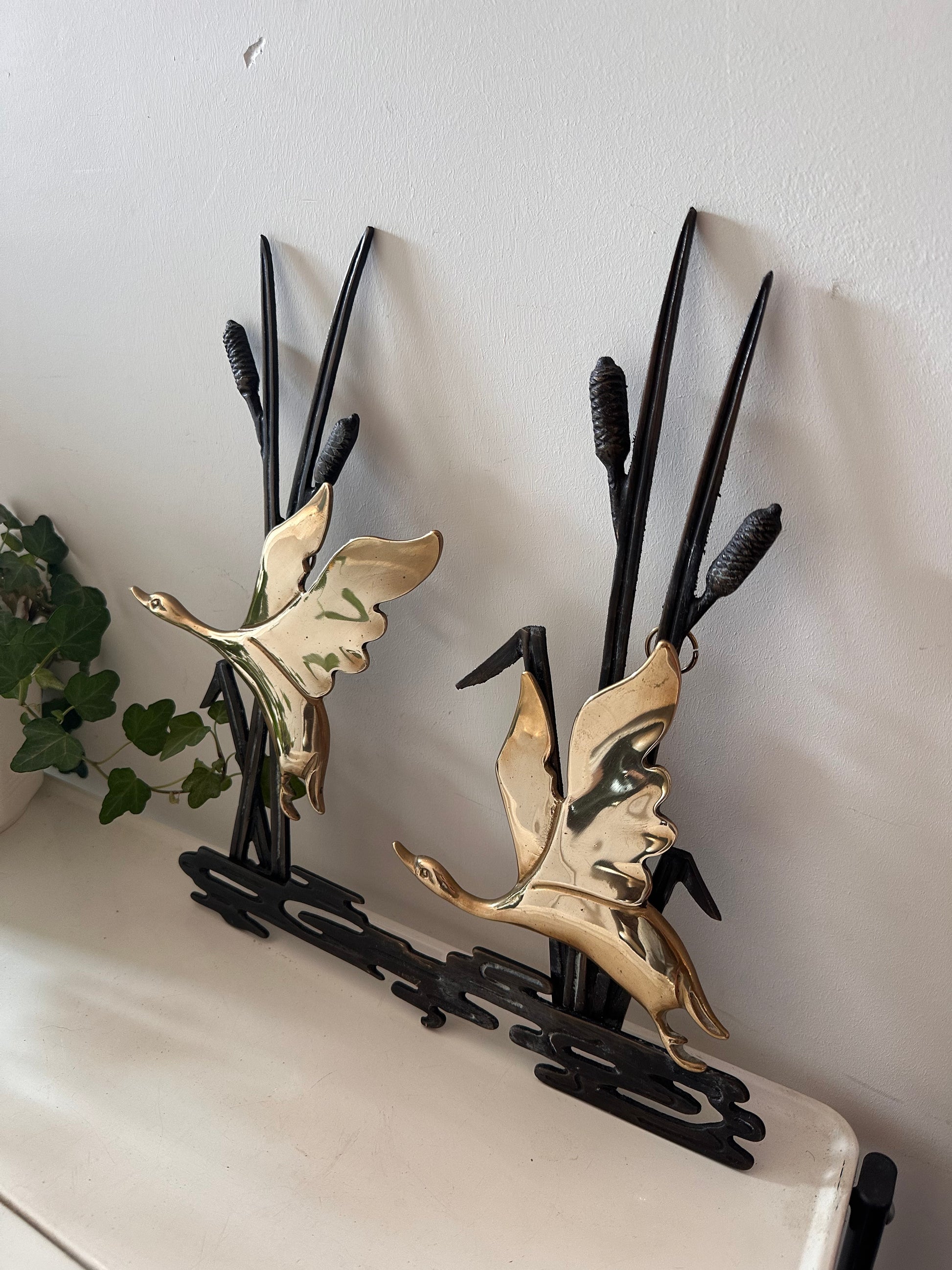 Hoe gaaf is deze? Twee sierlijke messing zwanen in volle vlucht, omringd door rietstengels van zwart metaal — echt helemaal jaren 70. Mooi gelaagd wandobject met een toffe afwisseling van glans en mat, ideaal als eyecatcher aan de muur. In nette vintage staat met lichte gebruikssporen. Q230