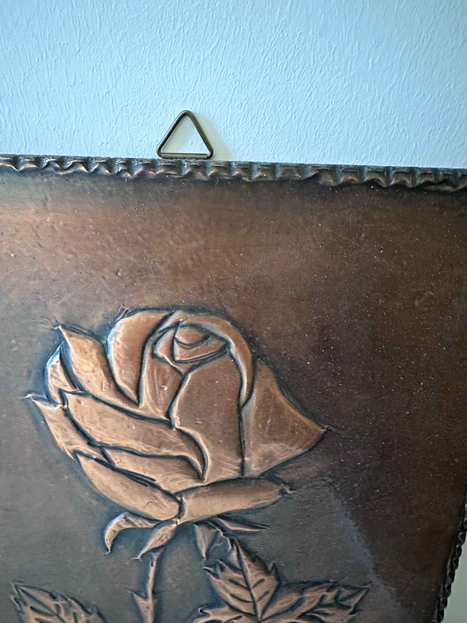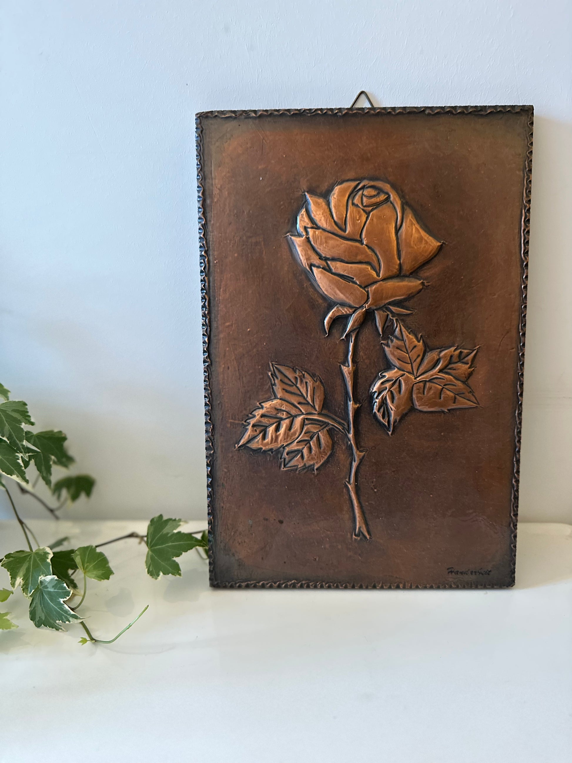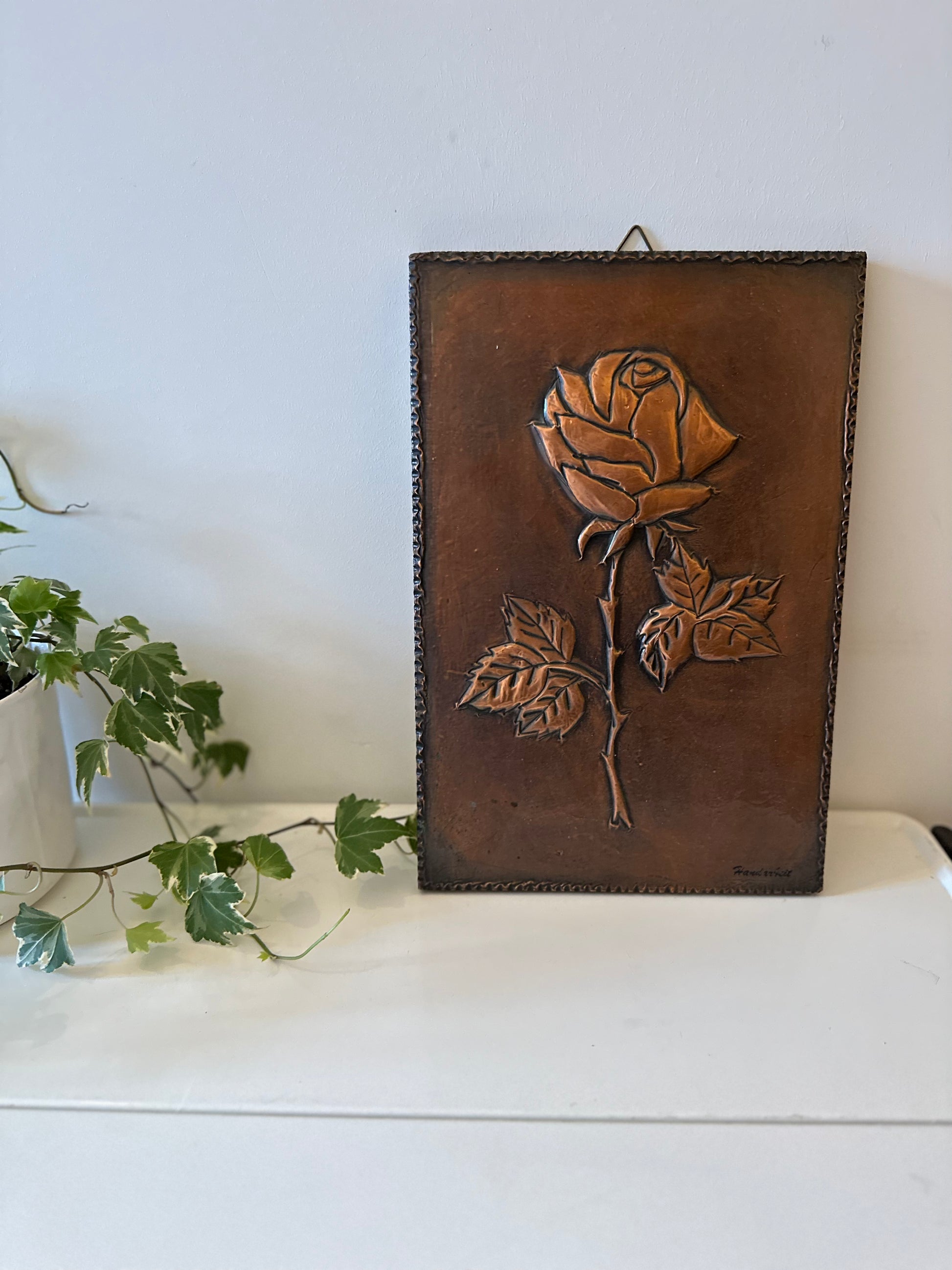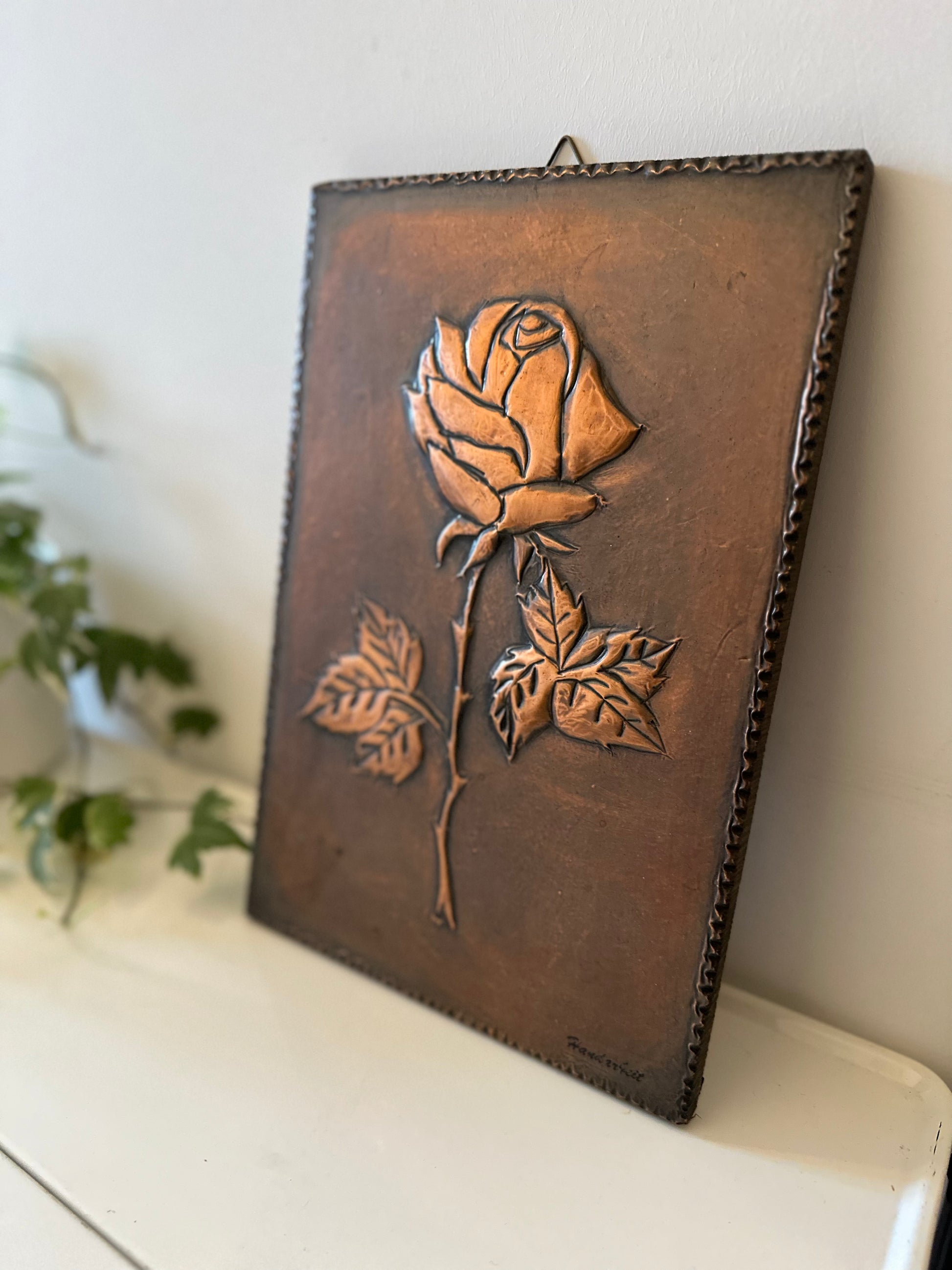 Echt een gave wanddecoratie, van koper om hout geslagen. Afbeelding van een roos. Afkomstig uit Duitsland rond de jaren 70. In een geweldige vintage staat.