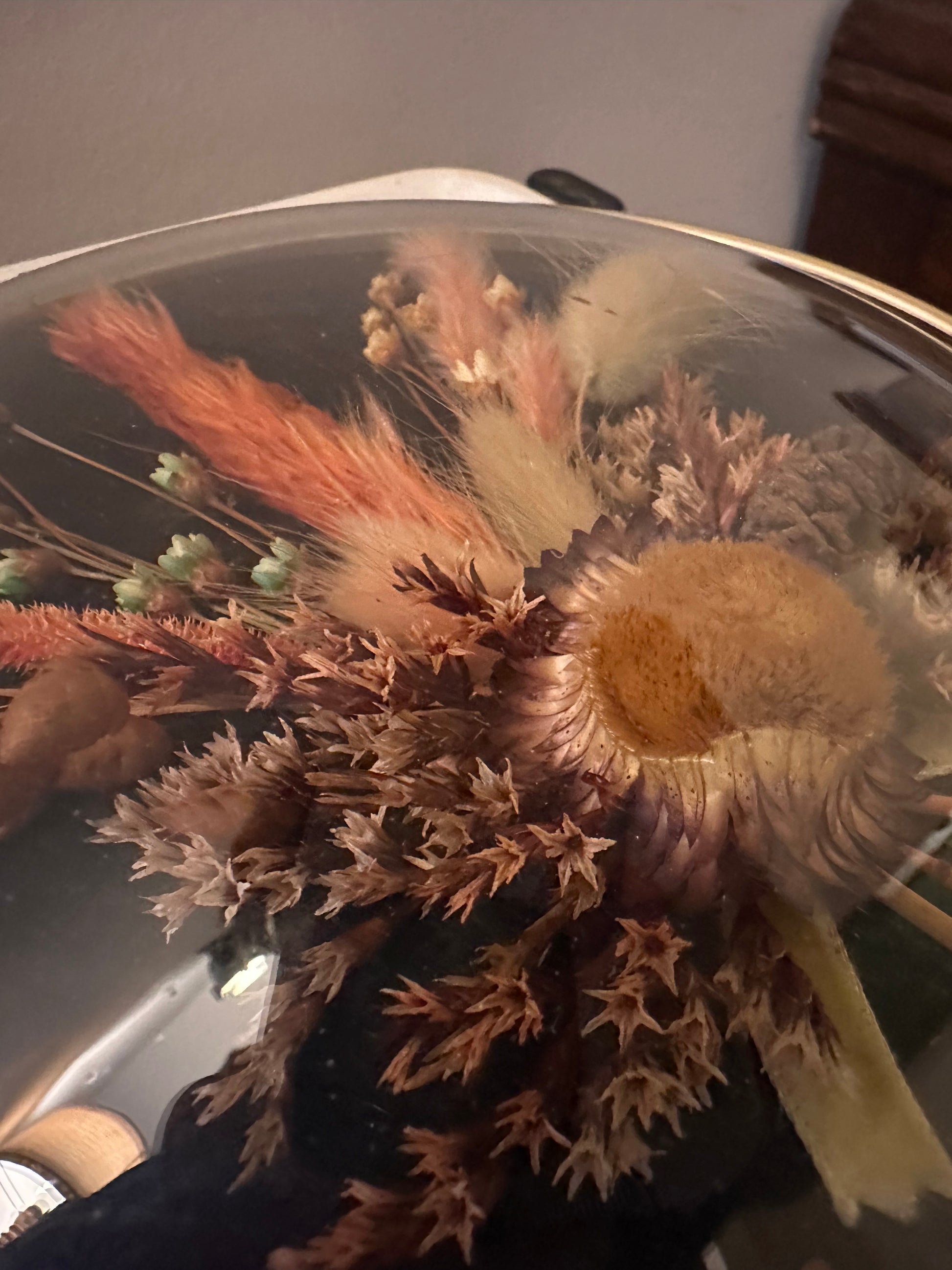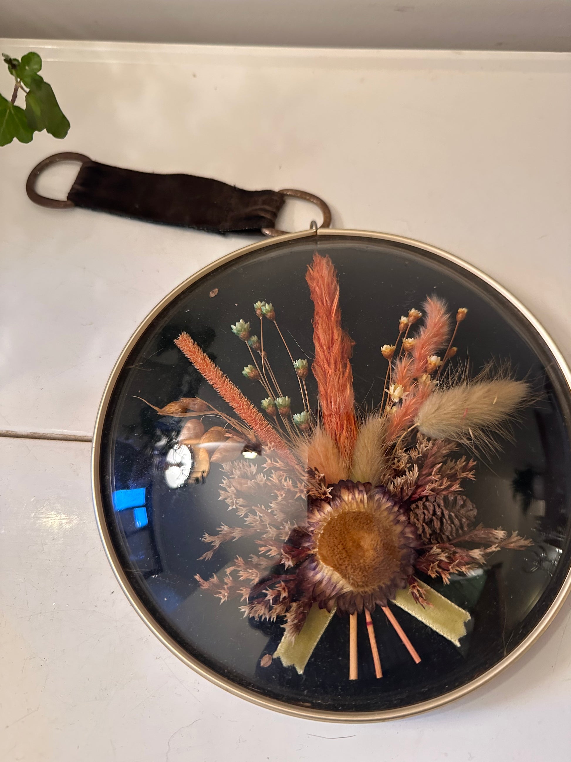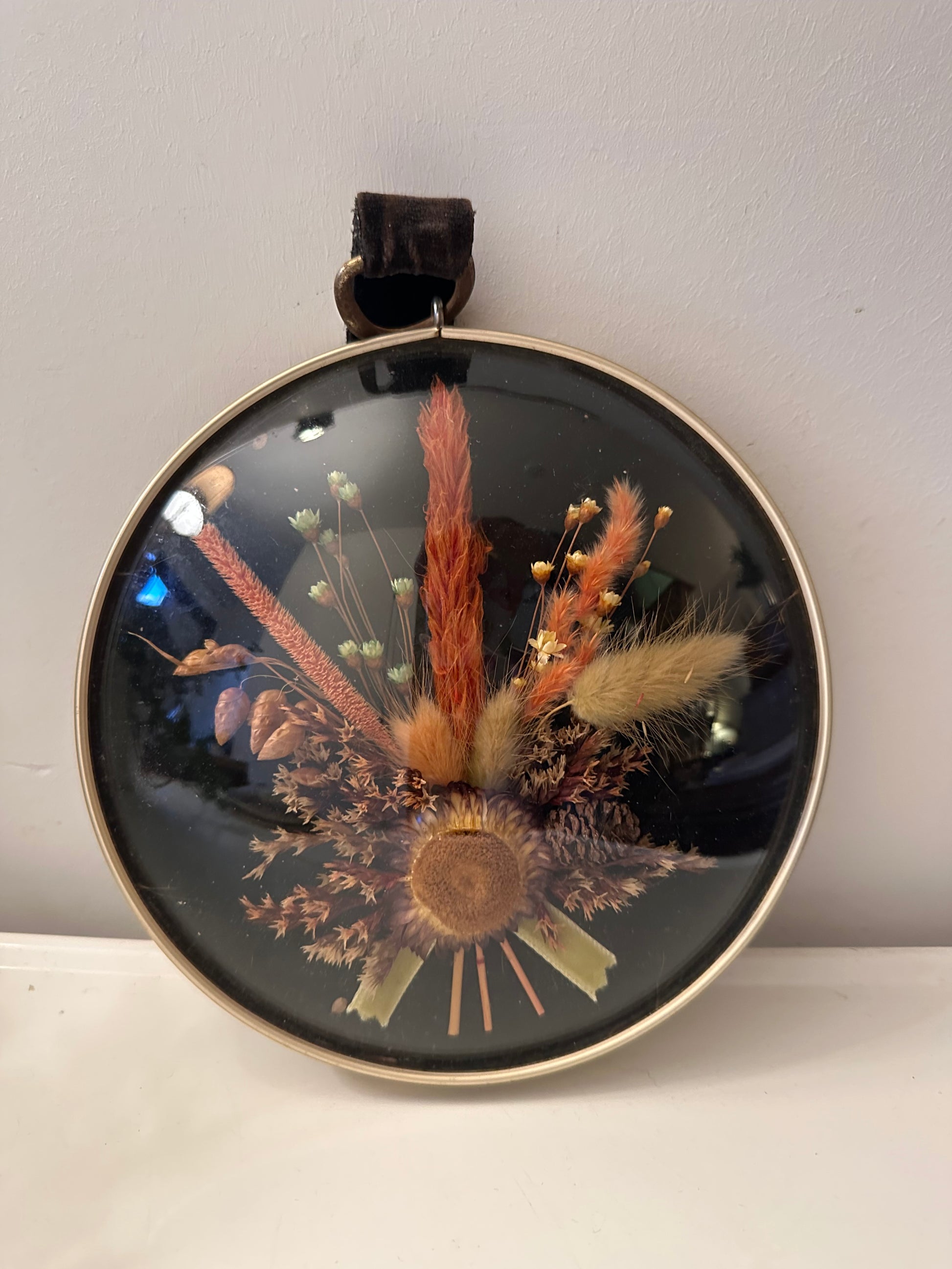 Waanzinnig leuk rond wandobject met bol glas en een bundel droogbloemen erin verwerkt. Het glas is mooi diep en afgewerkt met een metalen frame en een velvet hanger aan de bovenkant. Q702