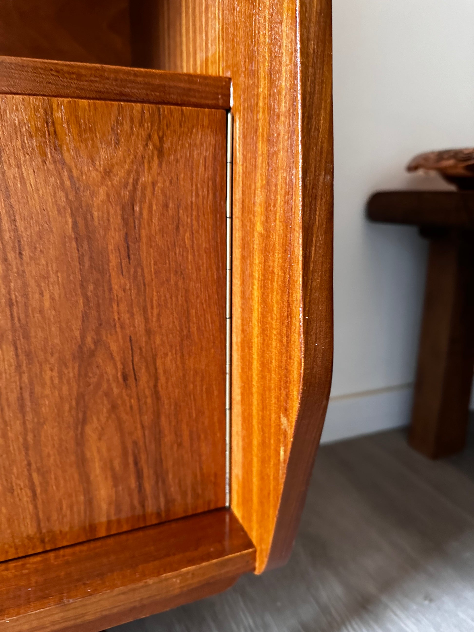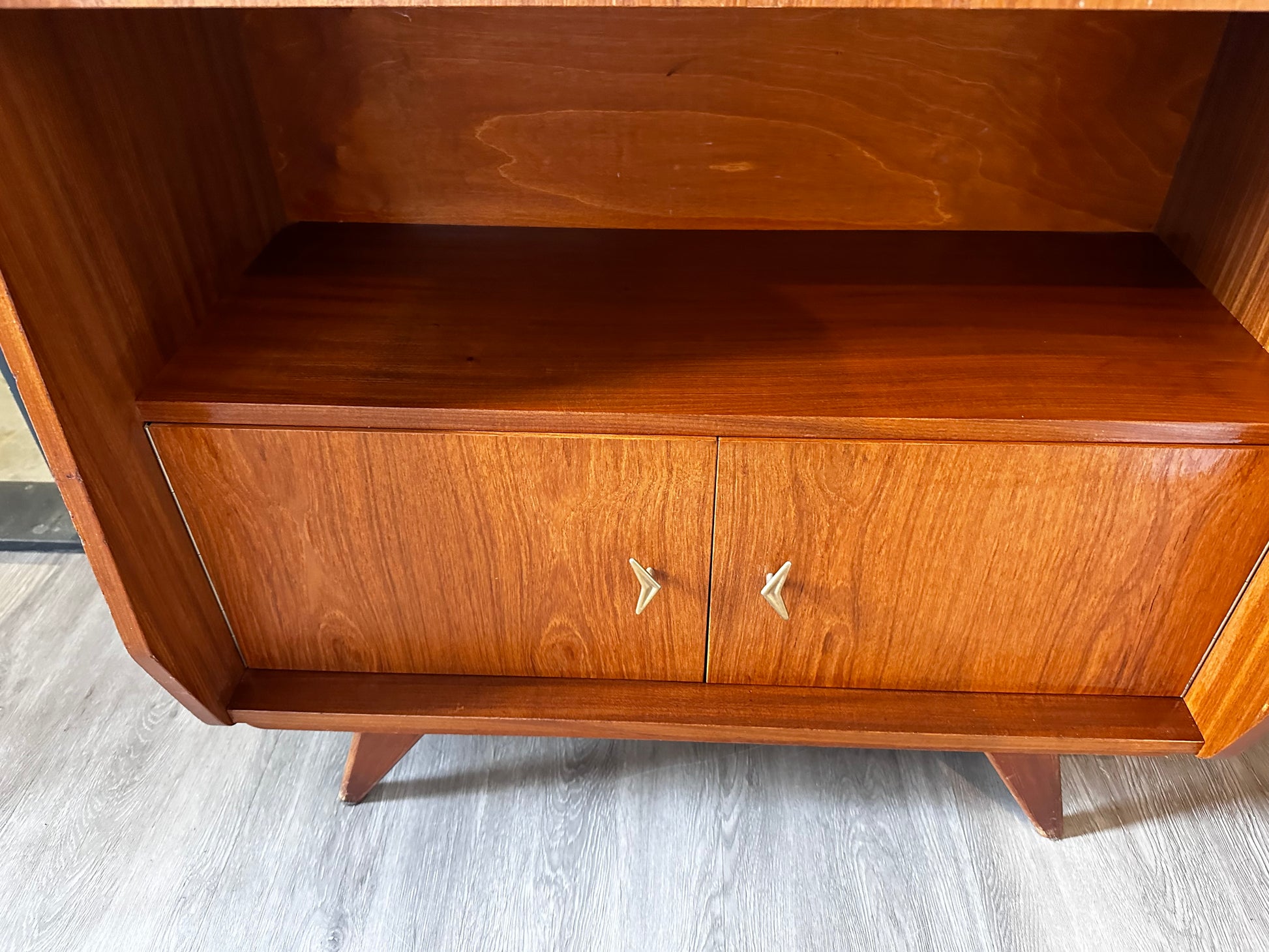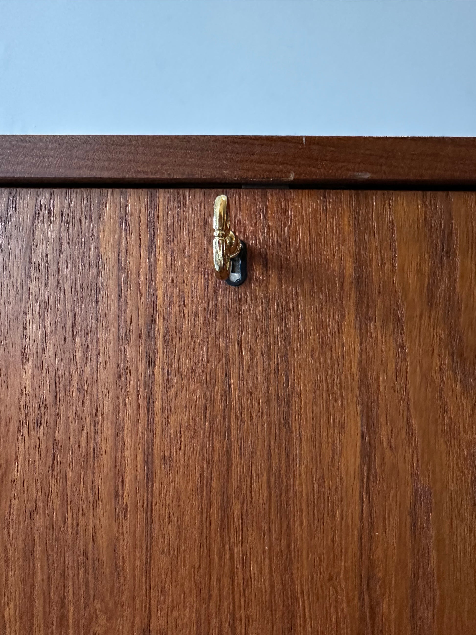 Een te gekke secretaire/ wandkastje uit de jaren 60. In een mooie vintage staat met hier en daar lichte gebruikssporen (zie foto’s). Dit jaren 60 kastje is afkomstig uit Nederland. Klep boven met een verdeling binnen in. Onder twee deurtjes met oringele knopjes. In het tussenstuk ruimte voor het plaatsen van accessoires.