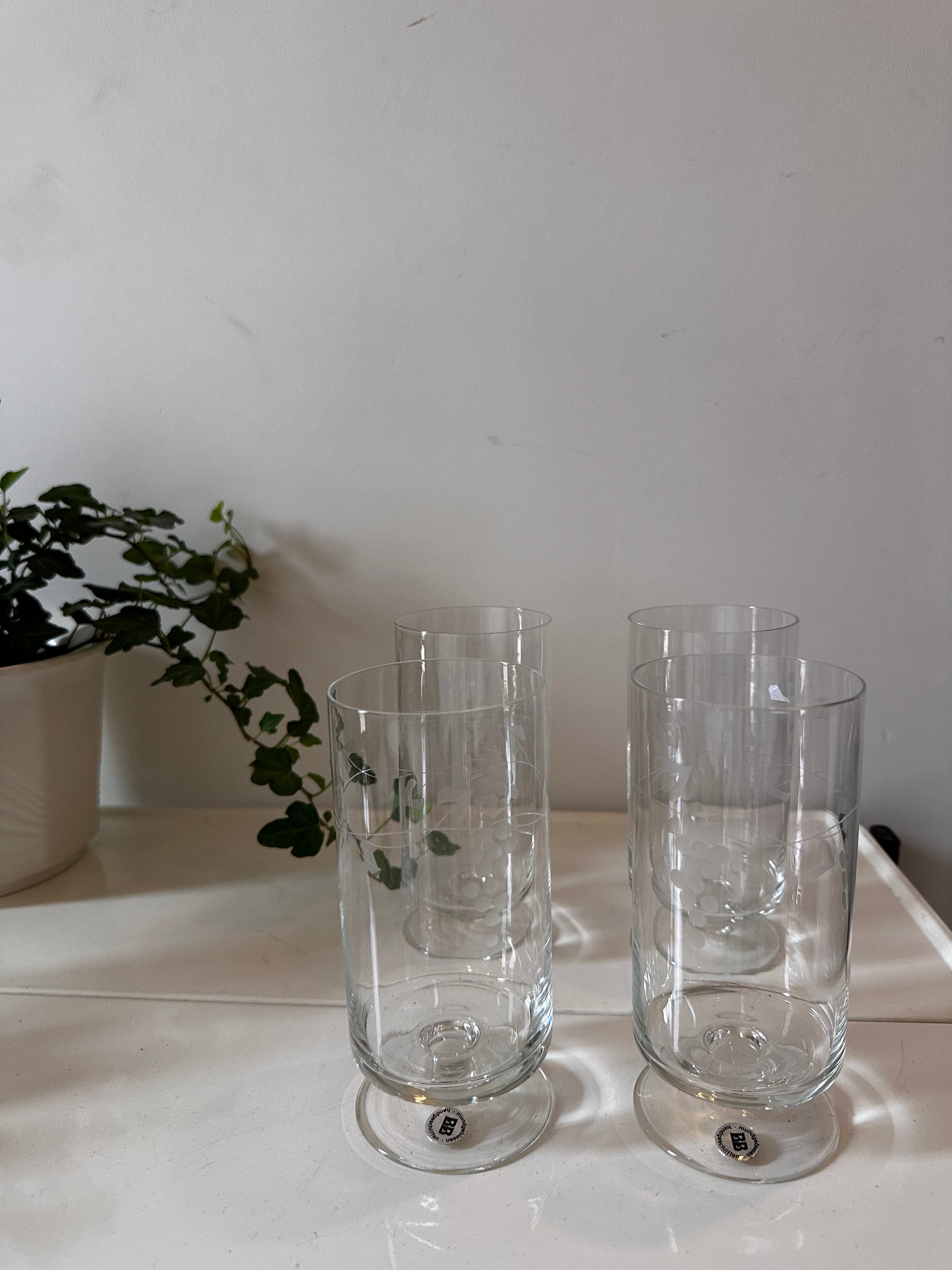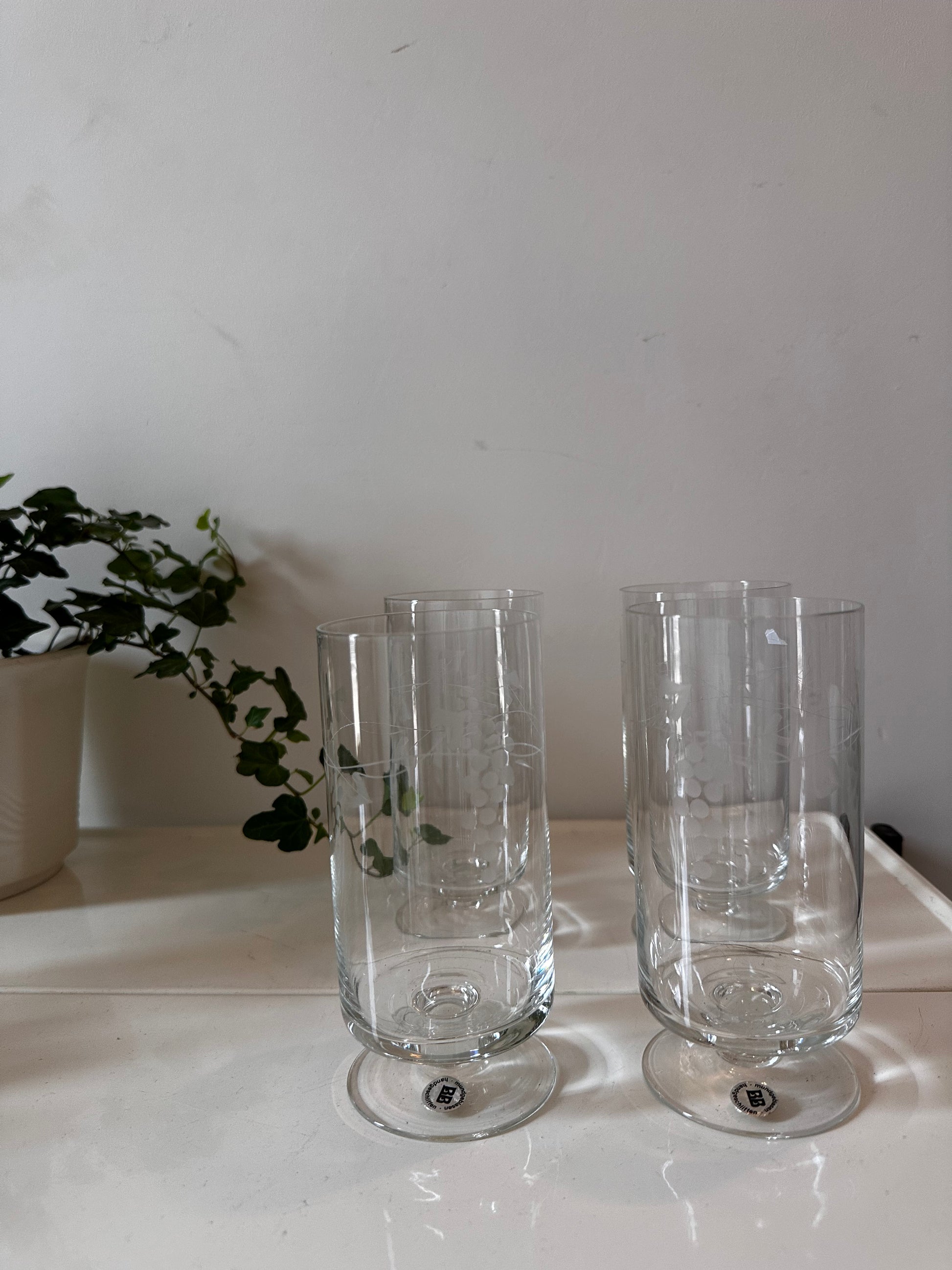 Mondgeblazen en handgeslepen waterglazen op een voetje. Deze prachtige glazen zijn in een perfecte staat. Ze hebben een gravering van wijnranken en druiven. Van het Duitse merk BB en dateren rond de jaren 70