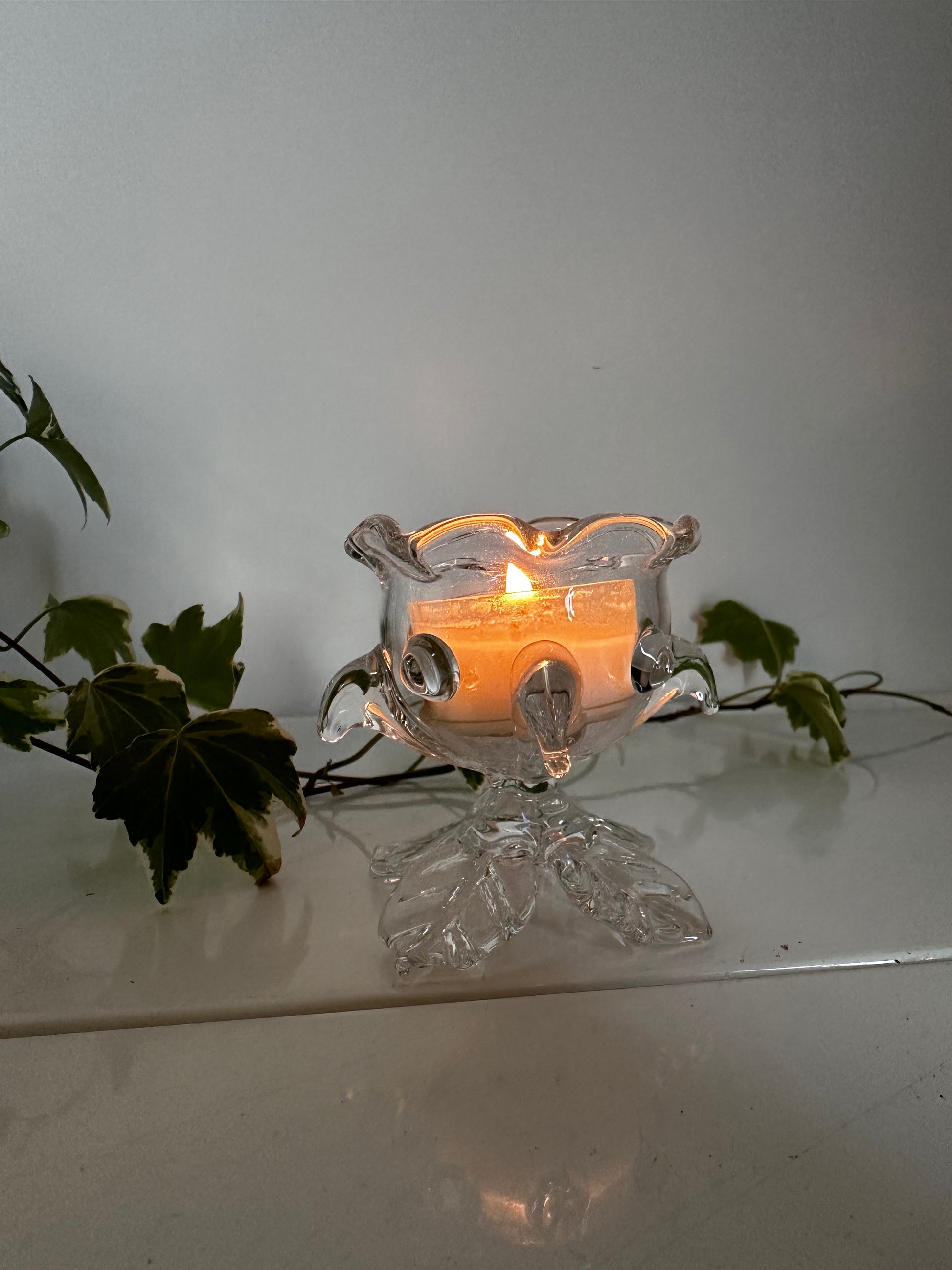 Sfeervol glazen waxinelicht houder. In een perfecte vintage staat. Deze waxinelicht houder is van glas en is mondgeblazen.