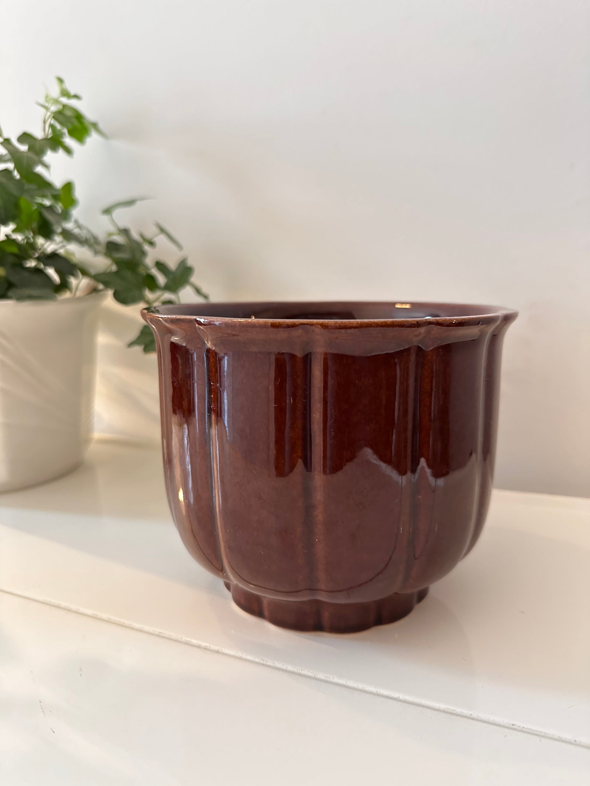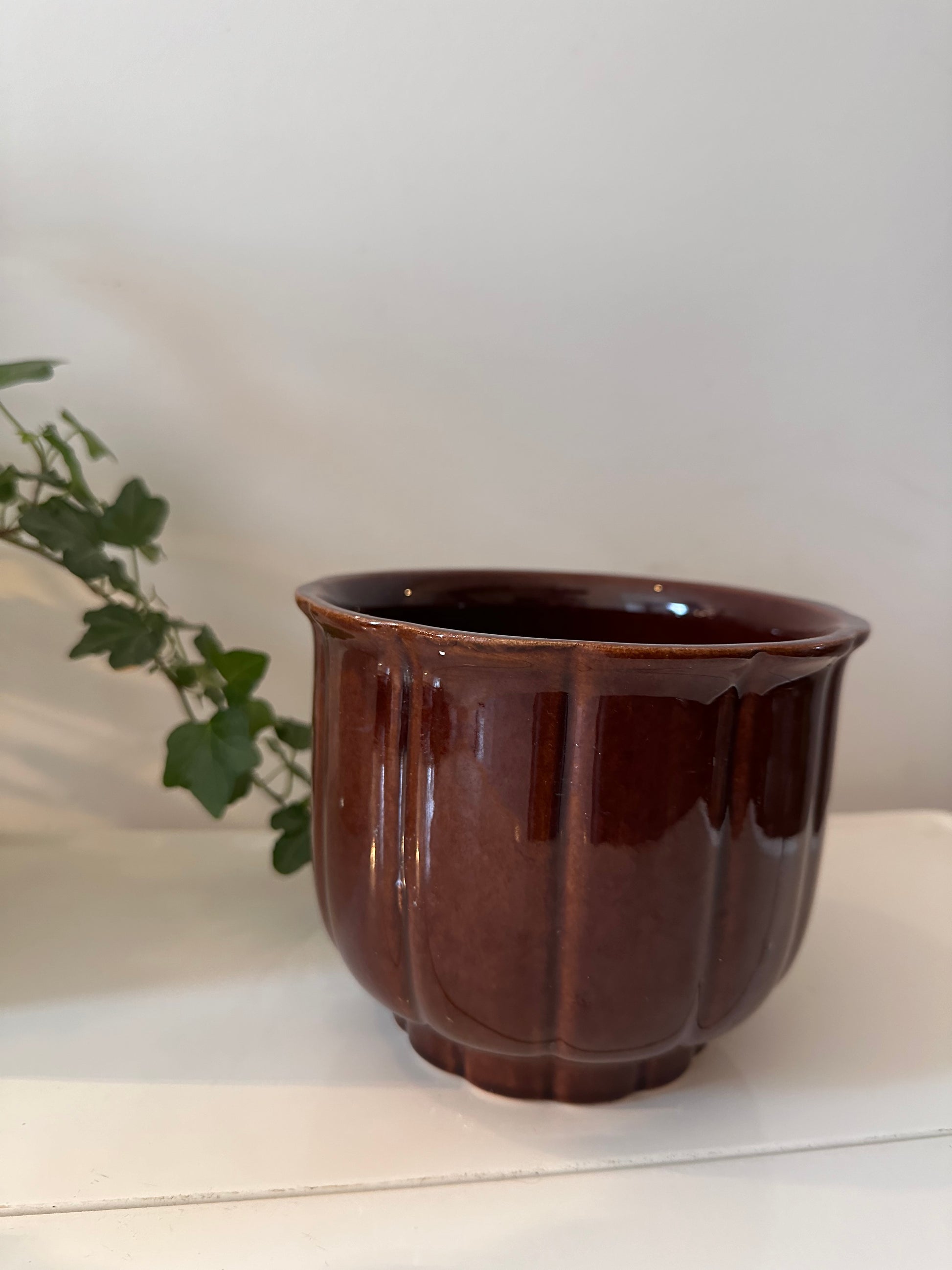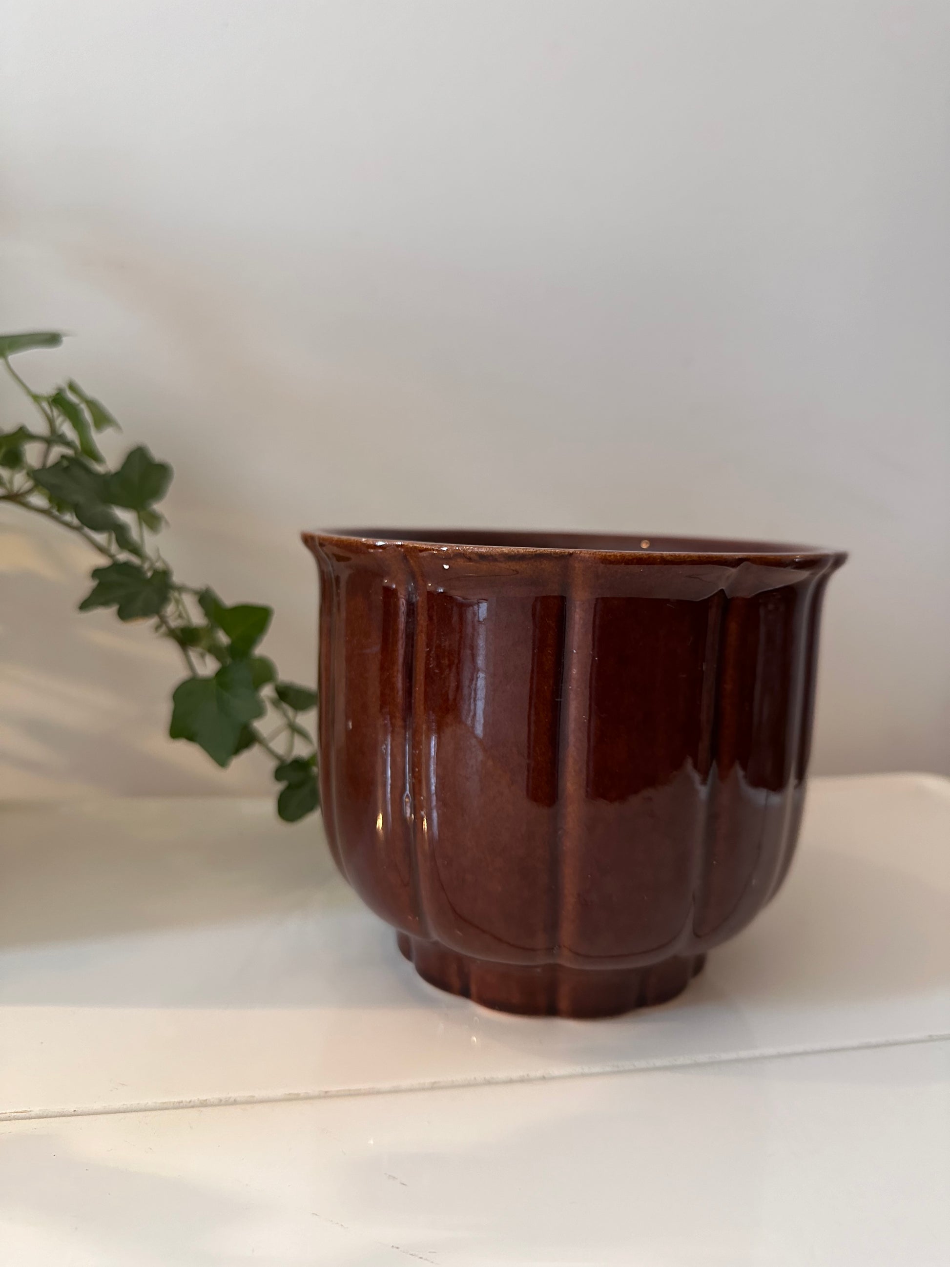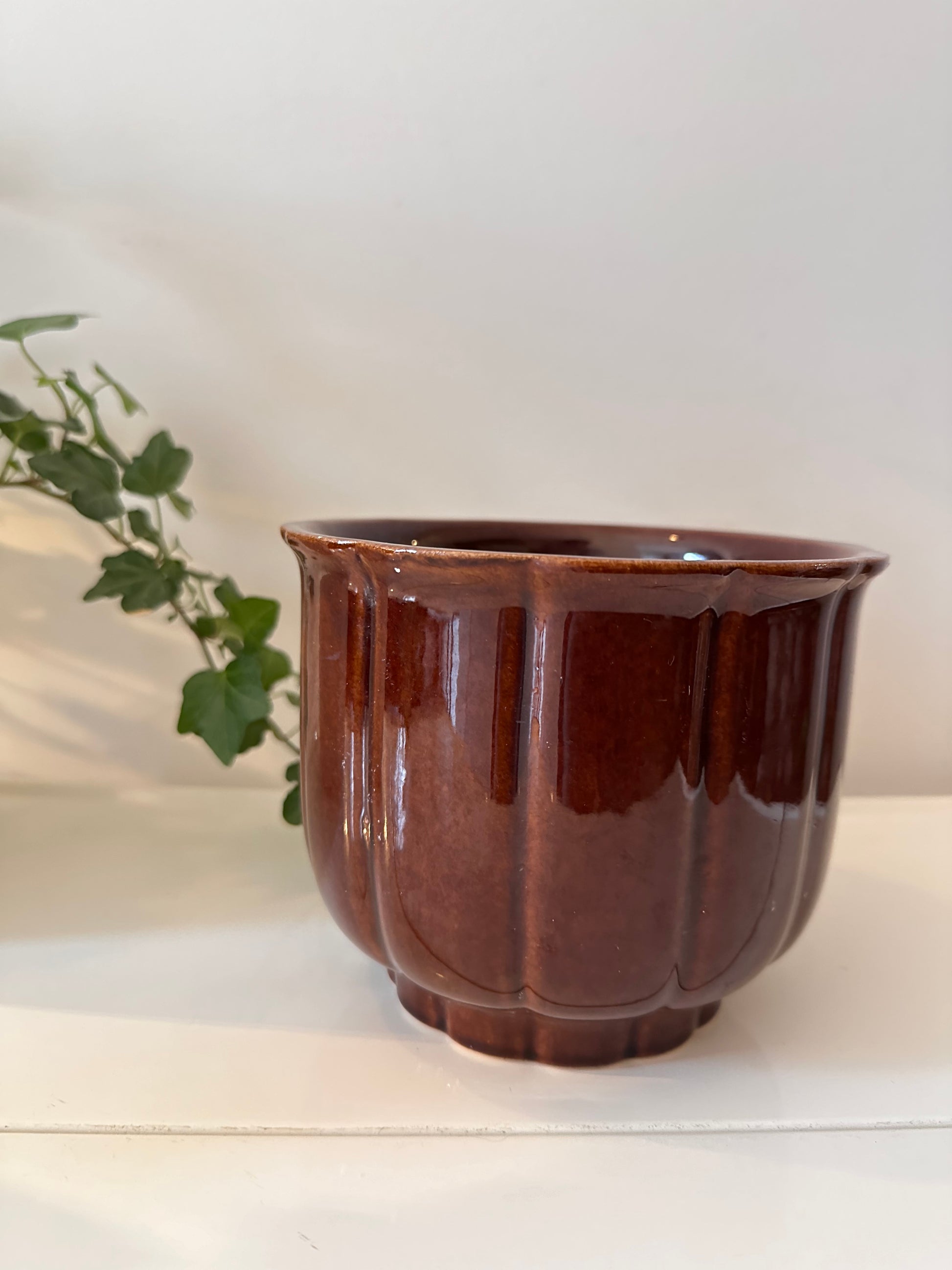 Een echte jaren 70 bloempot van West Germany. Kleur bruin, pot is geglazuurd. Bloempot is gemerkt onder. Afmetingen hoog 13 cm breed 15 cm