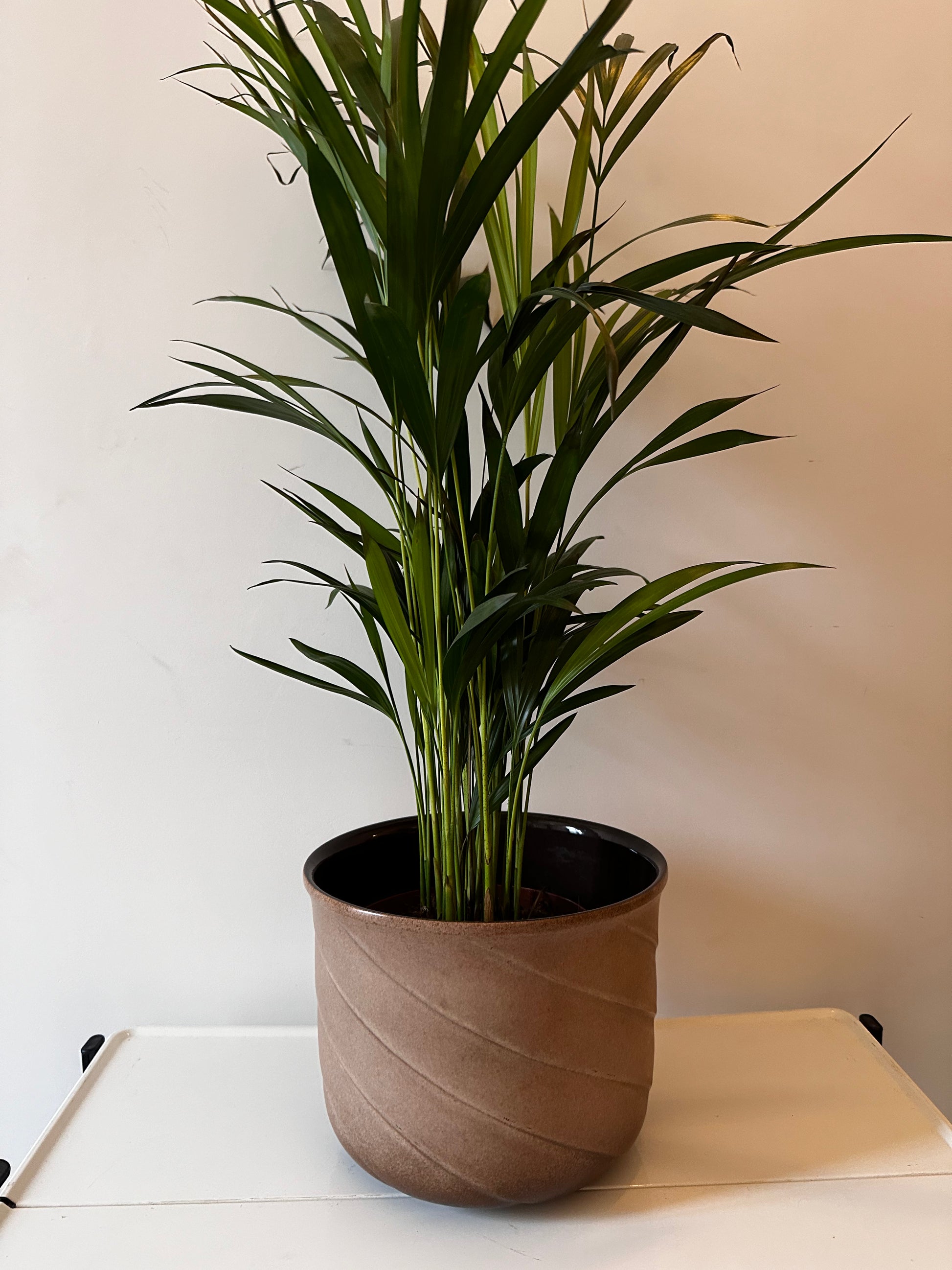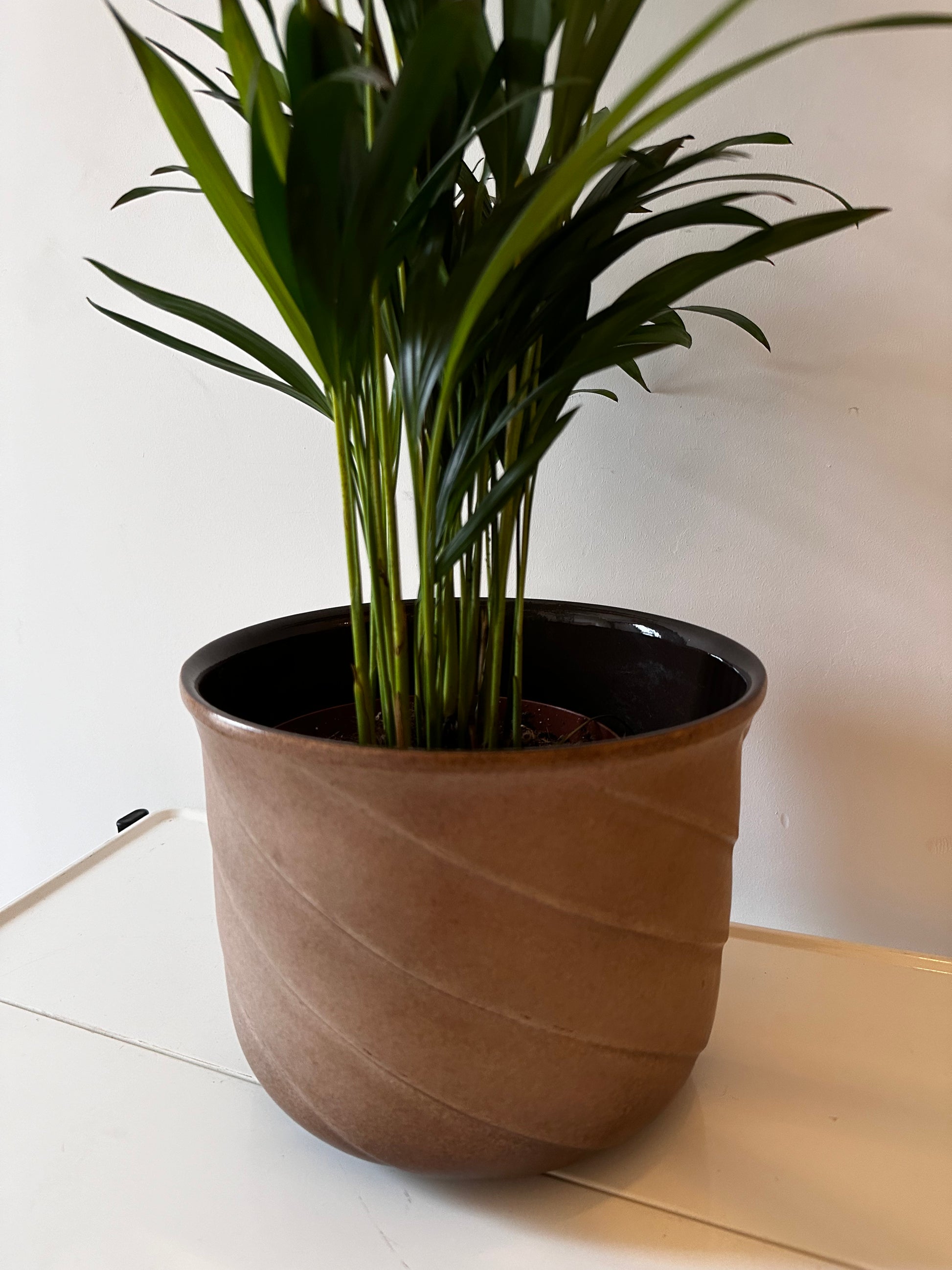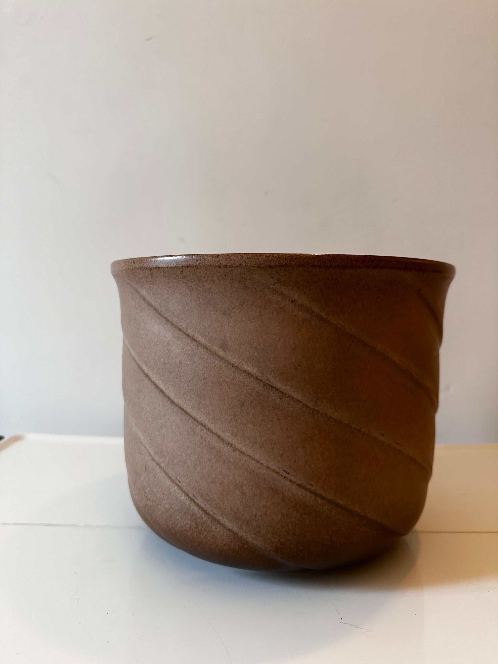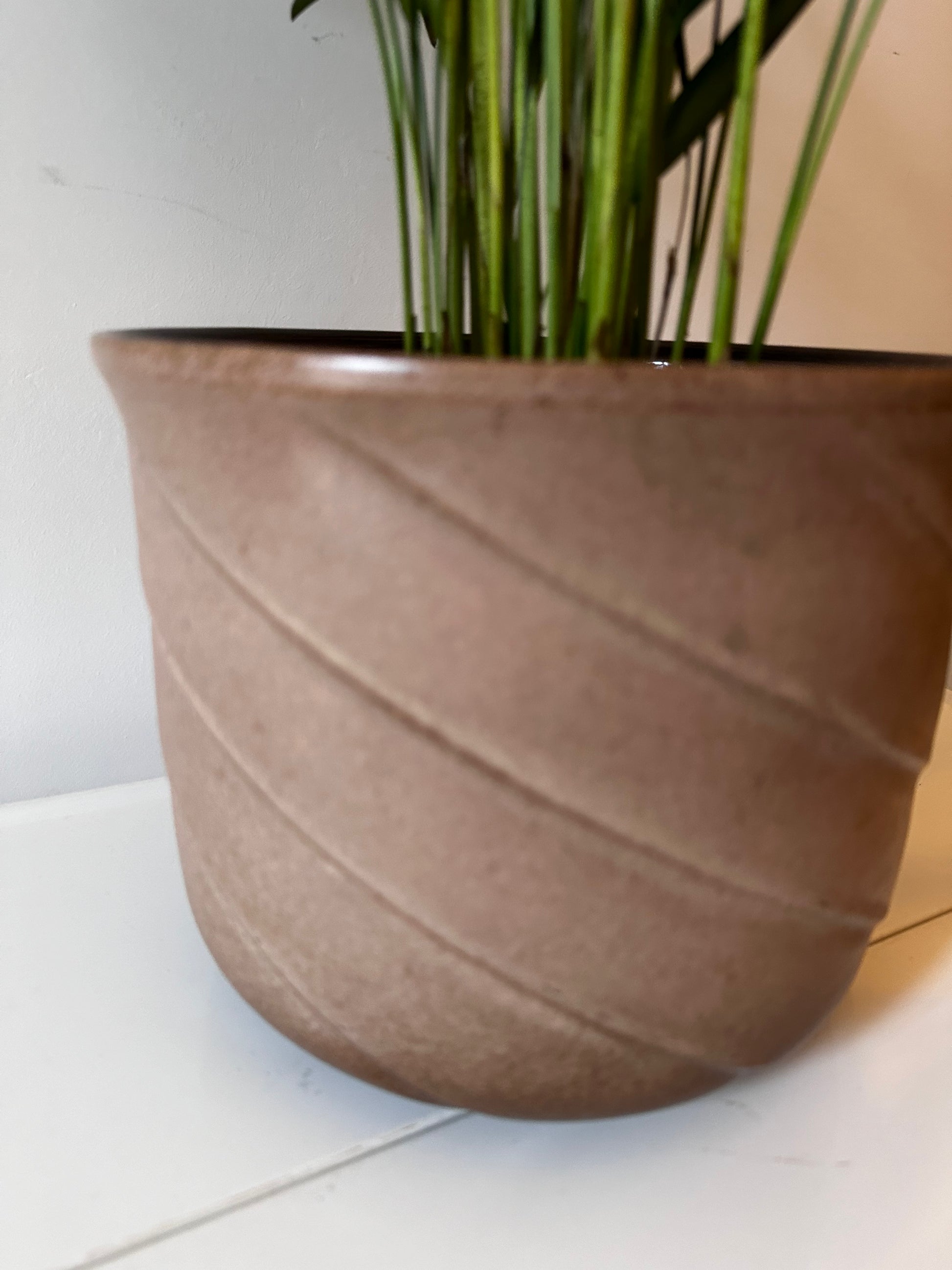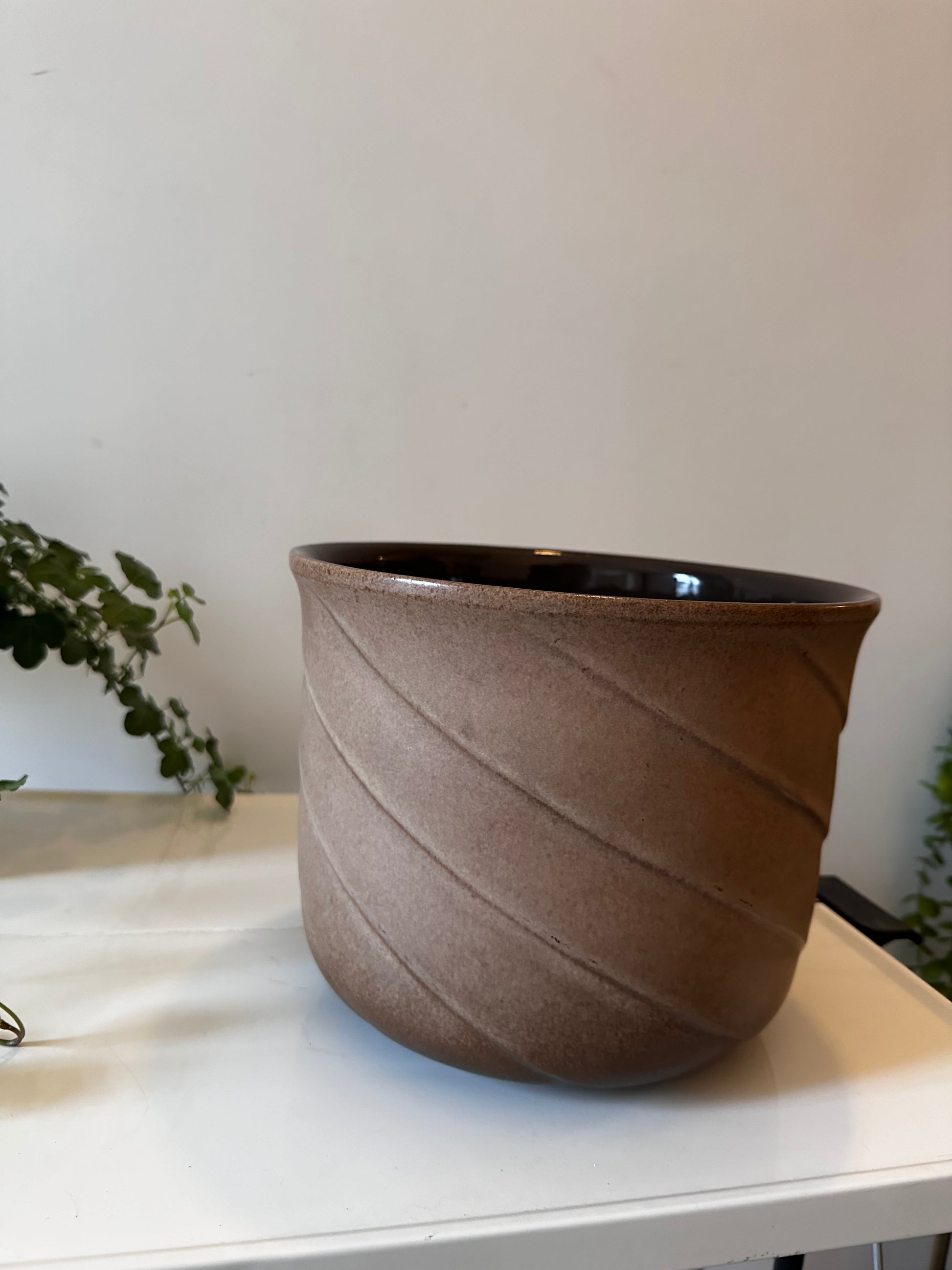 Onwijs leuke jaren 70 retro bloempot van West Germany keramiek. De bloempot is in een top vintage staat met bruine kleur en golvende lijnen. De pot is gemerkt onder