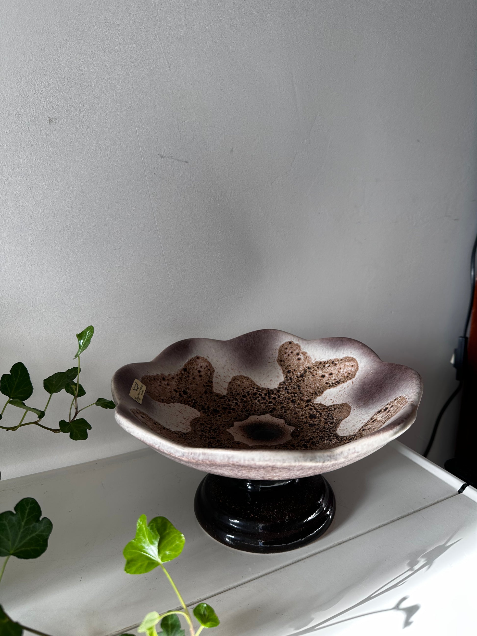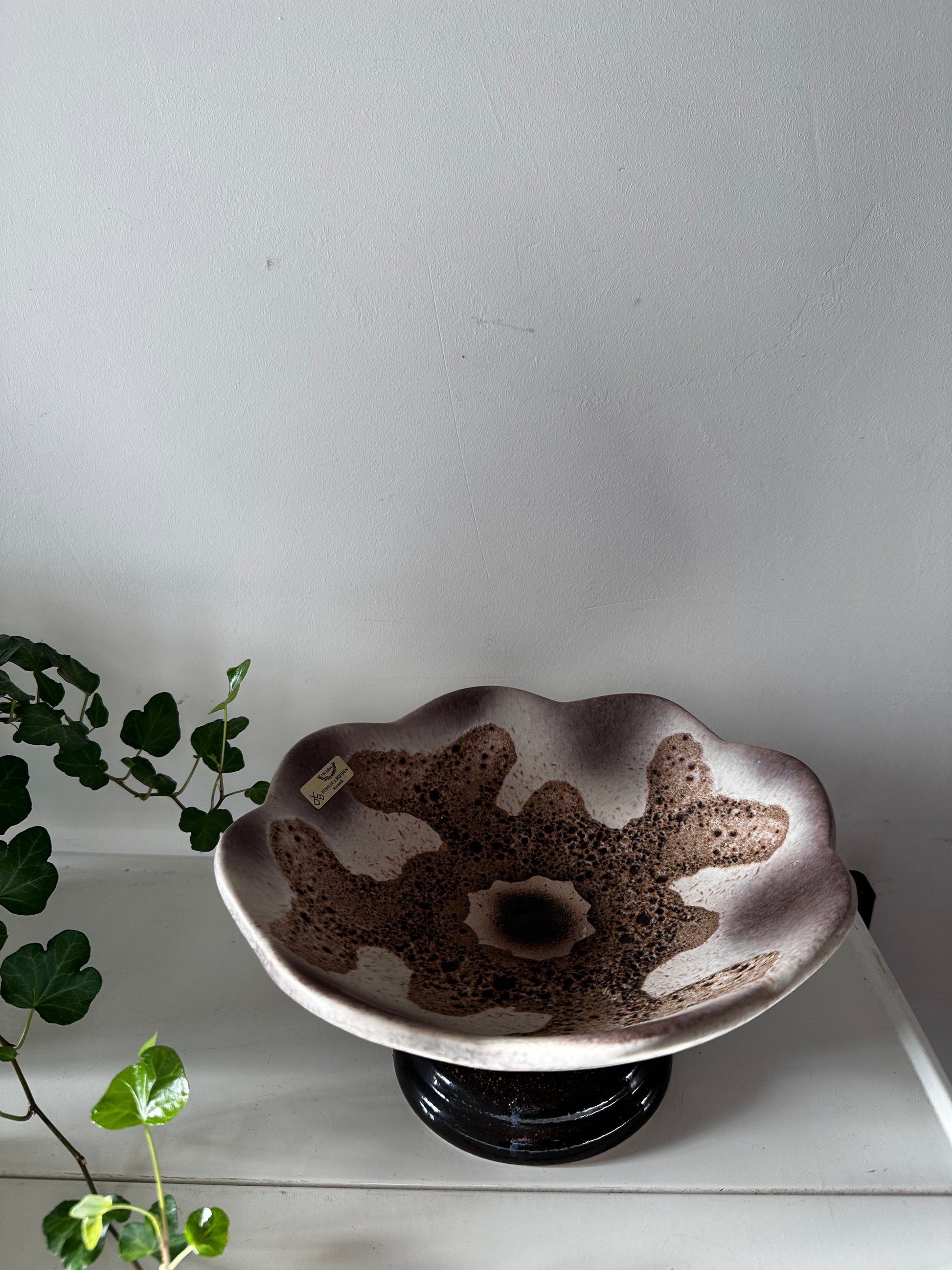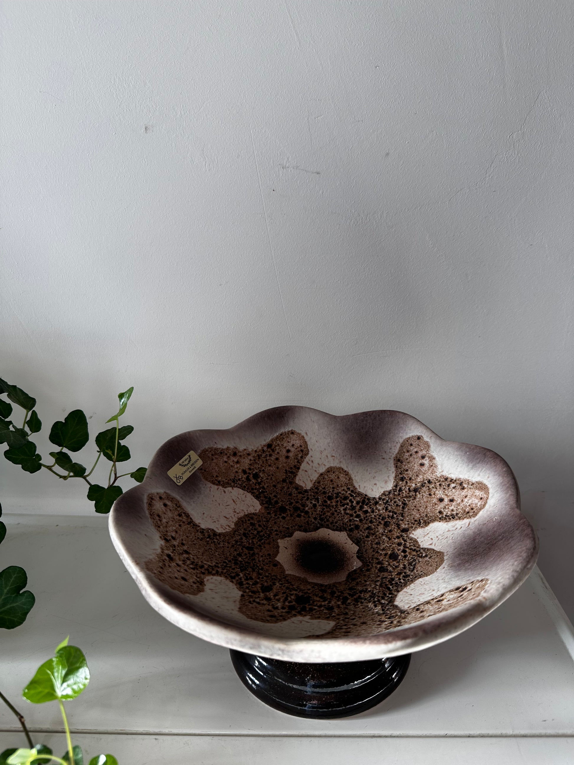 Toffe jaren 70 brutalist schaal, fruitschaal van het Duitse keramiek merk Dümler & Breiden. In een super vintage staat. Staat op een donkerbruine voet met een beige kleurige schaal met design binnen in. Voorzien van merksticker