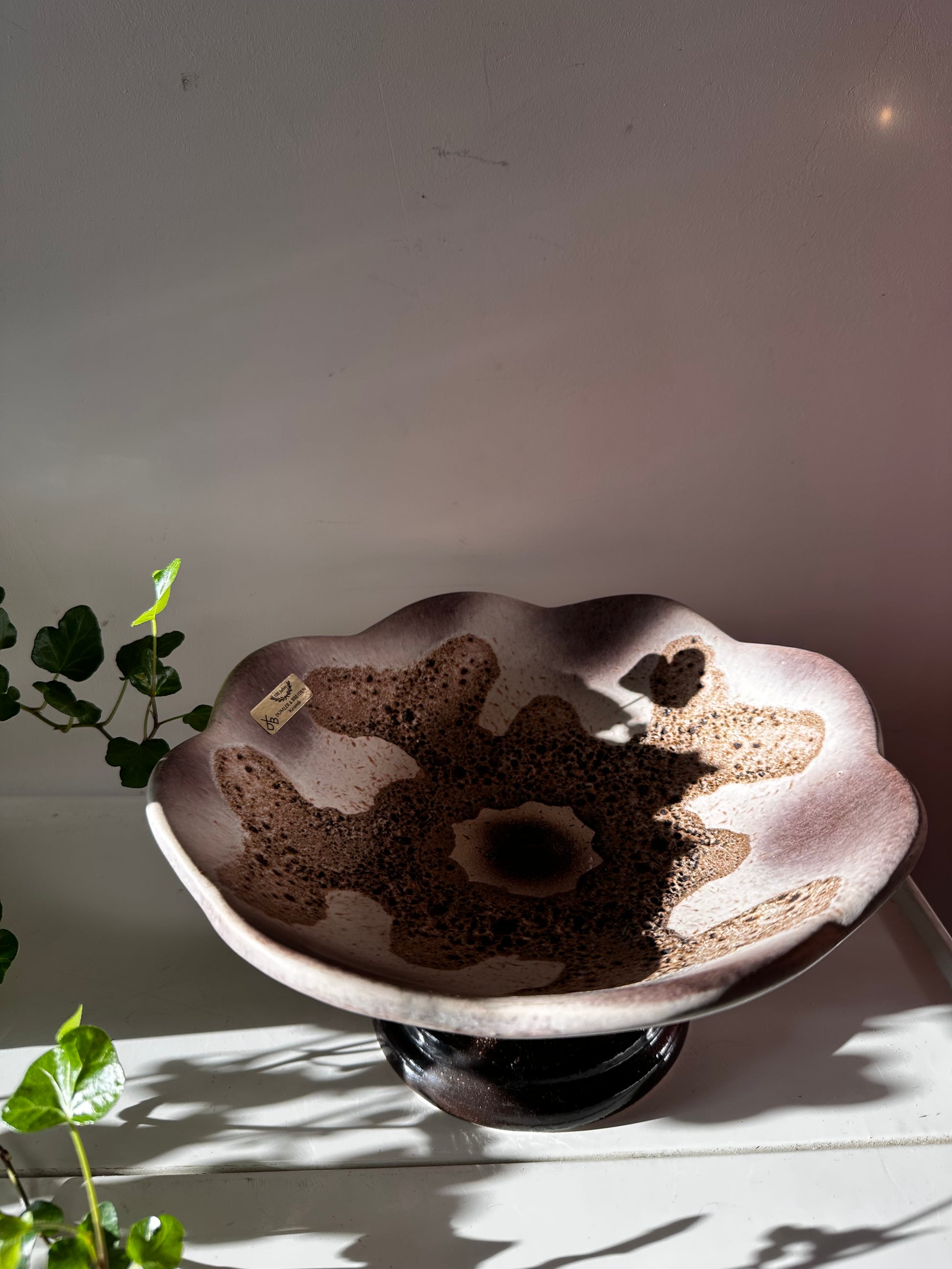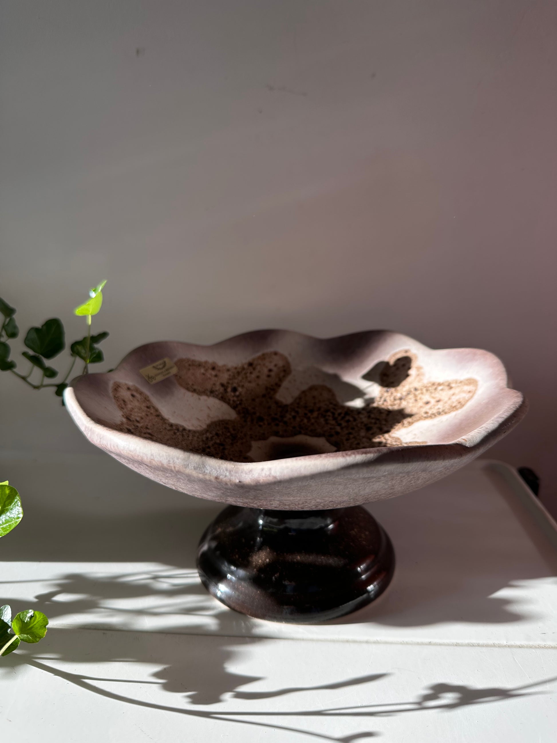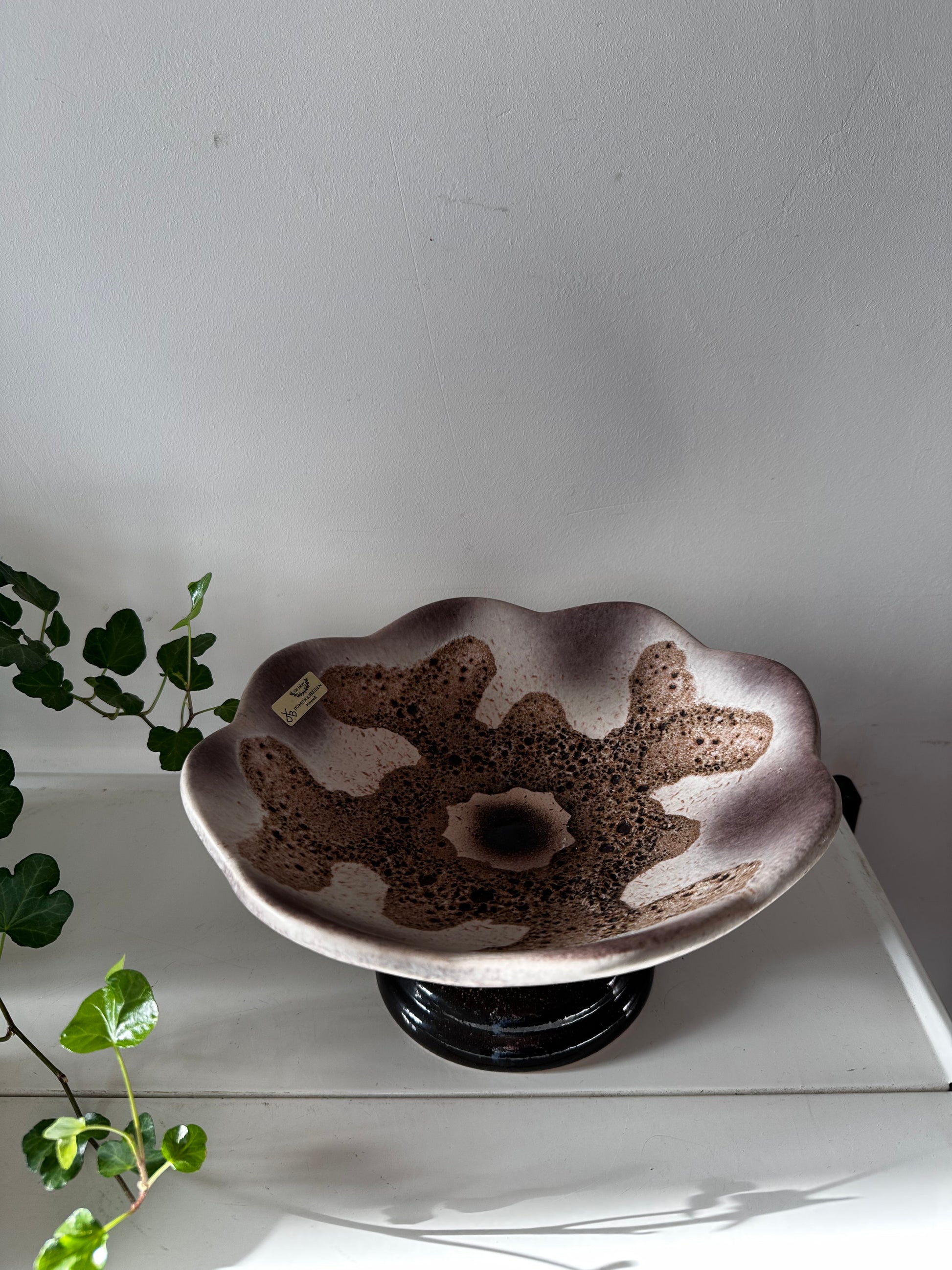 Toffe jaren 70 brutalist schaal, fruitschaal van het Duitse keramiek merk Dümler & Breiden. In een super vintage staat. Staat op een donkerbruine voet met een beige kleurige schaal met design binnen in. Voorzien van merksticker