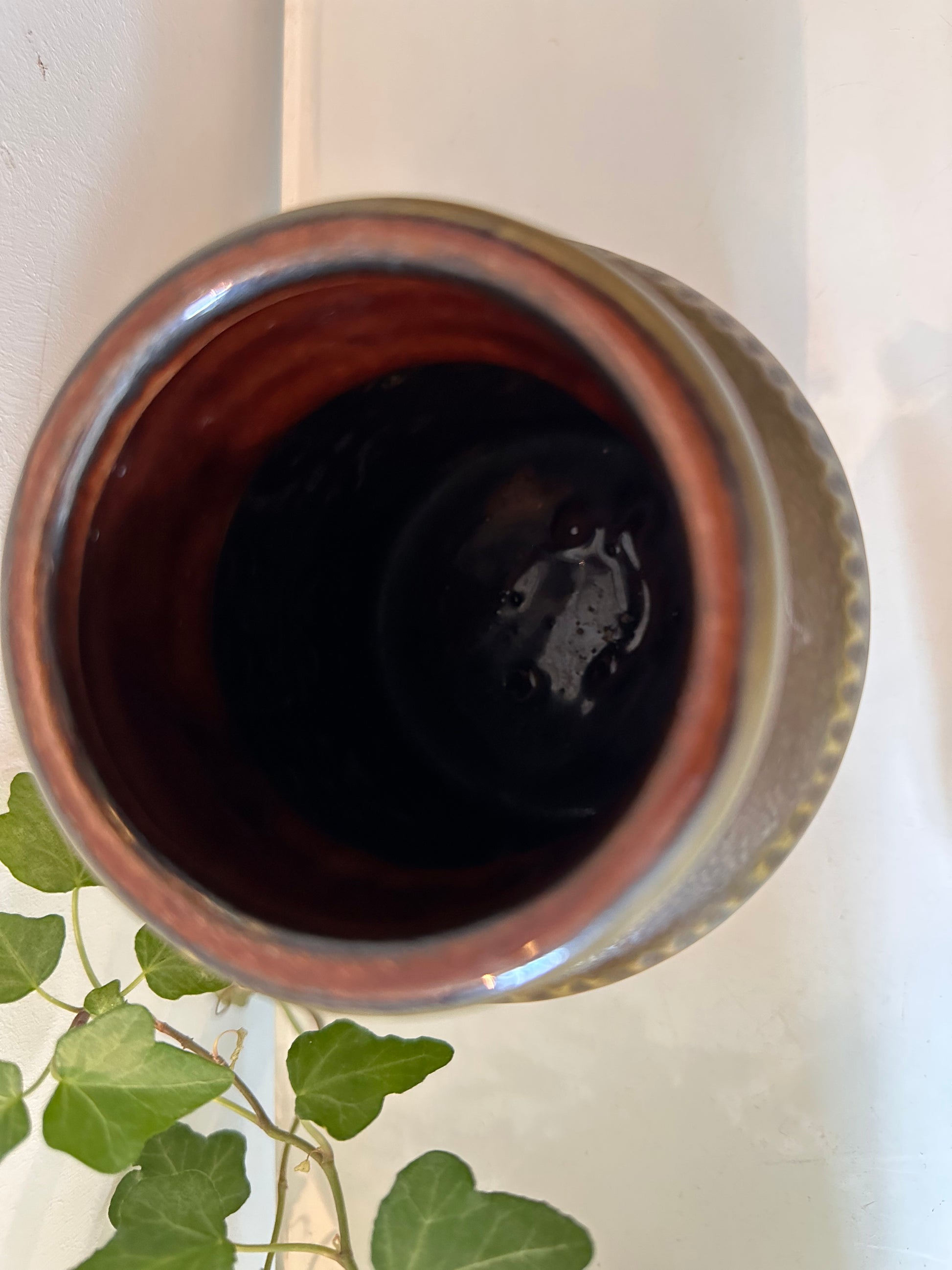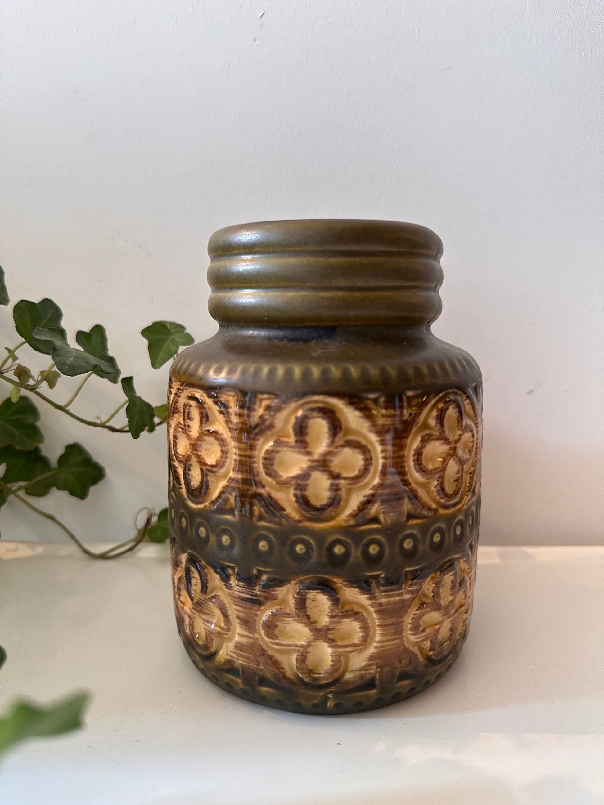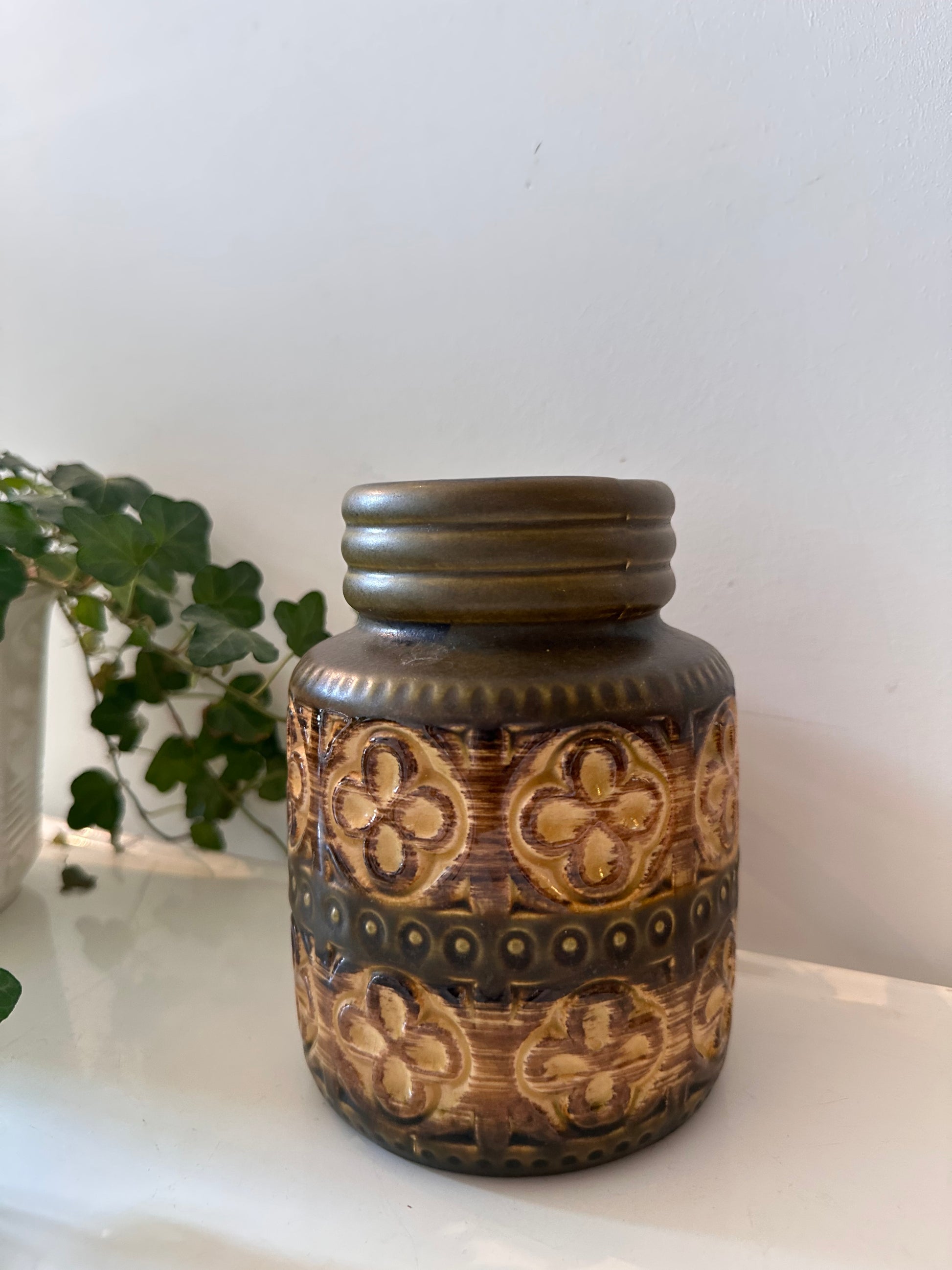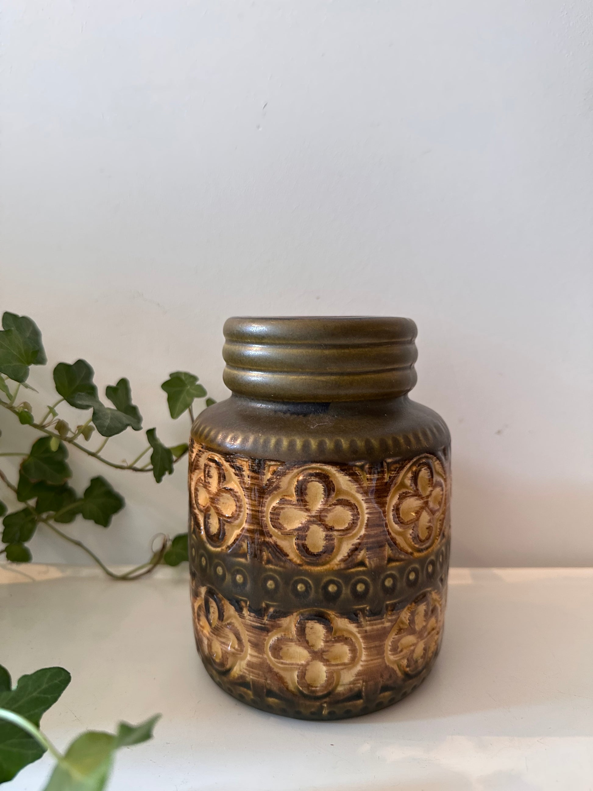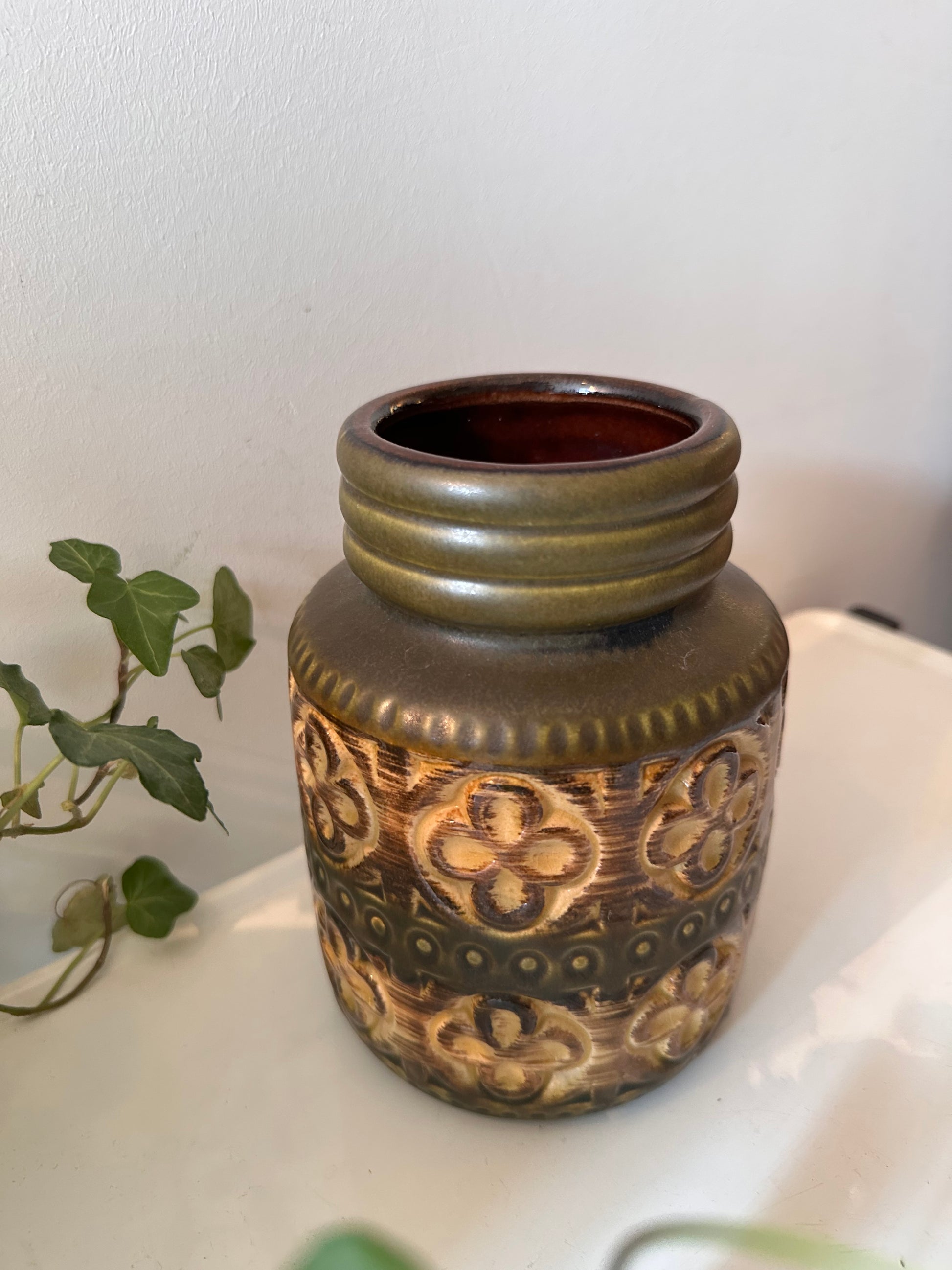 Supertof vaasje met dat kenmerkende West Germany glazuur in bruin- en olijftinten. De combinatie van het mooie glazuur en het retro bloemenreliëf maakt ’m echt een jaren 70 klassieker. Gemerkt onderop met W. Germany en modelnummer 289-15. Q185