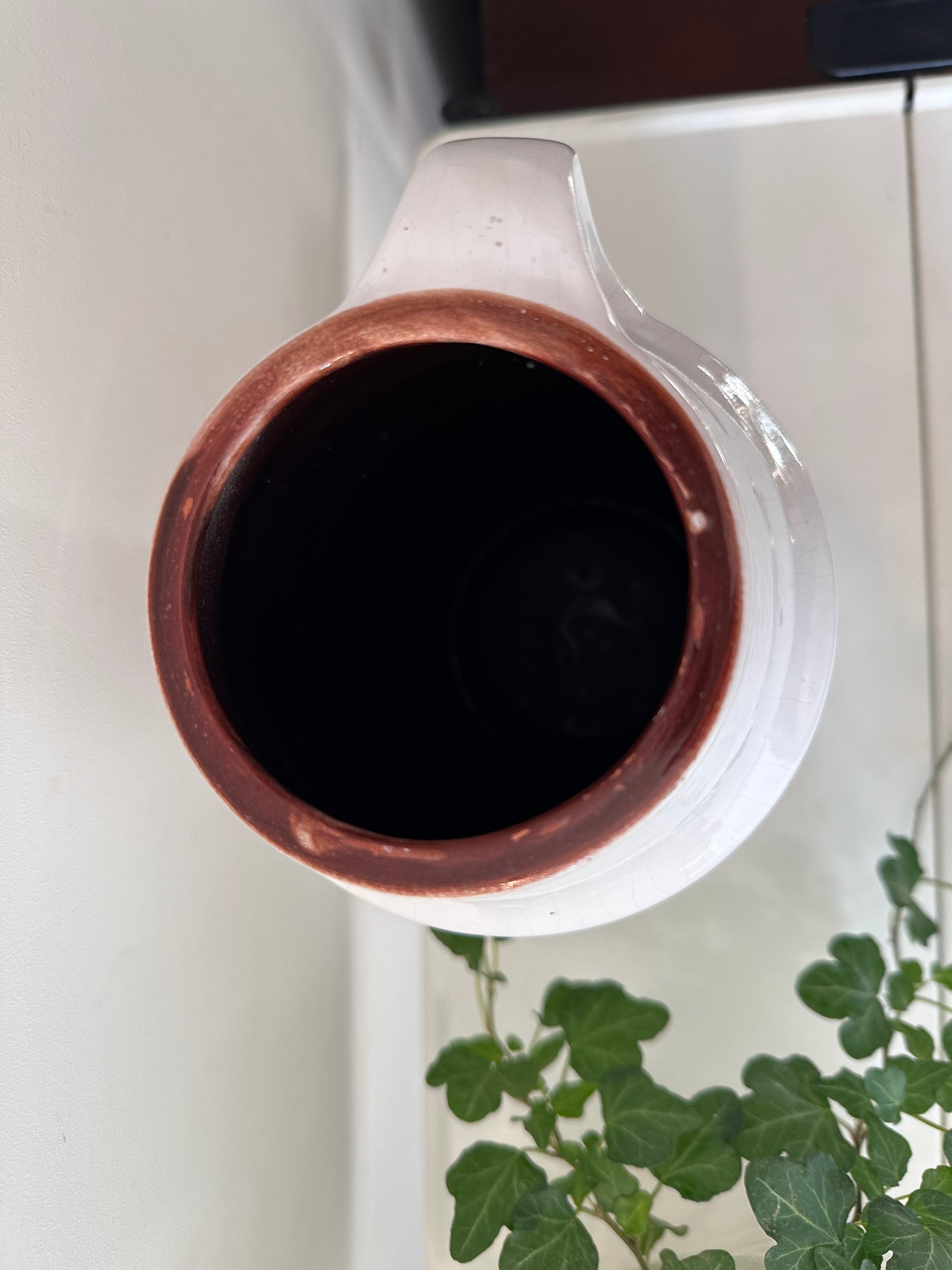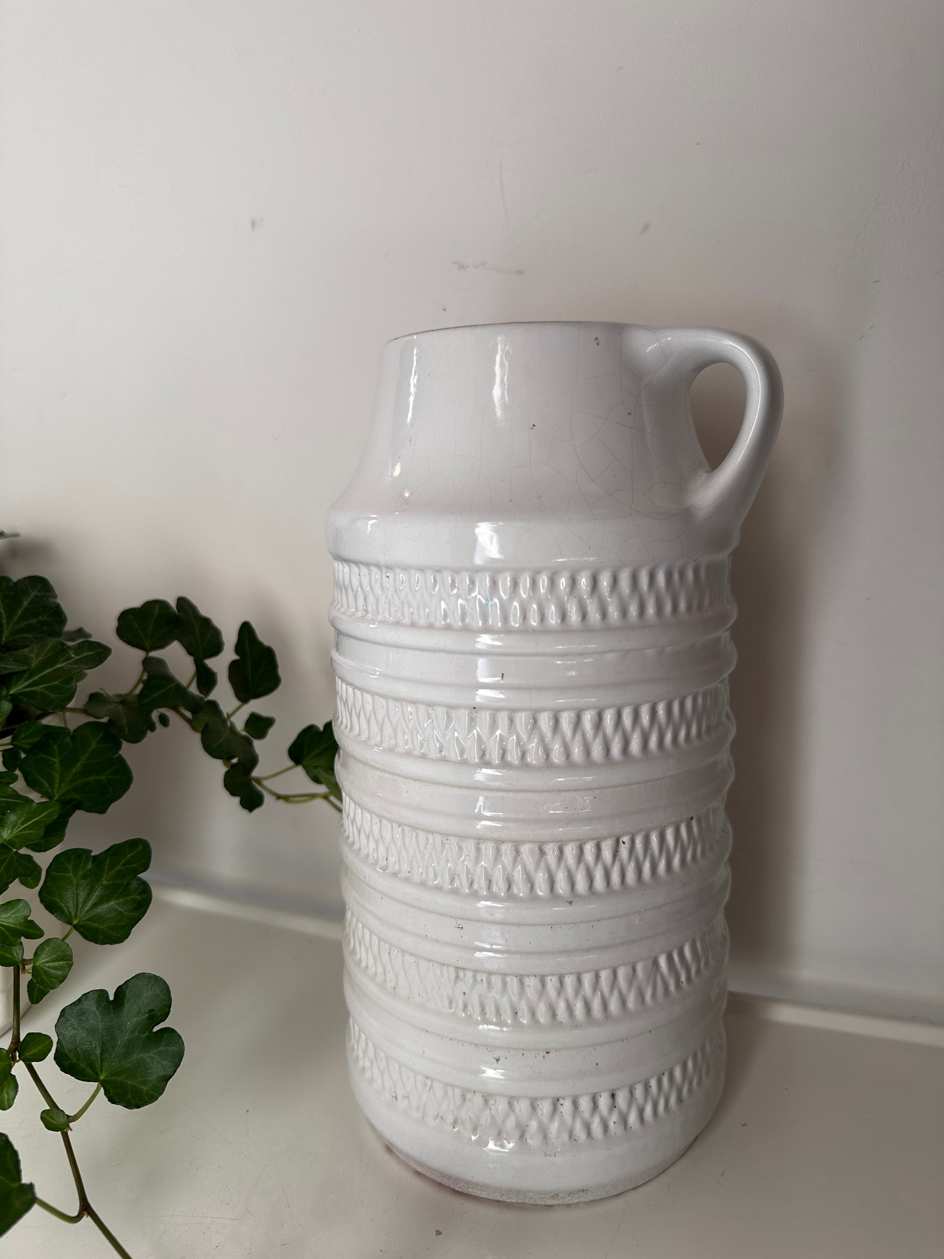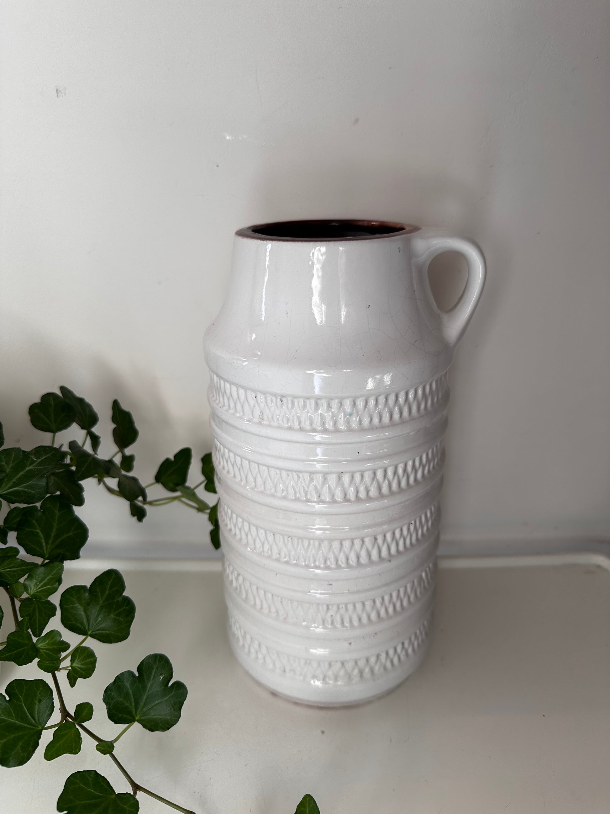 Een te gekke West Germany vaas. De vaas is wit gekleurd met een bruine rand aan de bovenkant van de rand. Heeft een klein handvat bij de hals. Vaas heeft een soort ribbel design. De vaas is gemerkt onder. Afkomstig uit Duitsland dateert jaren 70.