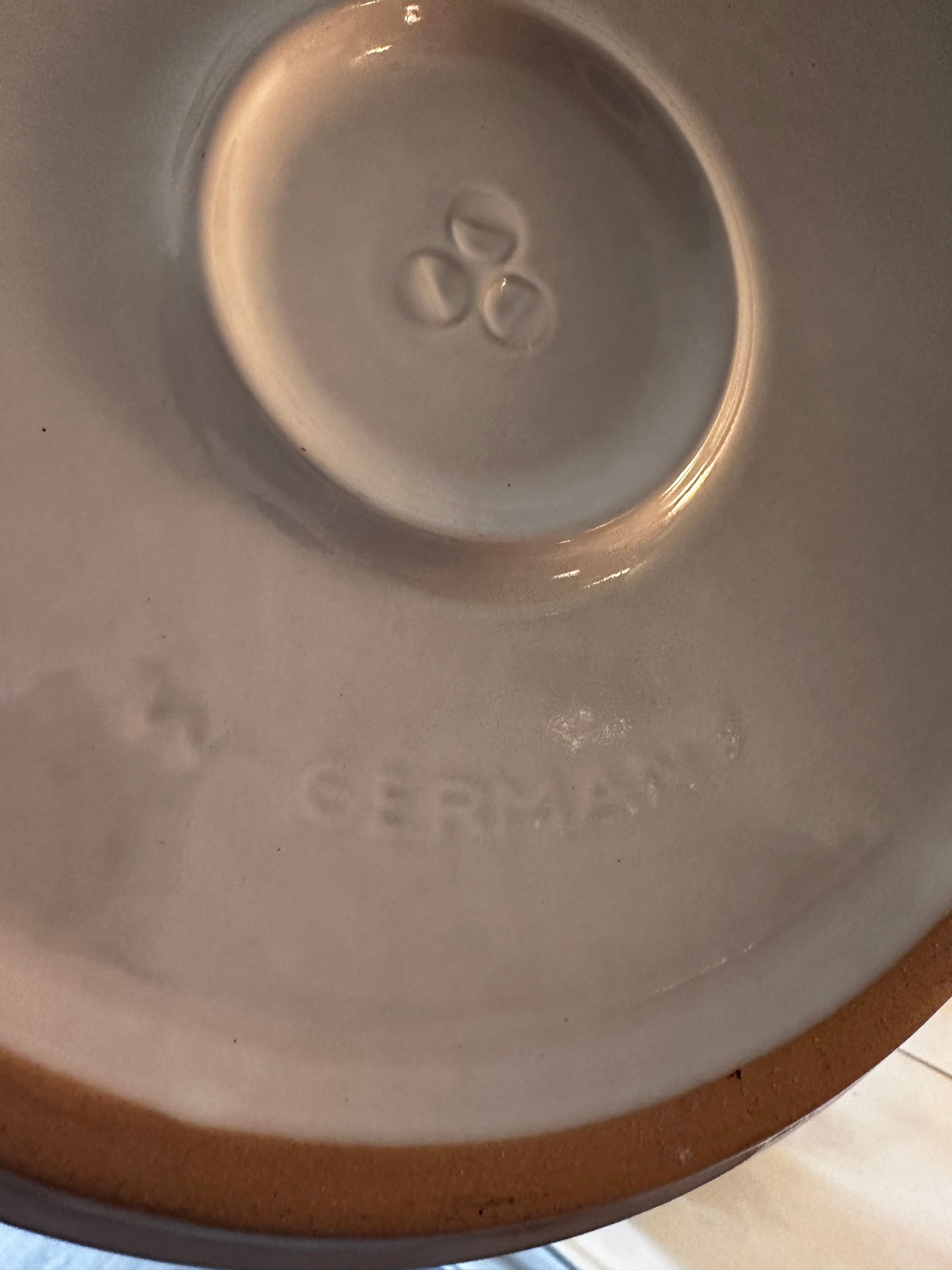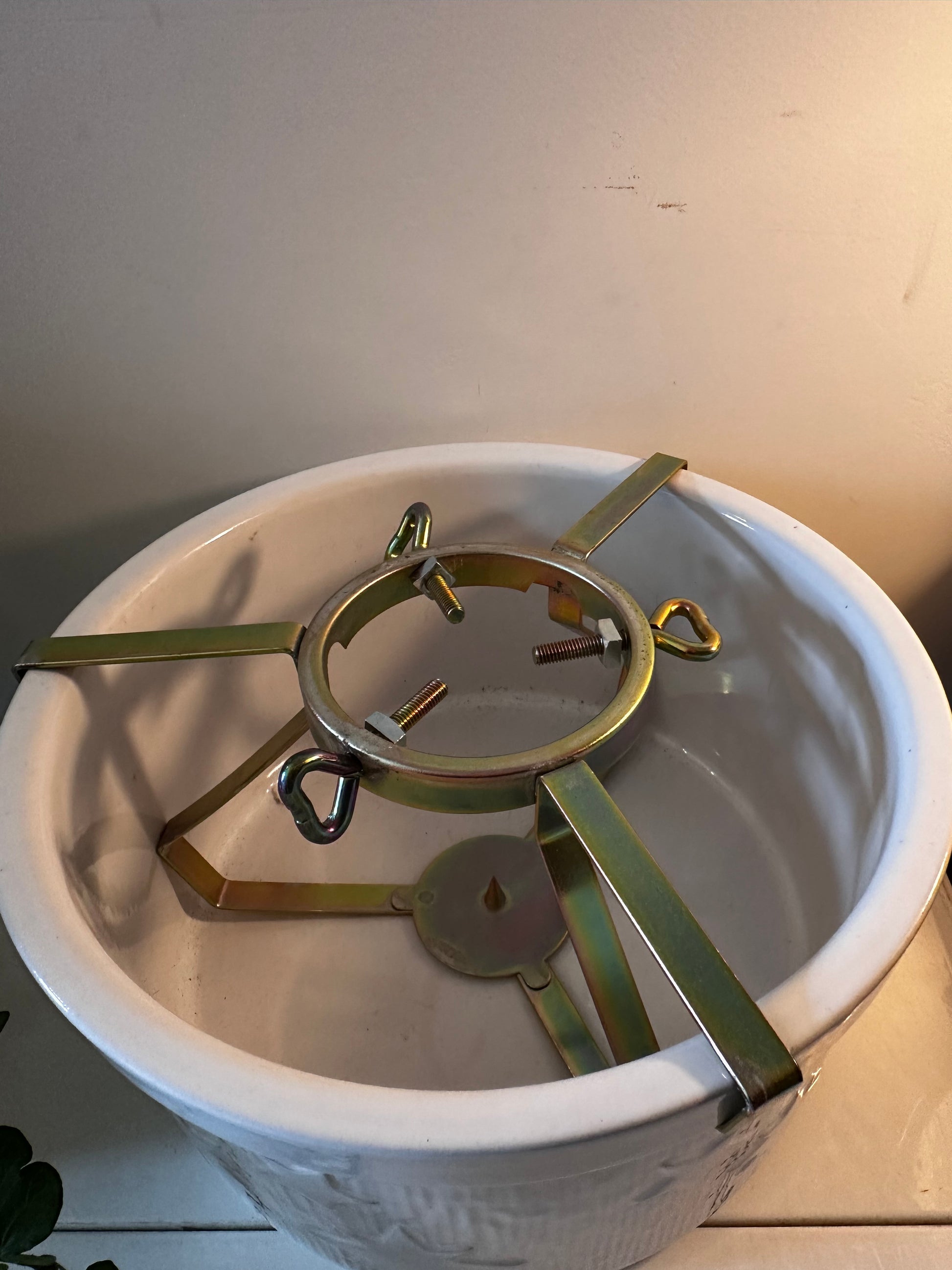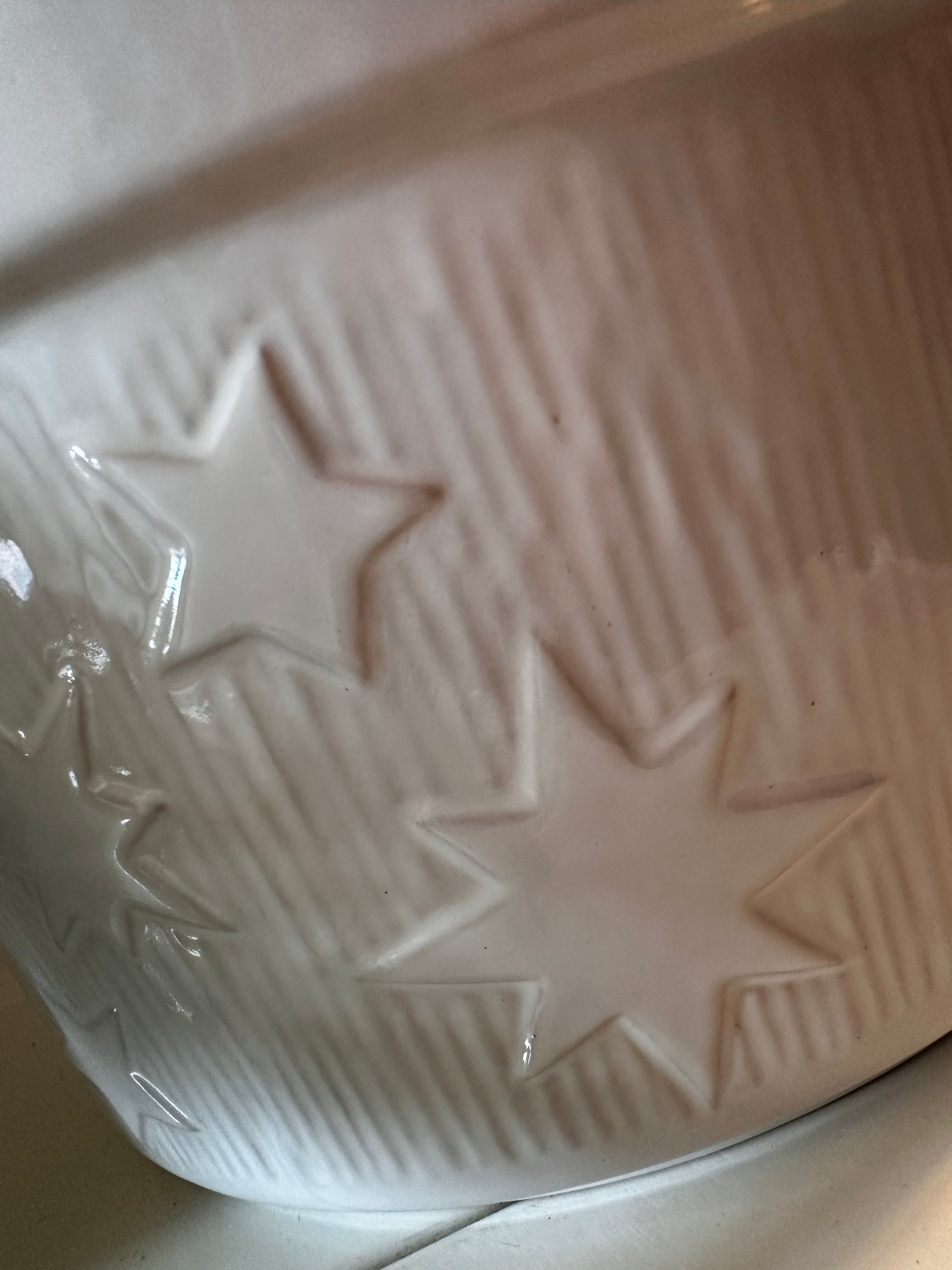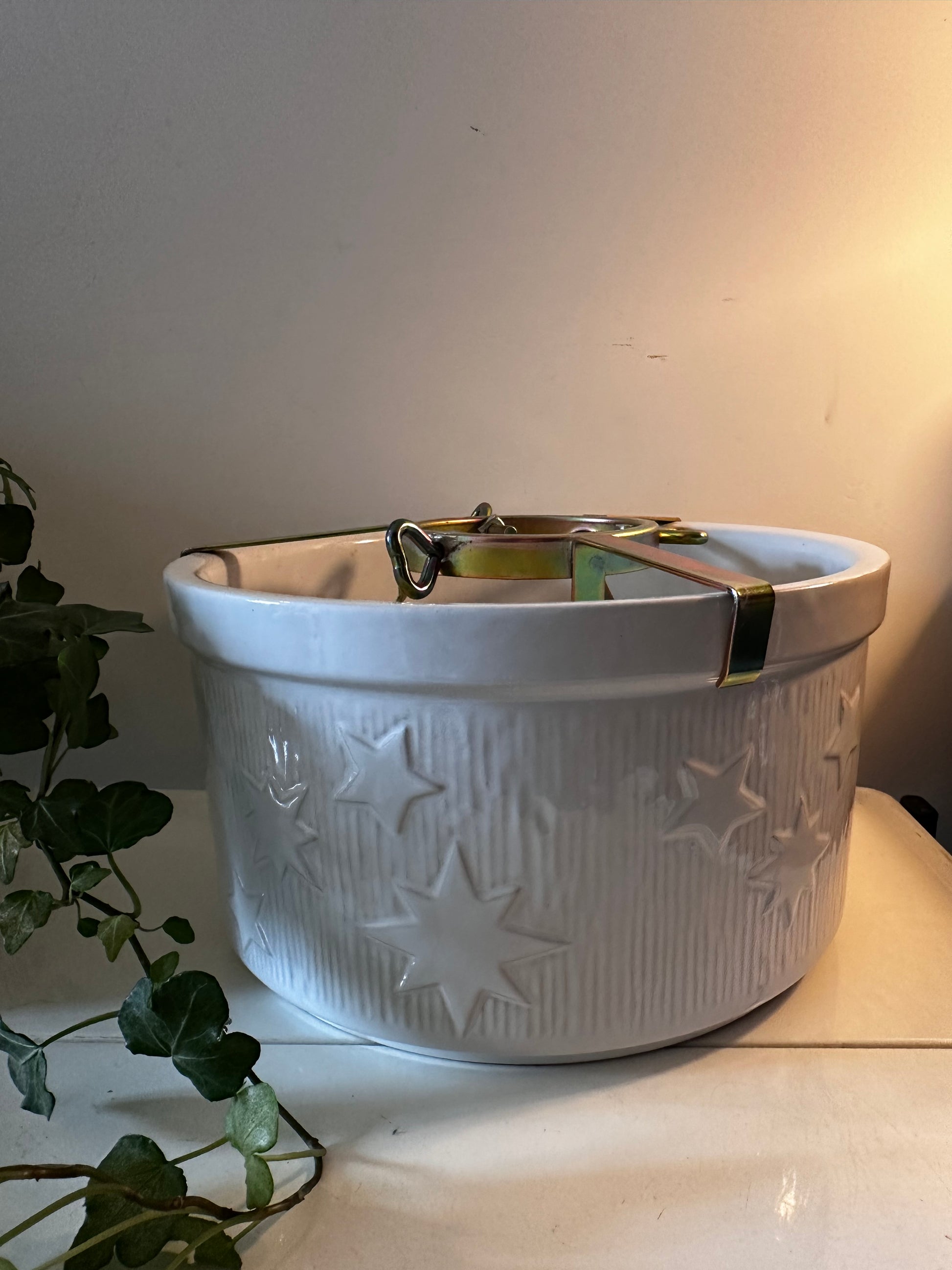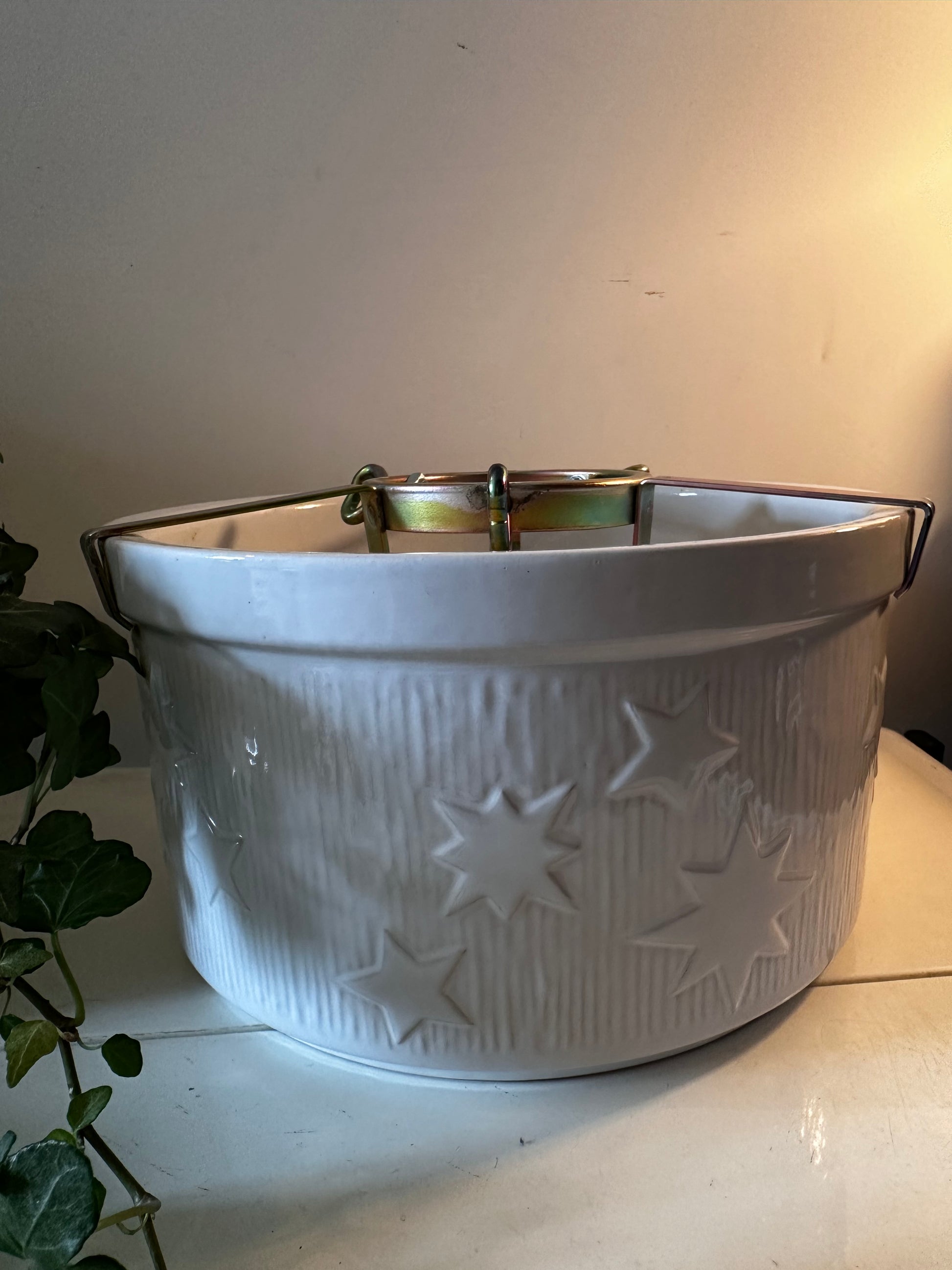 Je ziet ze vaak in het groen maar dit een een pracht van een witte kerstboom standaard. Hij is van West Germany keramiek en in een supermooie vintage staat. Standaard heeft een design van sterren. De standaard is gemerkt onder.