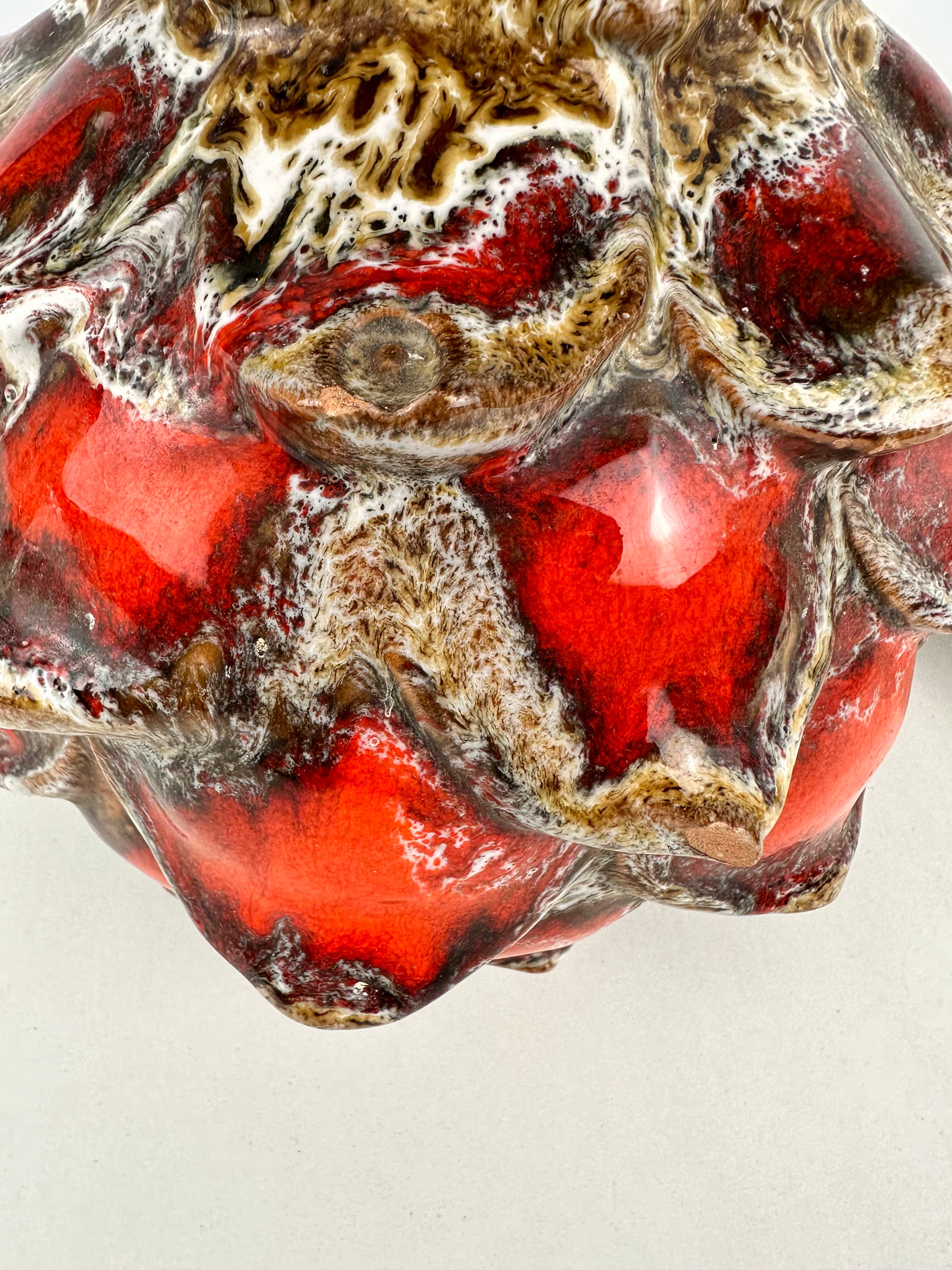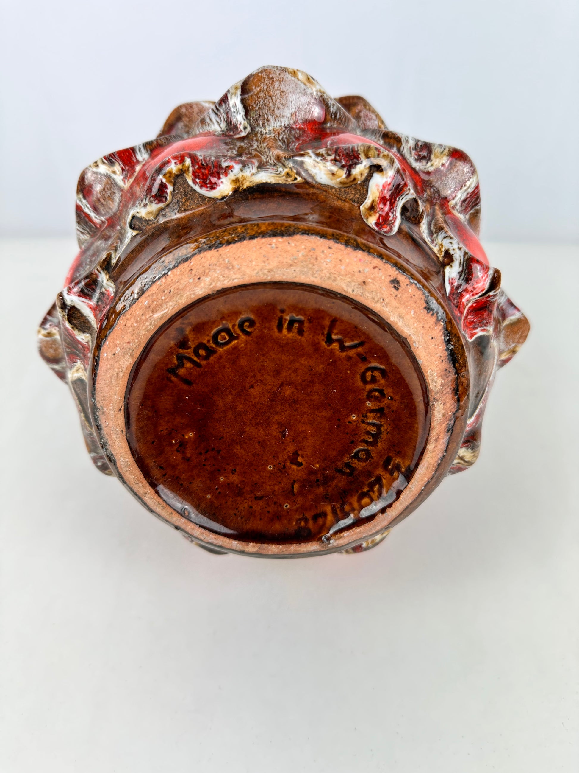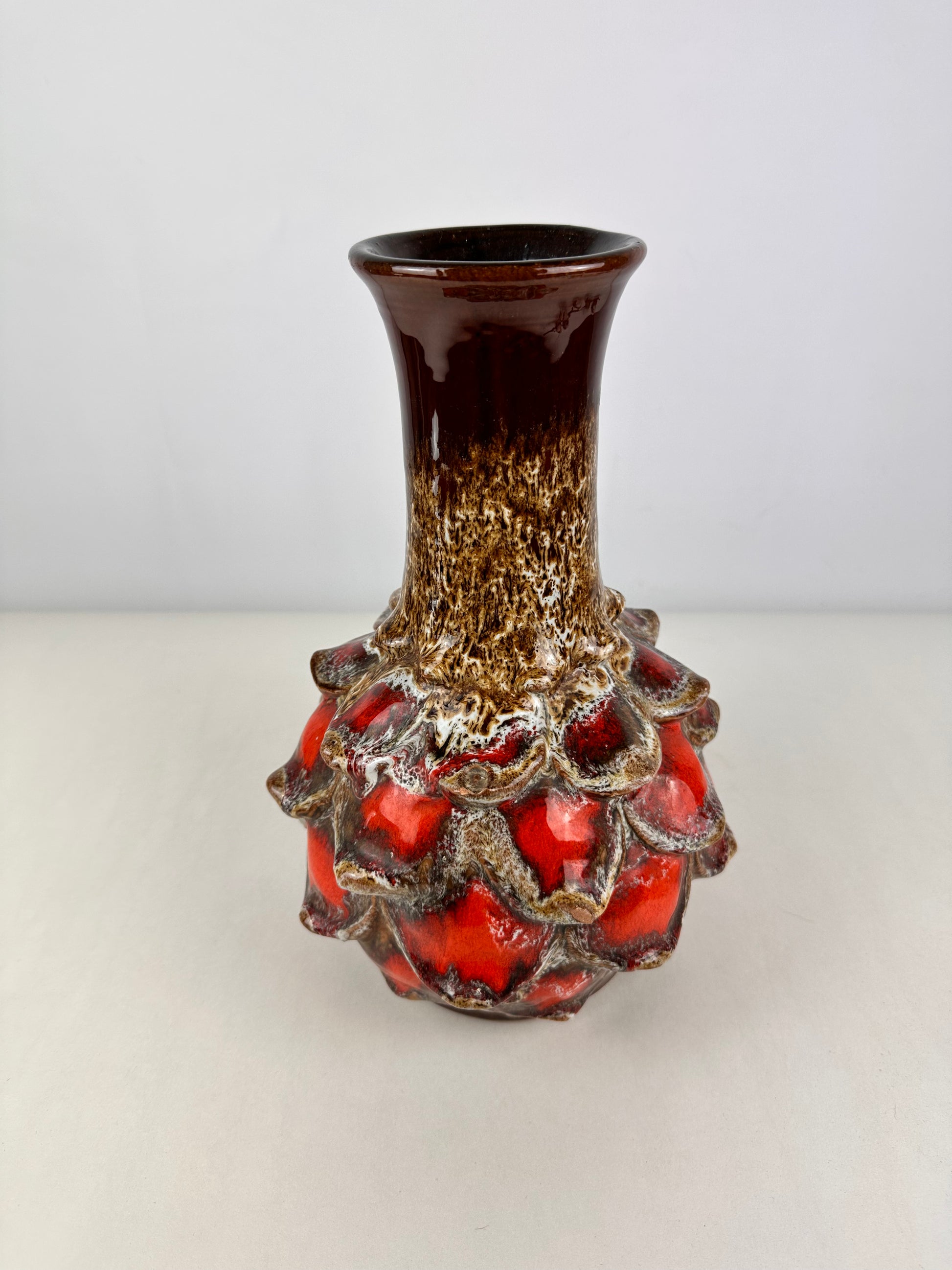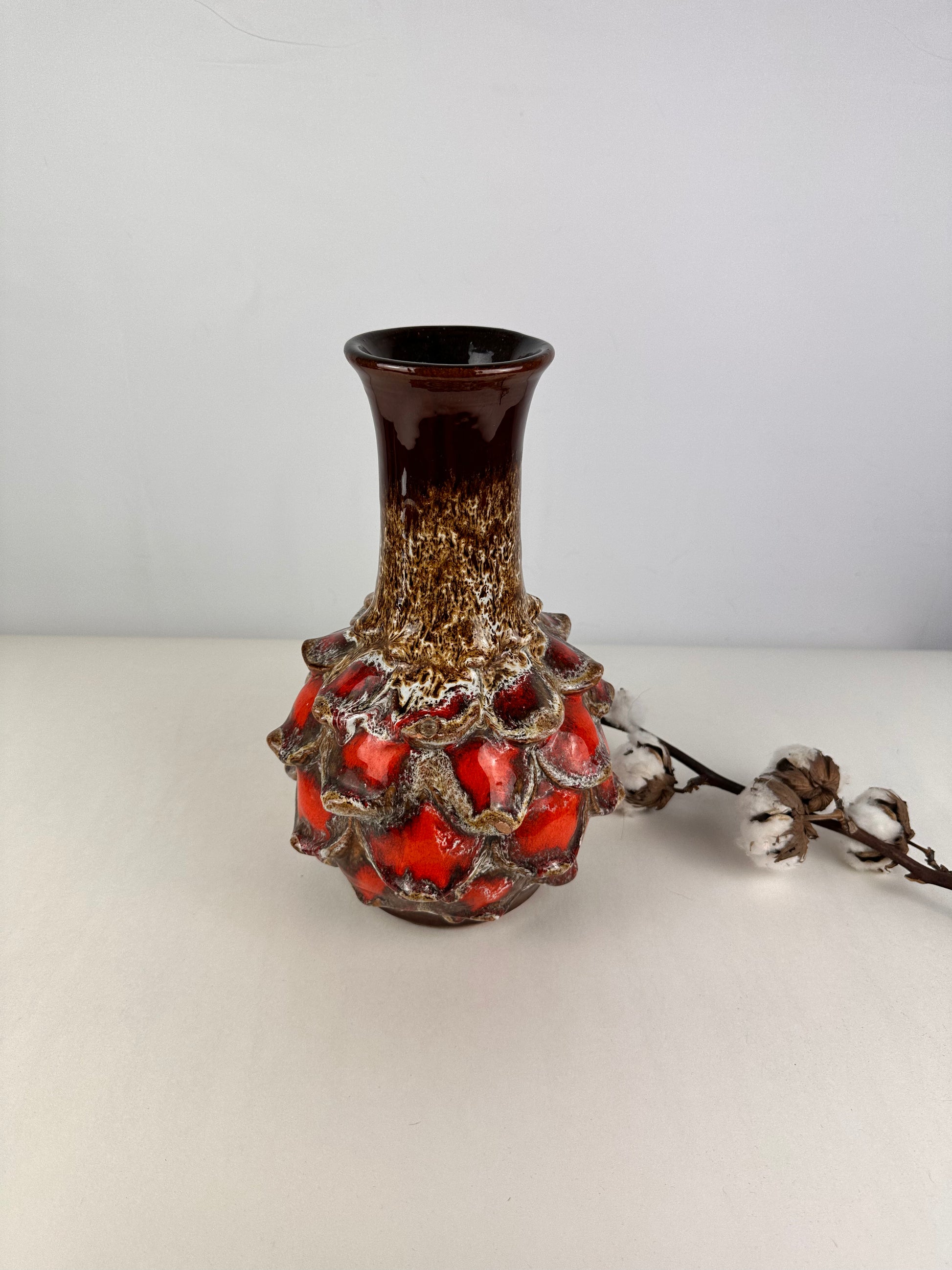 Wat een bijzondere West Germany vaas. Echt een hele aparte in een mooie vintage staat. 1 klein chipje aan de rand en wat bij de schubbetjes (niet duidelijk zichtbaar), zie foto. Gemerkt aan de onderkant. Gefabriceerd in Duitsland rand de jaren ‘70. Geschubd uiterlijk met mooie oranje bruine kleuren
