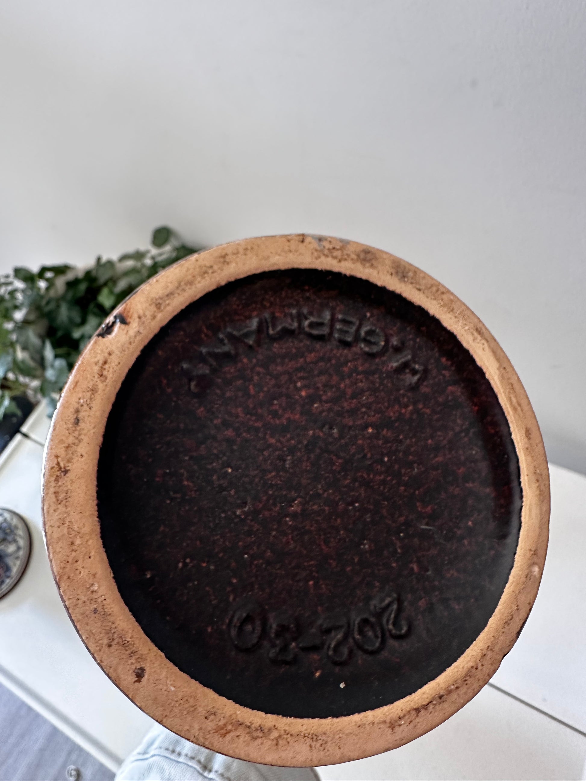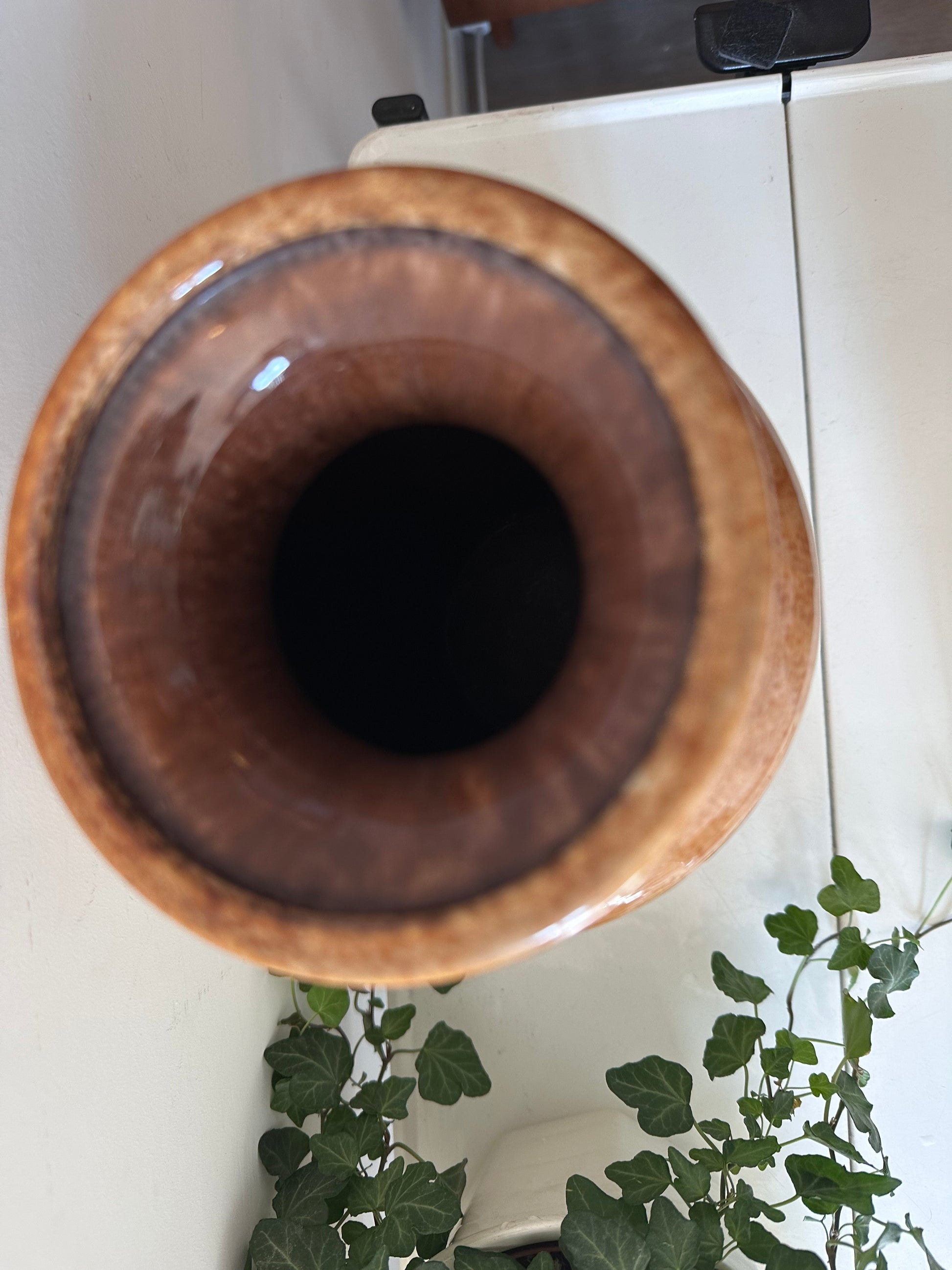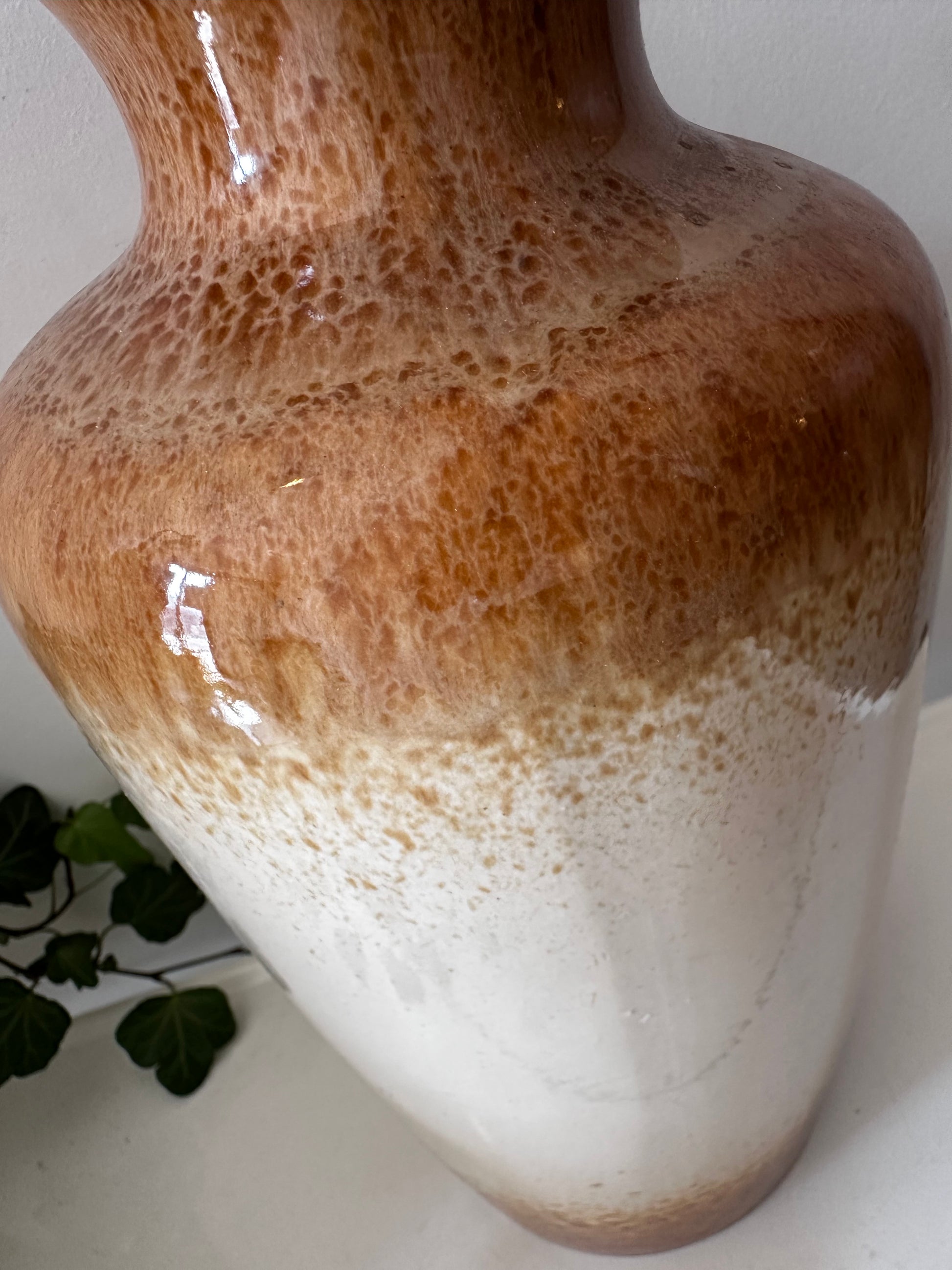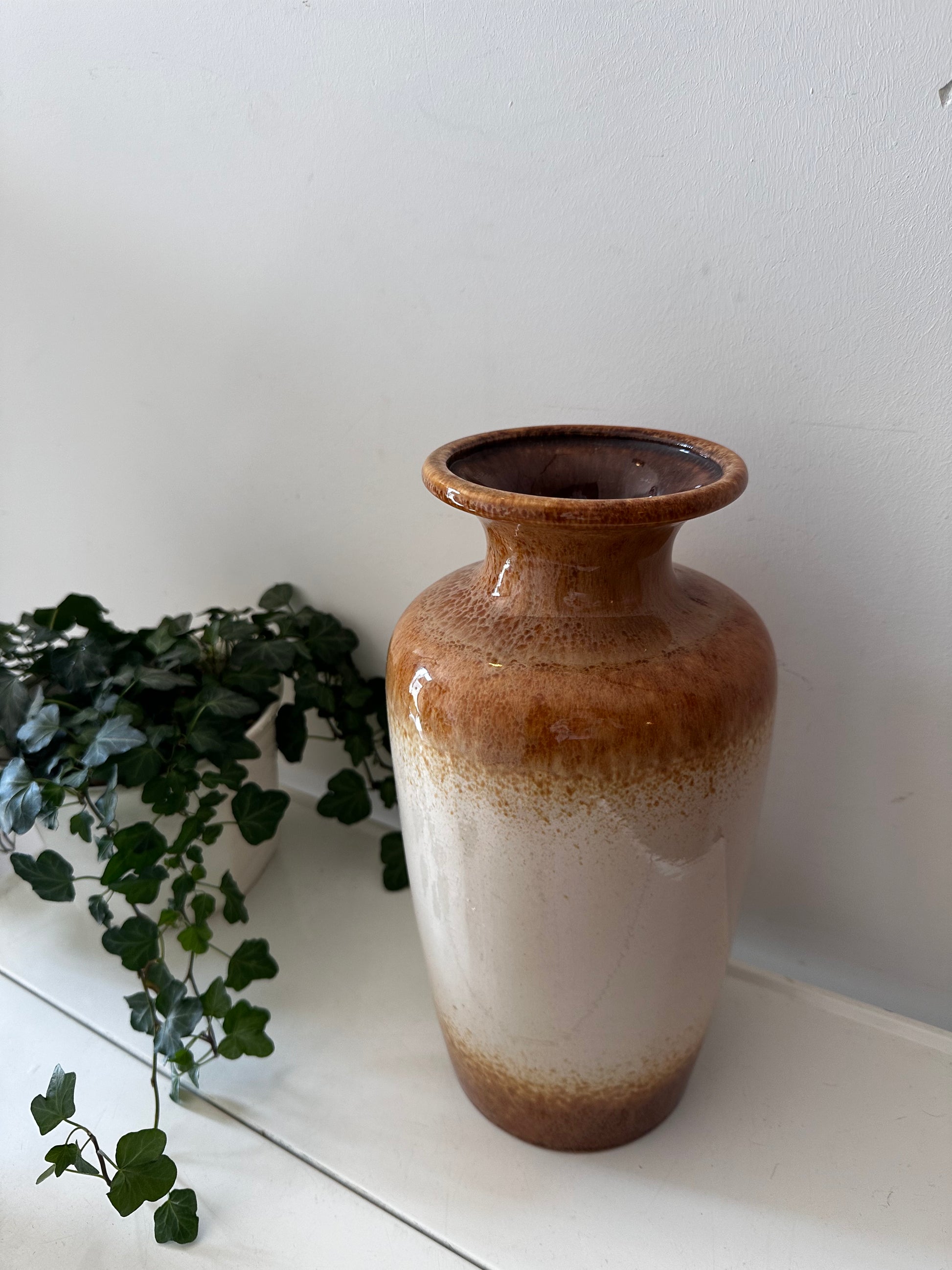 Top vintage vaas uit West Germany met een prachtig kleurverloop van warm bruin naar crème. Gemaakt van keramiek in een slank model. Een supermooie vaas uit de jaren 70 gemerkt onder. Q804