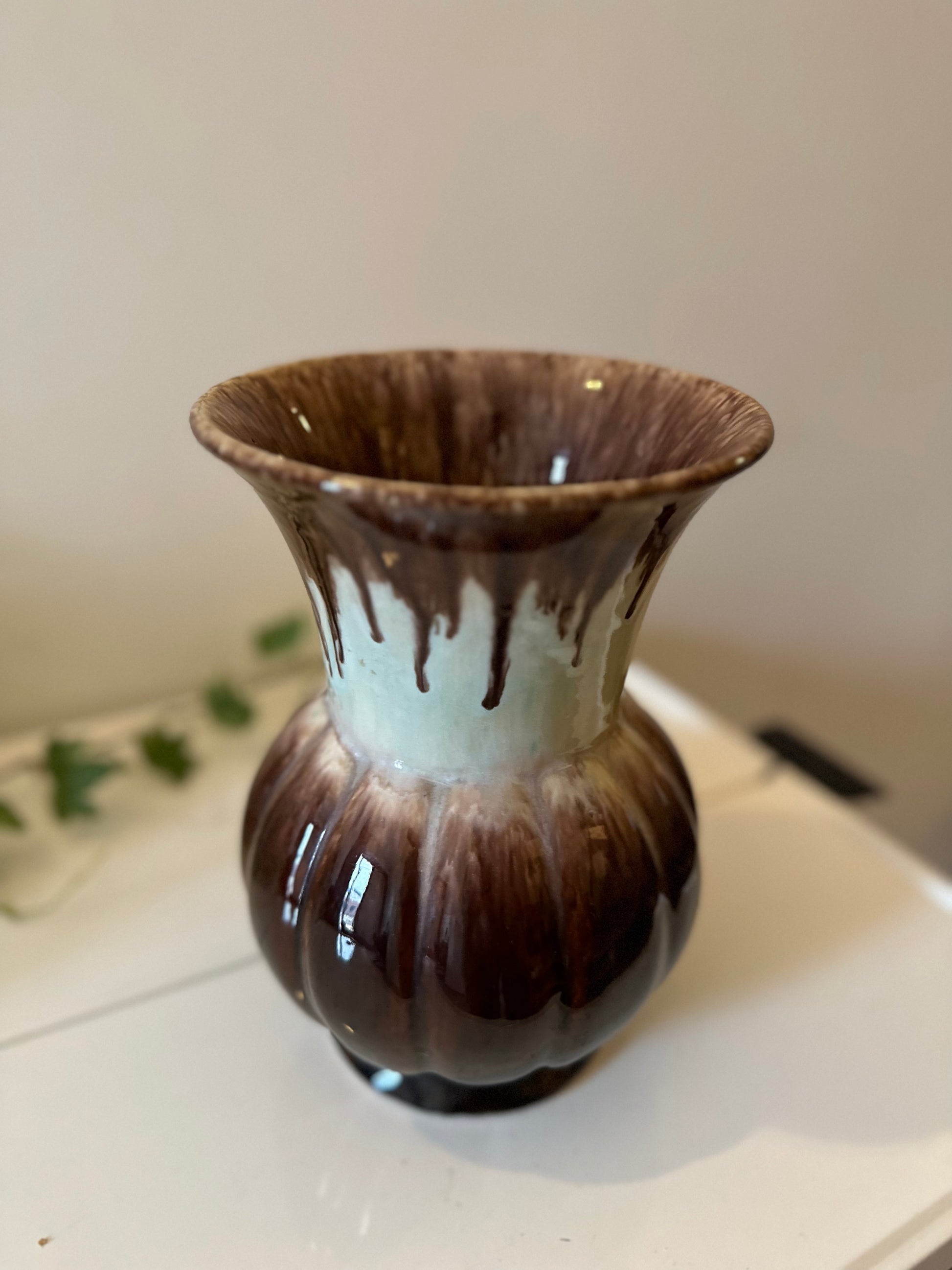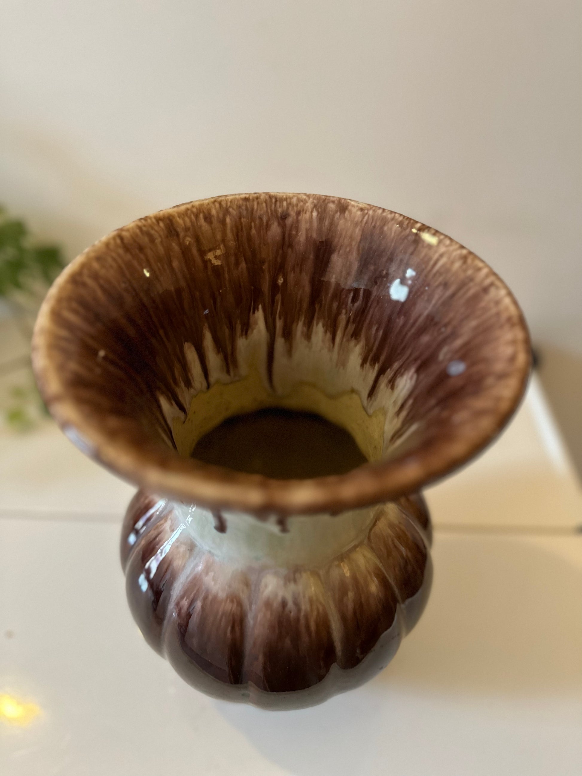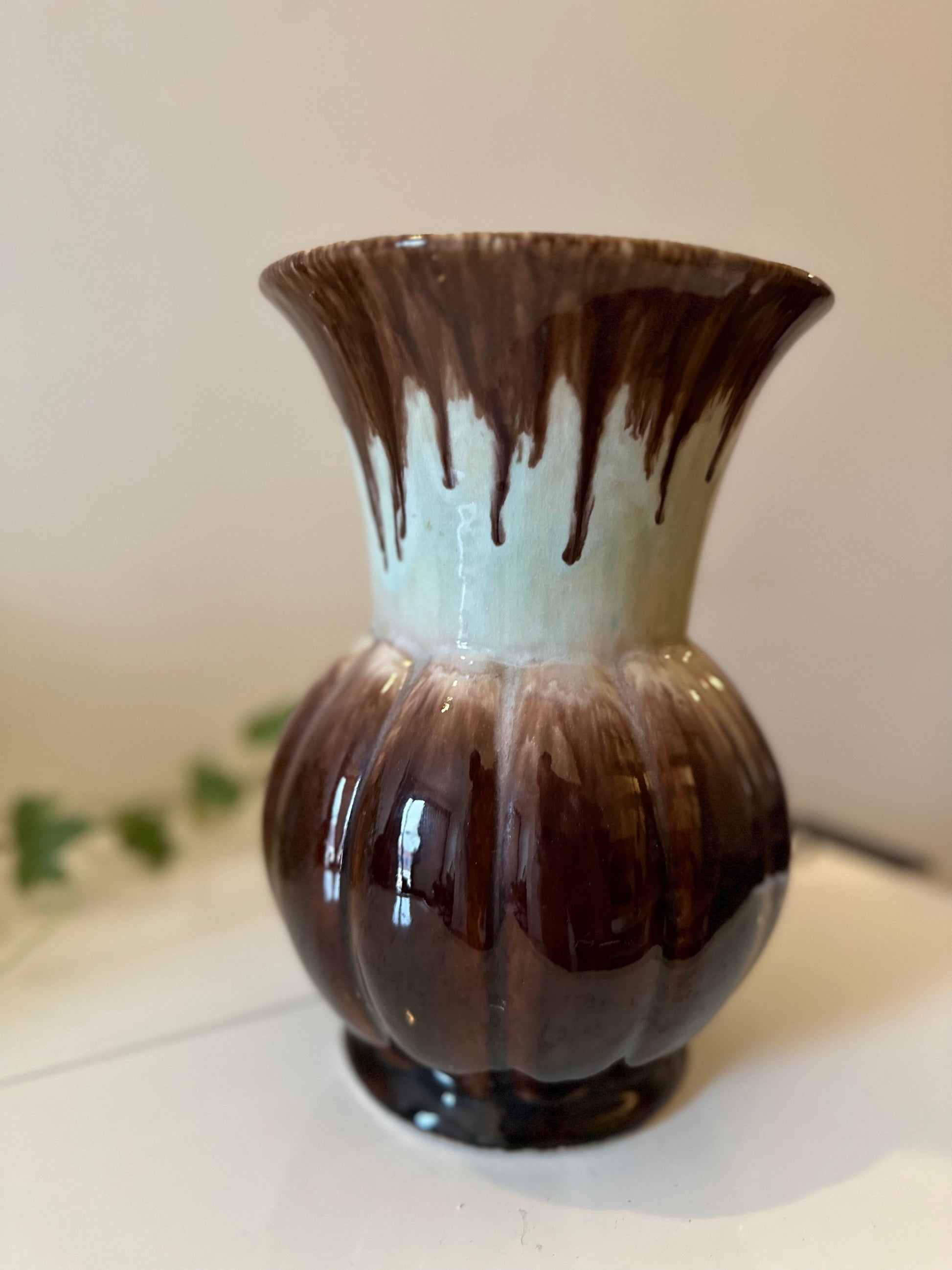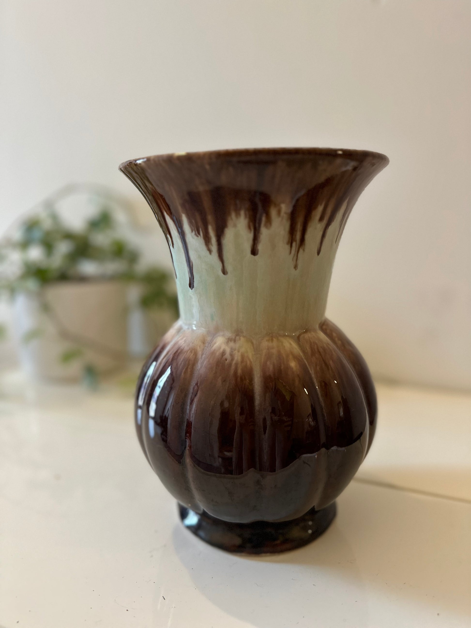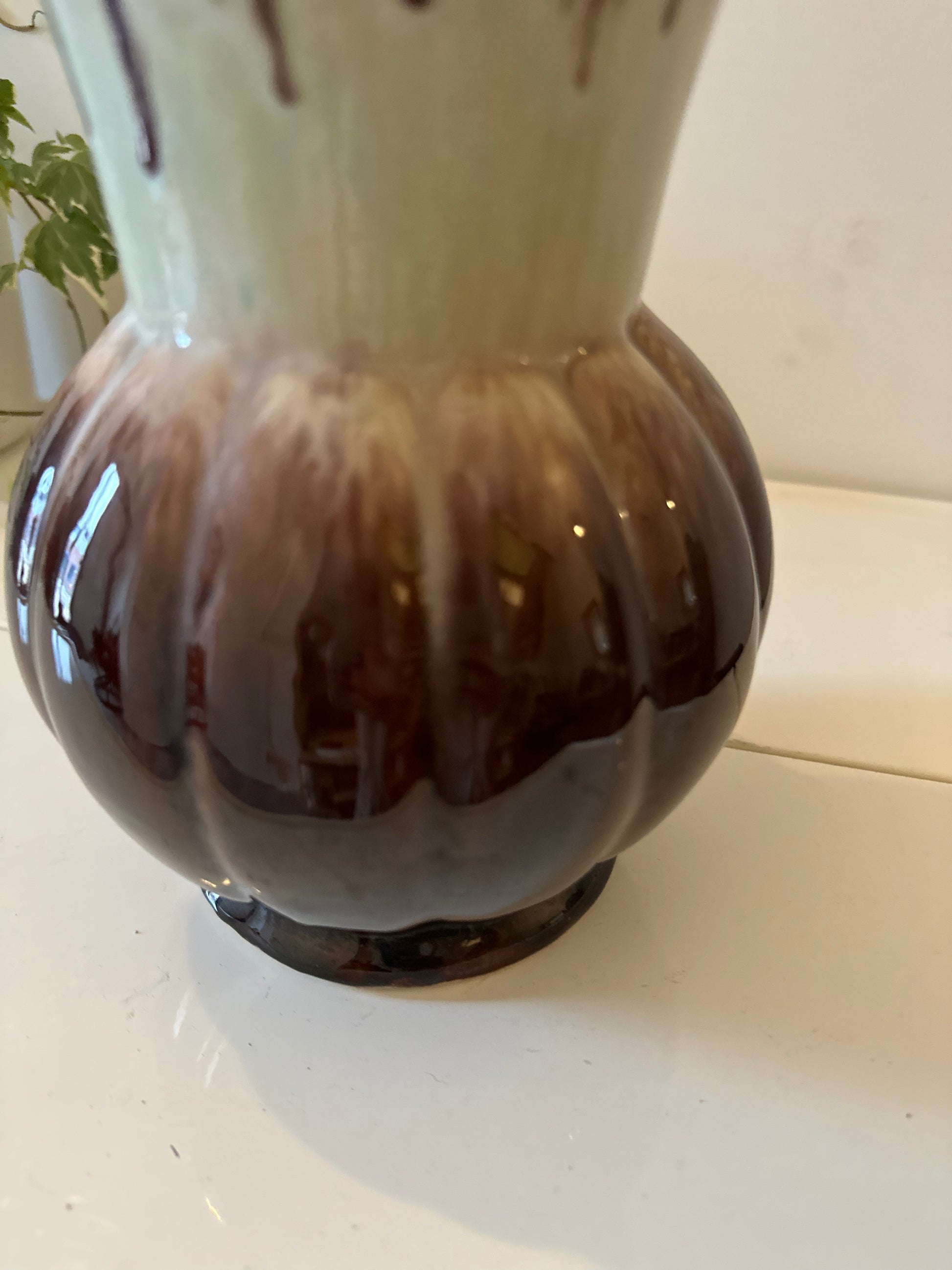 In een hele mooie vintage staat is deze West Germany vaas. Vaas is gemerkt onder. Prachtige bolvaas met uitlopende hals Bruin beige kleur met een “Druip” design.