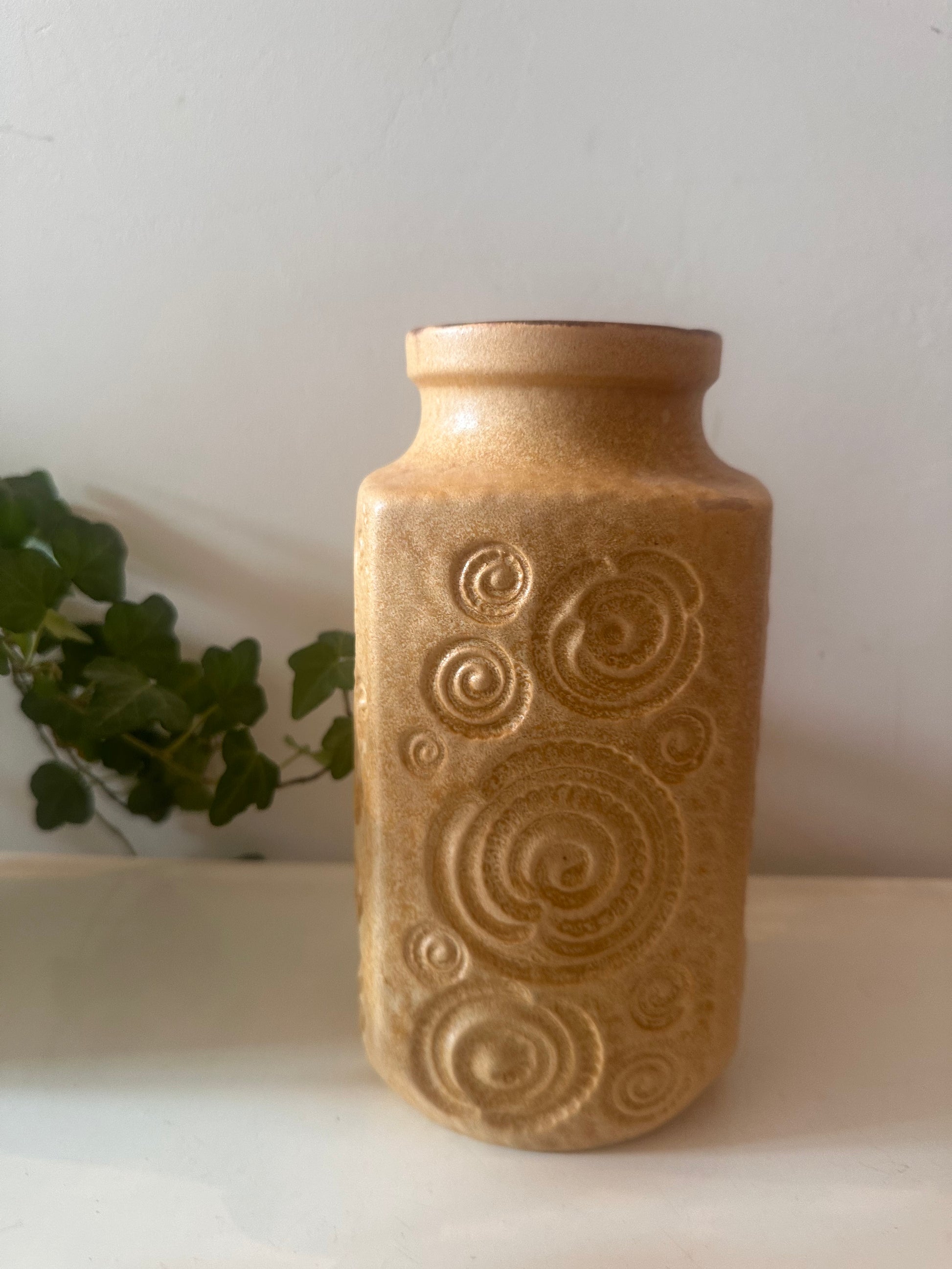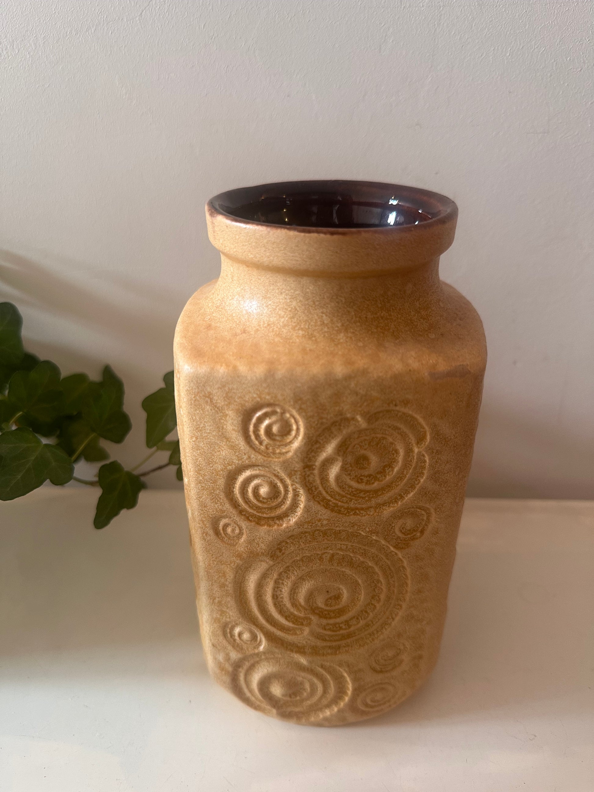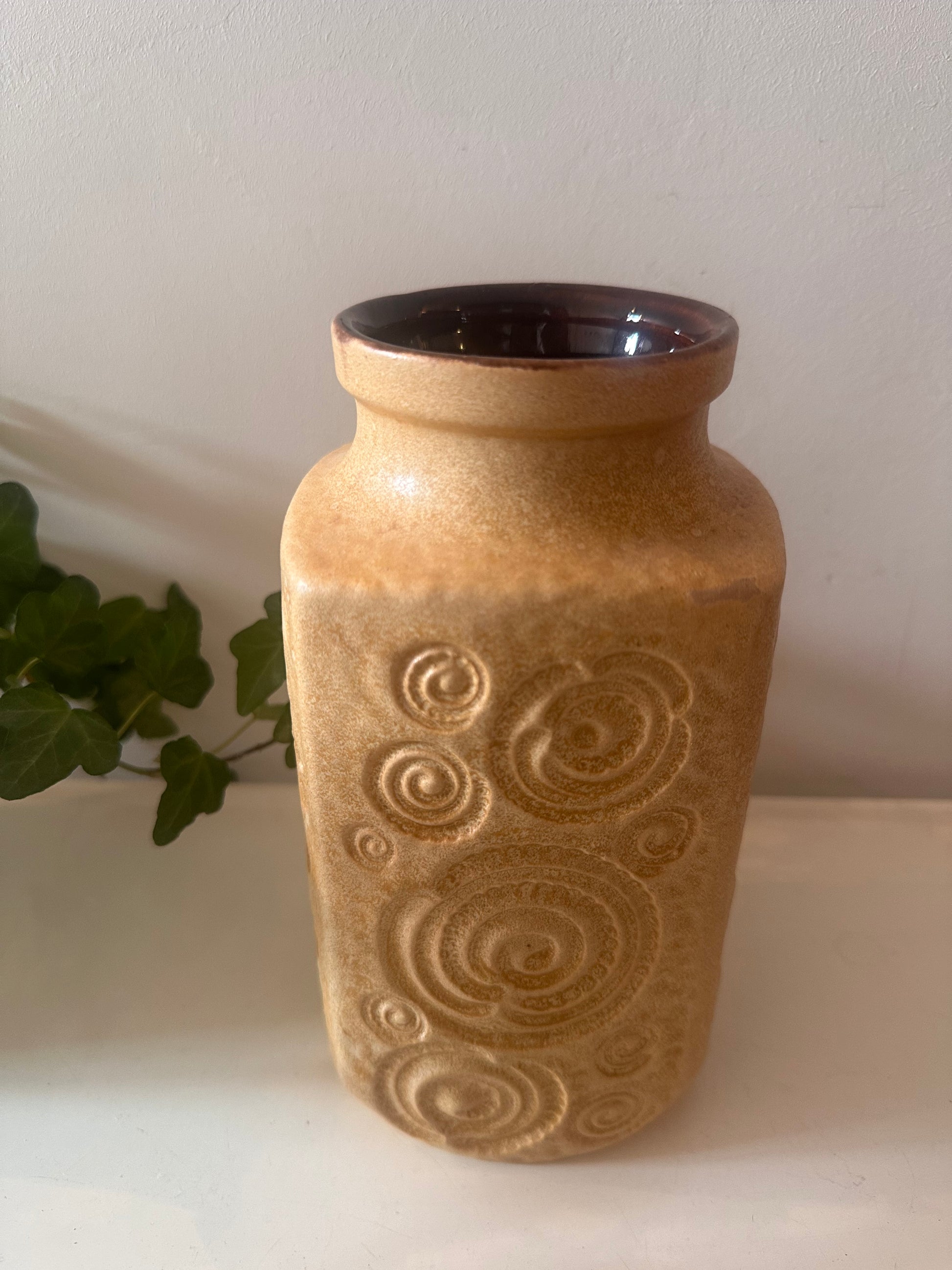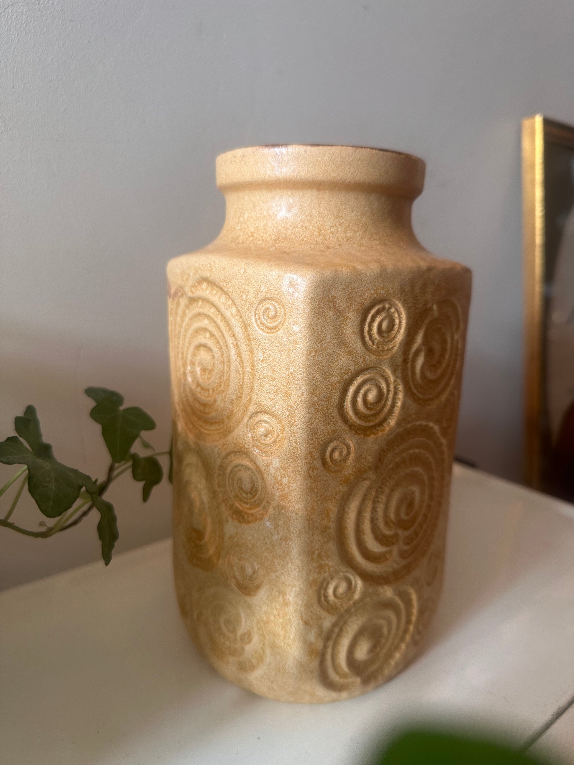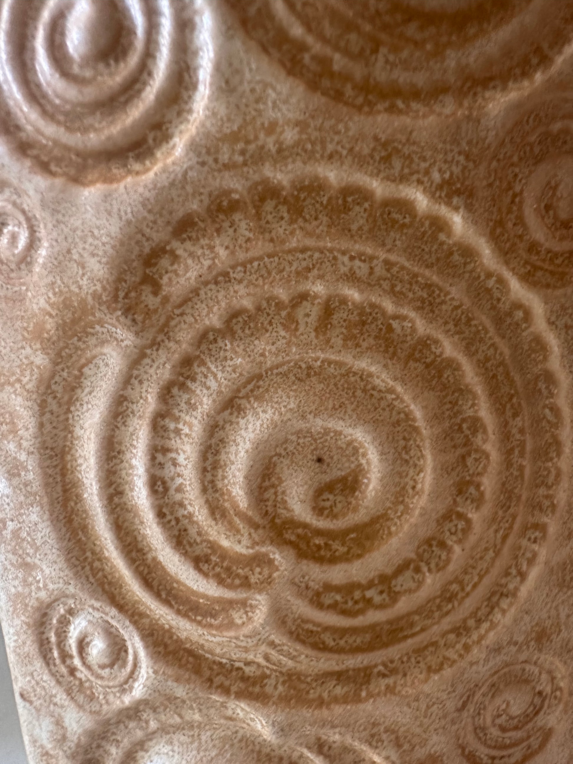 Deze zandkleurige vaas uit de jaren 70 is helemaal versierd met speelse swirl-patronen. Vierkant model met afgeronde hoeken en van binnen donker geglazuurd – precies dat soort detail dat ‘m extra leuk maakt. Q319