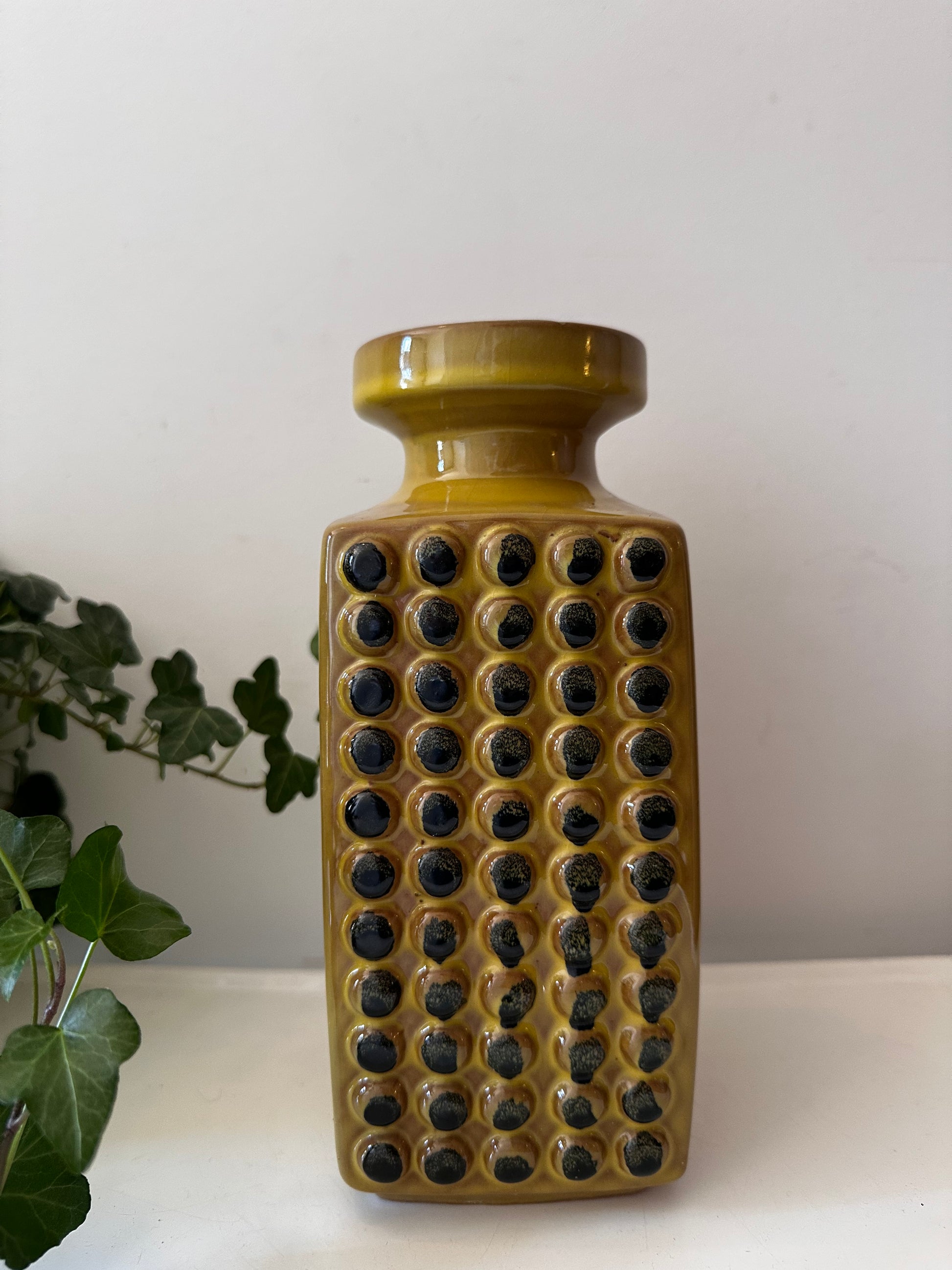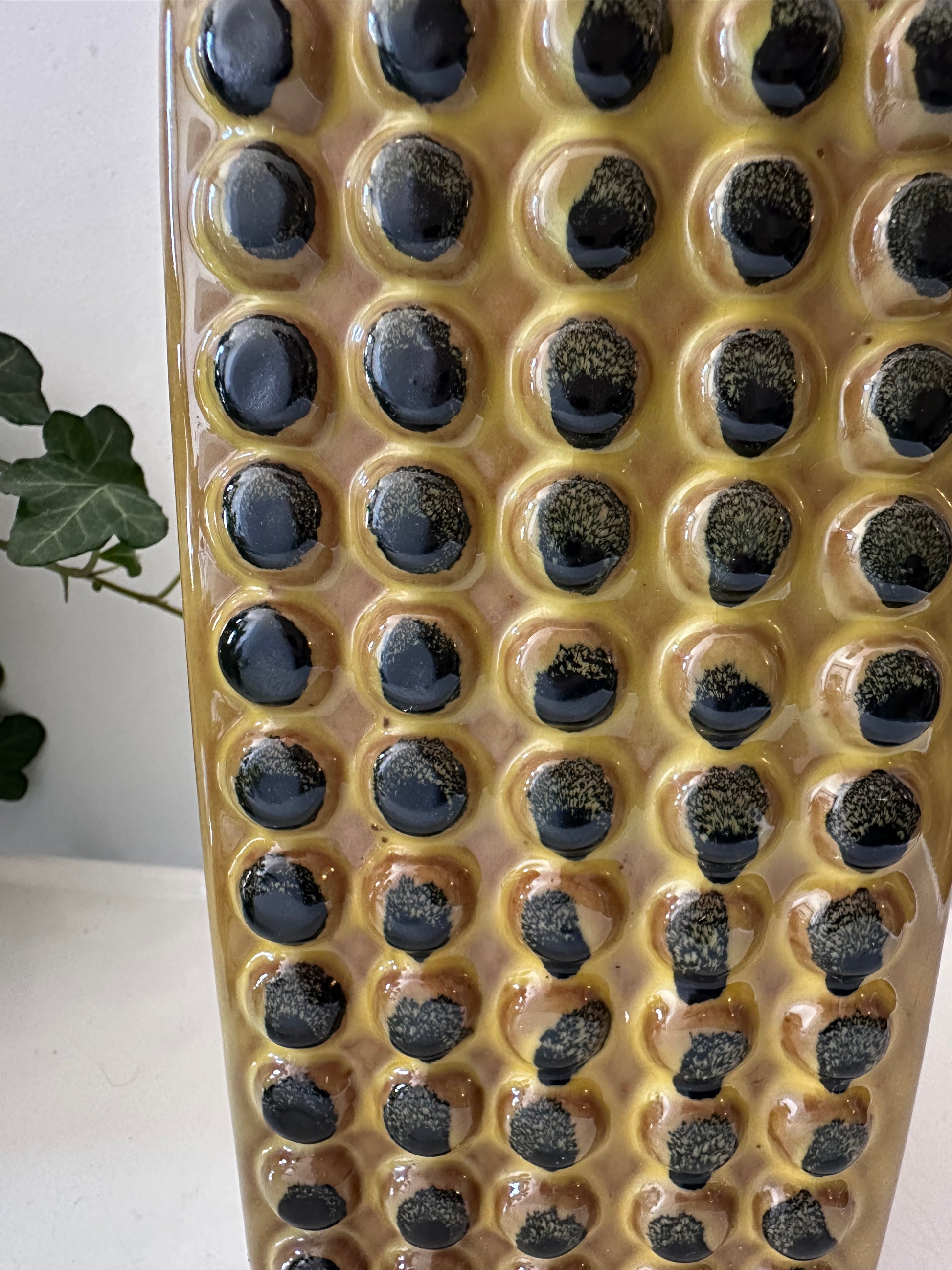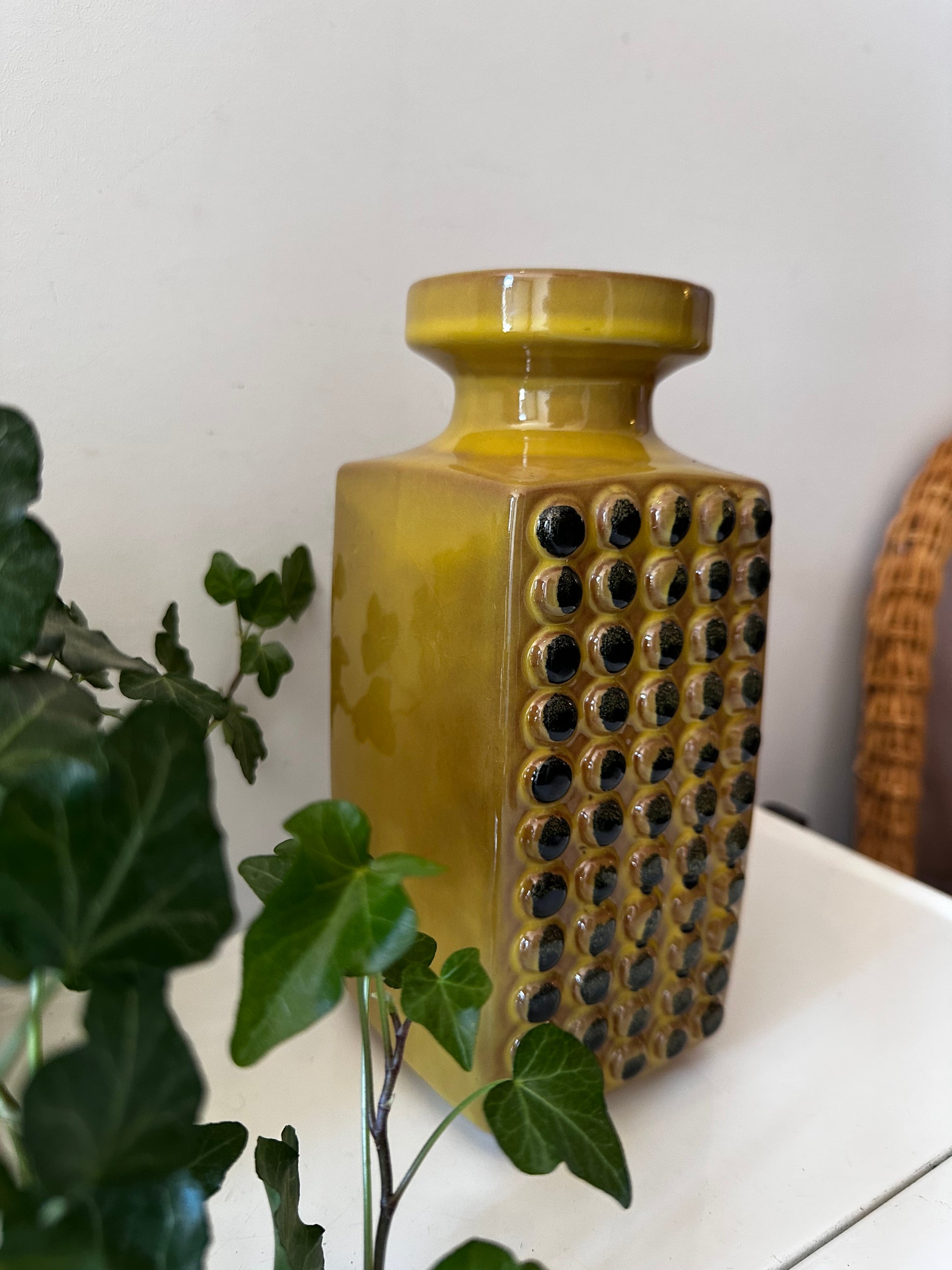 Stoere keramieken vaas uit de jaren ’70 met dat kenmerkende reliëf en warme mosterdgele kleur. De zwarte bolletjes geven ‘m een eigenzinnige, grafische touch. Q881