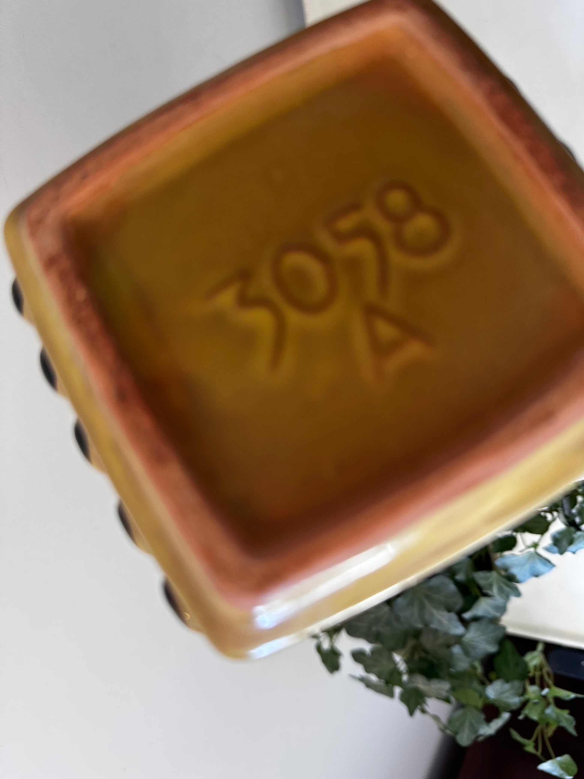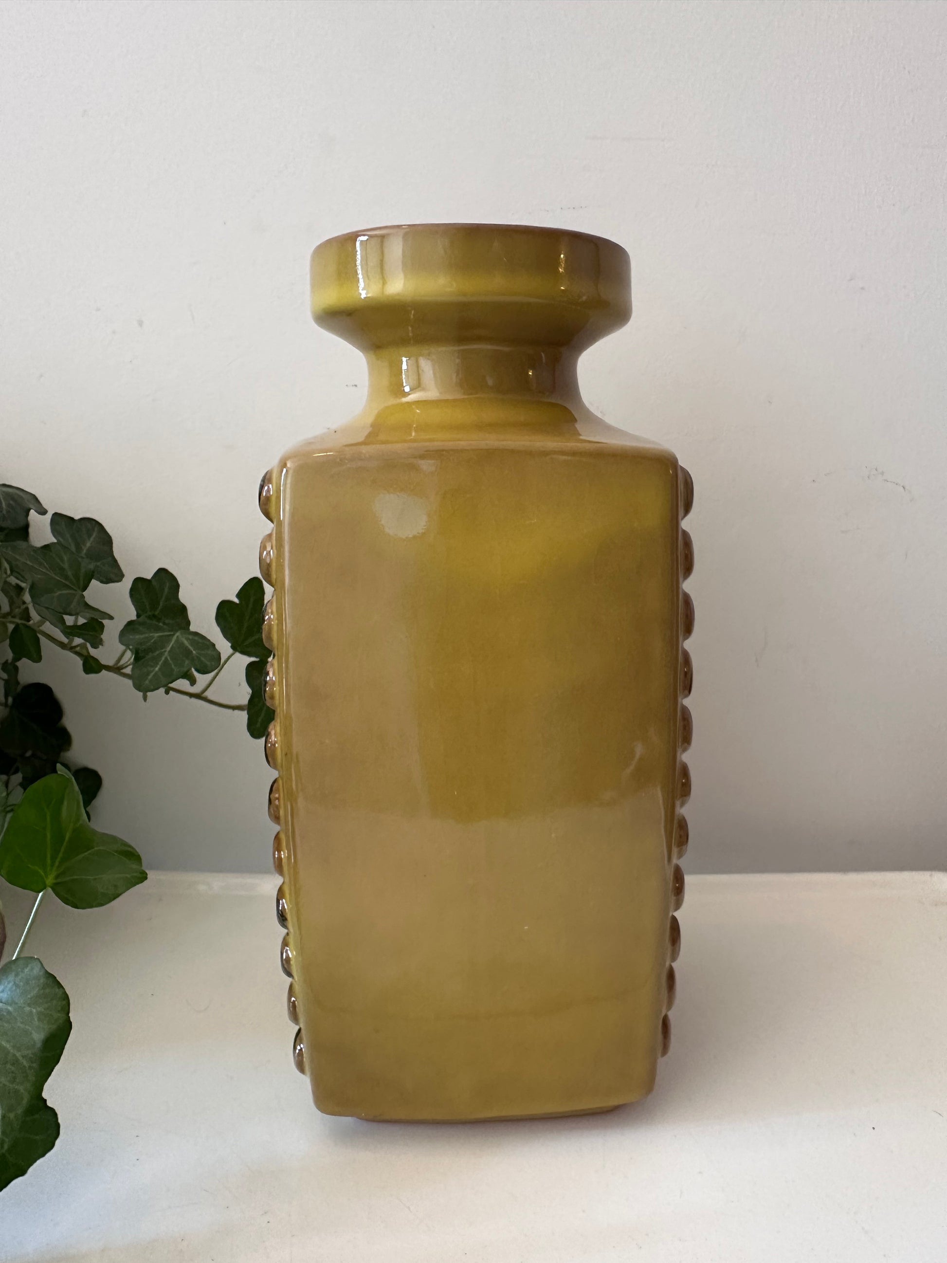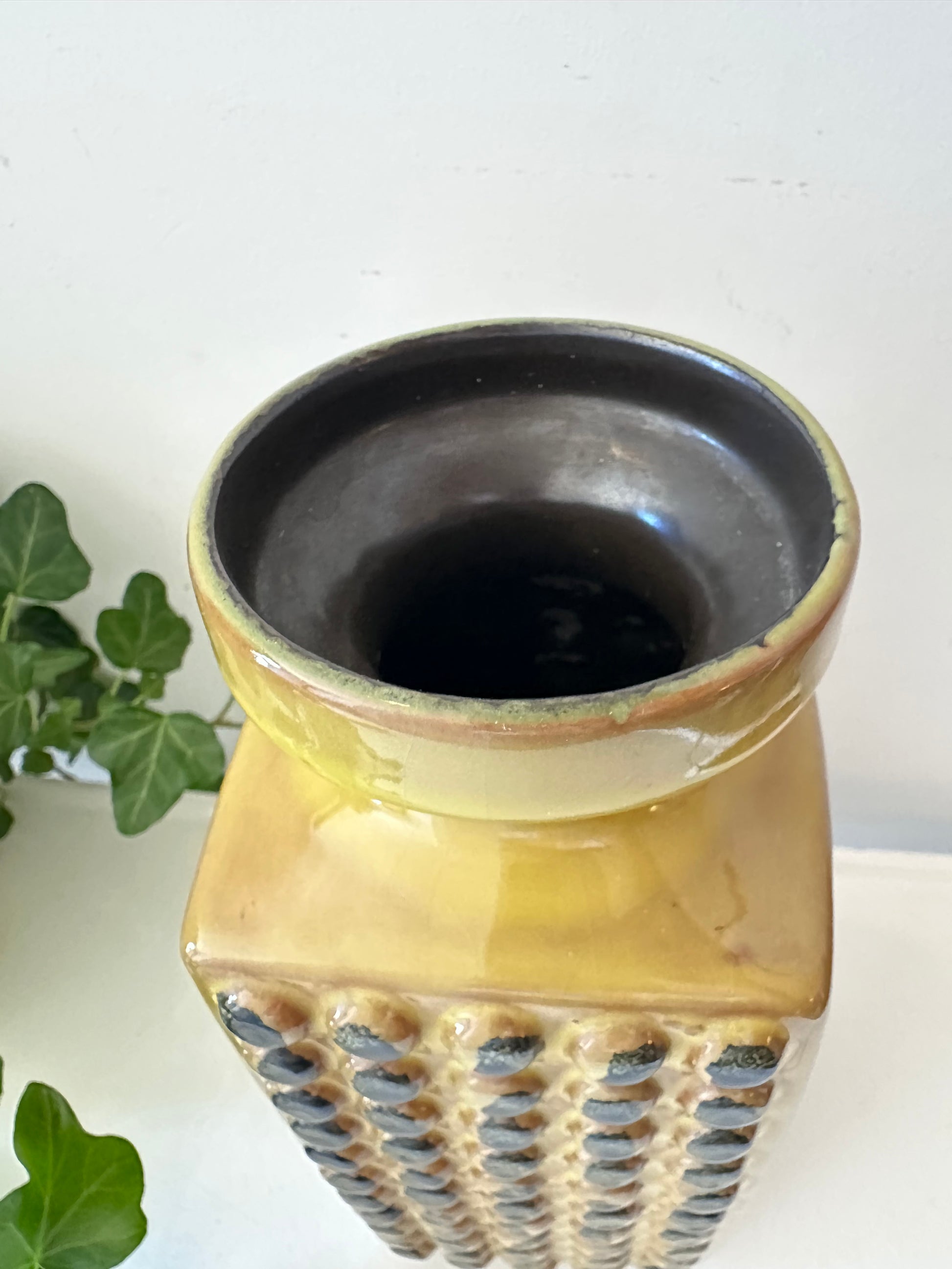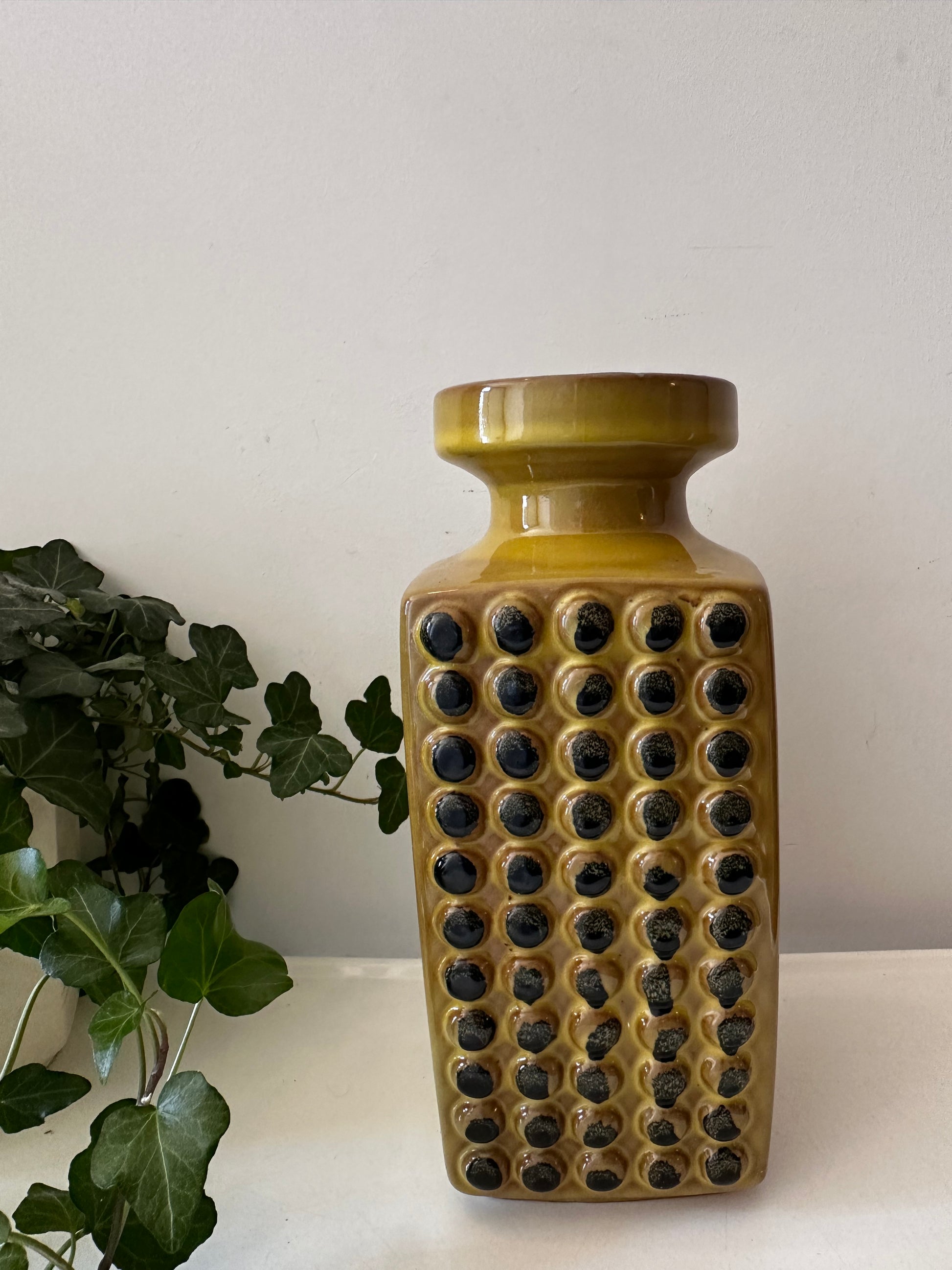 Stoere keramieken vaas uit de jaren ’70 met dat kenmerkende reliëf en warme mosterdgele kleur. De zwarte bolletjes geven ‘m een eigenzinnige, grafische touch. Q881