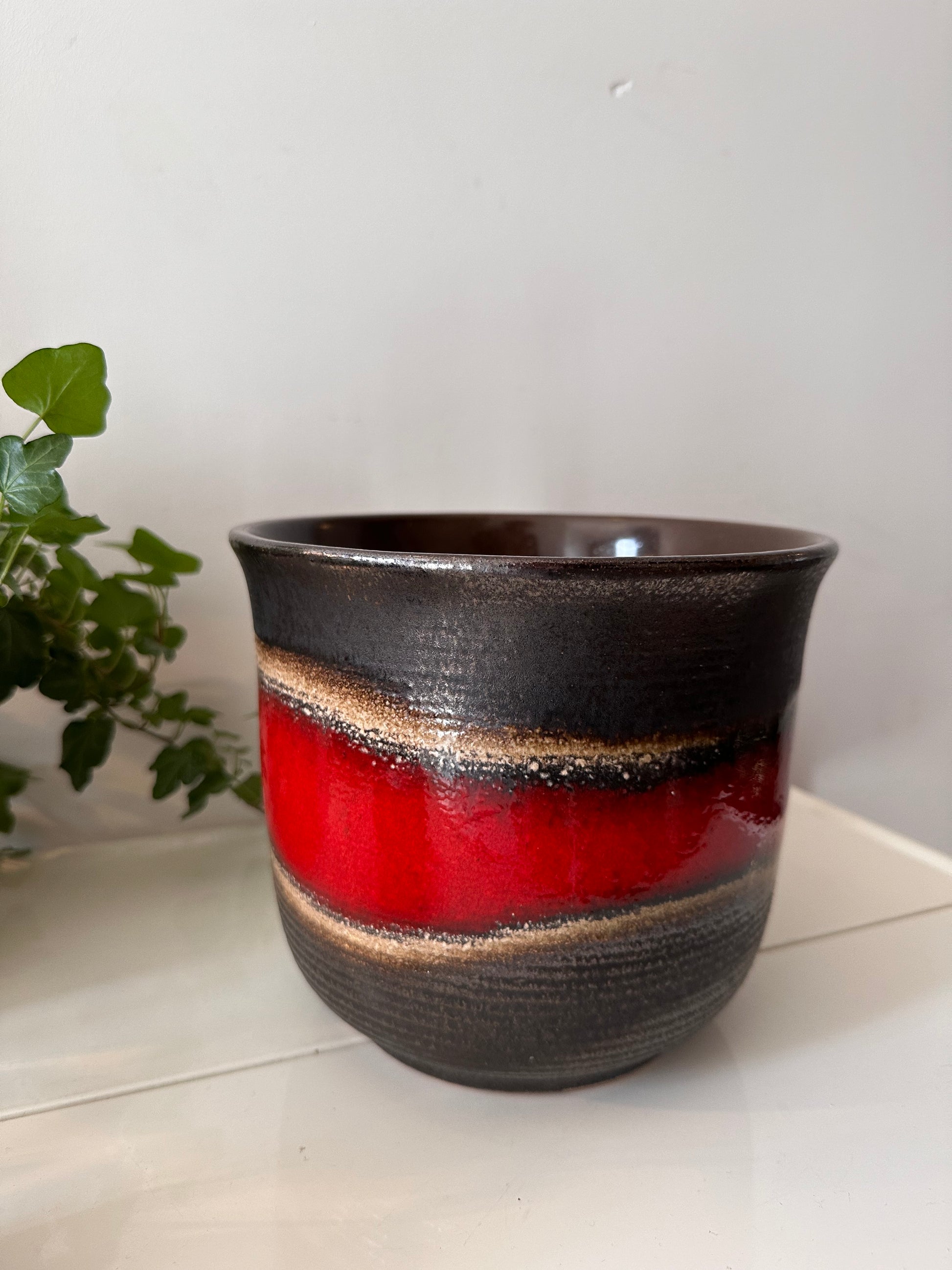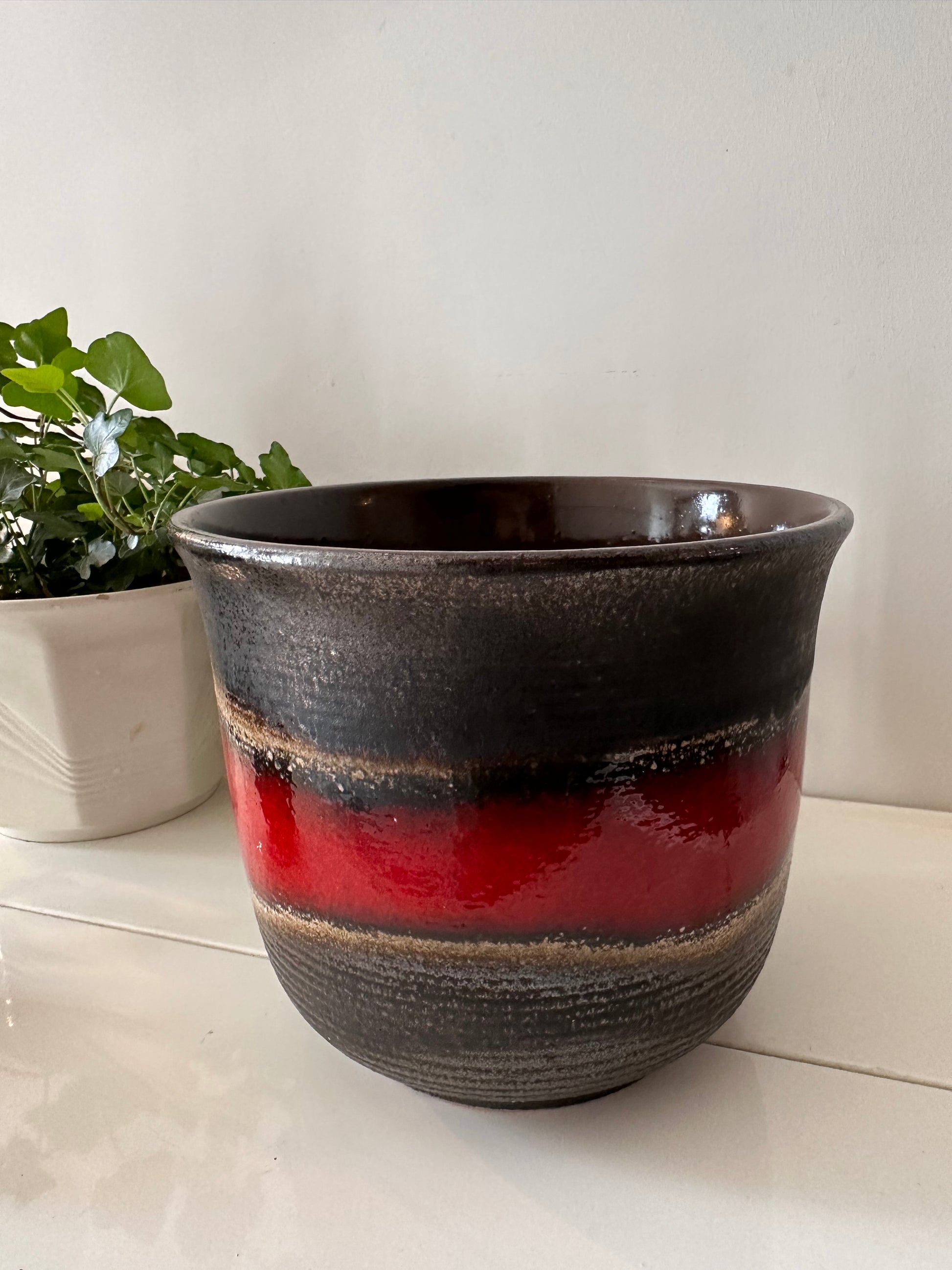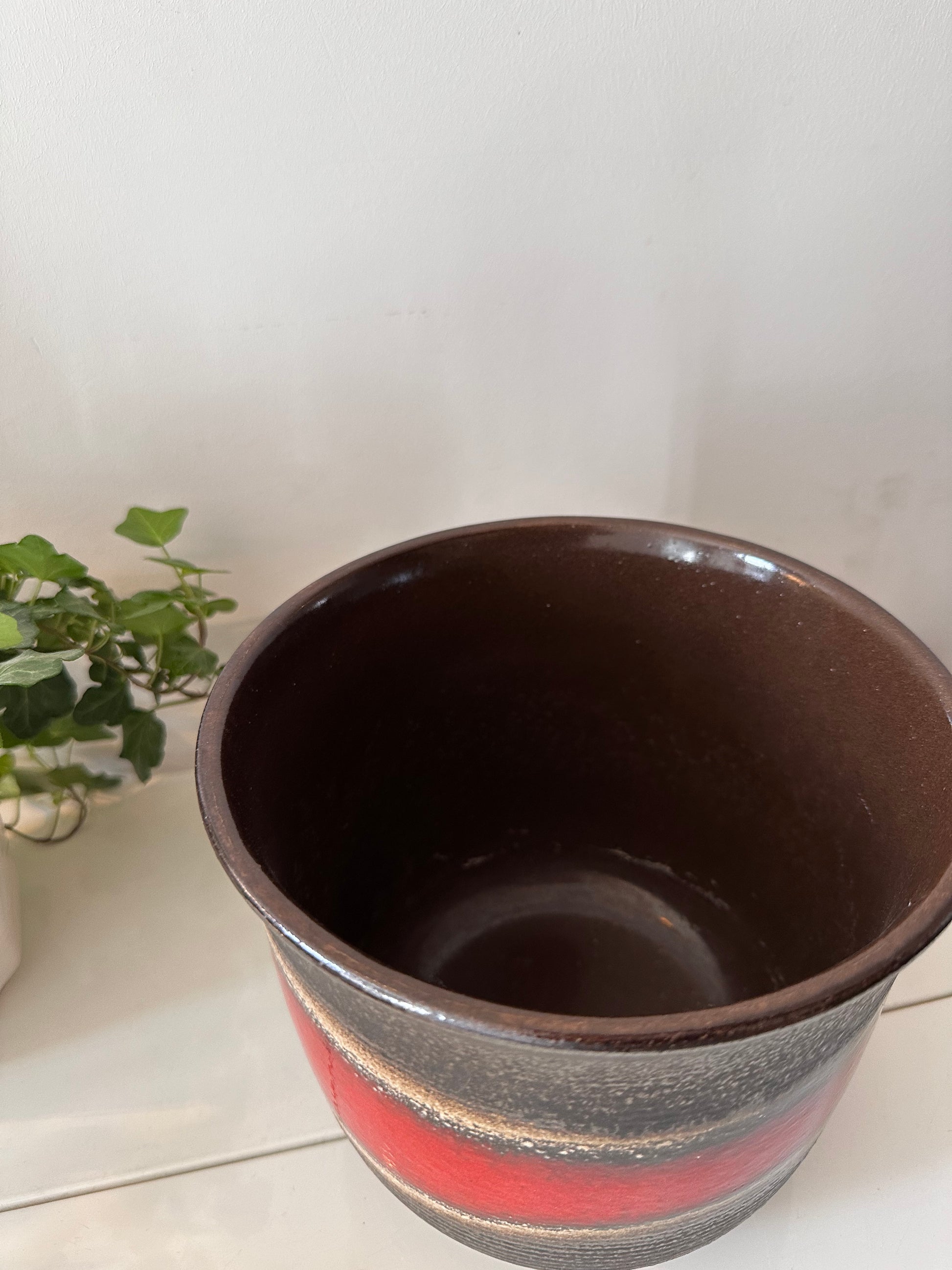 Lekker retro jaren 79 deze geweldige West Germany keramieken bloempot. Hij is nog super mooi en gemerkt onder . Mooie bruin tinten met een rode rand .