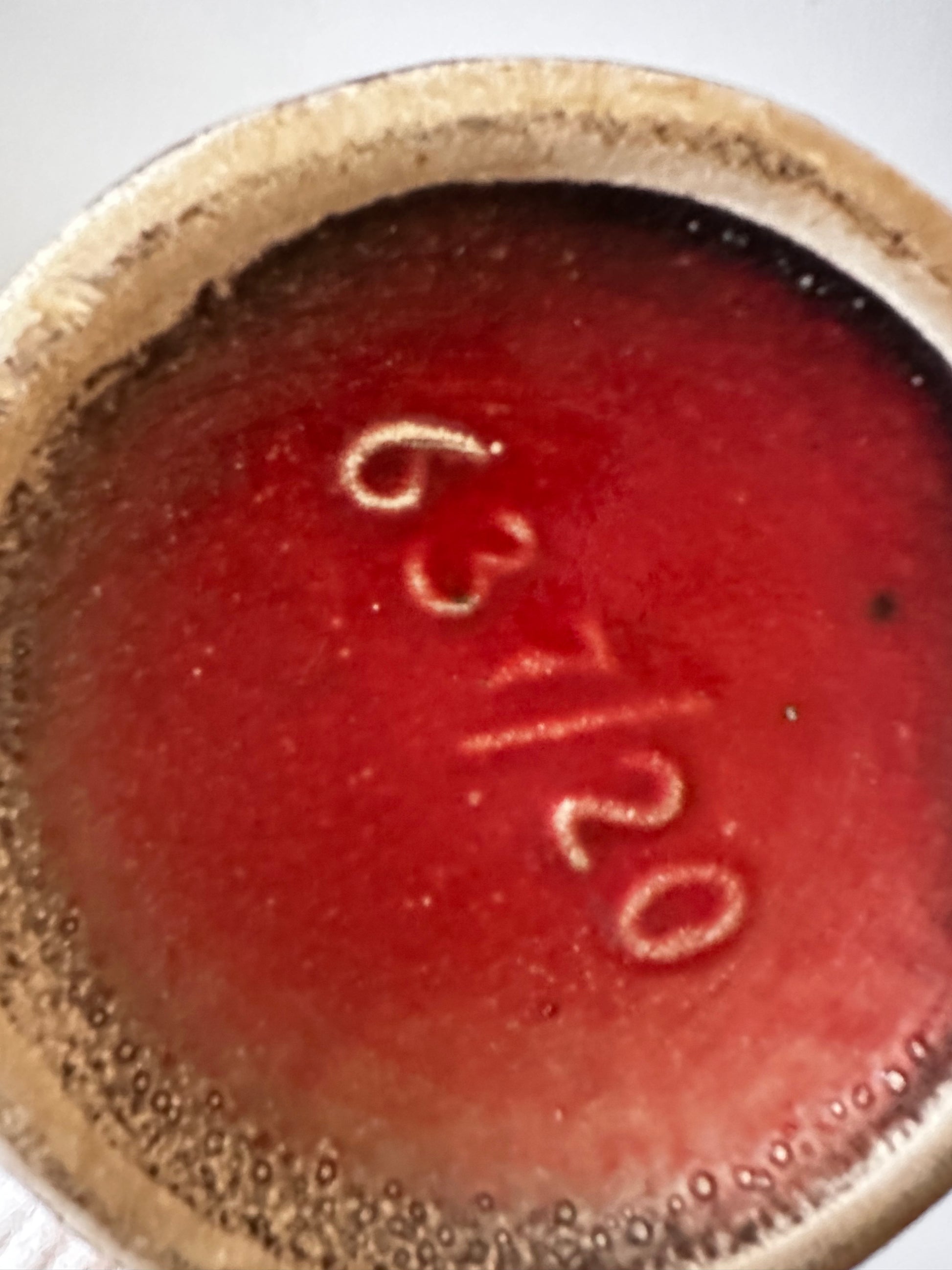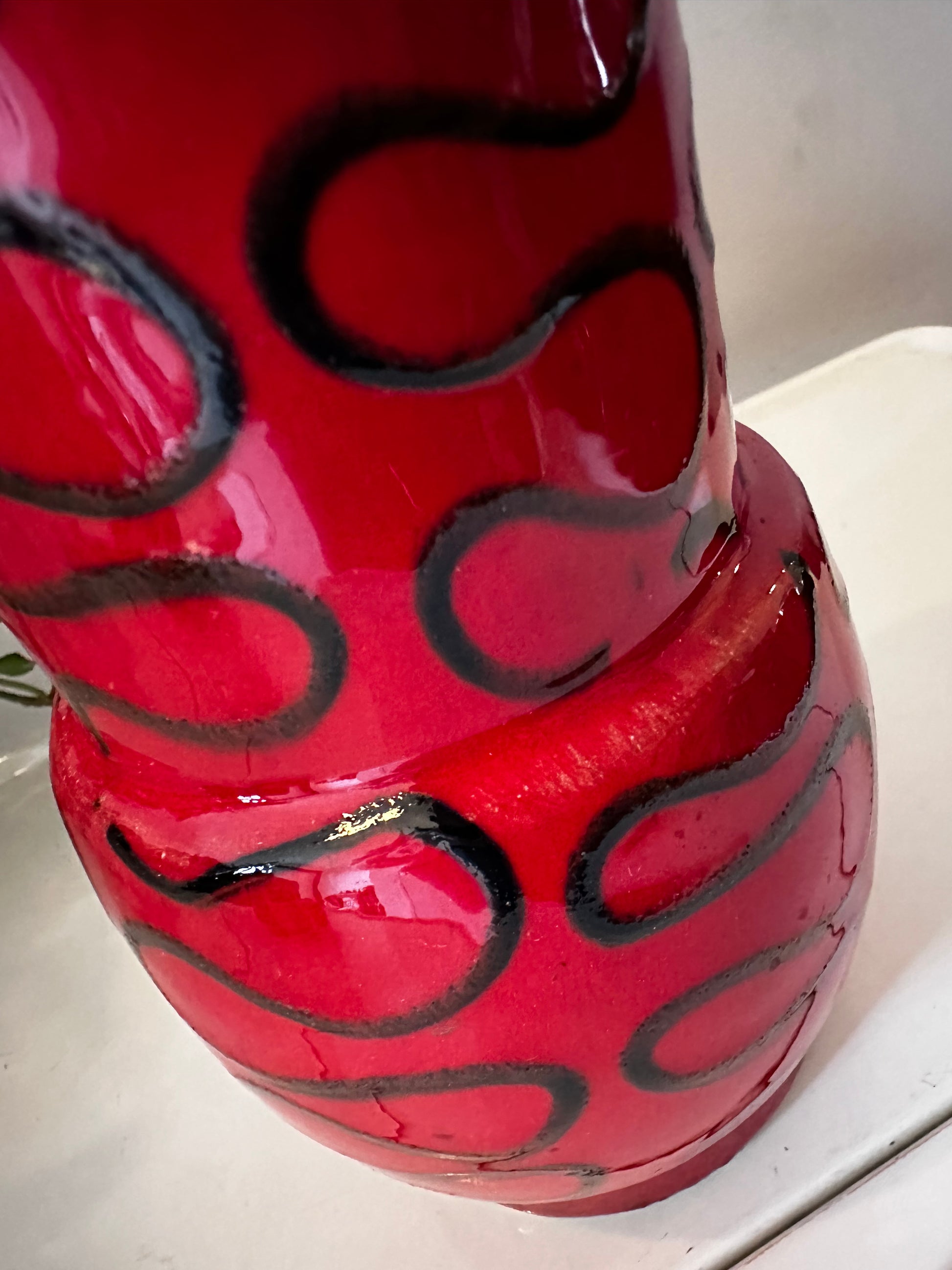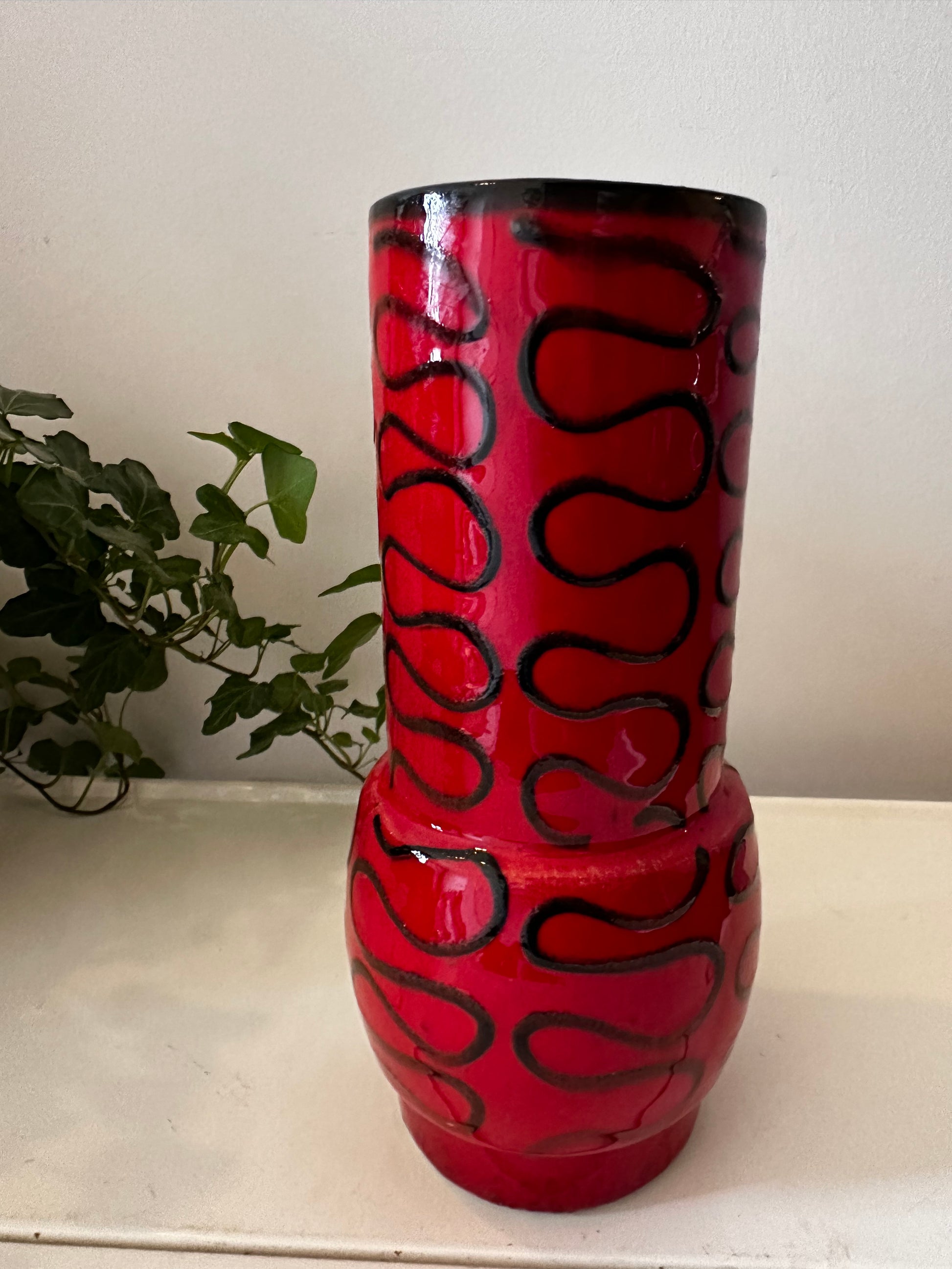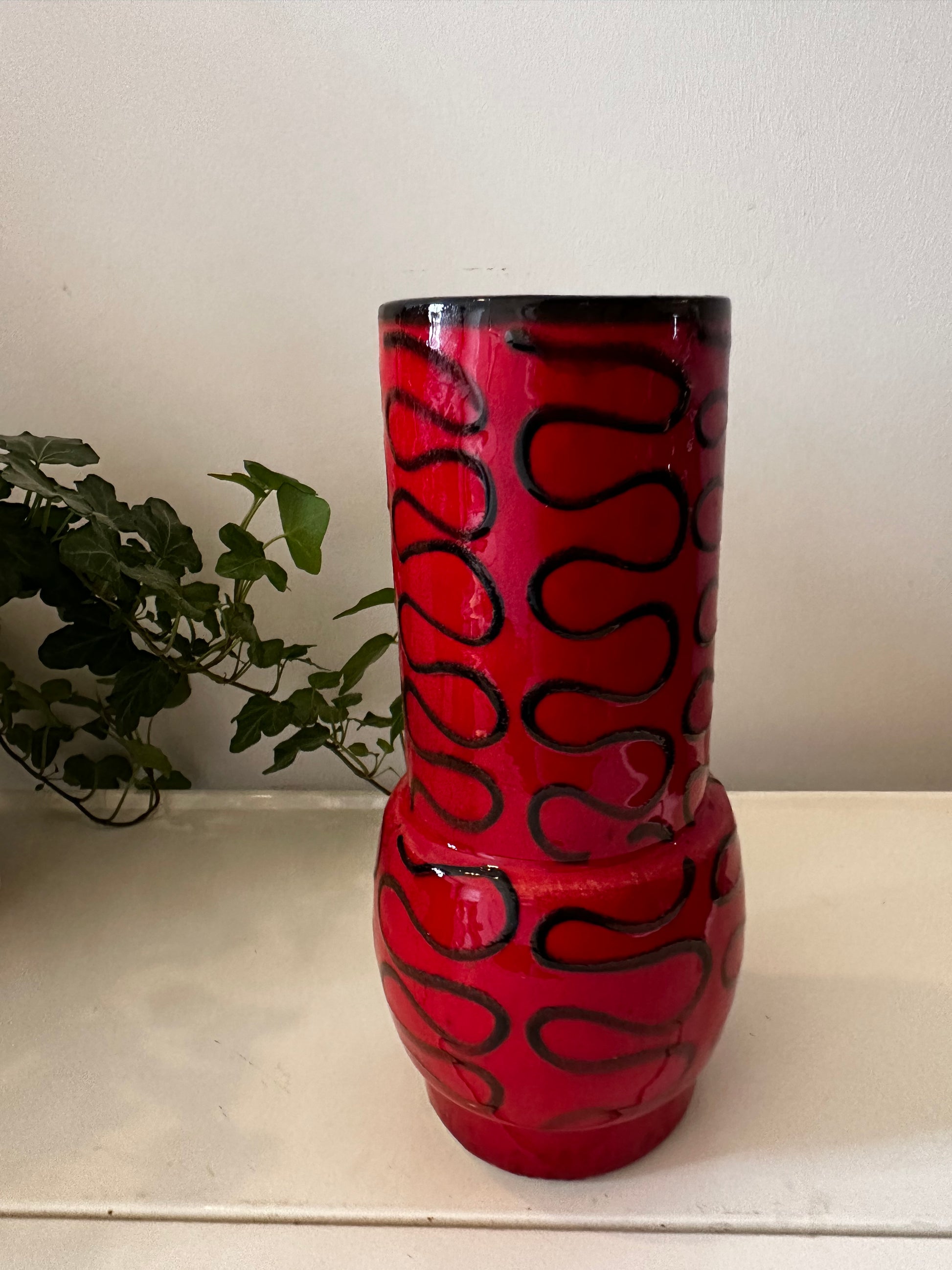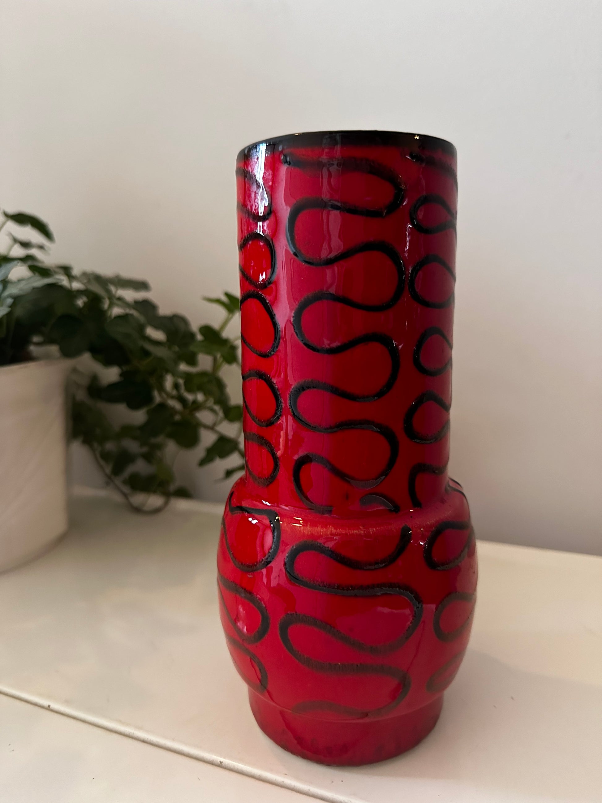 Een te gekke West Germany vaas. Gemerkt onder met nummer 637/20. De vaas dateert uit de jaren 60 en heeft een modernist stijl. Kleurstelling rood met zwarte lijnen. In een mooie vintage staat met lichte sporen van gebruik.