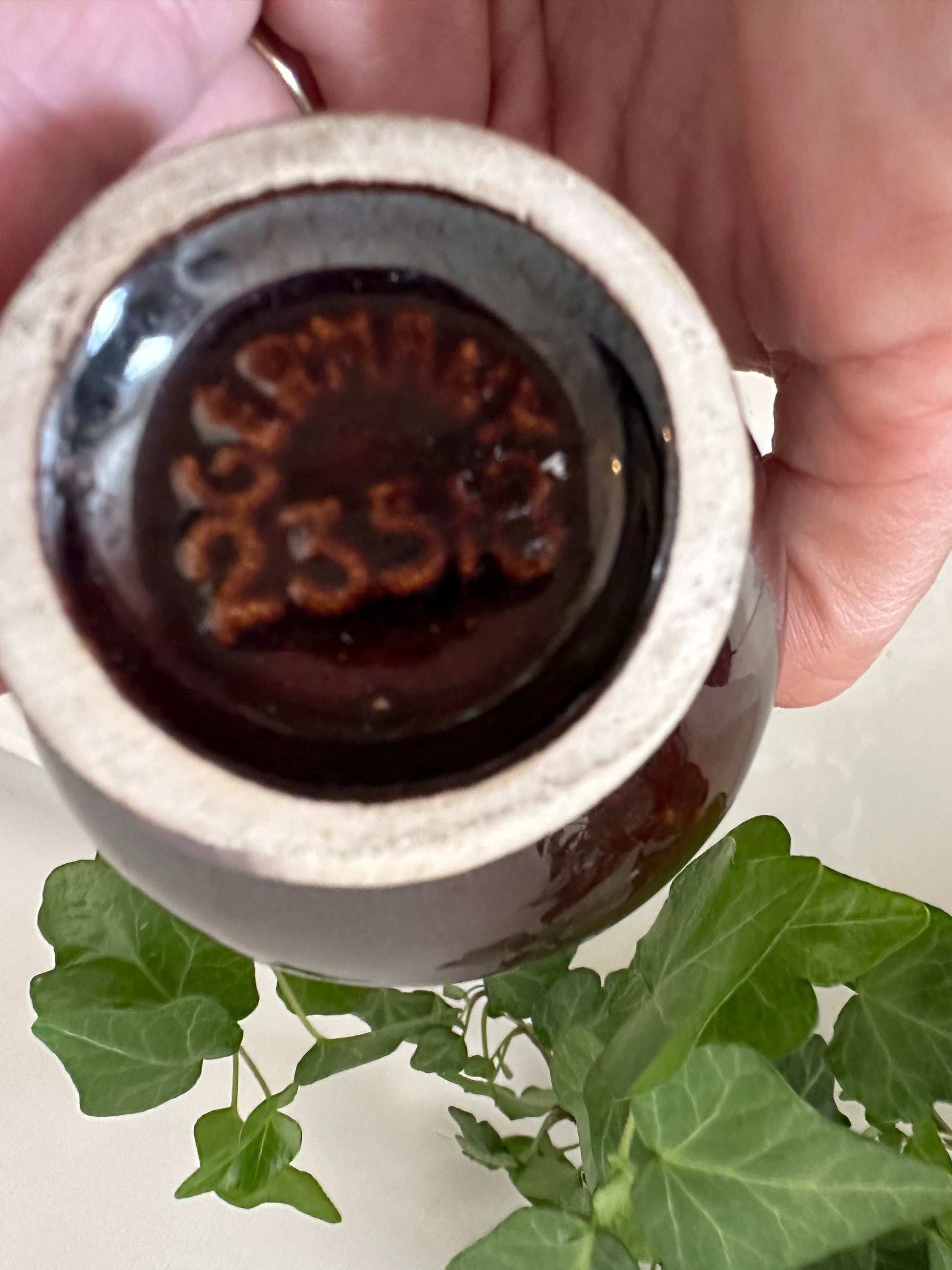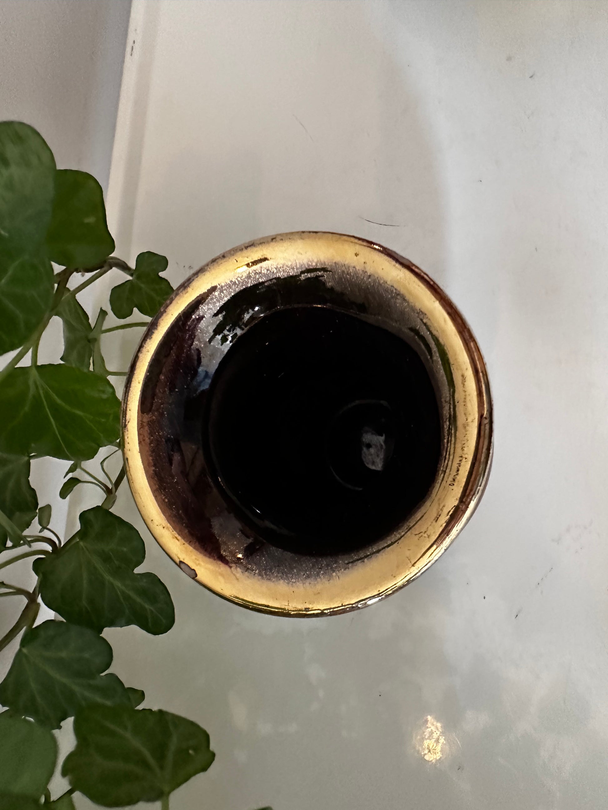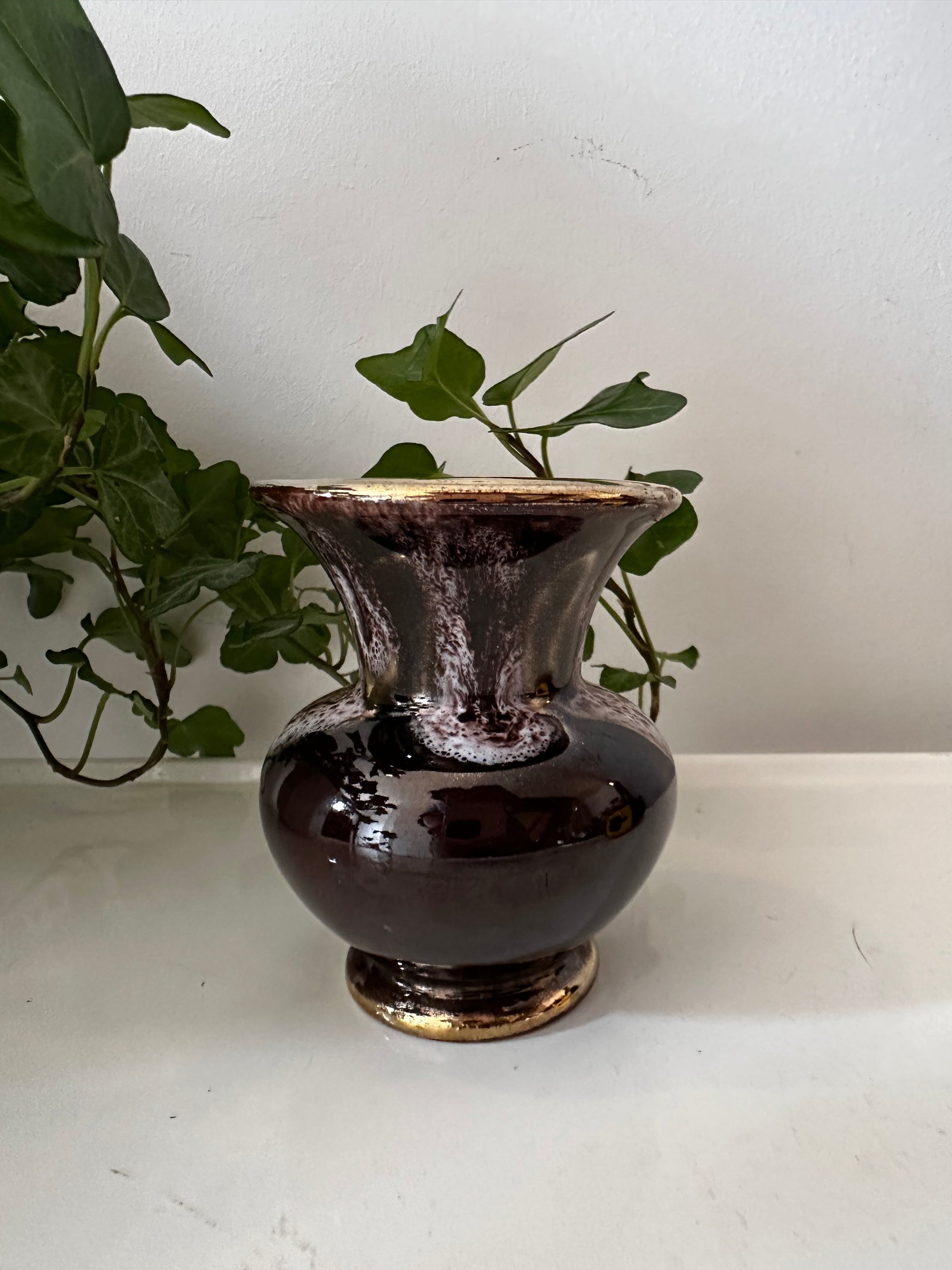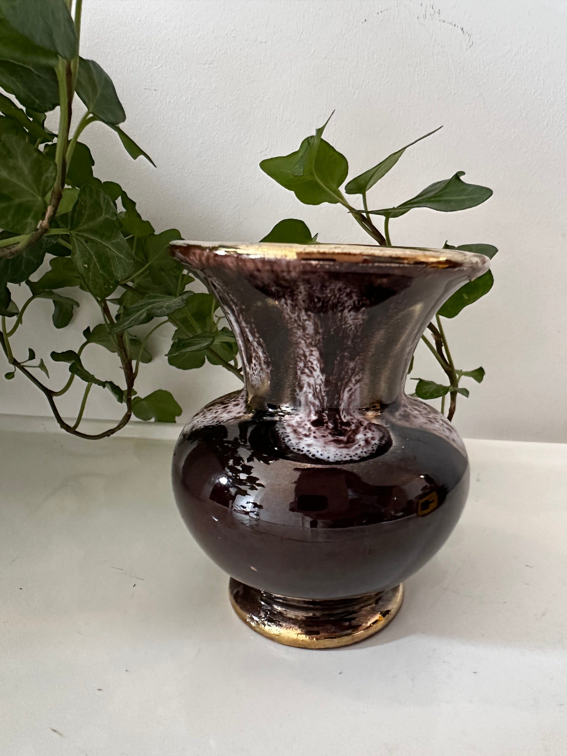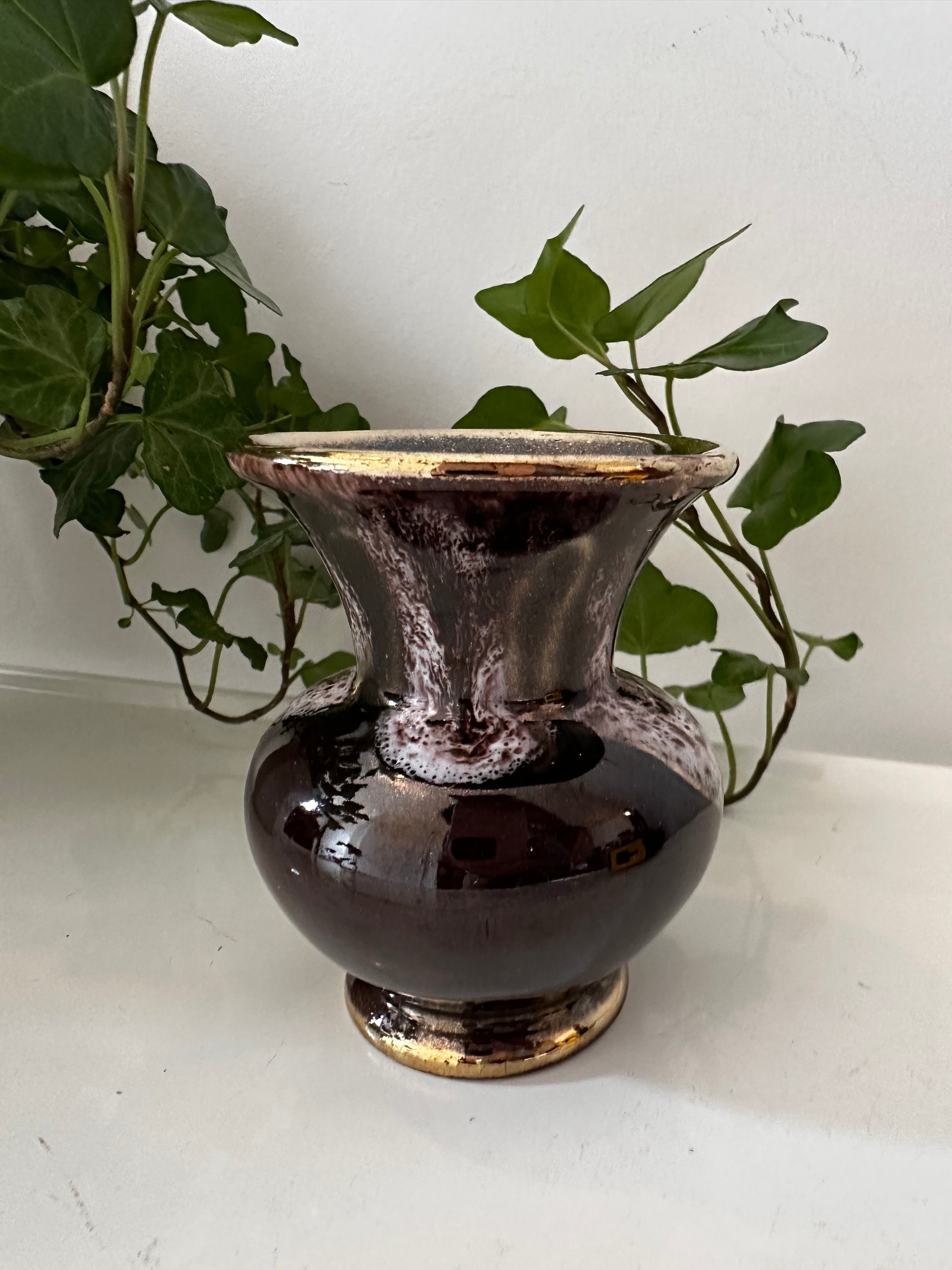 Dit is toch een dotje een mini West Germany vaasje. In een mooie vintage staat. Twee kleine plekjes rond de hals langs het gouden randje. Het vaasje is gemerkt onder.