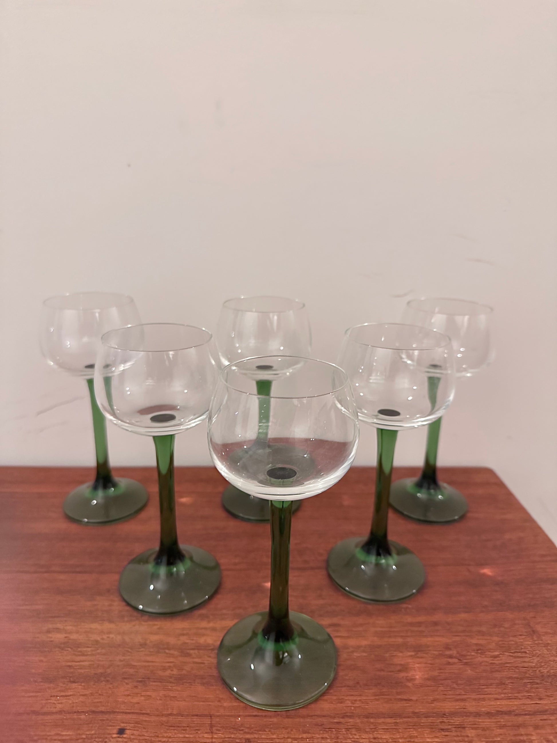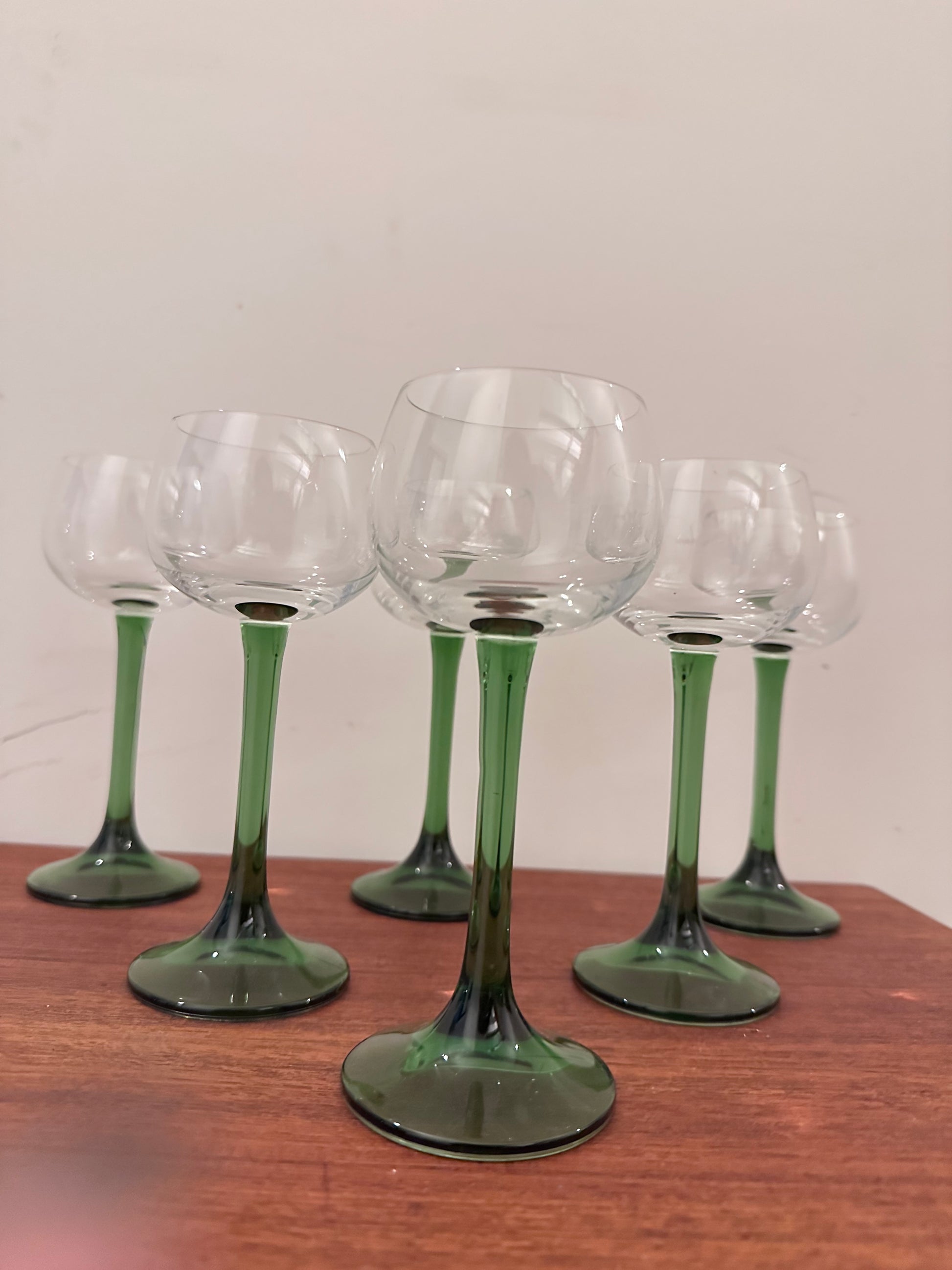 Daar zijn ze weer! 6 stuks van deze geweldige wijnglazen met groen voet in een werkelijk geweldige staat.