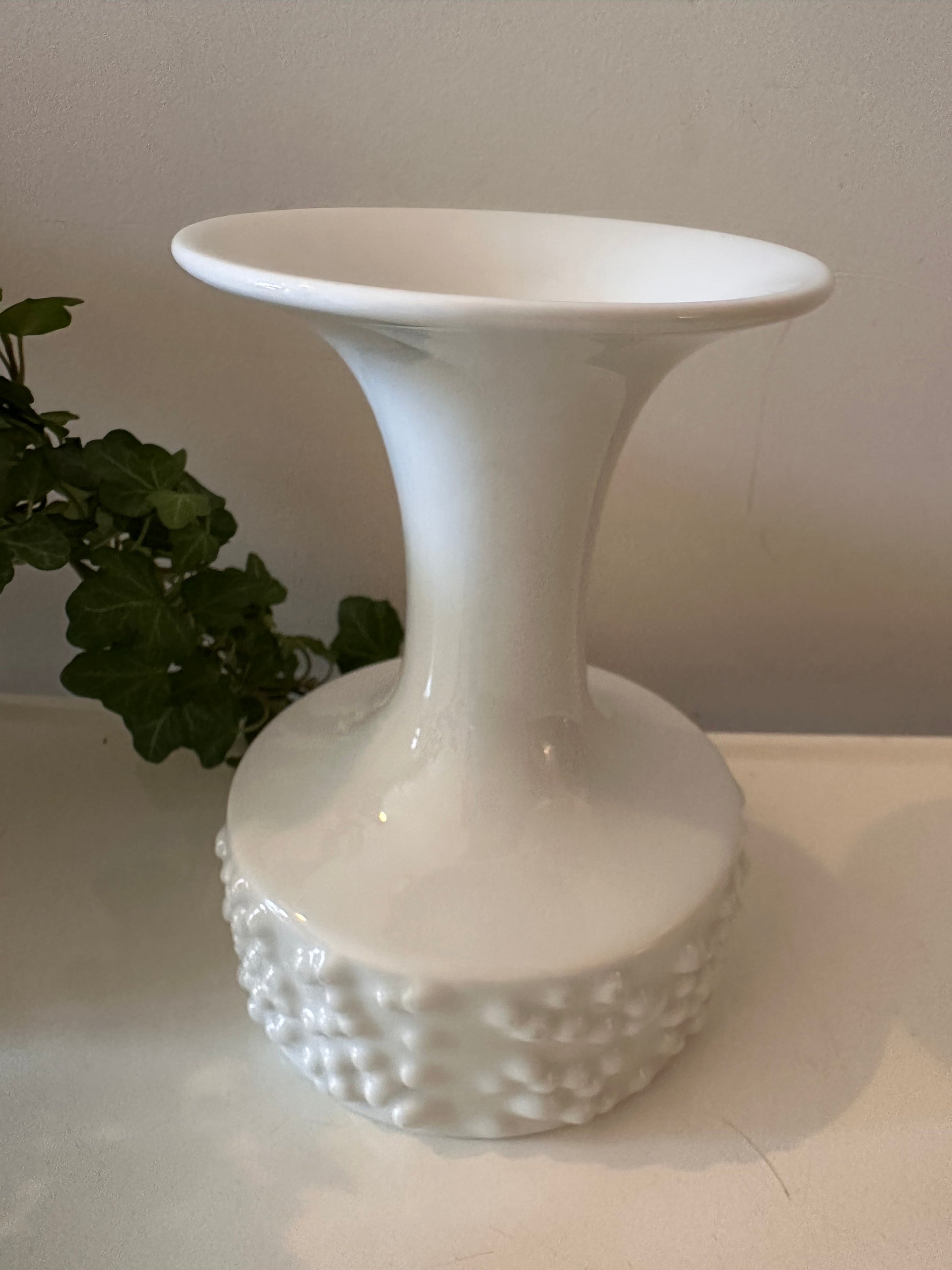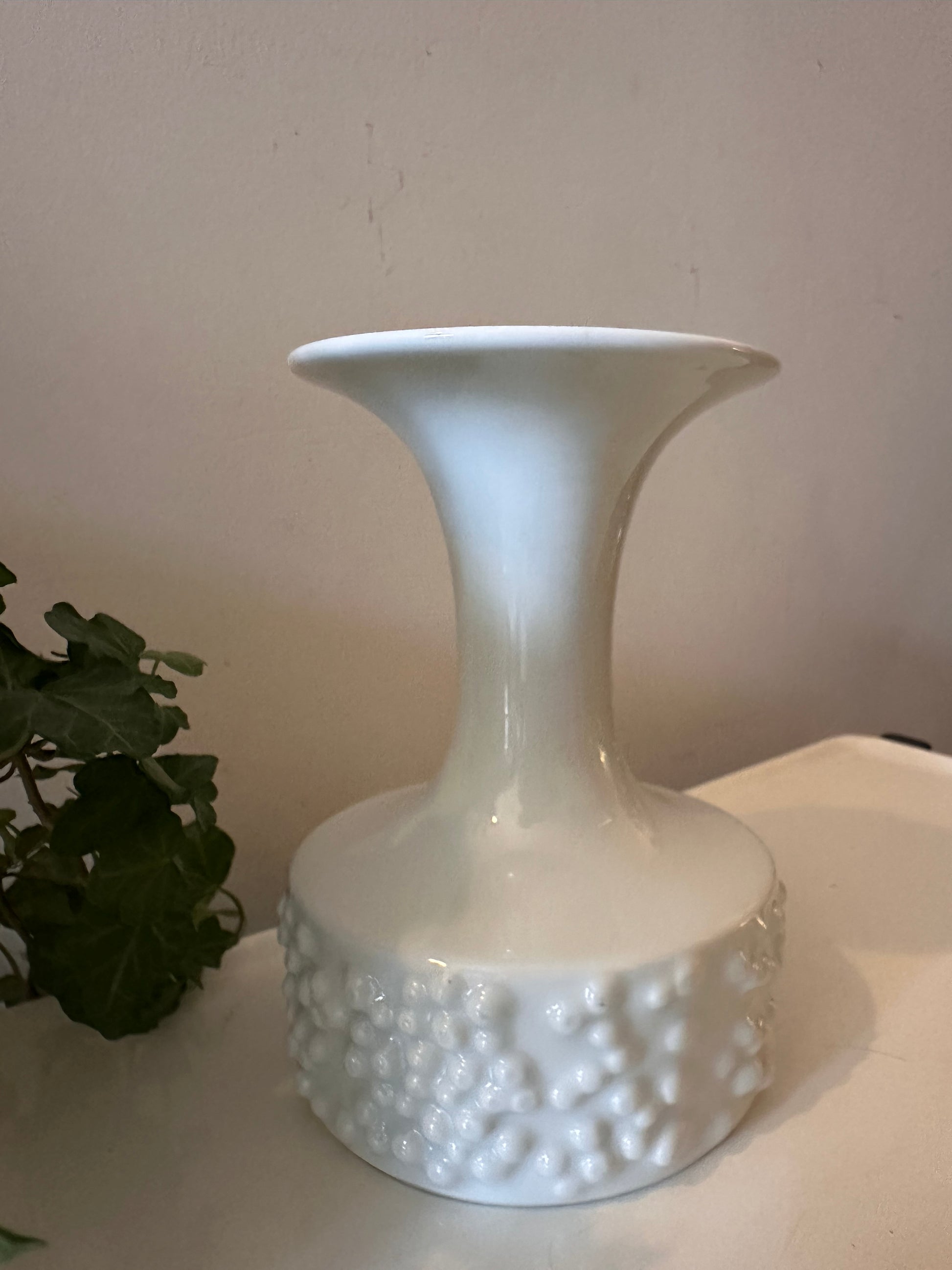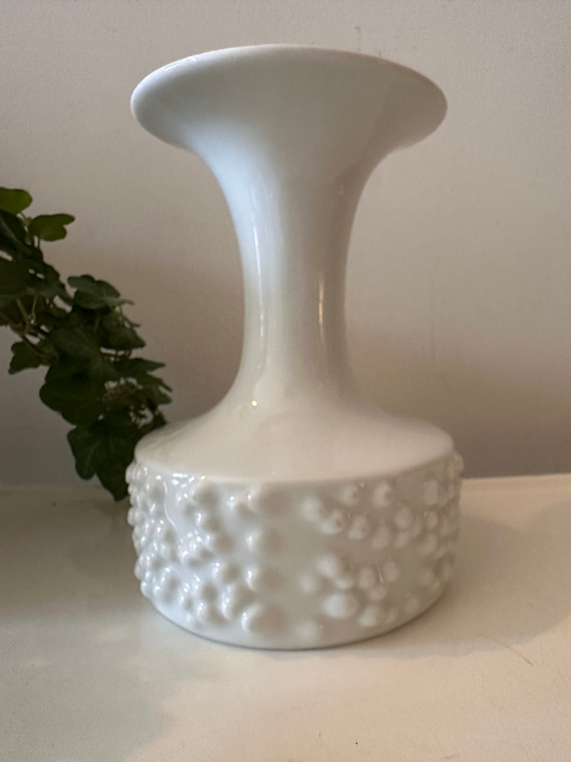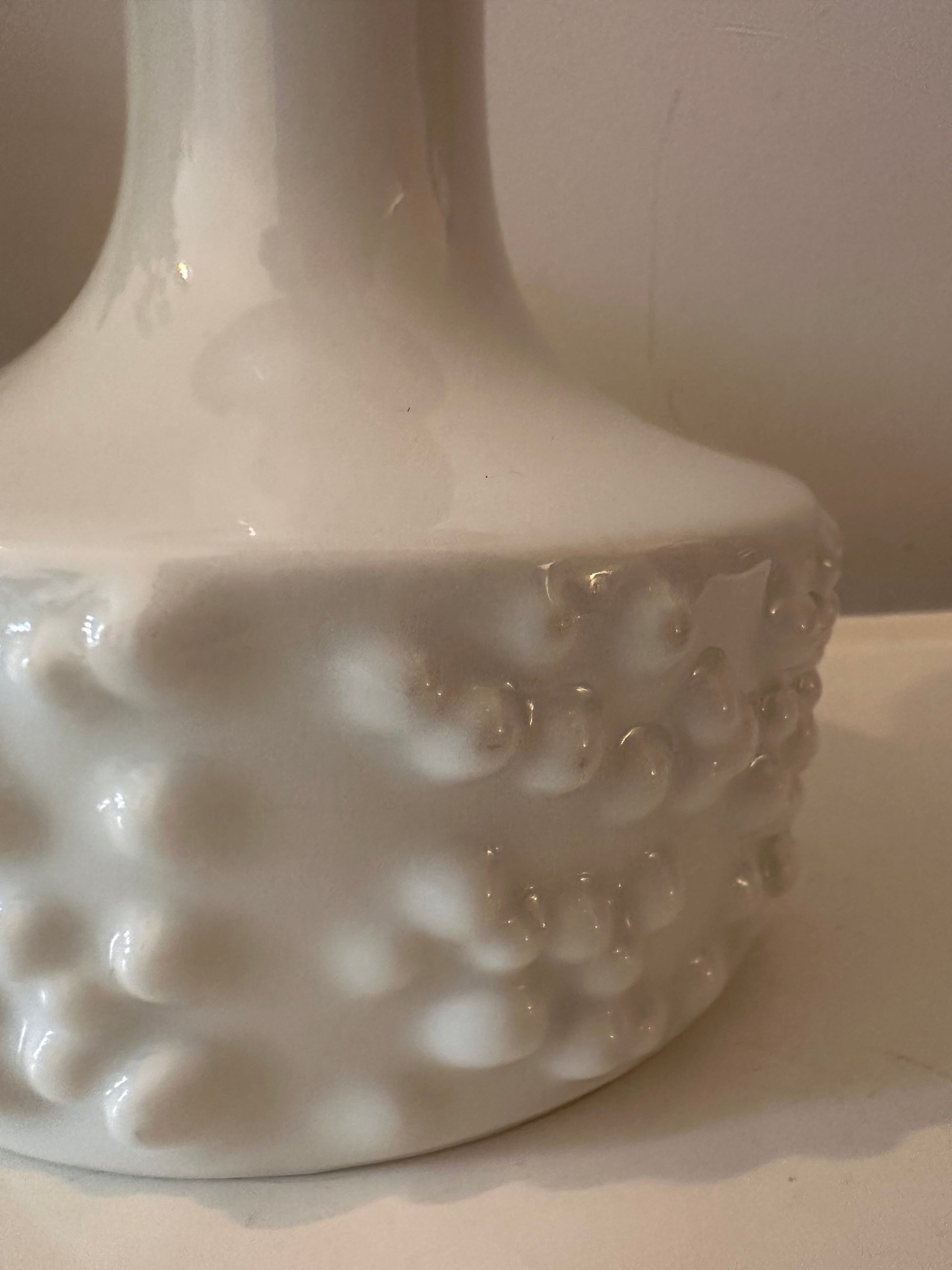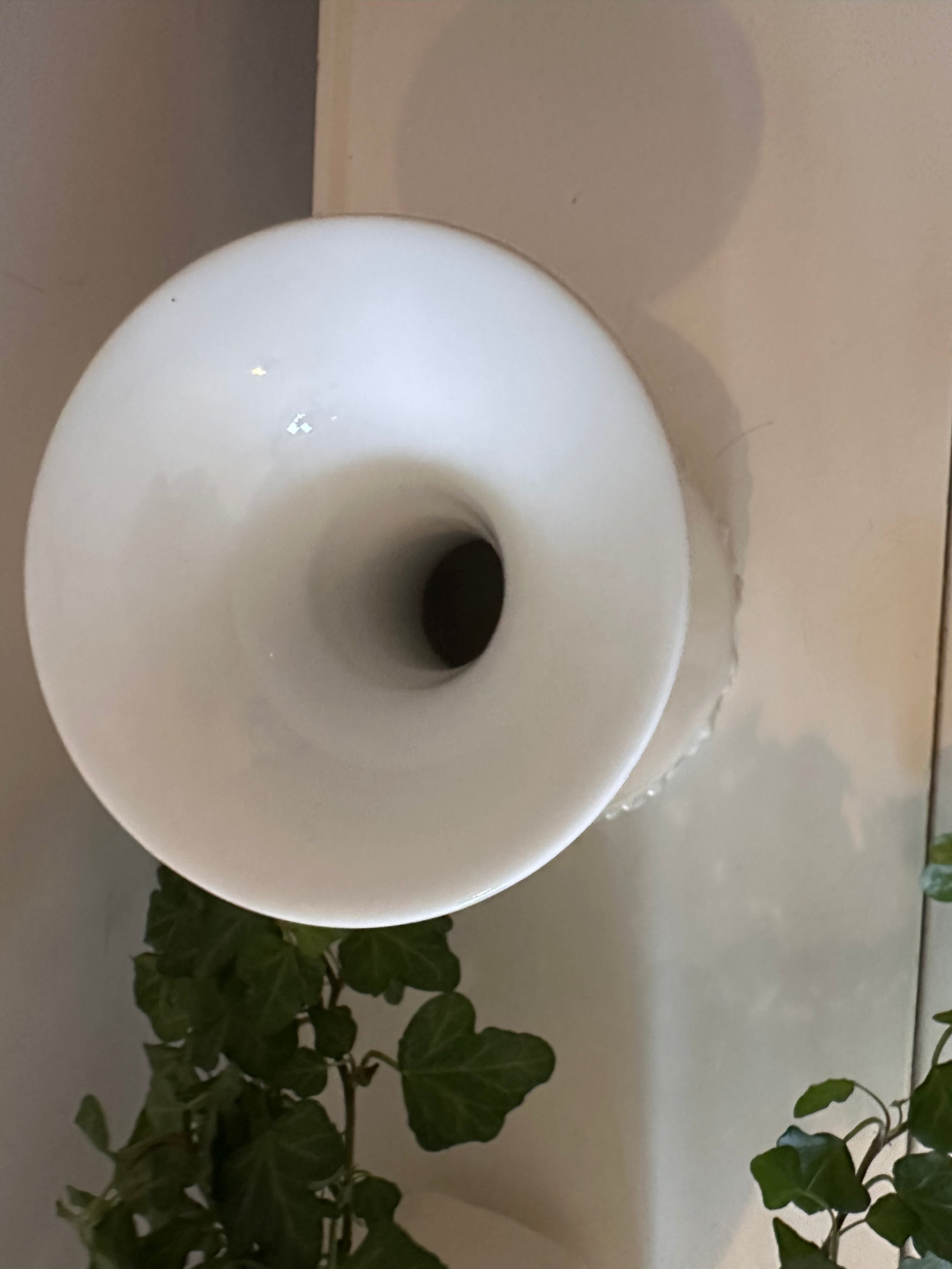 Hele mooie porseleinen vaas van Königl. pr. Tettau, een Duits merk met een lange traditie in fijn porselein. Deze vaas heeft een elegante trechtervorm met een reliëfstructuur aan de onderzijde — typisch voor de jaren 60-70 collectie van het merk. Gemaakt van wit porselein met glanzende afwerking, strak en modern van vorm met een subtiel speels reliëf. Q571