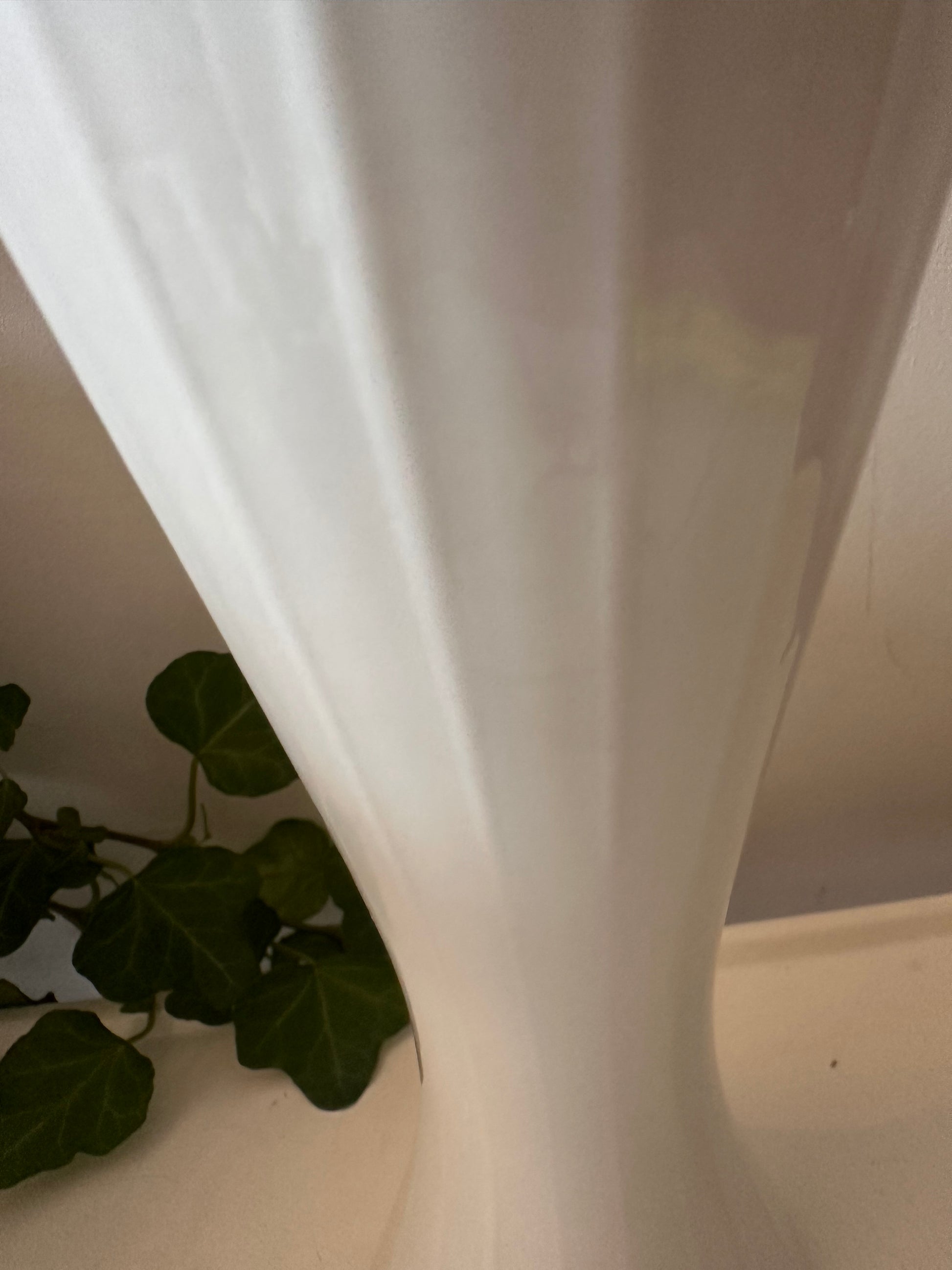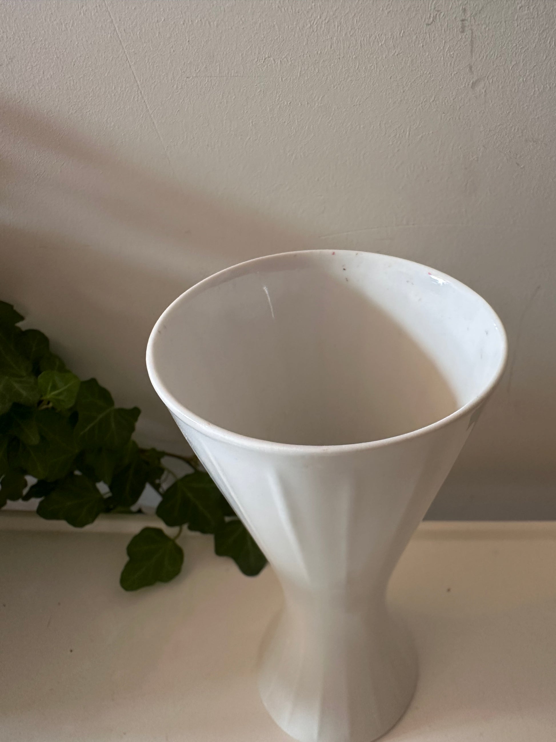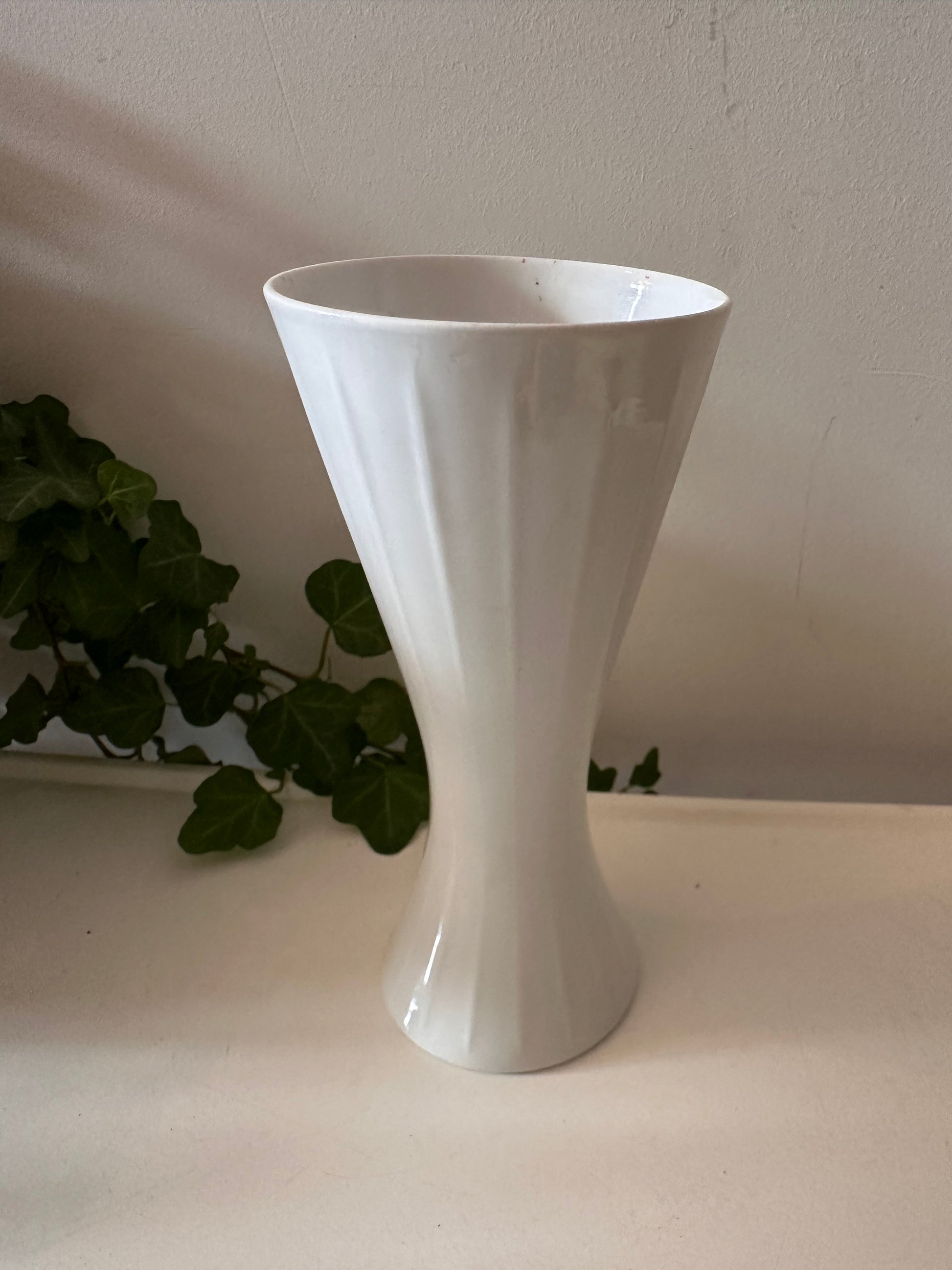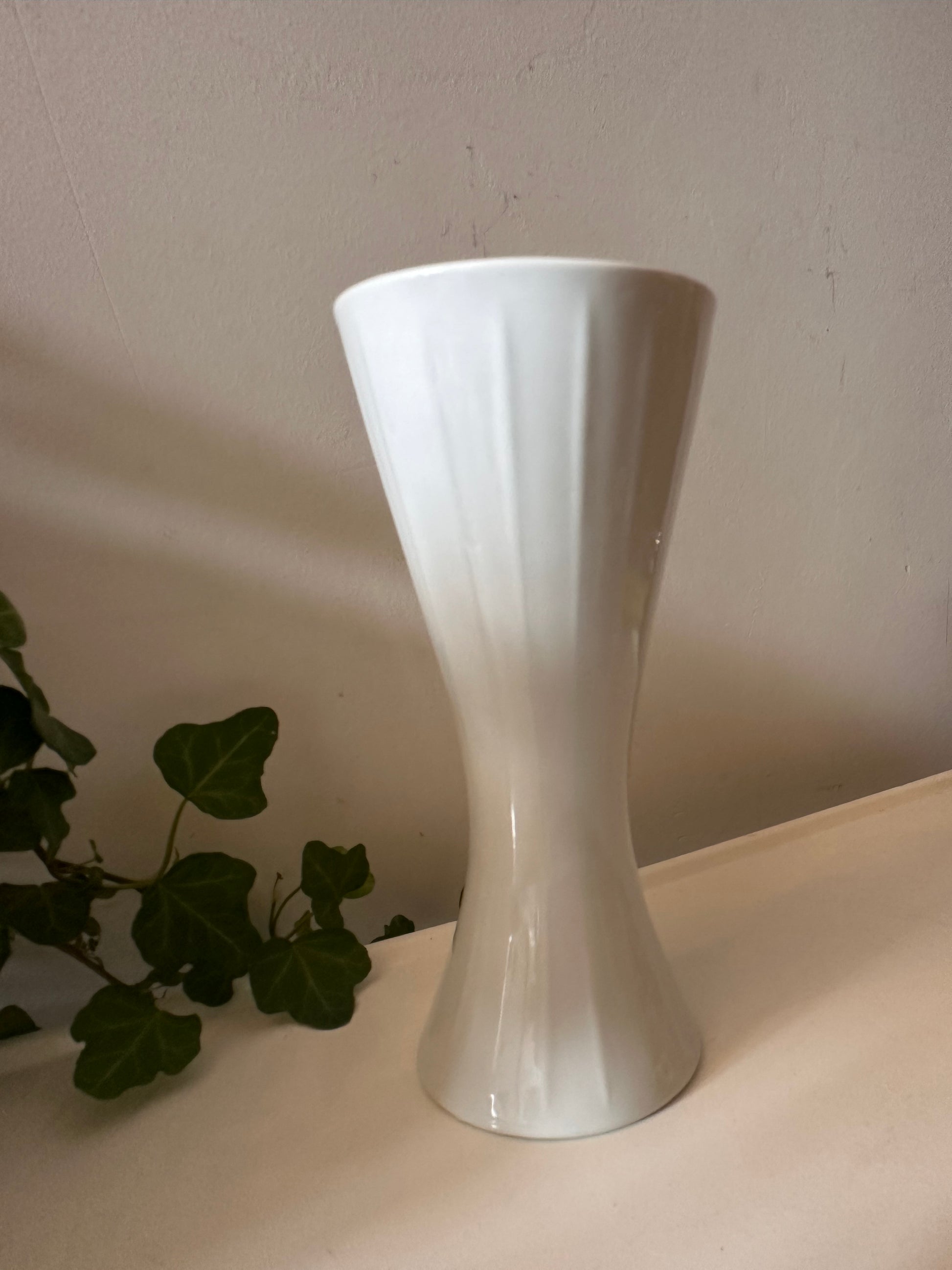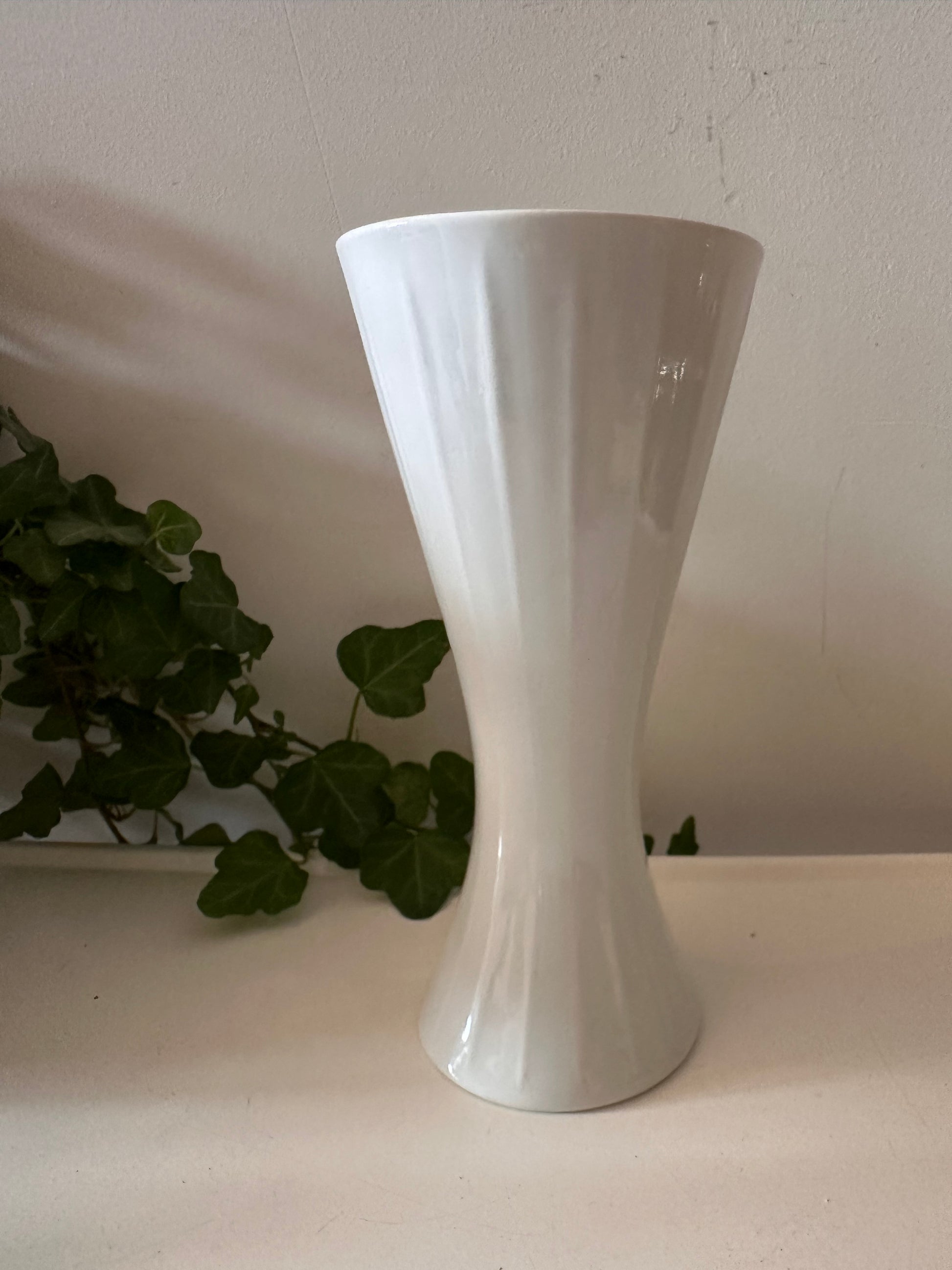 Toffe vintage vaas met die typische mid-century hourglassvorm — strak, modern en stijlvol in z’n eenvoud. Glanzend wit porselein met verticale ribbelstructuur. Q573