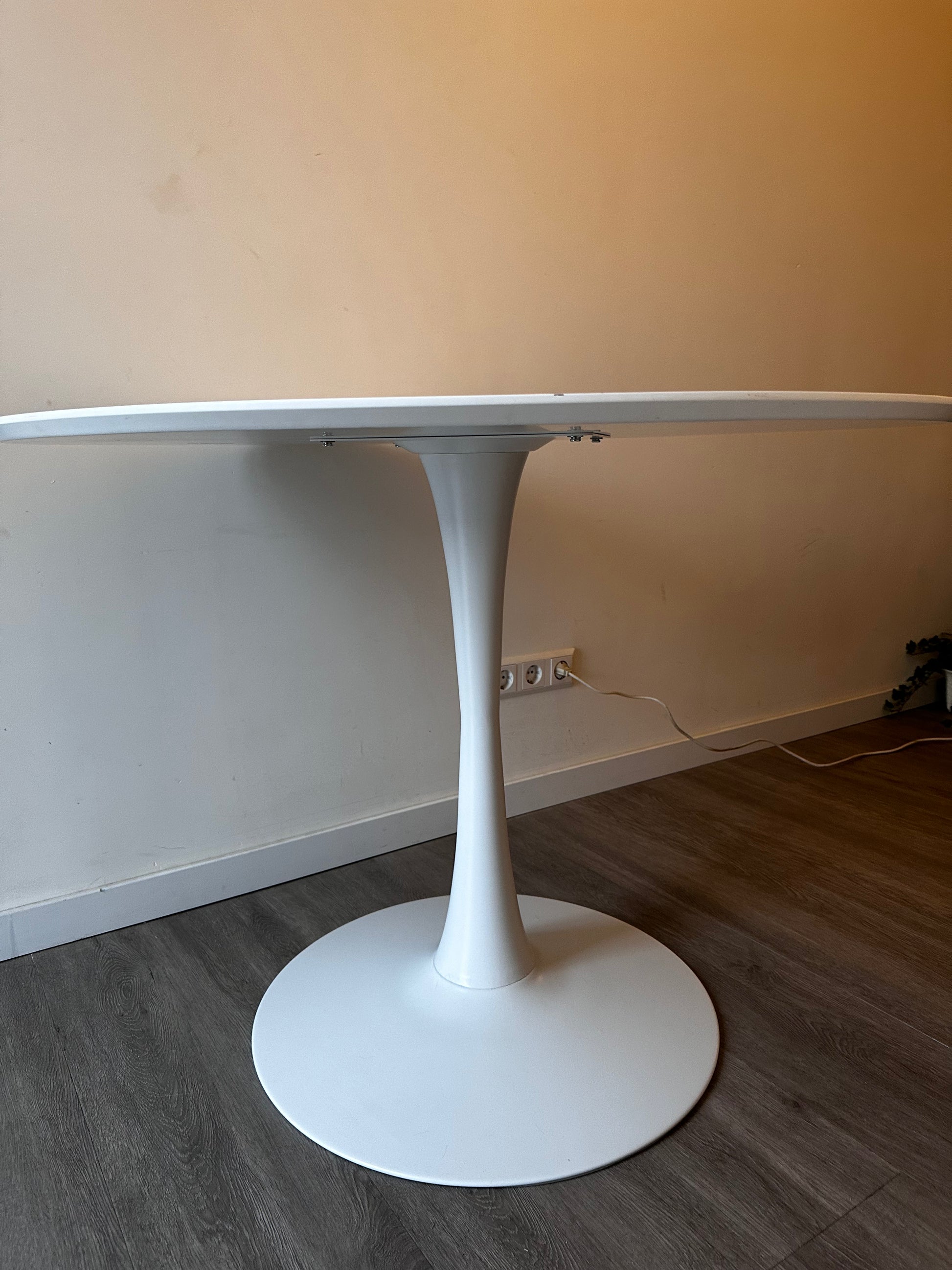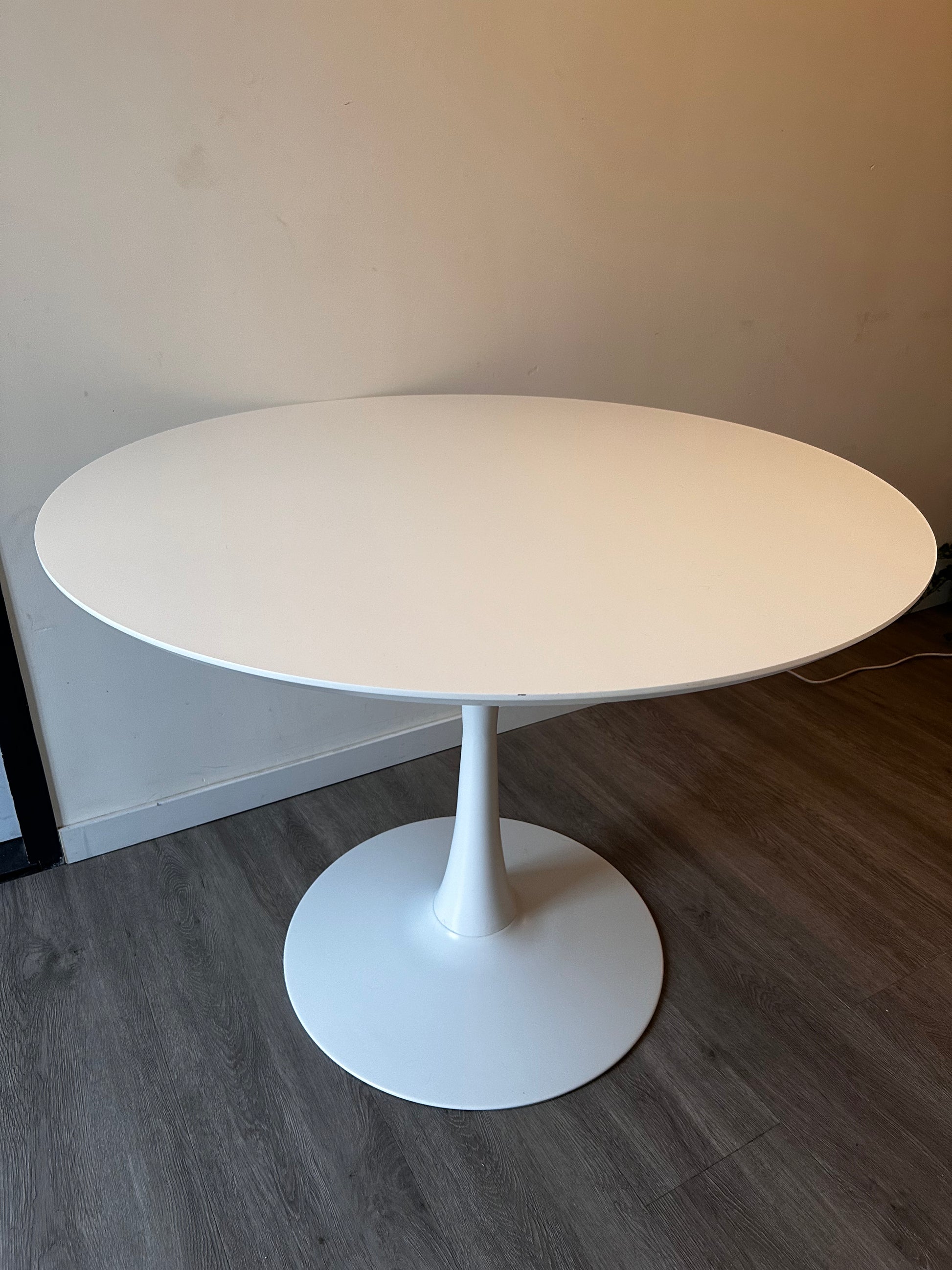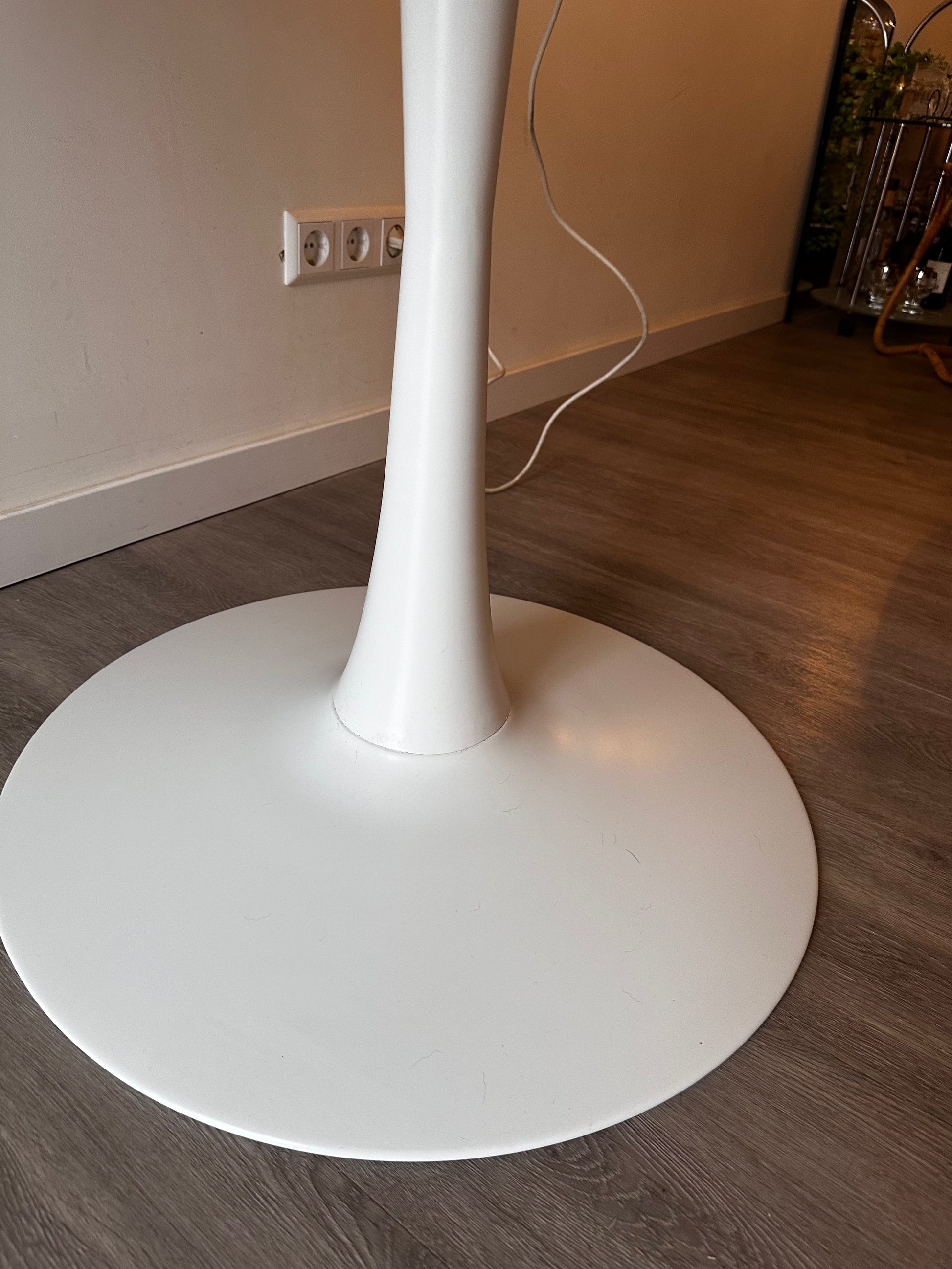 Super toffe witte design eetkamer tafel naar het design van Knoll. In een heel mooie vintage staat. Dit is een zwaardere tafel. De voet is verzwaard met een stenen plaat en het blad is demonteerbaar van de poot. Heel lichte gebruikssporen zie foto’s een plekje aan de voet een twee kleine plekjes aan de rand van de tafel. Prachtig wit en een mooie ronde tafel is super praktisch in een kleinere ruimte