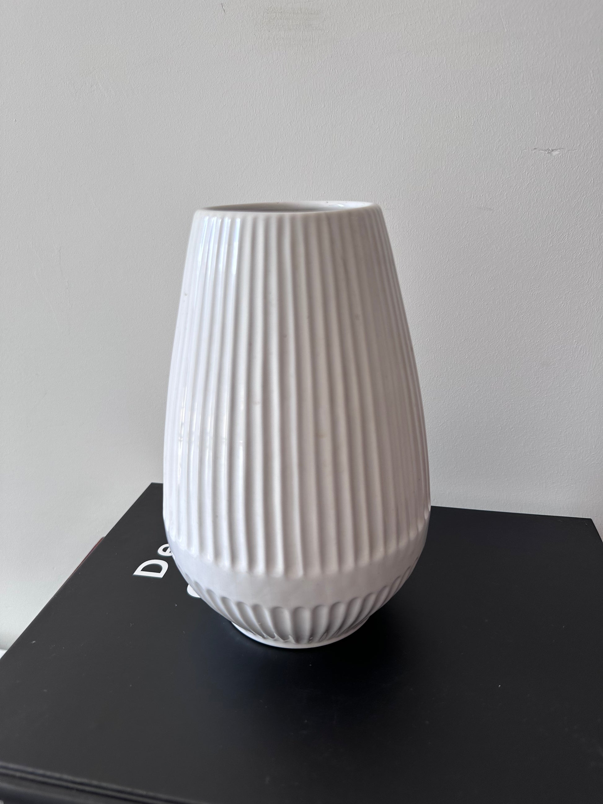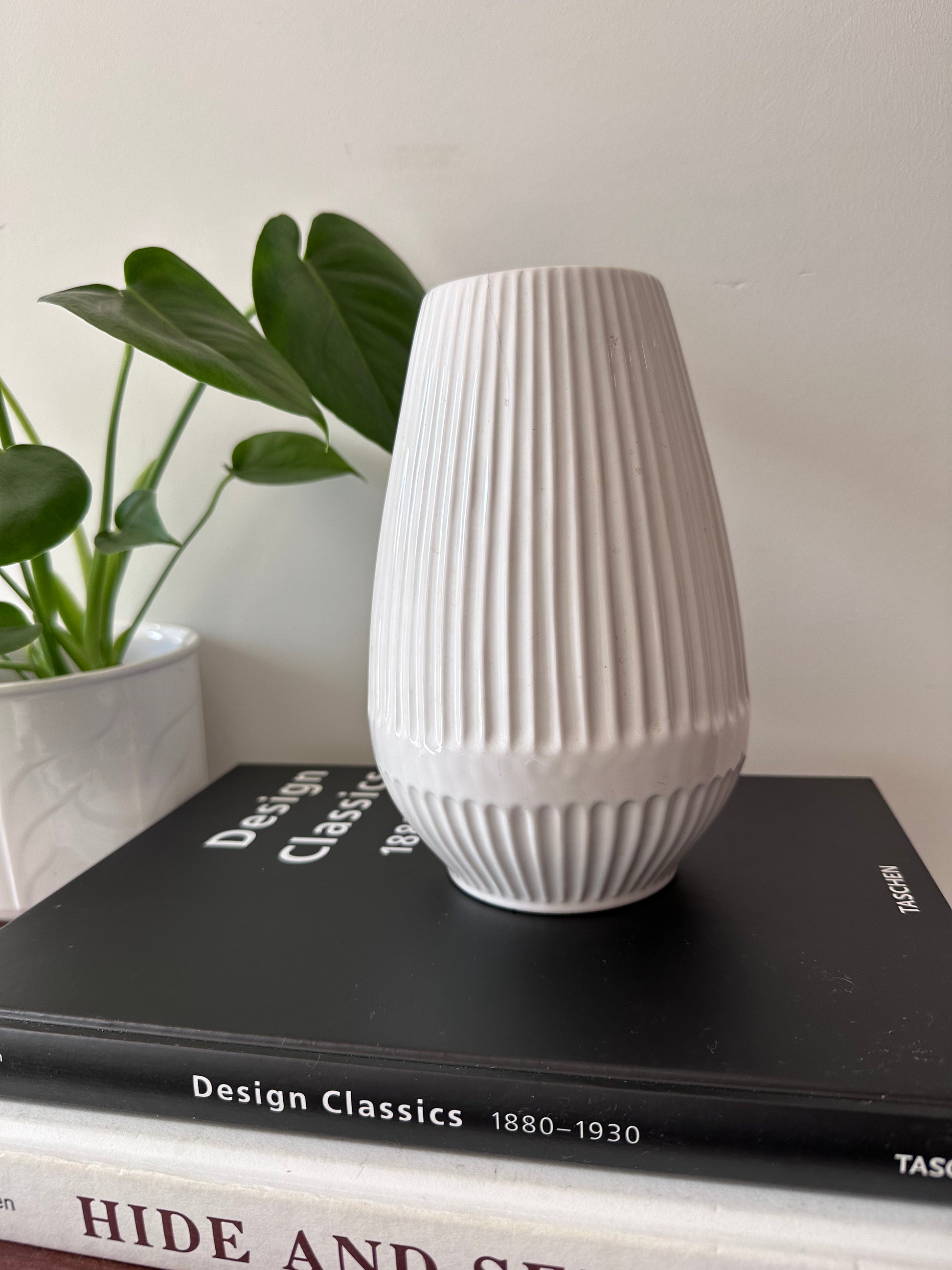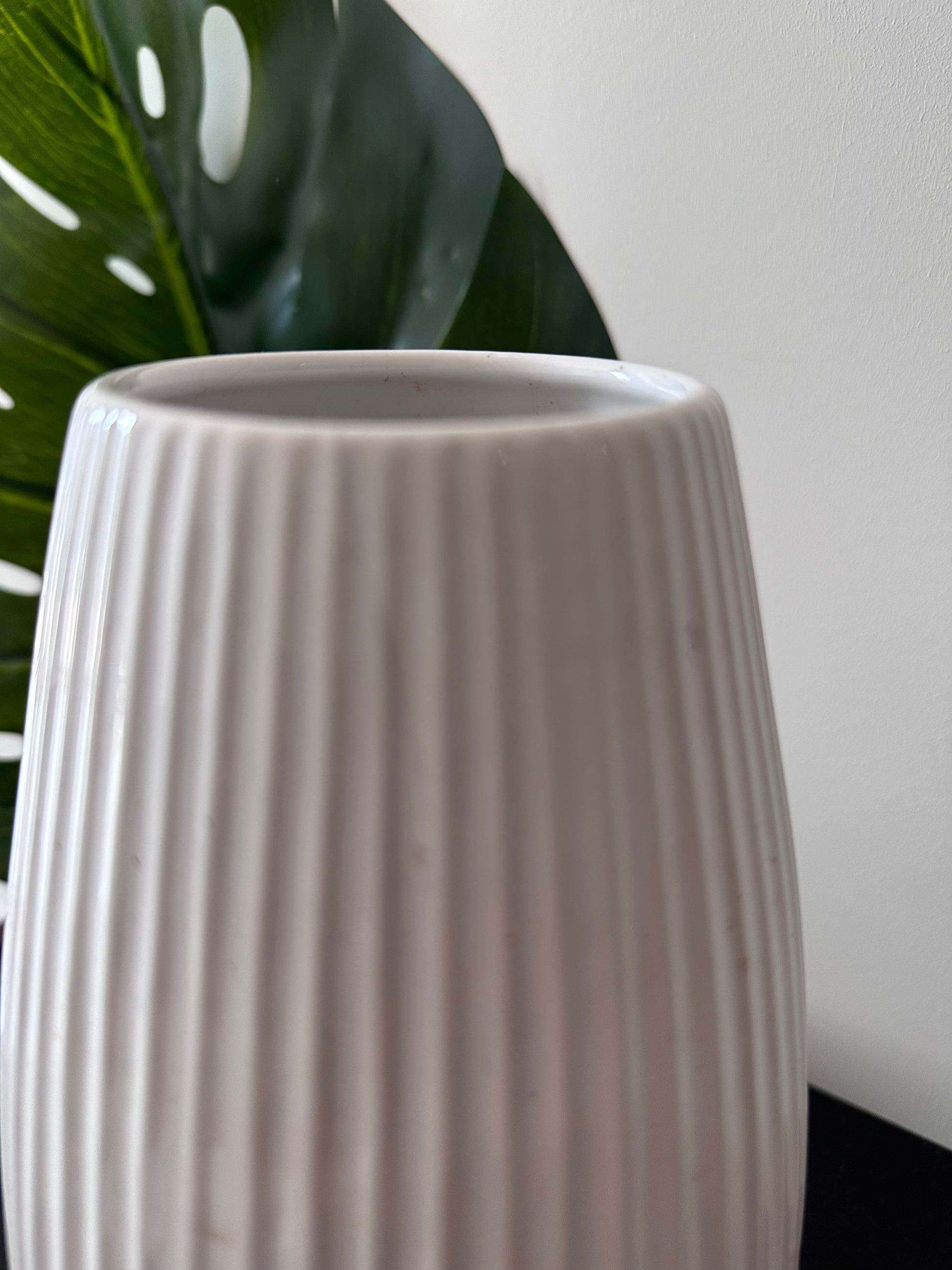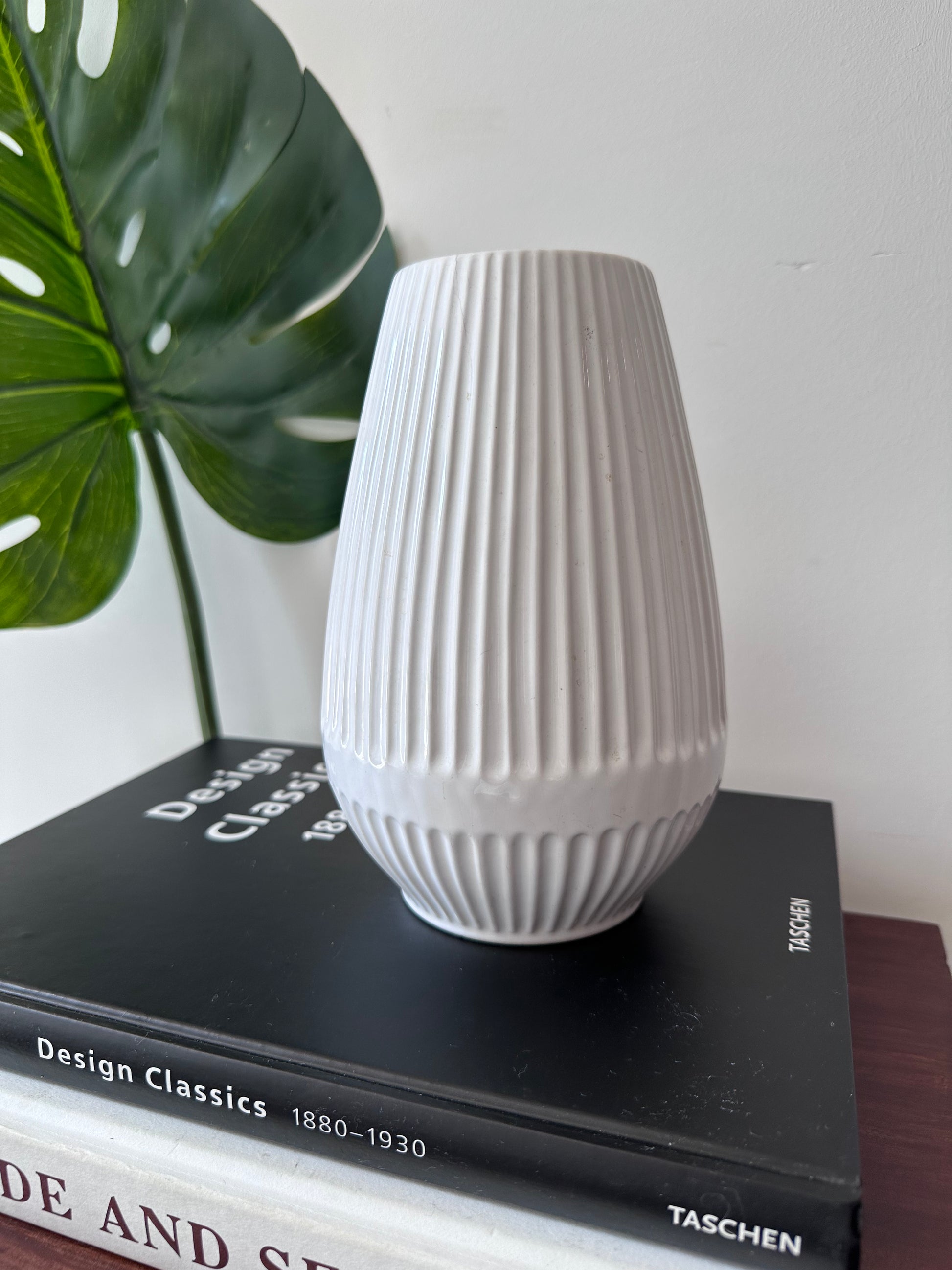 Prachtige vintage witte vaas met een mooi design van verticale lijnen. Vaas is in een goede vintage staat met een miniscuul haarscheurtje bovenin, zie foto