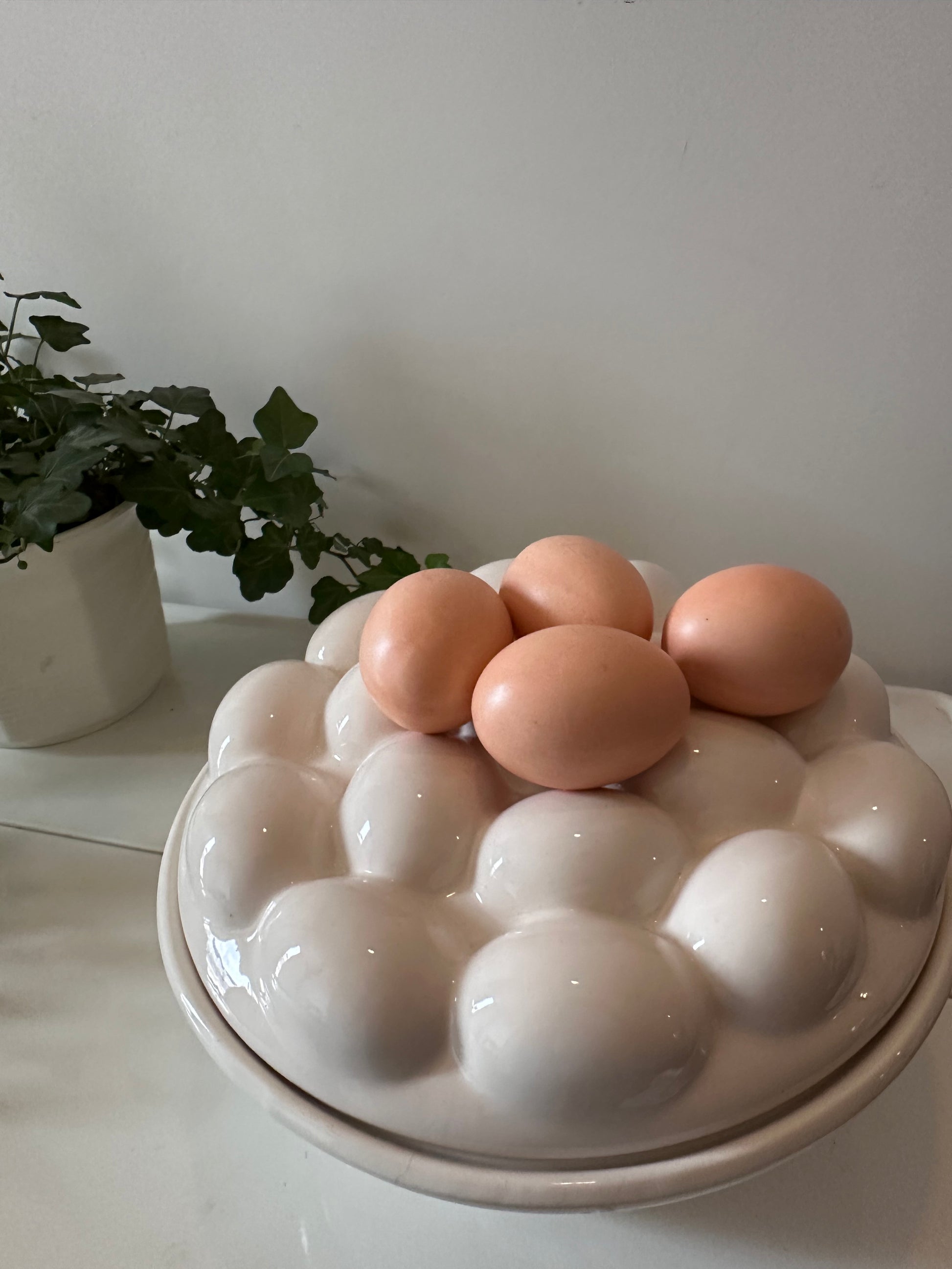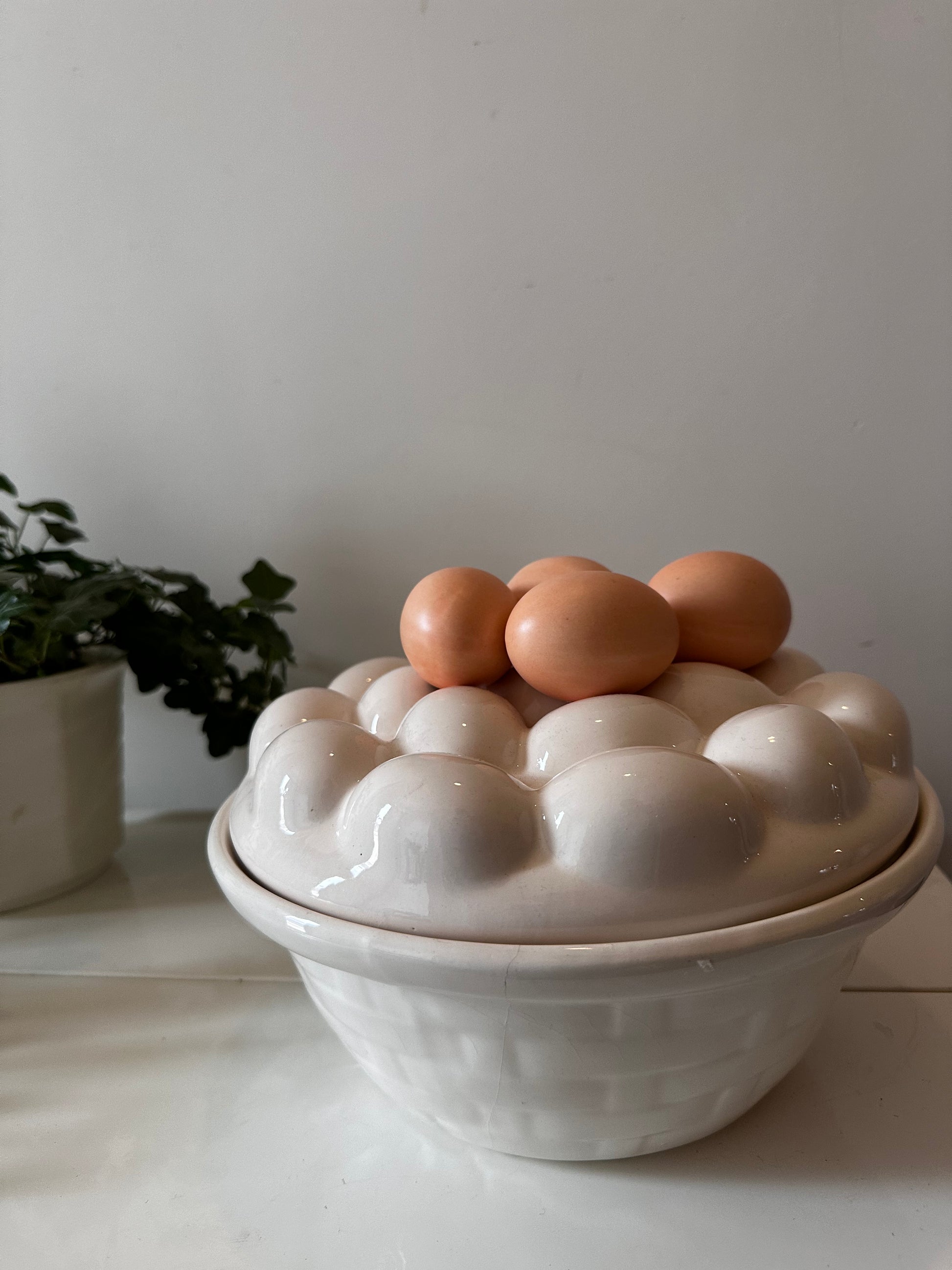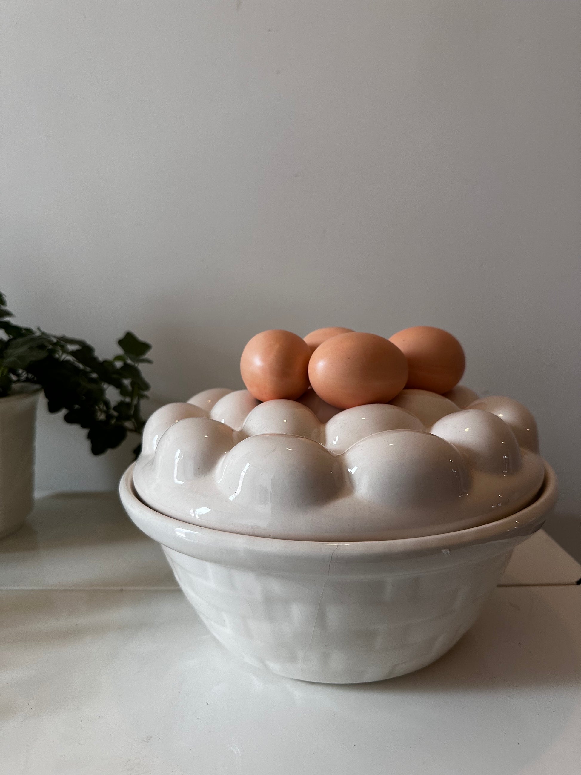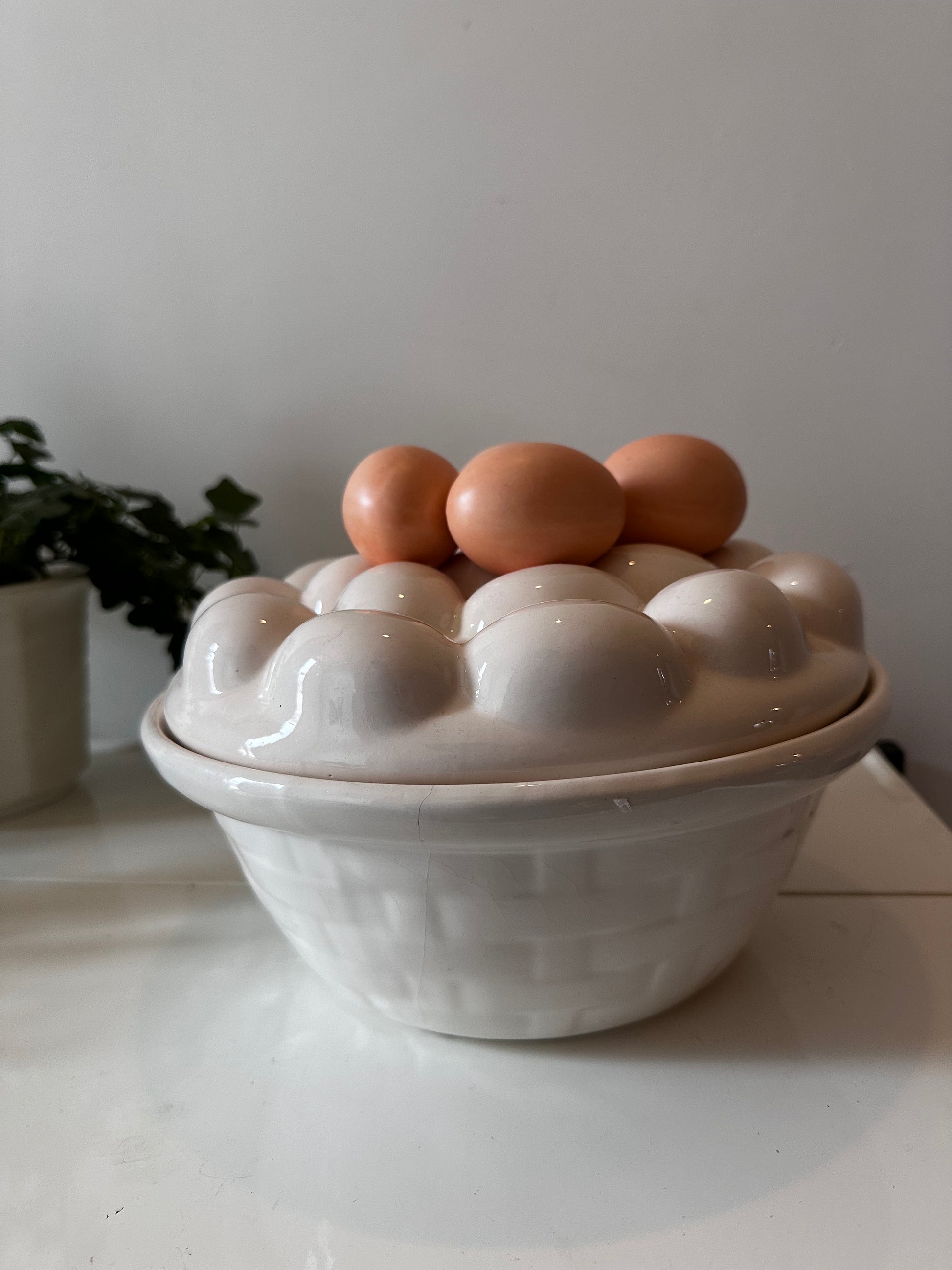 Dit is echt een XXL eier schaal. Super tof om je eieren in te bewaren. Deksel het een design van eieren met vier in een licht bruine kleur. Kan zeker een dozijn eieren in. In een hele mooie vintage staat. Schaal met deksel zijn van keramiek