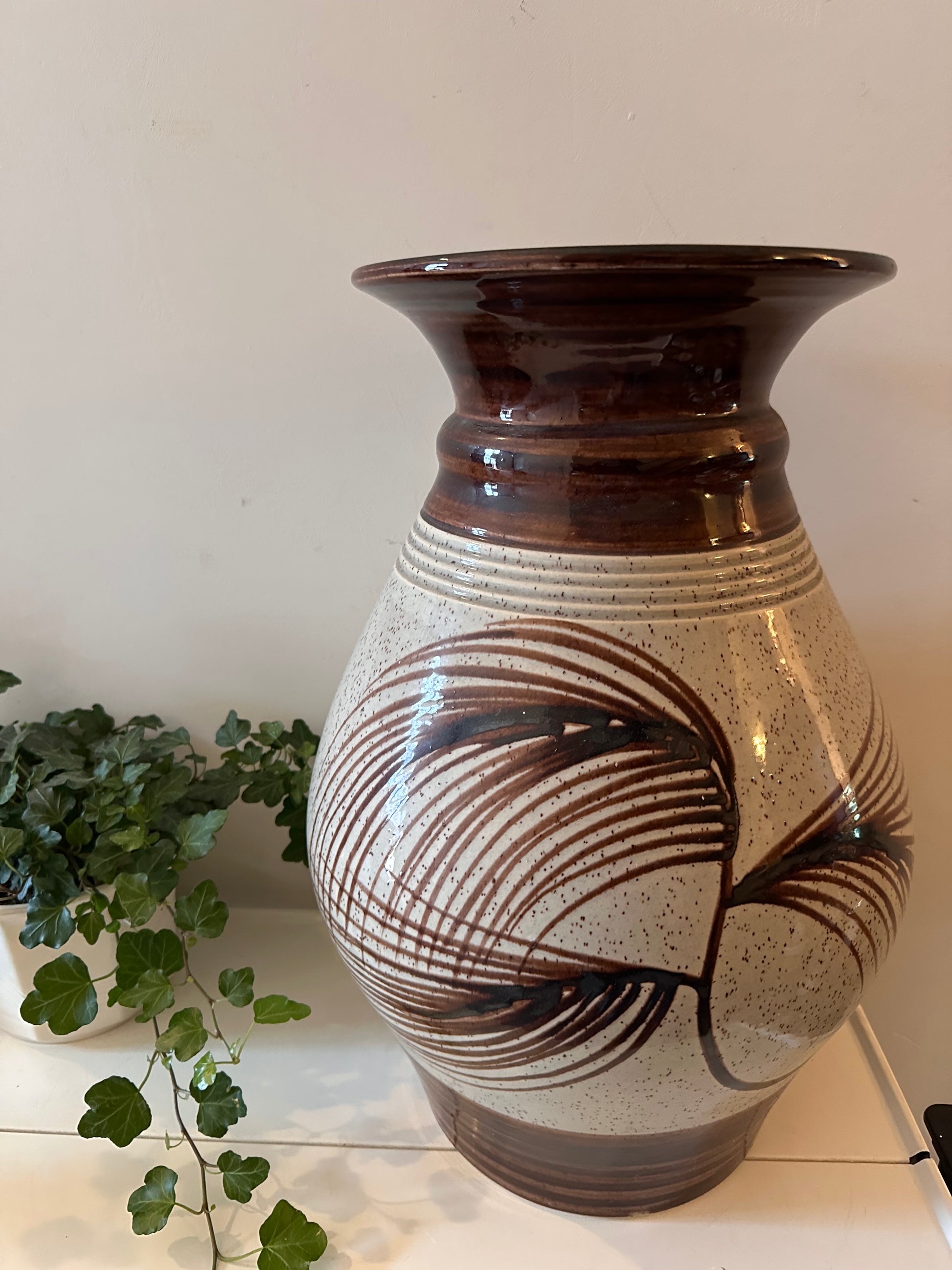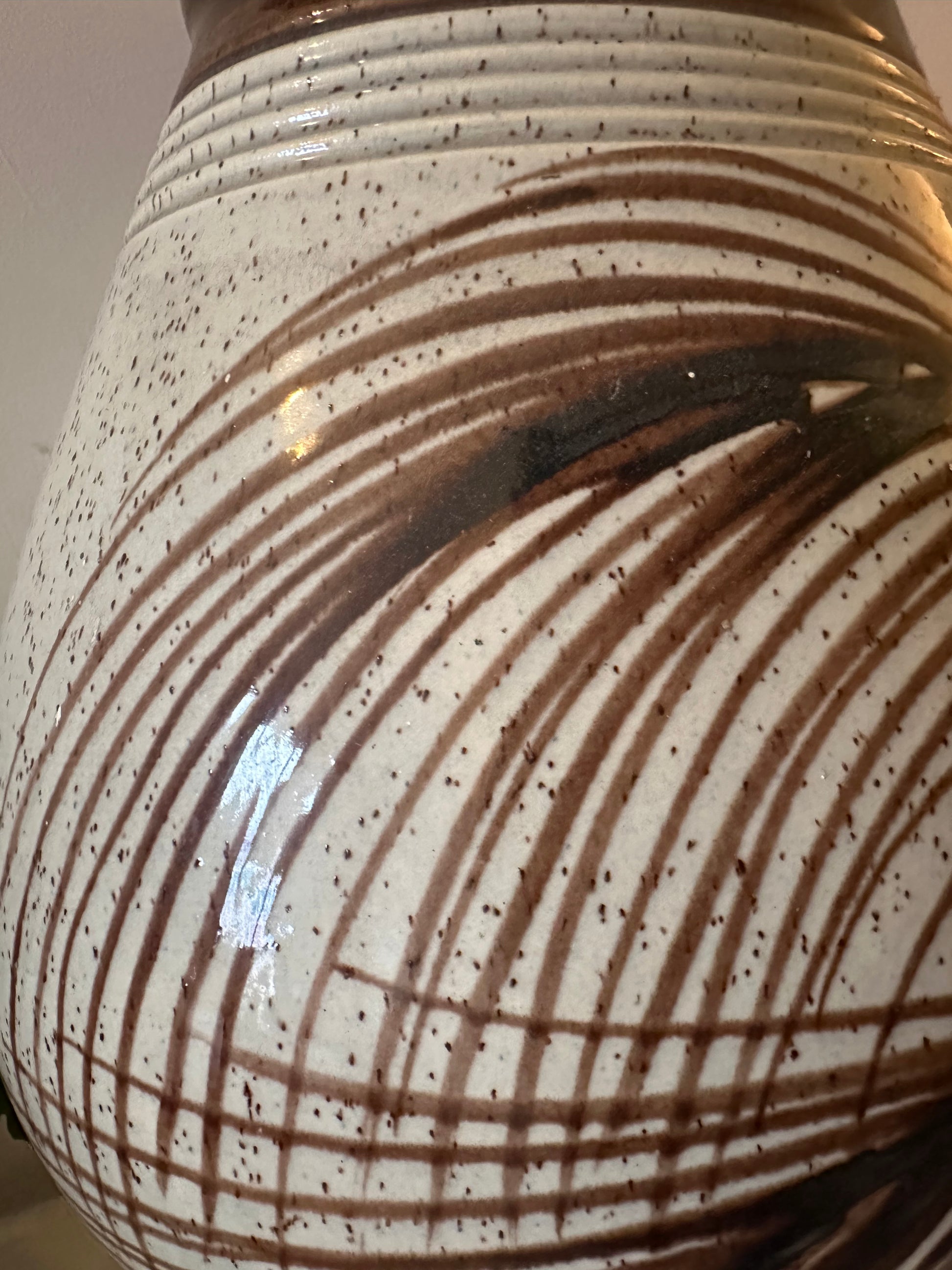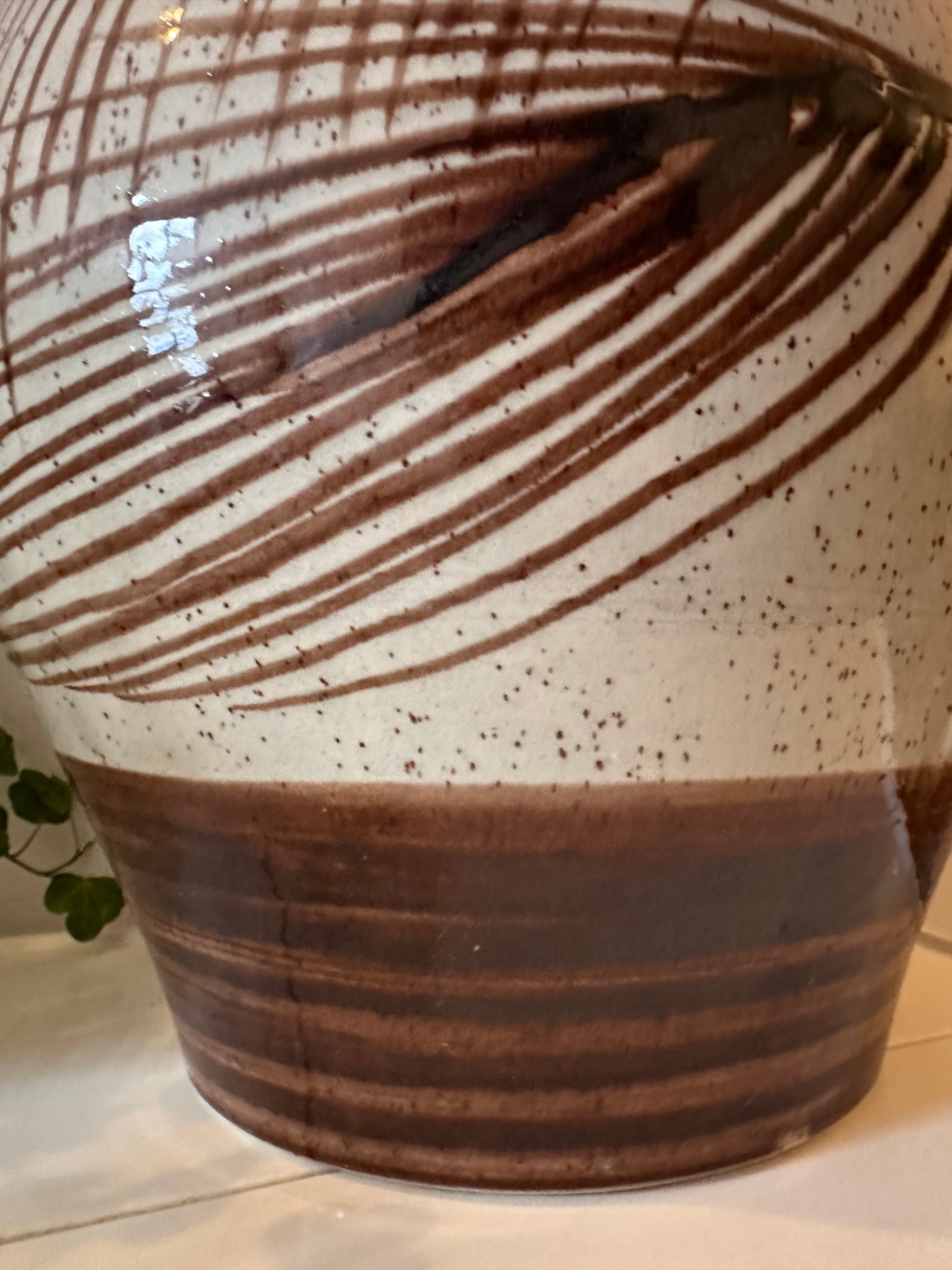 Een flinke eyecatcher uit de jaren ’70! Handgedraaid aardewerk met een gespikkelde crème basis en brede bruine penseelstreken die rondom doorlopen. Stoer van formaat en ideaal om zo neer te zetten of met een paar takken erin.