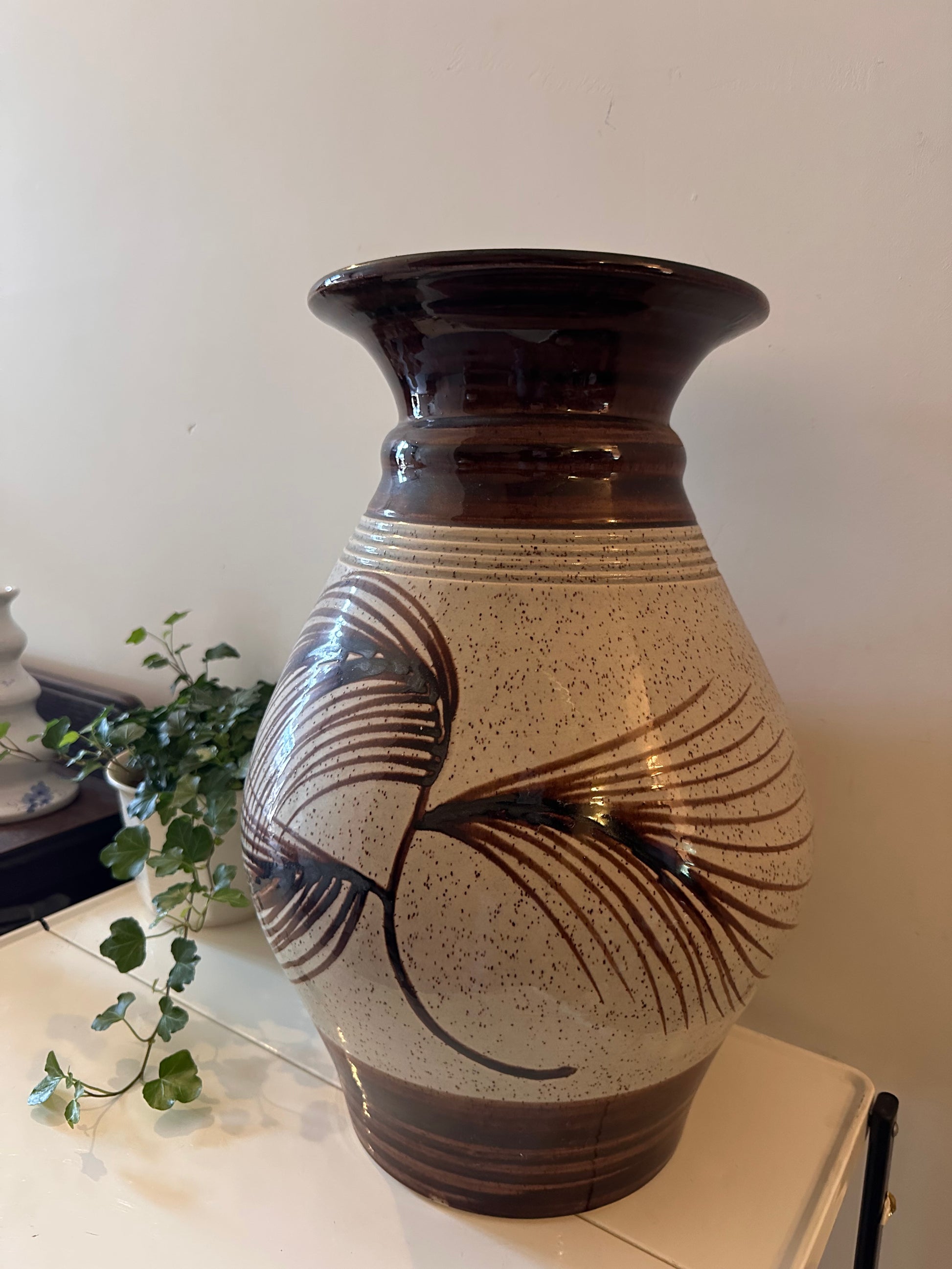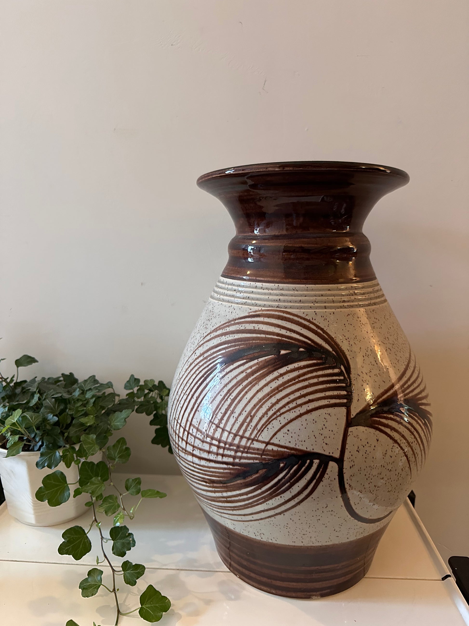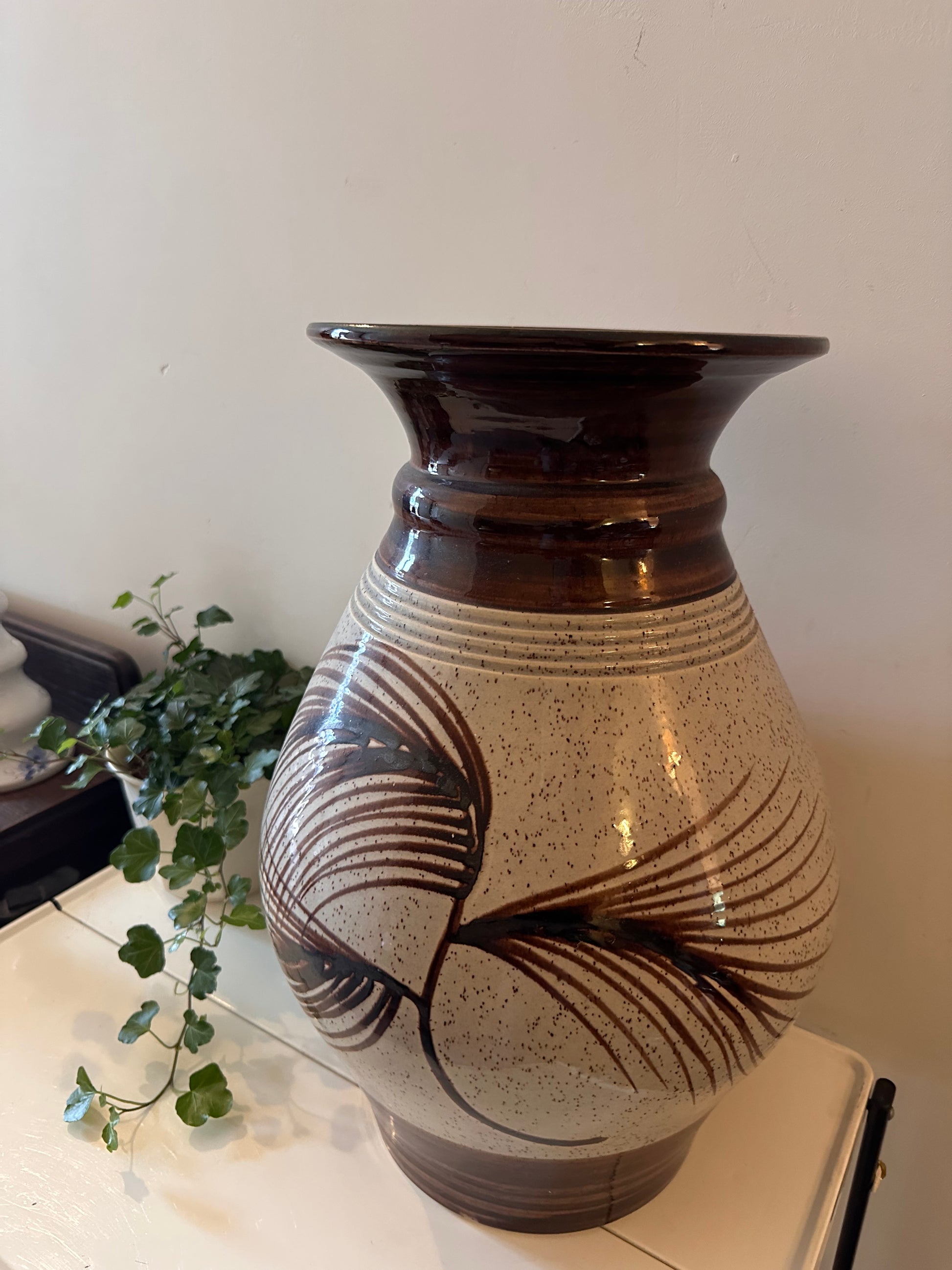 Een flinke eyecatcher uit de jaren ’70! Handgedraaid aardewerk met een gespikkelde crème basis en brede bruine penseelstreken die rondom doorlopen. Stoer van formaat en ideaal om zo neer te zetten of met een paar takken erin.