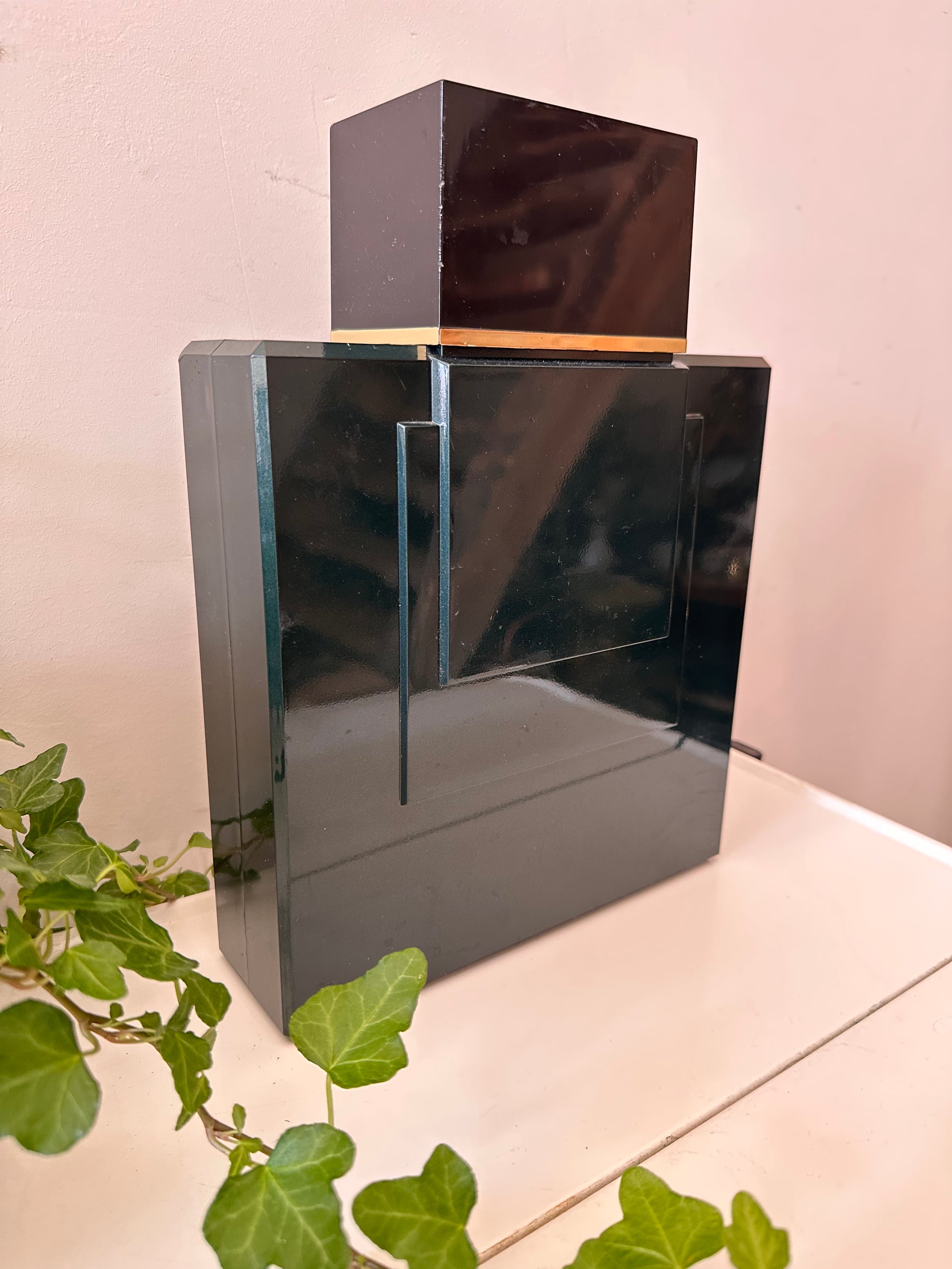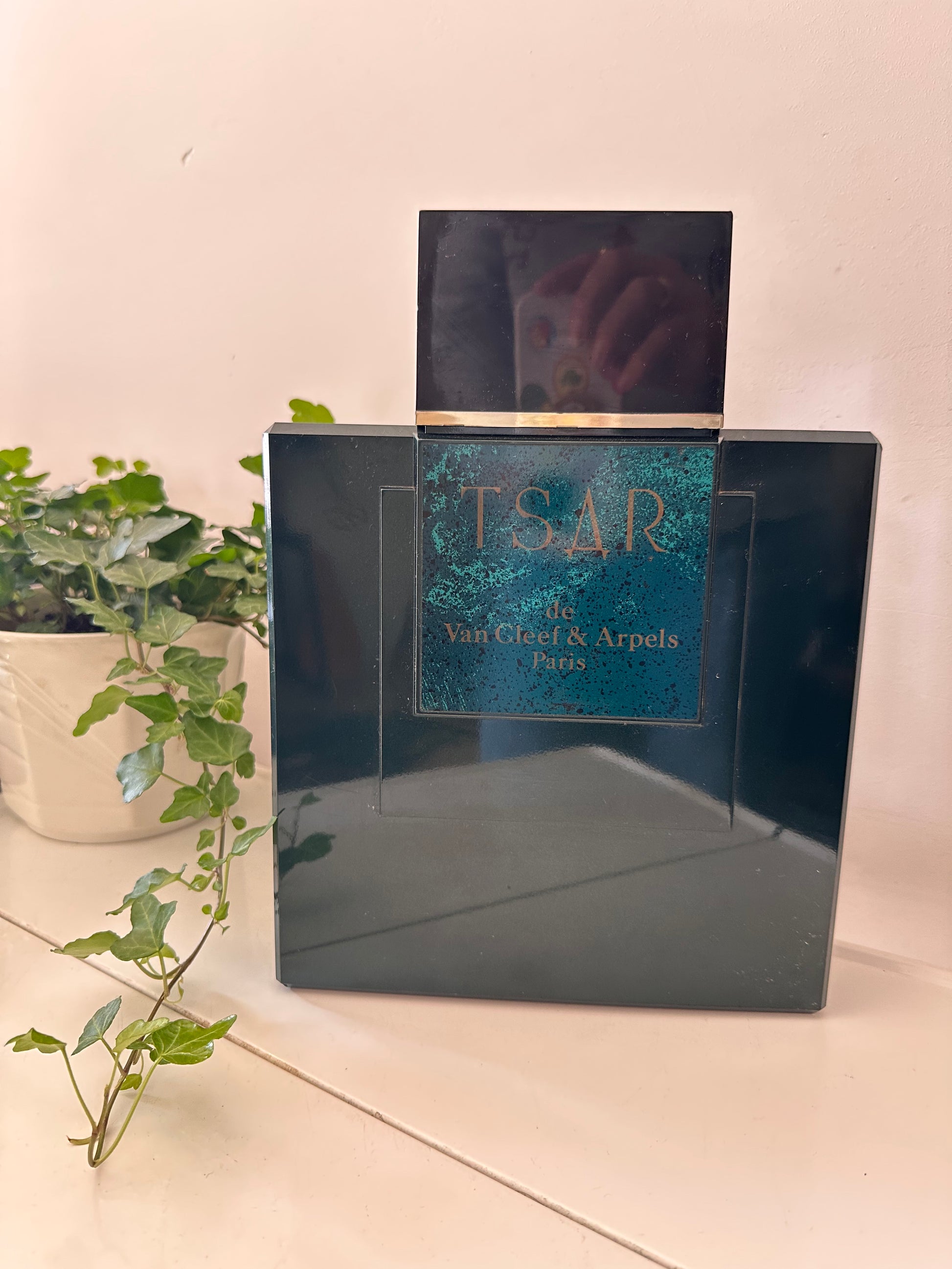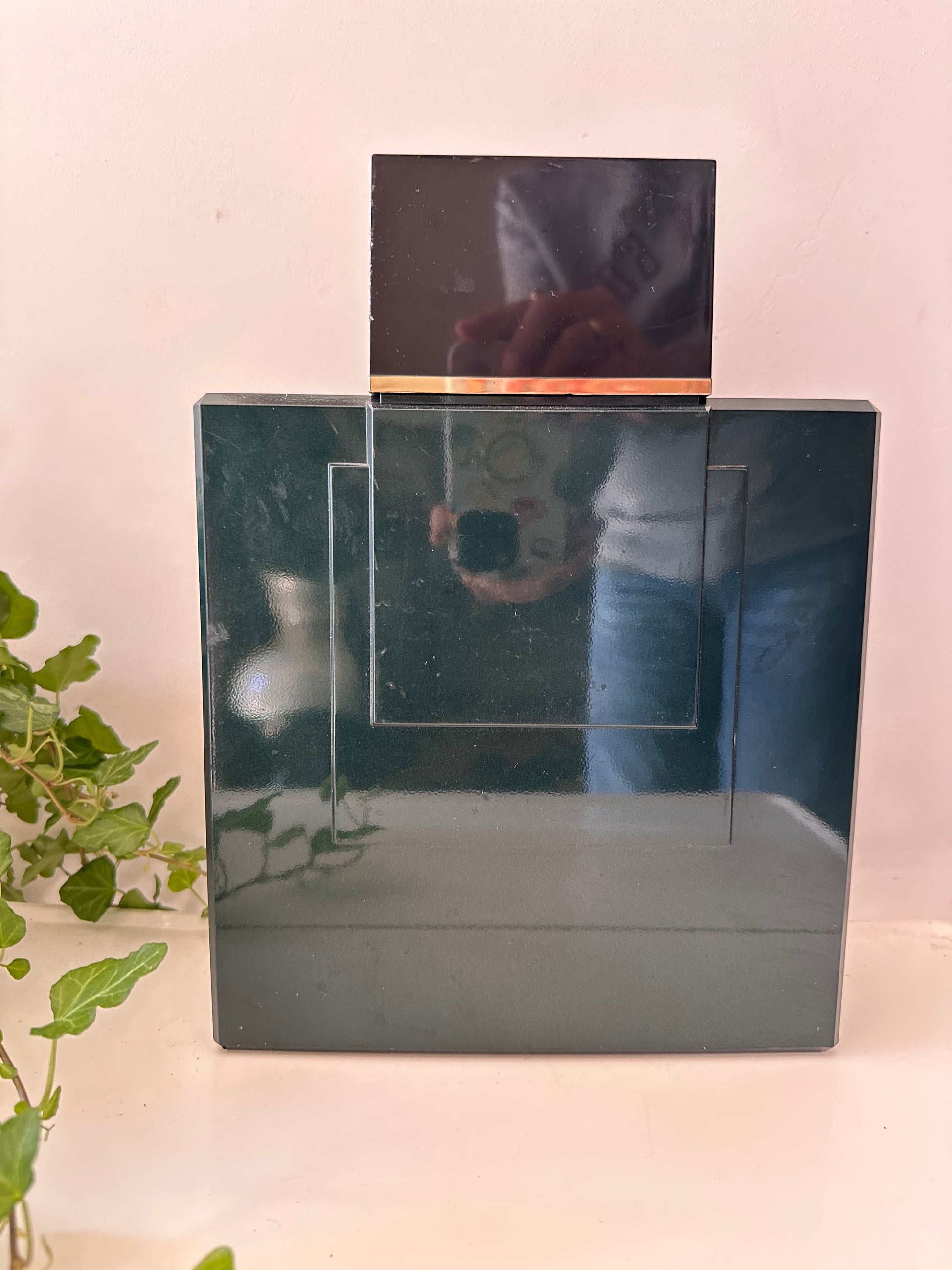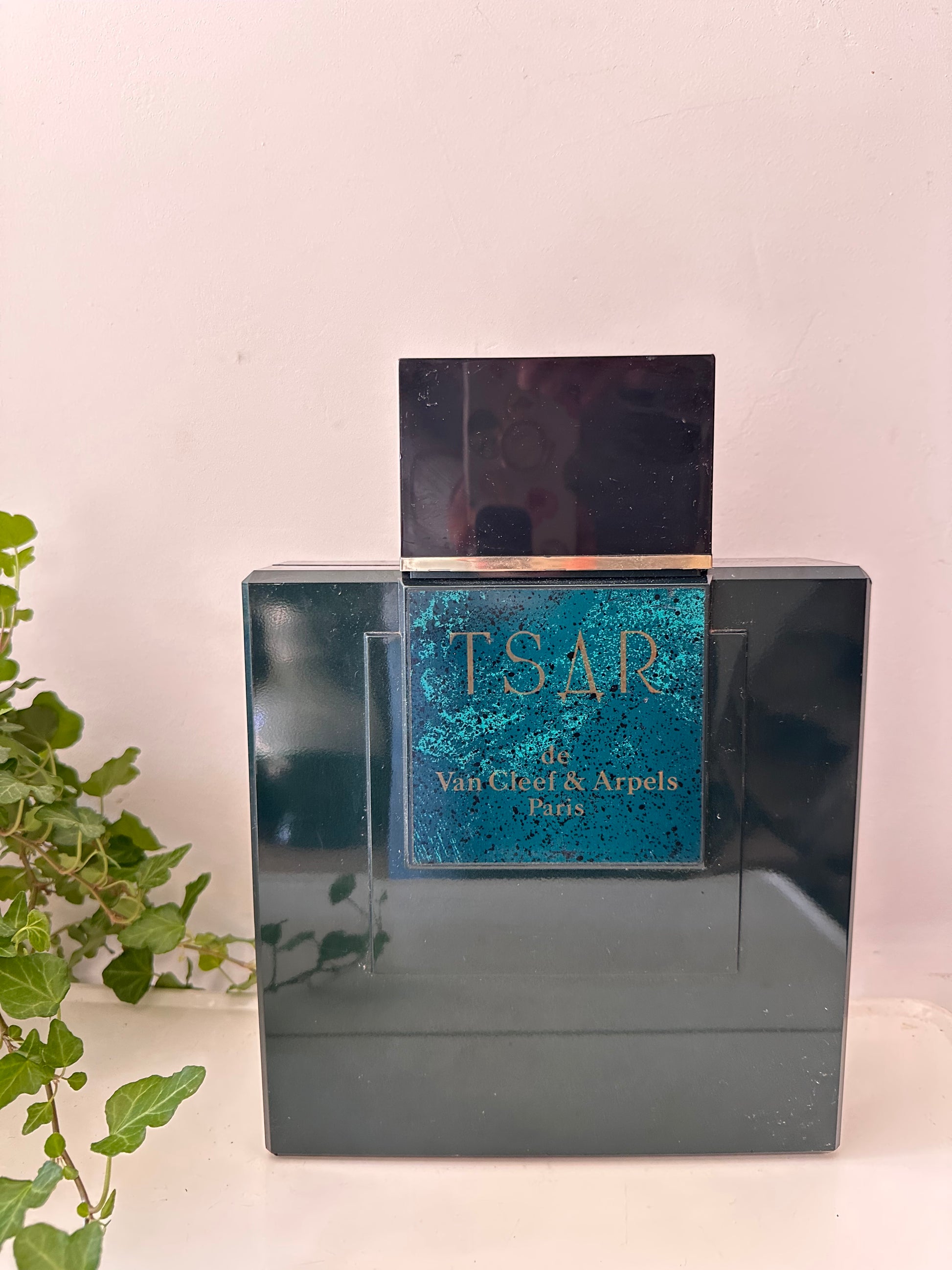 Hoe tof is dit XXL showmodel van Tsar de Van Cleef & Arpels Paris? Deze parfumfles is géén gewone flacon, maar een speciaal gemaakt etalage-/reclameobject uit de jaren ’80. Gemaakt van donkergroen kunststof met de iconische vierkante vorm en goudaccent. Stoer, strak en heel retro – een echte eyecatcher in je interieur of verzamelkast. Q374